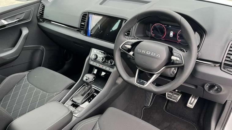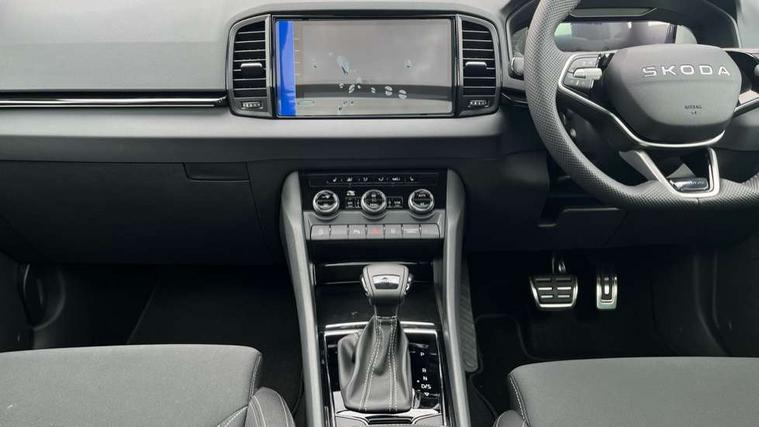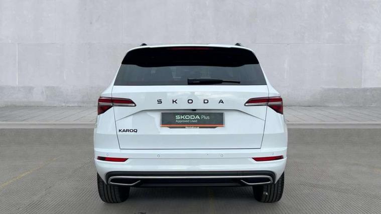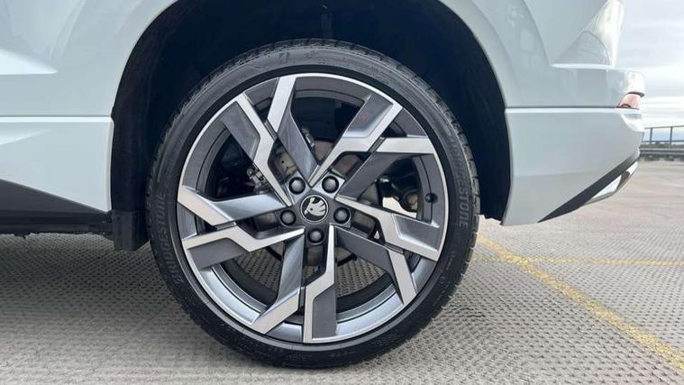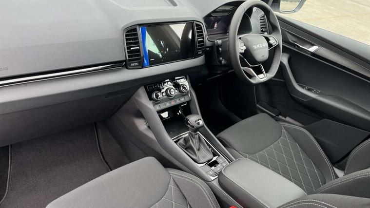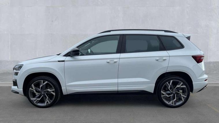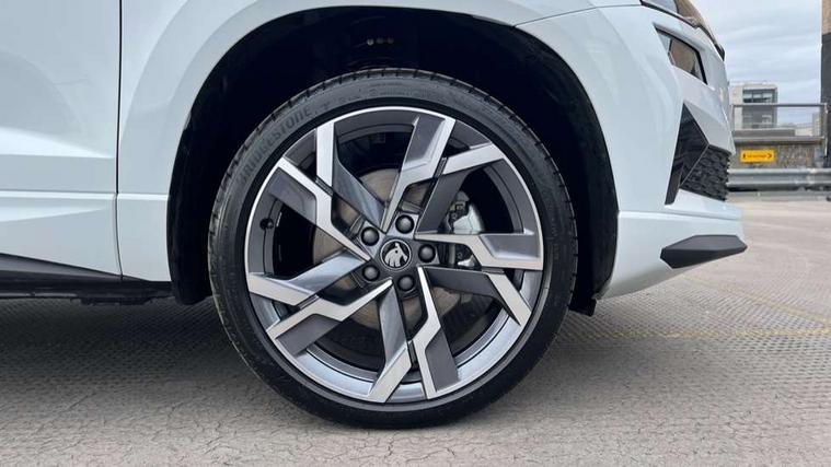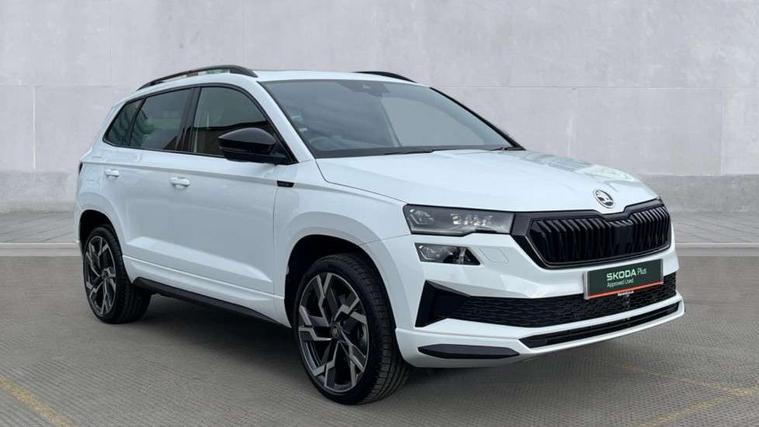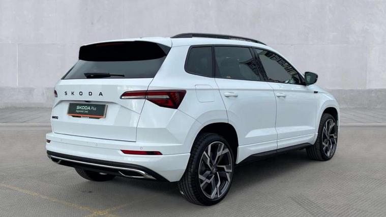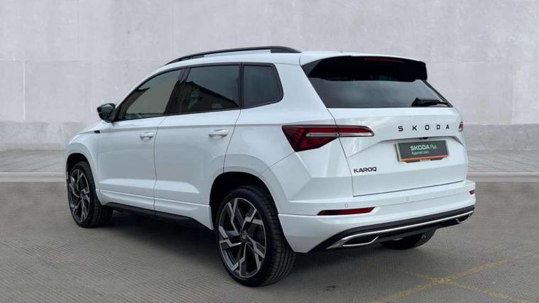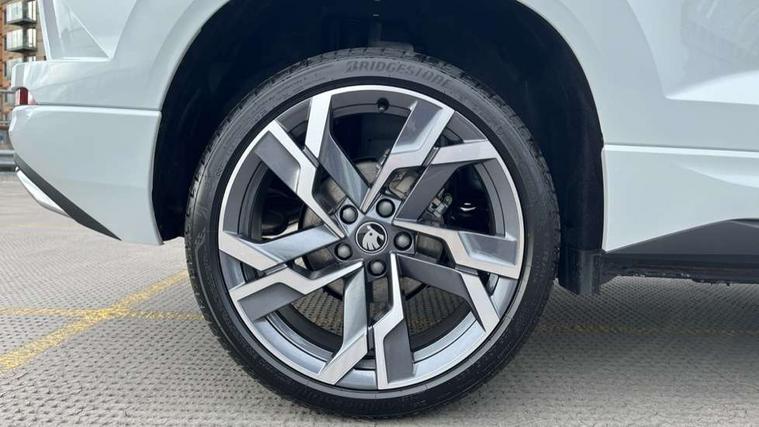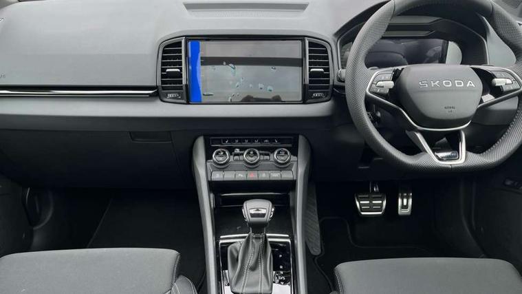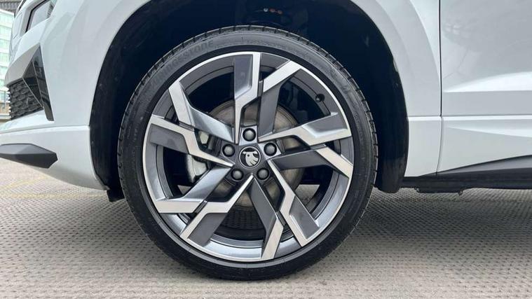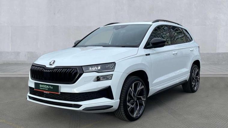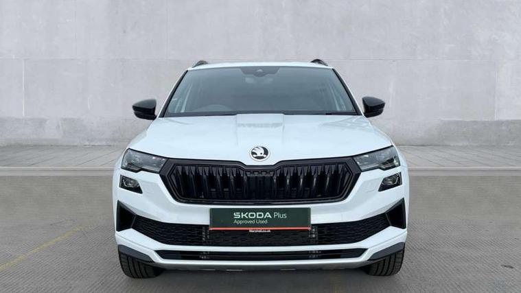 Emergency services call system, Interior driver monitoring camera, Multifunction camera for driver assistance system, Outside temperature gauge, Sensor for driver assistance systems, Service interval indicator, SmartLink wireless for Apple and wired for Android, Start/stop system with regenerative braking, Traffic sign recognition, USB C Port x 2 in front centre console, Virtual Cockpit - 10.25" digital display, Virtual pedal with electrically operated boot door, Wireless smartphone charging, DAB radio with Bluetooth, USB connection, Acoustic glass, Aero front windscreen wipers with intermittent function, Auto dimming rear view mirror with light and rain sensors, Black door mirrors, Black electric window control buttons, Black radiator grille, Black roof rails, Body colour door handles, Electric front and rear windows with child proof lock, Extended rear roof spoiler, Front door steps with SportLine logo, Heated rear windscreen, LED daytime running lights, LED rear lights with high functionality welcome effect and dynamic indicators, Light assistant (coming/leaving home/tunnel light), Panoramic sliding sunroof, Plastic scuff plates in door apertures, Privacy glass, Protective door side sills in body colour, Rear diffuser, Rear side wing doors, Rear window wiper with washer system and intermittent control, Safety reflectors on front doors, Skoda lettering on tailgate in black, Sportline badge on front fender, Sports front and rear bumpers, Third brake light, Unique dark chrome design logo on alloy wheels, 1.5 litre bottle holders in driver and front passenger door panels, 12V socket in boot, 12v socket in front centre armrest with storage compartment and rear air vents, 2 x Tablet holder, 3 rear height adjustable headrests, 3 seat bench in 2nd row, 3 spoke sports leather heated multifunction steering wheel with DSG paddles, 4 foldable roof handles with rear coat hooks, Black floor carpet, Cargo elements in boot, Chrome inner door handles, Foldable hooks in the boot, Front head restraints, Height adjustable front three point seats belts with tensioners, Height/reach adjust steering wheel, Ice scraper, Illuminated glovebox, Illuminated luggage compartment, Isofix child seat preparation for front passenger seat, Isofix child seat preparation outer rear, Manual lumbar support for front seats, Pen holder, Pollen filter, Rear backrest release from boot, Rear boot cover, Rear package tray, Rear reading lights, Rear seats fixed folding and divided 60:40, Rubbish bin door, Safety vest holder, Single front passenger seat, Skoda lettering on steering wheel, Sportline decorative inserts, Storage box in upper central dashboard closed, Sunvisors with illuminated vanity mirrors, Textile floor mats, Ticket holder, Titan black interior ceiling, Umbrella under passenger seat, Under passenger seat storage compartment, Columbus pack - Karoq, LED Interior lighting pack with Skoda welcome logo - Karoq, Light Pack - Karoq, Non Smokers pack, Performance pack - Karoq, Winter plus pack with heated front and rear seats - Karoq, Automatic door unlocking in case of crash, Automatic fuel cut off in case of crash, Driver airbag, Electronic parking brake with auto hold function, Emergency rear braking signal, ESC (incl. ABS+MSR+ASR+EDS+HBA+DSR+RBS+MKB), Front side airbags, Head airbags, Hill hold control, Knee airbags, Passenger airbag with switch-off function, Pedestrian monitor, Power operated child safety locks, Seatbelt reminder signalisation and pretensioner for all seats, Three point seatbelts rear, Two tone horn, Tyre pressure monitor, Alarm with interior monitoring, back up horn and tilt sensor with safe function, Electronic engine immobiliser, Keyless entry and start/stop, Remote central locking with 2 remote folding keys, Black air vent surround, Black centre console, carbon door decor, Satin black dashboard, Satin black door trim, 19" Sagittarius anthracite alloy wheels, Anti-theft wheel bolts protection, Breakdown and tool kit,