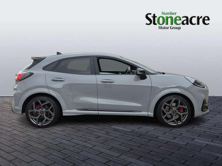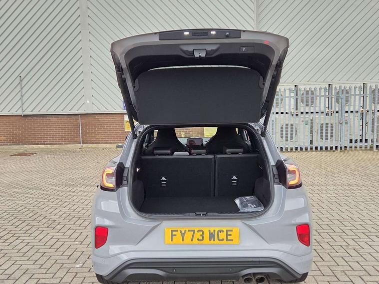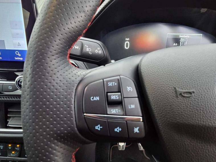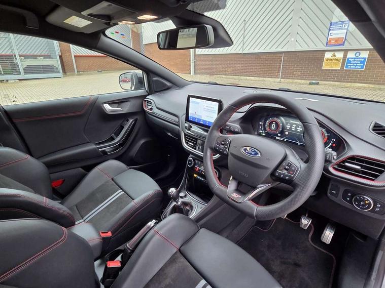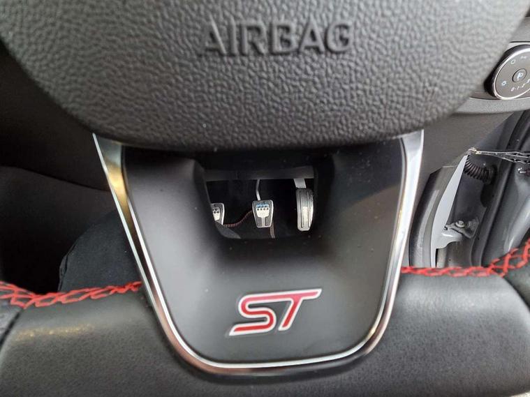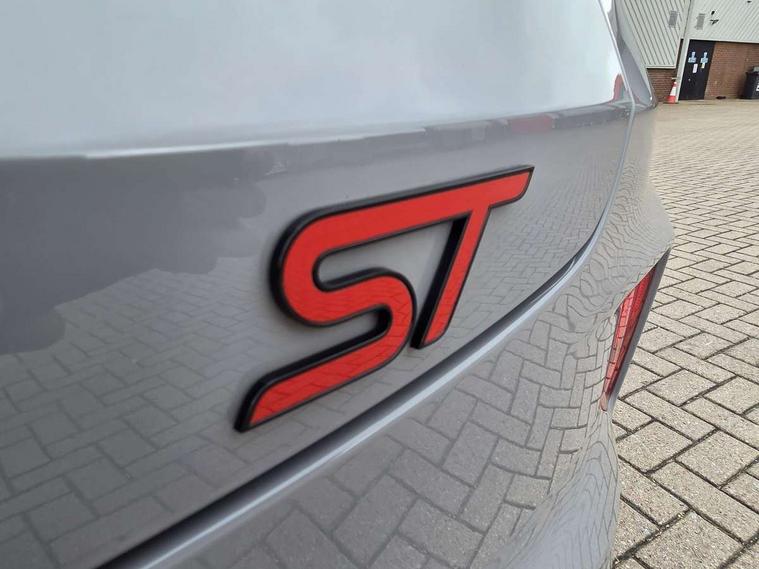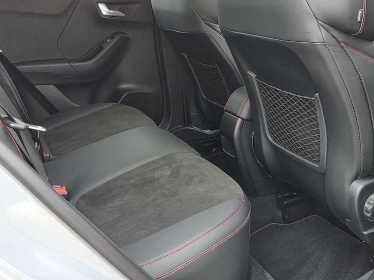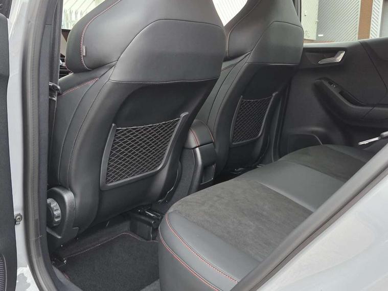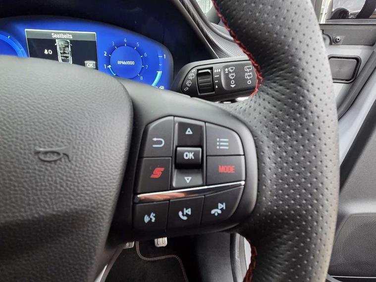 Cruise control with Intelligent speed assist, Driver impairment monitor, Emergency call service, Ford easy fuel, Front and rear parking sensors, Full digital 12.3" instrument cluster, Lane keeping aid with lane departure warning, Power assist steering, Selectable drive modes (normal, sport, eco, track), Speed sign recognition, Engine sound enhancer, ST suspension, Automatic headlights with auto high beam, Automatic rain sensing wipers, Dual chrome exhaust, Fixed LED signature headlamps, Front fog lamps, LED daytime running lights, LED rear lamps, Power foldable heated door mirrors with puddle lamps and puma logo protection, Privacy glass to side rear windows and tailgate glass, Quickclear heated windscreen, Rear side wing doors, Rear wiper, ST scuff plates, Third brake light, Unique ST body styling kit including contrast black roof, large rear spoiler and wing mirrors, plus Ford Performance embossed splitter, 3 seat bench in 2nd row, Alloy sports pedals, Centre console with armrest and stowage, Ford megabox extended bootspace, Ford Performance sensico partial premium leather upholstery with metal grey stitching, Front and rear floor mats, Front and rear head restraints, Manual 6 way driver seat adjust with lumbar adjustment, Manual 6 way passenger seat with lumbar seat adjustment, Single front passenger seat, ST flat bottomed steering wheel with metal grey stitching, ST logo projection, Unique ST gear shift knob, Wireless charging pad with electronic air temperature control (EATC), B&O Premium Audio system + Ford SYNC 3 navigation pack - Puma, Winter pack - Puma, 3 rear seatbelts, Child safety lock, Electronic stability control (ESC) and hill start assist, Pedestrian/cyclist detection & post-collision braking, Pre collision assist system, Red brake calipers, Tyre pressure monitoring system (TPMS), Keyless entry and power start button, Thatcham alarm, Carbon look interior deco spears, 19" 5 Spoke magnetite dark finished alloy wheel, Tyre inflation kit,