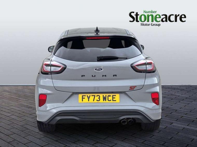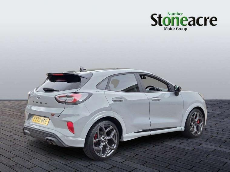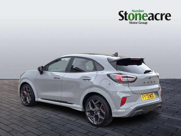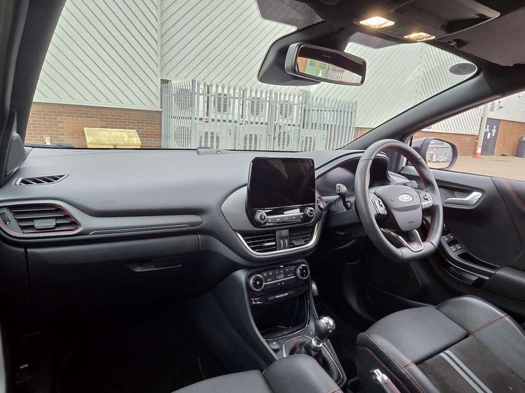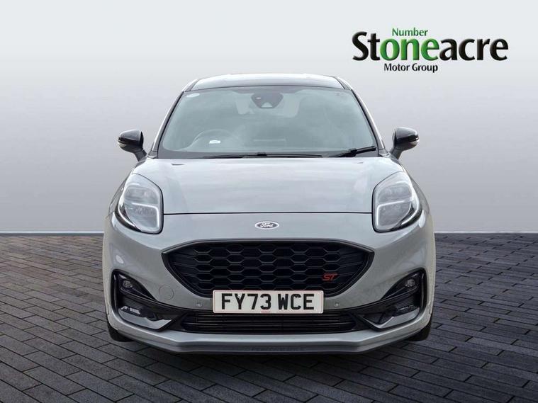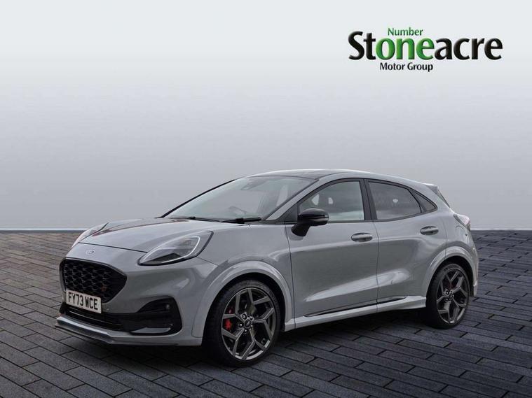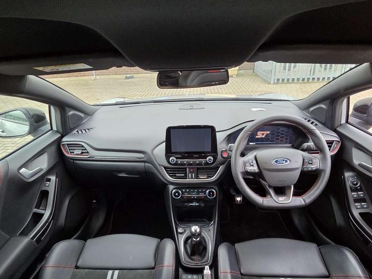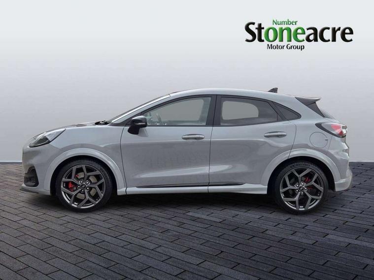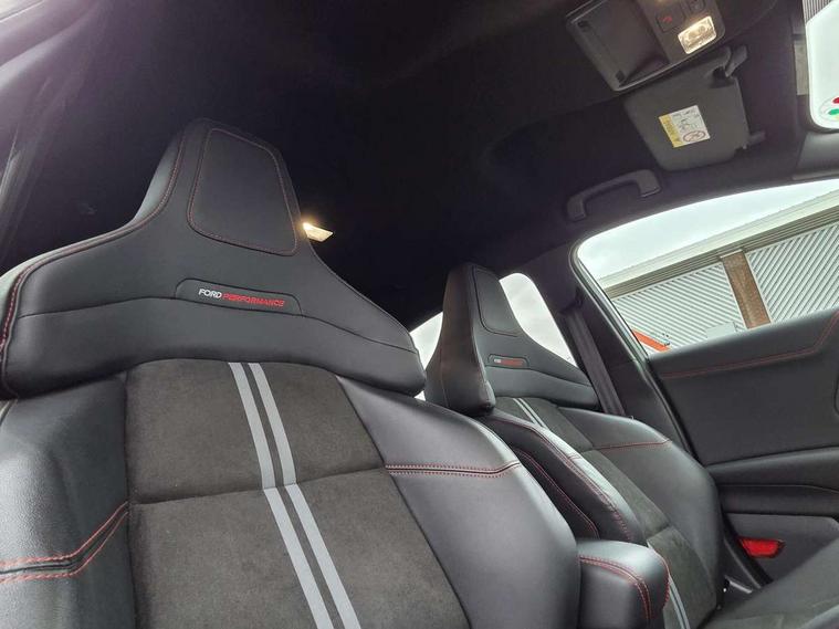 Cruise control with Intelligent speed assist, Driver impairment monitor, Emergency call service, Ford easy fuel, Front and rear parking sensors, Full digital 12.3" instrument cluster, Lane keeping aid with lane departure warning, Power assist steering, Selectable drive modes (normal, sport, eco, track), Speed sign recognition, Engine sound enhancer, ST suspension, Automatic headlights with auto high beam, Automatic rain sensing wipers, Dual chrome exhaust, Fixed LED signature headlamps, Front fog lamps, LED daytime running lights, LED rear lamps, Power foldable heated door mirrors with puddle lamps and puma logo protection, Privacy glass to side rear windows and tailgate glass, Quickclear heated windscreen, Rear side wing doors, Rear wiper, ST scuff plates, Third brake light, Unique ST body styling kit including contrast black roof, large rear spoiler and wing mirrors, plus Ford Performance embossed splitter, 3 seat bench in 2nd row, Alloy sports pedals, Centre console with armrest and stowage, Ford megabox extended bootspace, Ford Performance sensico partial premium leather upholstery with metal grey stitching, Front and rear floor mats, Front and rear head restraints, Manual 6 way driver seat adjust with lumbar adjustment, Manual 6 way passenger seat with lumbar seat adjustment, Single front passenger seat, ST flat bottomed steering wheel with metal grey stitching, ST logo projection, Unique ST gear shift knob, Wireless charging pad with electronic air temperature control (EATC), B&O Premium Audio system + Ford SYNC 3 navigation pack - Puma, Winter pack - Puma, 3 rear seatbelts, Child safety lock, Electronic stability control (ESC) and hill start assist, Pedestrian/cyclist detection & post-collision braking, Pre collision assist system, Red brake calipers, Tyre pressure monitoring system (TPMS), Keyless entry and power start button, Thatcham alarm, Carbon look interior deco spears, 19" 5 Spoke magnetite dark finished alloy wheel, Tyre inflation kit,