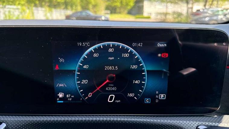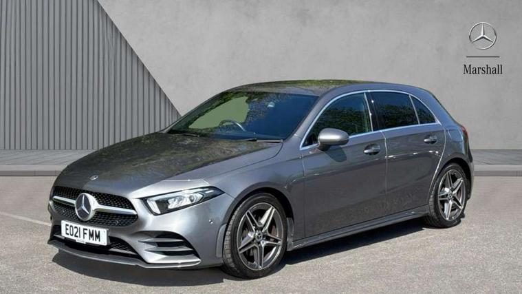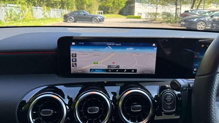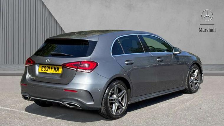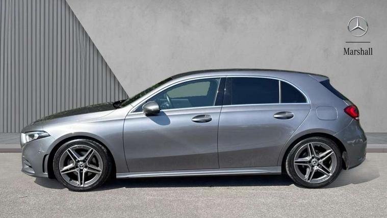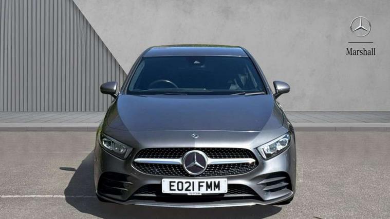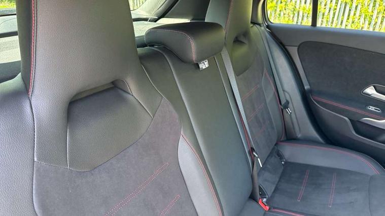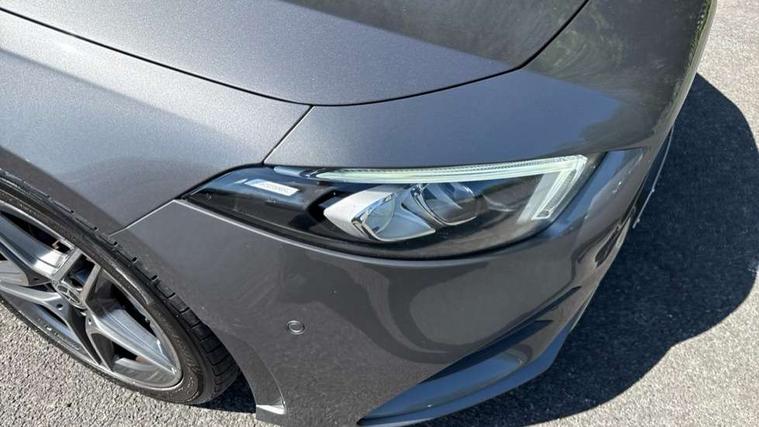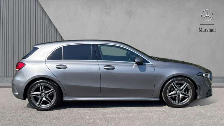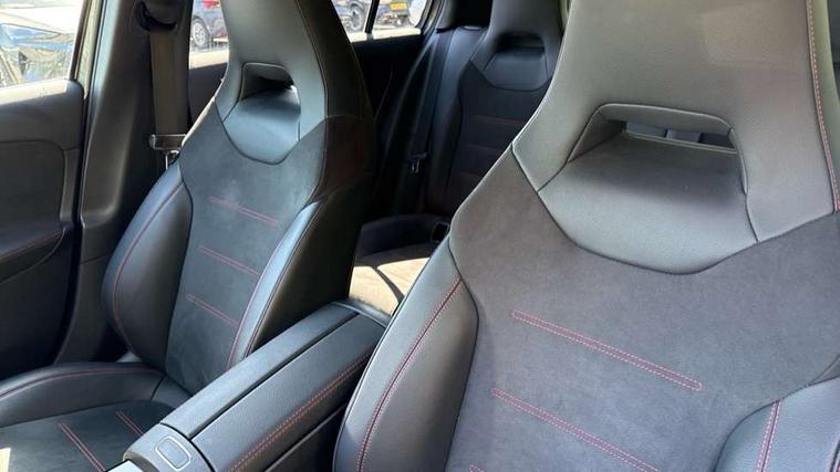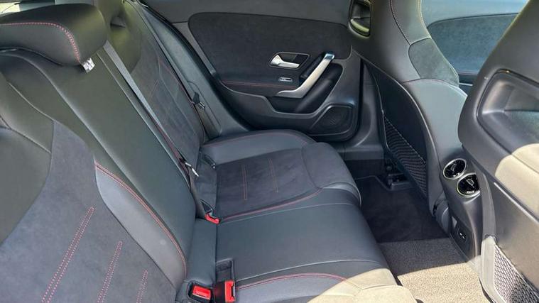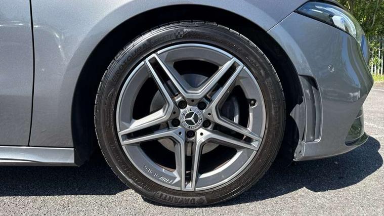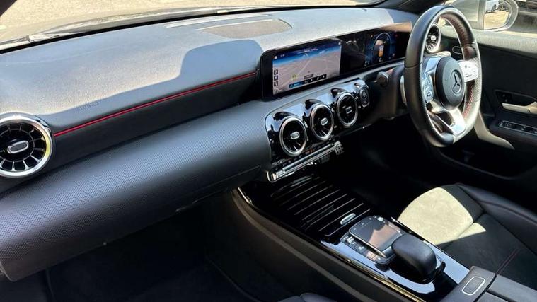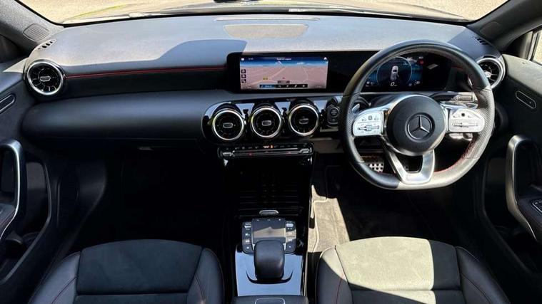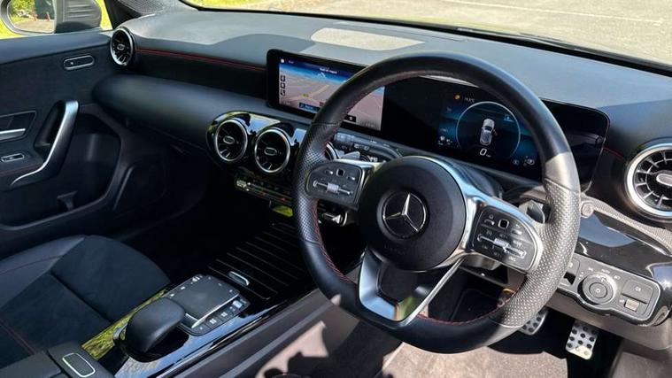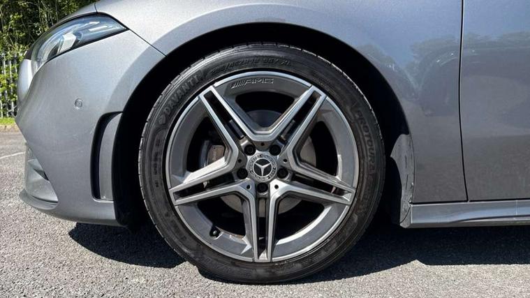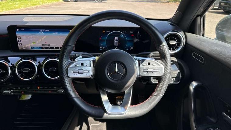 10.25" media display, 180 degree rear view camera with parking guidelines, 7" colour screen in instrument panel, Active parking assist with visual and audible warning of detected obstacles, Attention assist, Brake pad wear indicator warning light, Car wash mode, Cruise control + speed limiter, Direct steering, Dual bluetooth interfaces, DYNAMIC SELECT with a choice of driving modes (ECO, Comfort, Sport and Individual), ECO start/stop function, Fluid level warning indicator for fuel, oil, coolant and washer fluid, Hard-disk navigation, Hey Mercedes Voice activation, Lamp failure indicator, Mercedes me connect including emergency call system, accident recovery, breakdown management and maintenance, Mercedes me remote services, Outside temperature gauge, Owners manual in English, Pre-installation for car sharing, Preinstallation for Mercedes Benz link, Service indicator (ASSYST), Smartphone integration with Apple CarPlay and Android auto, Speed sensitive power steering, Trip computer, Ultrasonic sensors positioned in the front and rear bumpers, Wireless charging, Lowered comfort suspension, Rear axle torsion beam, 2 USB ports (type C) in rear stowage compartment and one in front of center console, 6 speakers, DAB Digital radio, MBUX multimedia system with DAB digital radio and touchpad including satellite navigation, Mercedes-Benz sound system - 100W, 4 Electric Front and Rear windows, Adaptive brake lights, AMG bodystyling - Front apron with splitter in chrome, rear apron with chrome trim and chrome visible trim elements in tailpipe, Black weather strip, Body colour bumpers, Body colour door handles, Body colour side skirt, Body coloured door mirrors, Chrome beltline trim, Diamond radiator grille with chrome pins and silver louvre + chrome insert, Electric adjustable and heated door mirrors with integrated LED side indicators, Exhaust system - Twin visible tailpipes in polished stainless steel, Headlamp assist automatic headlamp activation, Heated glass rear windscreen + timer control, LED high performance headlamps with integrated LED daytime running lights, LED tail lamp, LED third brake light, Privacy glass, Radio aerial, Rain sensing windscreen wipers with two sensitivity settings, Rear fog lights, Rear wiper, Window line trim strip in chrome, 3 Spoke flat bottom leather multi function steering wheel with perforated leather in grip area, 40:20:40 split folding rear seats, Artico man-made leather/Microfibre Dinamica upholstery with red contrast stitching, Auto Mercedes-Benz child seat recognition sensor, Black air vents with surround in silver chrome, Black roof lining, Brushed stainless steel sports pedals with rubber studs, Controller on centre console with chrome surround, Floor mats with stitched edging and AMG lettering, Front centre armrest with storage compartment, Front door sills with Mercedes Benz lettering, Front seat backs luggage nets, Front seat cushion length adjustment, Galvanished gear shift paddles on steering wheel, Heated front seats, Height/reach adjustable steering column, Interior mirror with reading lamps in black and frameless, ISOFIX and top tether child seat fixing points in two outer rear seats, Manual height adjustable front seats, Rear head restraints, Seat occupancy sensor for front passenger seat, Sports seats with integrated headrests, Stowage compartment in centre console with retractable cover, Sunvisors with illuminated vanity mirrors, Touchpad on center console, Twin front cupholders, Two zone thermotronic luxury automatic climate control, Light and sight pack - A Class, Mirror package - A Class, Seat comfort pack - A Class, 3 rear 3 point seatbelts, ABS with Brake Assist, Active bonnet, Active brake assist includes forward collision warning system with autonomous braking, Adaptive brake assist with hold function and hill start assist, Black seatbelts, Childproof locks manually operated for rear doors and electrically operated for rear power windows, Crash responsive emergency lighting, Driver and passenger head and side airbags, Drivers knee airbag, Dual stage driver/passenger airbags, Electronic parking brake, ESP curve dynamic assist, ESP with ASR, Front and rear seatbelt reminder, Front brake callipers with Mercedes Benz lettering, Tyre pressure monitoring system, Warning triangle and first aid kit, Window airbags, Alarm system/interior protection/immobiliser, Keyless Go, Remote central locking and crash sensor with emergency opening function, Urban guard vehicle protection system with immobiliser and interior protection, Dinamica microfibre trim in black, 18" AMG 5 twin spoke light alloy wheels in titanium grey with highsheen finish, Summer tyres, Tirefit sealant kit,