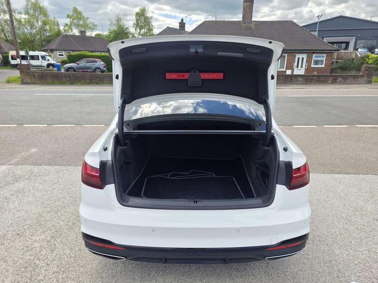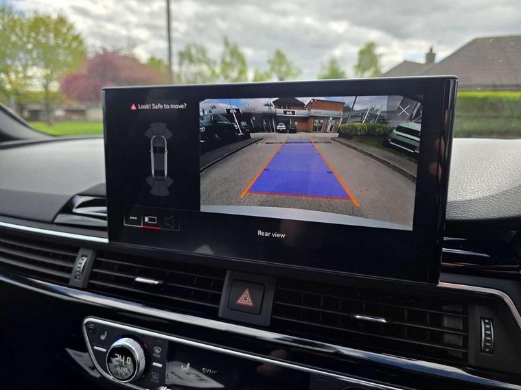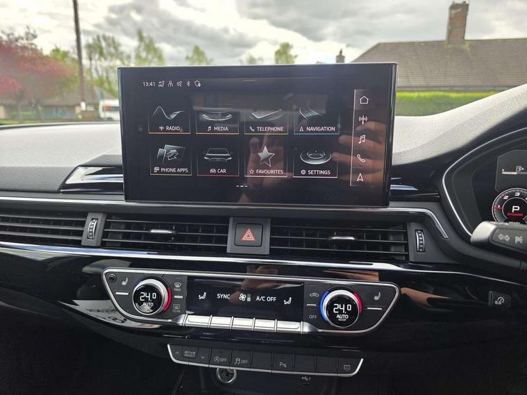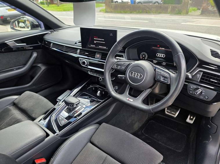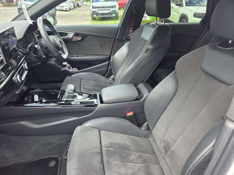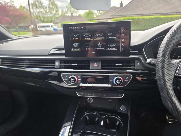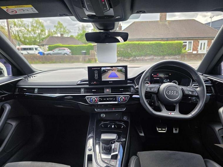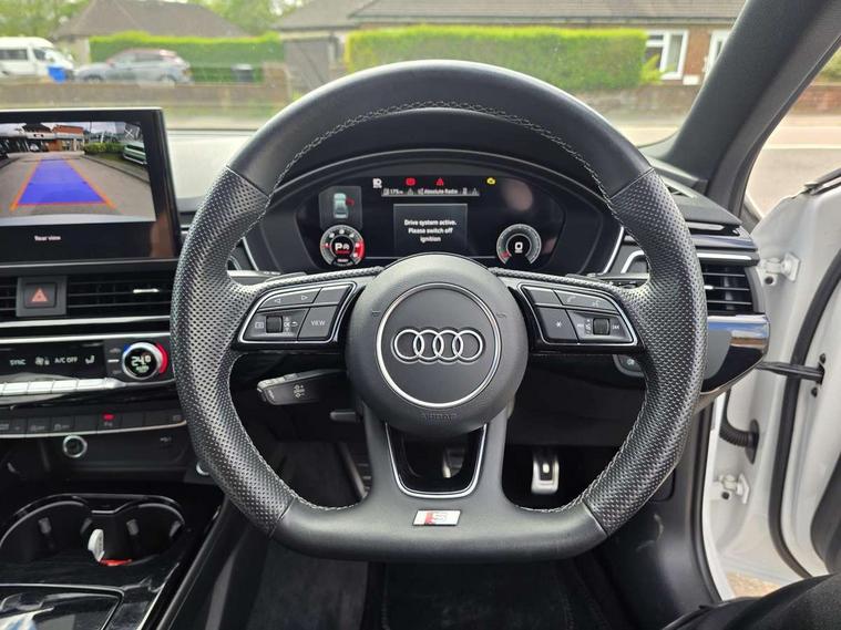 Audi connect safety and service (e-call), Audi drive select, Audi parking system plus with front and rear sensors, Audi smartphone interface, Audi virtual cockpit, Automatic start-stop system with coasting functionality and efficiency programme, Bluetooth interface, Electric boot lid release, Electromechanical power steering, MMI Navigation plus with MMI touch includes 10.1" high resolution colour MMI display, 3D map, Rear view camera, Voice control system, Sports suspension lowered by 23mm, 2 USB charging ports, 8 passive loudspeakers, DAB digital radio reception, Auto dimming rear view mirror, Body colour door handles, Body colour front spoiler lip, Body colour side sill trim, Electrically folding auto dimming/adjustable/heated door mirrors with LED side indicators and kerb view function for passenger side, Grained matt black side air inlets with matt aluminium silver inlay, High beam assistant, LED headlights with LED rear lights + dynamic rear indicators + headlight adjustment and high beam, turning light + LED daytime running lights, Matt aluminium silver tailpipe trim, Rain and light sensors, S Line badges on the front wings, S line front and rear bumpers with side skirts, S Line rear diffuser in matt titanium black with trim strip in matt aluminium silver, Windscreen with acoustic glazing, 4 way electric lumbar support for driver and front passenger, 40/20/40 split folding 3 rear seat bench in 3 parts with rear centre armrest, Black cloth headlining, Black perforated leather gearknob, Contrast stitching on seats, steering wheel and gear lever gaiter, Deluxe 3 zone electronic climate control, Door sill trims with aluminium inlay, Front and rear head restraints, Front centre armrest, Heated front seats, Illuminated door sill trims with S logo, ISOFIX child seat mounting and top tether, Manual seat adjustment, Stainless steel pedals and foot rest, Tool kit, LED Interior light pack - A4/S4, Titanium black styling pack - A4 Saloon, 3 rear seatbelts, 6 airbags - Driver, front passenger, curtain and side windows, Electronic Stabilisation Control (ESC) including ABS, ASR and EDL, Hill hold assist, Multi collision brake assist, Pop-up bonnet for pedestrian protection, Pre sense city, Seatbelt monitoring, Warning triangle and first aid kit, Anti theft alarm, Anti theft wheel bolts, Keyless Go, Piano black finish inlay, 19" 5 arm rotor design alloy wheels titanium matt look, Tyre repair kit,