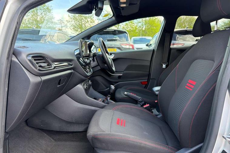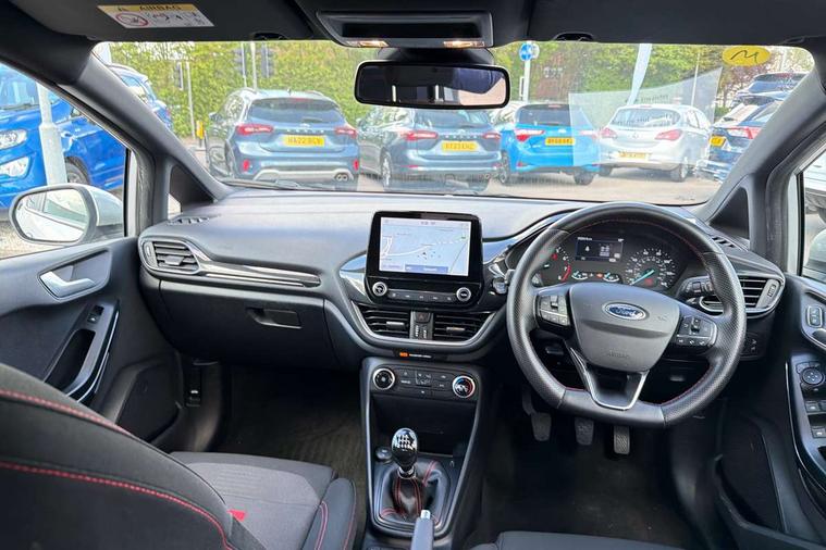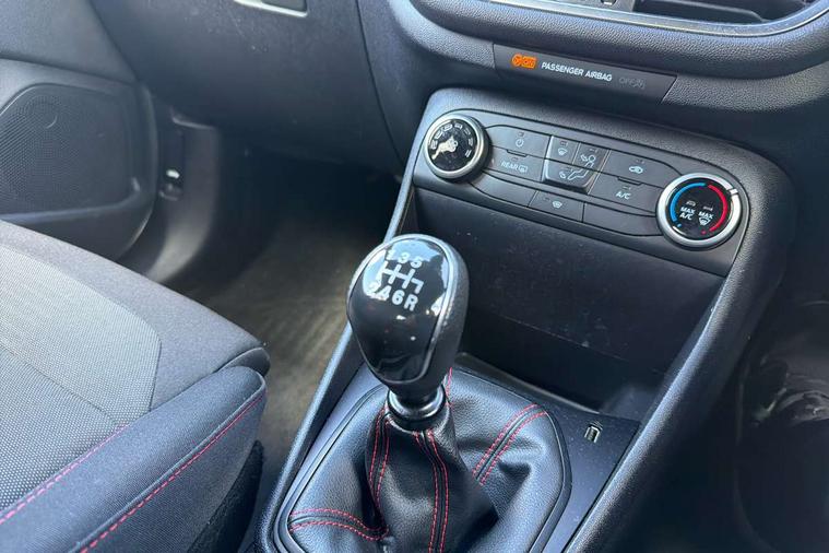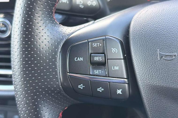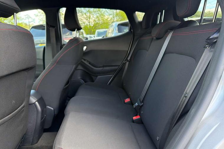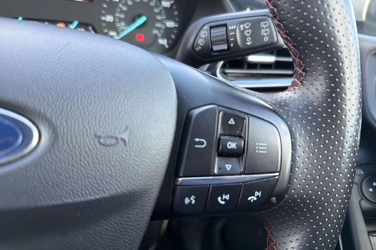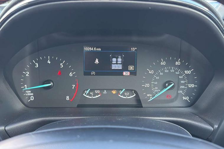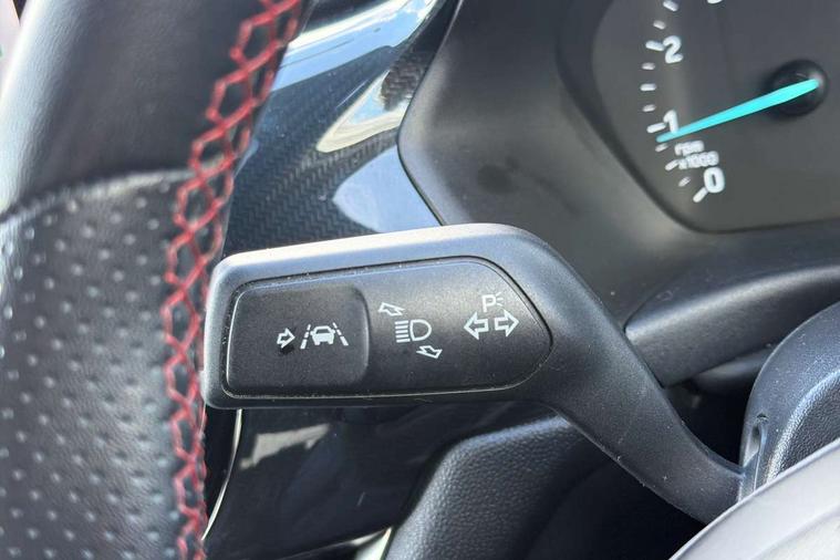 4.2" Colour TFT Ice blue illumination analogue cluster, Driver alert system, Electric power steering, Ford easy fuel, Lane keep assist, Lane keeping aid, Rear parking distance sensors, Selectable drive modes (Normal, Sport, Track), Trip computer, Sports suspension, 3rd brake light, Auto high beam, Automatic headlights, Body colour bumpers, Body colour large rear spoiler, Body coloured electrically operated with side indicators, Electric front windows/one touch facility, Electric rear windows, Quickclear heated windscreen, Rain sensing wipers and auto dimming rear view mirror, Rear privacy glass, Rear side wing doors, Rear wiper, Unique ST-Line grille, full bodystyling kit and large body coloured rear spoiler, 3 rear headrests, 3 seat bench in 2nd row, Adjustable head restraints, Black headlining, Centre console with opening armrest, 2x cupholders, 12v and USB, Cloth upholstery with red stitching, Leather gear knob, Manual 2 way passenger seat adjust, Manual 4-way driver seat adjust, Manual air conditioning, Premium floor mats, Sensico wrapped steering wheel, Single front passenger seat, 3 point seatbelts on all rear seats, Electronic stability control with hill start assist, Front and rear seat belt warning, Manual child lock in rear doors, Tyre pressure monitoring system, Keyless start with 'Ford Power' starter button, MyKey system, Remote central locking, Thatcham alarm with power door dead locks, 17" 5x2 spoke alloy wheels with rock metallic finish,