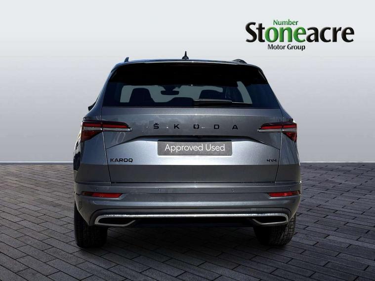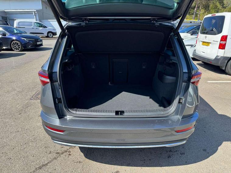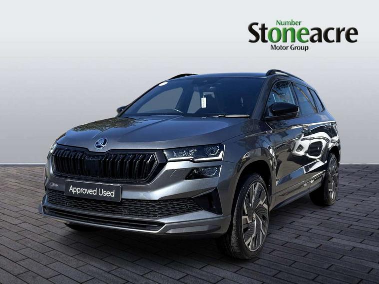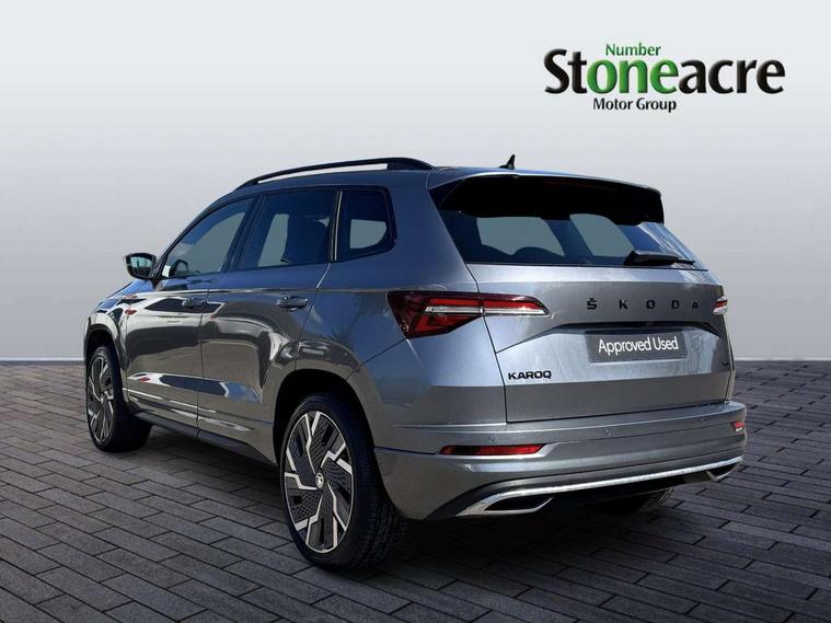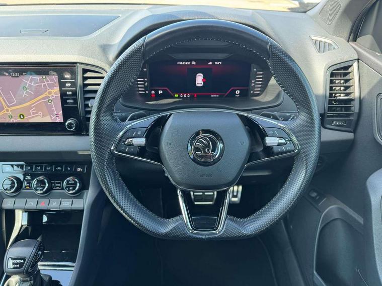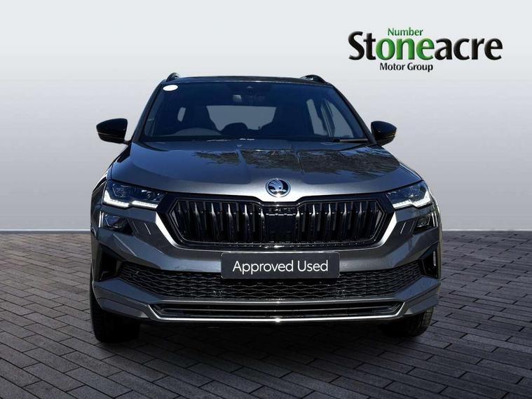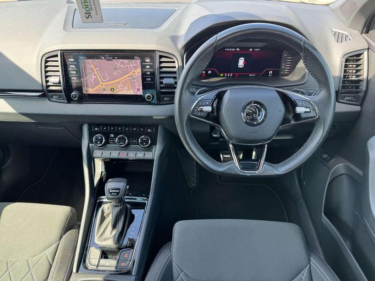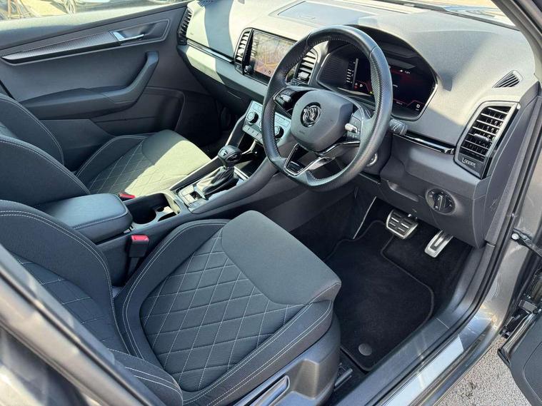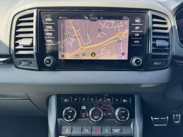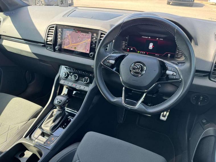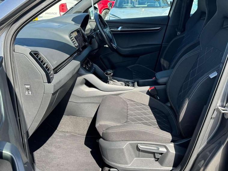 8" Digital display, Care connect, Driver fatigue sensor, Emergency services call system, Outside temperature gauge, Service interval indicator, SmartLink wireless for Apple and wired for Android, Start/stop system with regenerative braking, USB C Port x 2 in front centre console, Virtual cockpit, Virtual pedal with electrically operated boot door, Diesel particulate filter, 8 Speakers, DAB radio with Bluetooth, USB connection, Wireless charging without wireless aerial connection, Acoustic glass, Aero front windscreen wipers with intermittent function, Auto dimming rear view mirror with light and rain sensors, Black door mirrors, Black electric window control buttons, Black radiator grille, Black roof rails, Body colour door handles, Electric front and rear windows with child proof lock, Front door steps with SportLine logo, Heated rear windscreen, LED 3rd brake light, LED daytime running lights, LED rear lights with high functionality welcome effect and dynamic indicators, Light assistant (coming/leaving home/tunnel light), Panoramic sliding sunroof, Plastic scuff plates, Privacy glass, Protective door side sills in body colour, Rear diffuser, Rear side wing doors, Rear spoiler, Rear window wiper with washer system and intermittent control, Safety reflectors on front doors, Skoda lettering on tailgate in black, Sportline badge on front fender, Sportline decorative inserts with badging, Sports front and rear bumpers, 1.5 litre bottle holders in driver and front passenger door panels, 12V socket in boot, 12v socket in front centre armrest with storage compartment and rear air vents, 3 rear height adjustable headrests, 3 seat bench in 2nd row, 3 spoke leather sports multifunction steering wheel and silver stitching with gear shift paddles, 4 foldable roof handles with rear coat hooks, Black floor carpet, Black roof headlining, Chrome inner door handles, Double sided boot floor, Foldable hooks in the boot, Front head restraints, Height adjustable front three point seats belts with tensioners, Height/reach adjust steering wheel, Ice scraper, Illuminated glovebox, Illuminated luggage compartment, Interior noise suppression, Isofix child seat preparation outer rear, Manual lumbar support for front seats, Pen holder, Pollen filter, Rear boot cover, Rear reading lights, Rear seats fixed folding and divided 60:40, Rubbish bin door, Safety vest holder, Single front passenger seat, Storage box in upper central dashboard closed, Sunvisors with illuminated vanity mirrors, Textile floor mats, Ticket holder, Titan black interior ceiling, Welcome animation with sportline logo, Boot pack - Karoq, Light Pack - Karoq, Parking pack - Karoq, Automatic door unlocking in case of crash, Automatic fuel cut off in case of crash, Child locks on rear doors, Driver airbag, Electronic parking brake with auto hold function, Emergency rear braking signal, ESC including ABS, MSR, ASR, EDS, HBA, DSR, RBS, MKB and traction control, Front side airbags, Hill hold control, Knee airbags, Passenger airbag with switch-off function, Pedestrian monitor, Seatbelt reminder signalisation and pretensioner for all seats, Three point seatbelts rear, Two tone horn, Tyre pressure display, Tyre pressure monitor, Alarm with interior monitoring, back up horn and tilt sensor with safe function, Electronic engine immobiliser, Keyless entry and start/stop, Remote central locking with 2 remote folding keys, Black air vent surround, Black centre console, Satin black dashboard, Satin black door trim, 19" Sagitarius anthracite alloy wheels with matt black aero inserts, Anti-theft wheel bolts protection, Matt black aero hub caps, Tool kit,