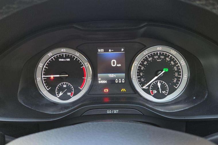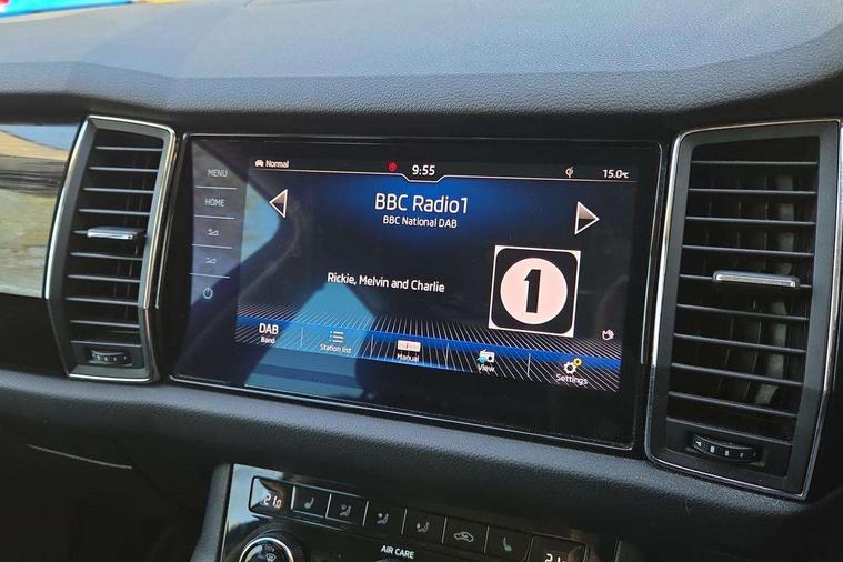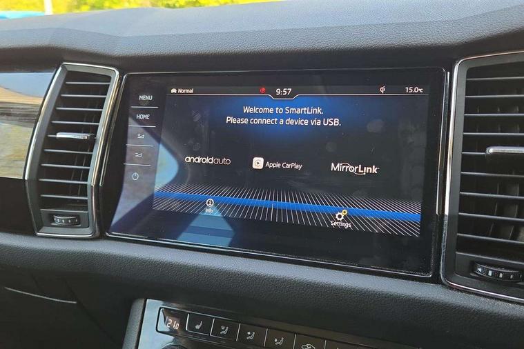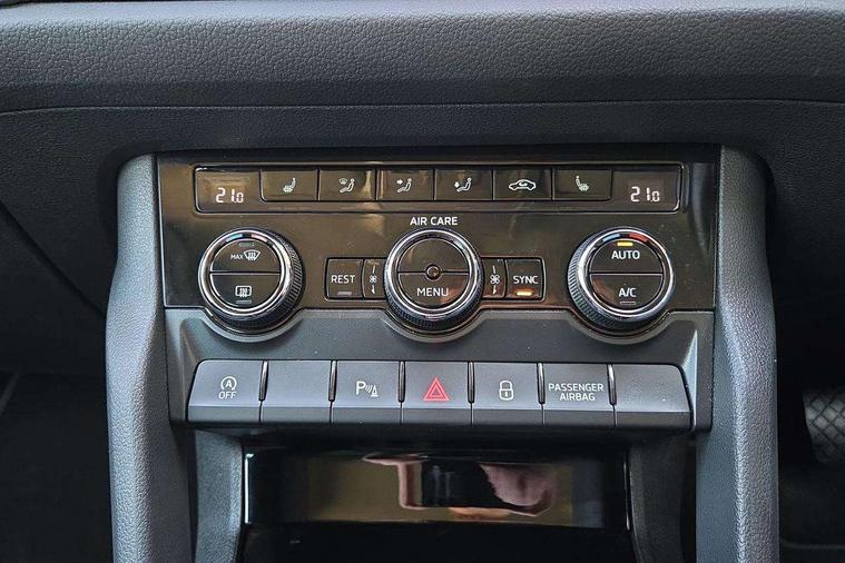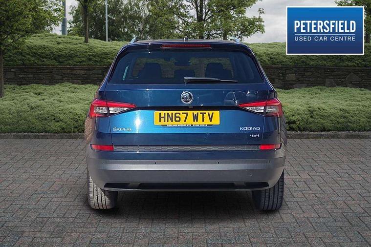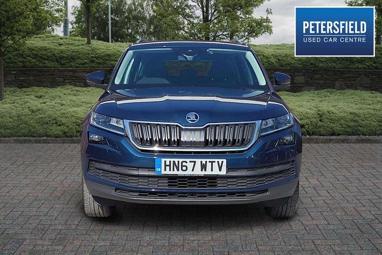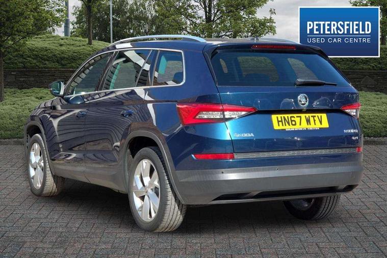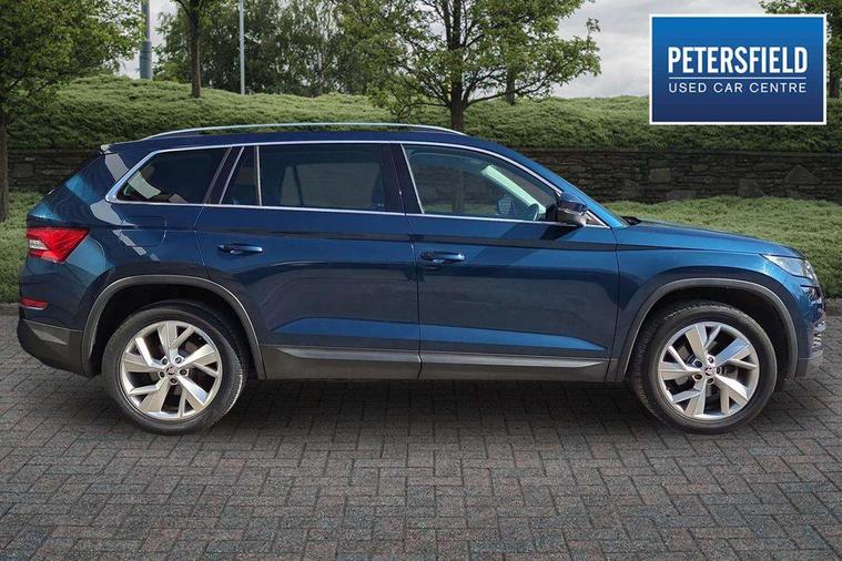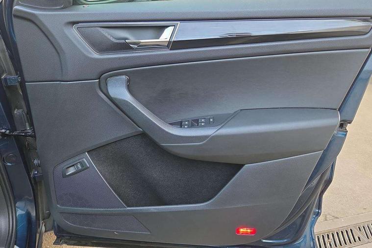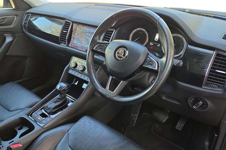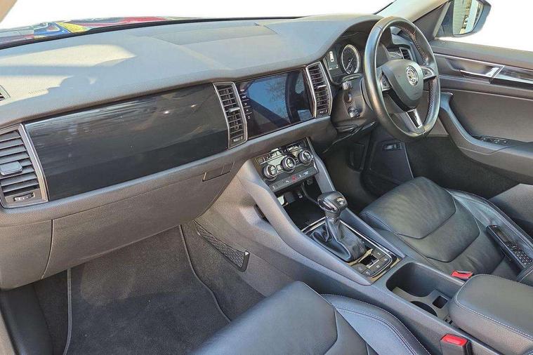 Bluetooth system, Colour maxi dot trip computer, Columbus satellite navigation with 9.2" touch screen and integrated Wi-Fi, Drive mode selector, Exterior temperature gauge, Phone box, Power tailgate, SmartLink, Smartphone wireless charging plate, Speed limiter, Bolero Radio, DAB Digital radio, DVD System, SD card slot, USB connection, Adaptive front lighting system, Aero wiper + intermittent function, Auto dimming door mirrors, Auto dimming rear view mirror, Automatic activation of hazard warning lights, Body colour bumpers, Body colour door mirrors and handles, Electric adjustable/heated/folding door mirrors, Electric front windows, Electric rear windows, Front and Rear door steps, Headlight washers, Heated rear window, High beam assist, High gloss black grille with chrome inserts, LED daytime running lights, LED front fog lights with static cornering light function, LED Headlights, Light assistant (coming home/tunnel light), Rain and light sensors, Rear spoiler, Rear wiper, Silver roof rails, Sunset privacy glass, Tinted windows, 12V Accessory socket in centre console, 12V power point in luggage area, 3 rear height adjustable headrests, 4 lashing points on luggage floor, 60/40 split fold rear seat back, Boot storage compartments, Centre console with storage/cupholders, Chrome gear shift lever, Chrome inner door handles, Driver + front passenger lumbar support, Driver's glovebox with lid, Driver's storage box, Electric front seats with memory function, Folding grab handles with rear coat hooks, Front and rear bottle holders, Front centre armrest with storage compartment, Front/rear courtesy lights, Height adjustable front seats, Height/tilt adjustable front headrests, Illuminated air conditioned glovebox, Illuminated luggage compartment, Isofix system on outer rear seats, Leather upholstery, Luggage compartment cover, Luggage nets in boot, Manually adjustable steering column, Passenger side net compartment on centre console, Pollen filter, Rear centre armrest with cupholders, Removable LED light in boot, Sunglasses storage, Sunvisors with illuminated vanity mirrors, Ticket holder, Chrome pack - Kodiaq, 3 point front/outer rear seatbelts+pre-tensioners, ABS + EDL + ASR + MSR + ESC, Automatic unlocking of doors in case of impact, Driver and passenger airbags, Drivers knee airbag, Electromechanical parking brake, Front assist including city emergency braking, Front side airbags, Fuel cut off safety device, Head airbags, Hill hold control, Hydraulic Brake Assist (HBA), Passenger airbag deactivate switch, Seatbelt warning, Two tone horn, Tyre pressure monitor, Alarm with interior monitoring and tilt sensor, Anti-theft wheel bolts, Immobiliser, Keyless entry and keyless start, Remote central locking,