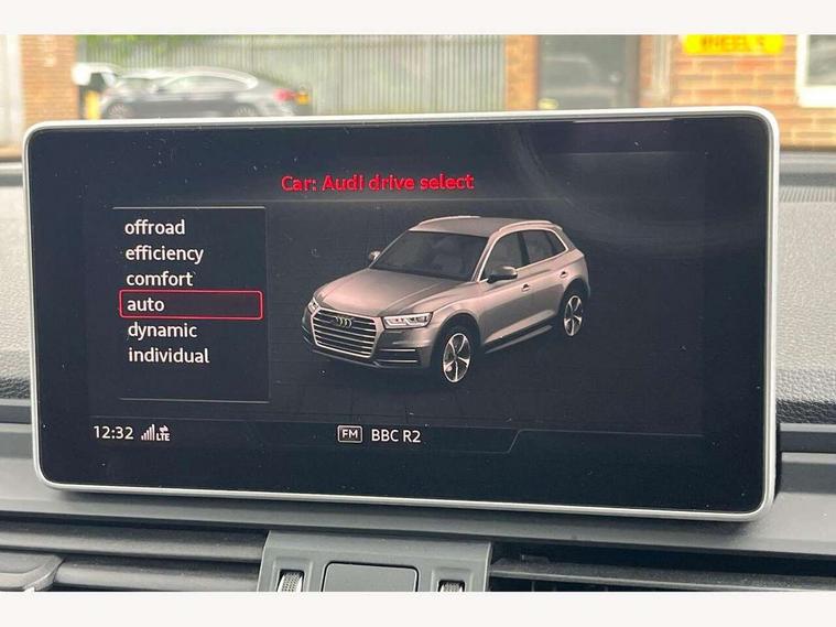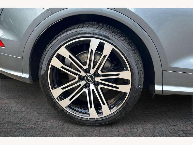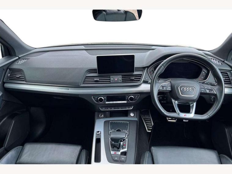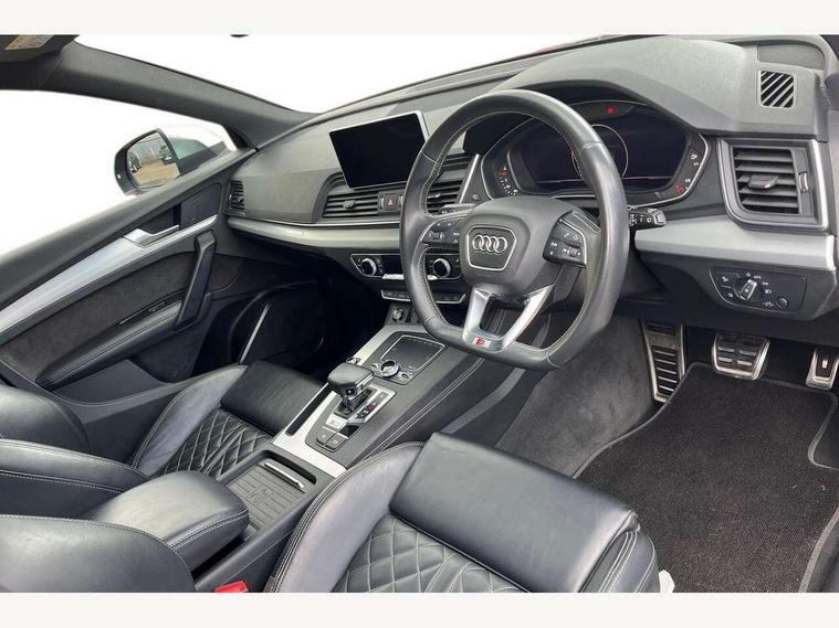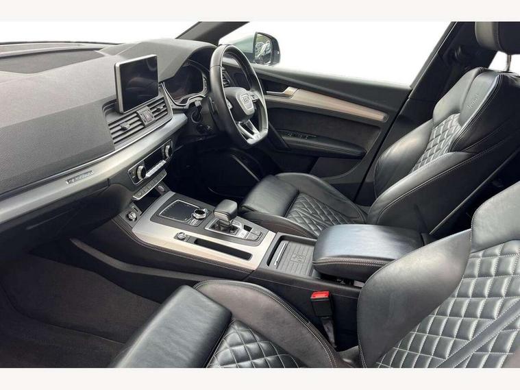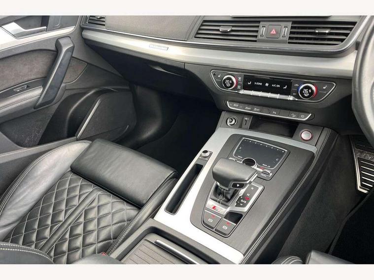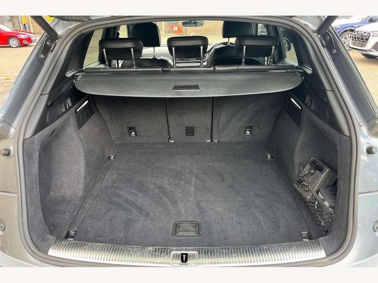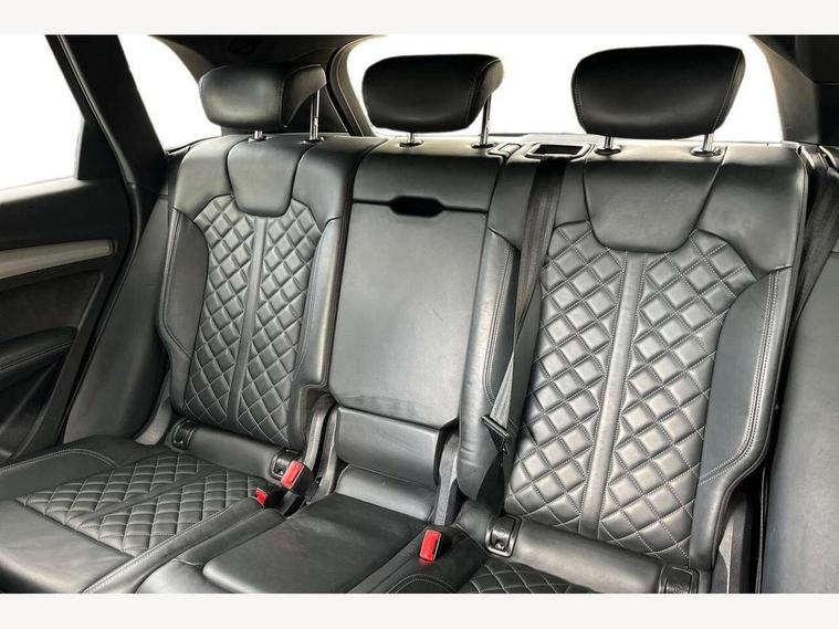 Audi connect safety and service (e-call), Audi drive select, Audi phone box with wireless charging, Audi smartphone interface, Audi virtual cockpit - 12.3" high resolution LCD digital instrument cluster display, Automatic start-stop system with coasting functionality and efficiency programme, Electro - mechanical power assisted steering, MMI navigation plus with 8.3" colour MMI screen and MMI touch, Mobile telephone preparation - bluetooth interface, Power tailgate, Service interval indicator, Voice control system, 70 litre fuel tank and 24 litre AdBlue tank, Adaptive air suspension, Diesel particulate filter, Quattro on demand, 2x SD card slot, Audi sound system, CD player, DAB Digital radio, MMI radio plus with 7" colour MMI screen and MMI controller, Acoustic windscreen, Aluminium roof rails, Audi Beam uses LEDs to project the Audi Sport logo, Auto dimming rear view mirror, Automatic headlight levelling, Body colour bumpers, Body colour S Line side skirts, Body colour S specific rear diffuser, Body colour underbody protection, Chrome exhaust tailpipe, Electric adjustable/heated/folding door mirrors, Front and rear electric windows, High beam assistant, LED headlights with LED rear lights + dynamic rear indicators, Light and rain sensor for auto activation of lights and windscreen wipers, Loading sill protector in stainless steel, Privacy glass with front acoustic glazing, Rear wiper, S air inlet in titanium black, S front and rear bumpers, S Line rear spoiler, Twilight grey matt radiator grille with matt aluminium horizontal chrome struts, 2 x USB charging port with aux input socket, 3 rear headrests, 3 spoke flat bottom high multi-function leather steering wheel, 4 way electric lumbar support for driver and front passenger, 40:20:40 split folding rear seat with rear centre armrest, Black cloth headlining, Contrast stitching on seats, steering wheel and gear lever gaiter, Deluxe 3 zone electronic climate control, Fine Nappa leather upholstery with diamond stitching, Front centre armrest, Front sport seats with S embossed logo, Front/rear floor mats, Fully electrically adjustable driver's seat, Fully electrically adjustable front passenger seat, Heated front seats, Height adjustable front head restraints, Height/reach adjustable steering column, Illuminated door sill trims with S logo, ISOFIX child seat mounting and top tether, Luggage compartment carpet, Massage function for front seats, Perforated leather gearknob, Rear seat bench plus, Removable luggage compartment floor, Stainless steel pedals, Sunvisors with vanity mirrors, Tool kit, Trunk roller cover, Extended LED Interior Lighting Pack - Q5, High gloss pack - Q5, Non Smokers pack, 3 point seatbelts on all seats, 6 airbags - Driver, front passenger, curtain and side airbags, Electromechanical parking brake, Electronic stabilisation control including ABS, ASR and EDL, Front passenger airbag deactivation, Hill descent control, Hill hold assist, Multi collision brake assist, Pop-up bonnet for pedestrian protection, Pre sense city, Seat belt force limiter, Seatbelt monitoring, Tyre pressure warning, Warning triangle and first aid kit, Anti theft alarm, Anti-theft wheel bolts, Keyless Go access/ignition system, Remote central locking,