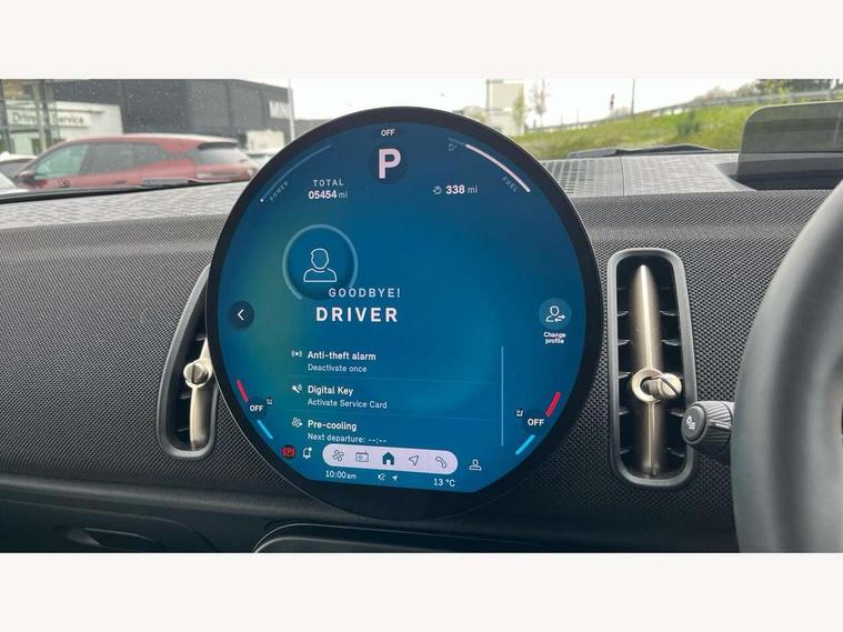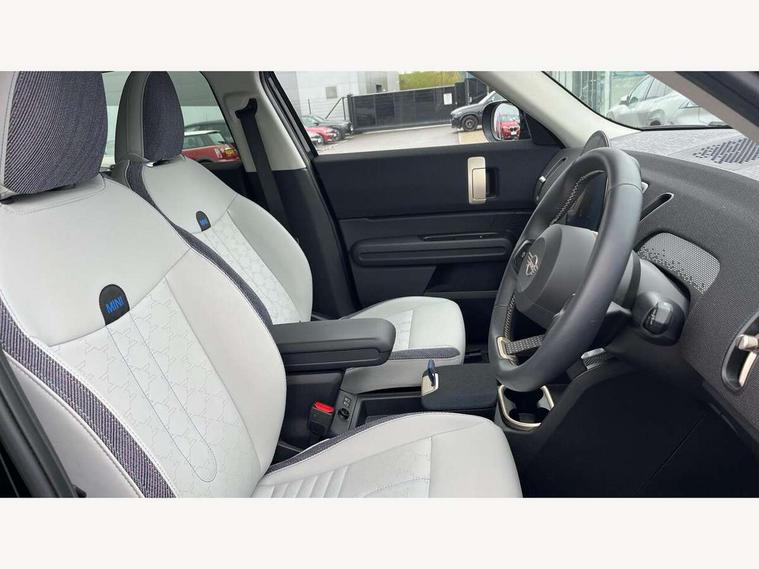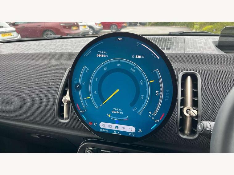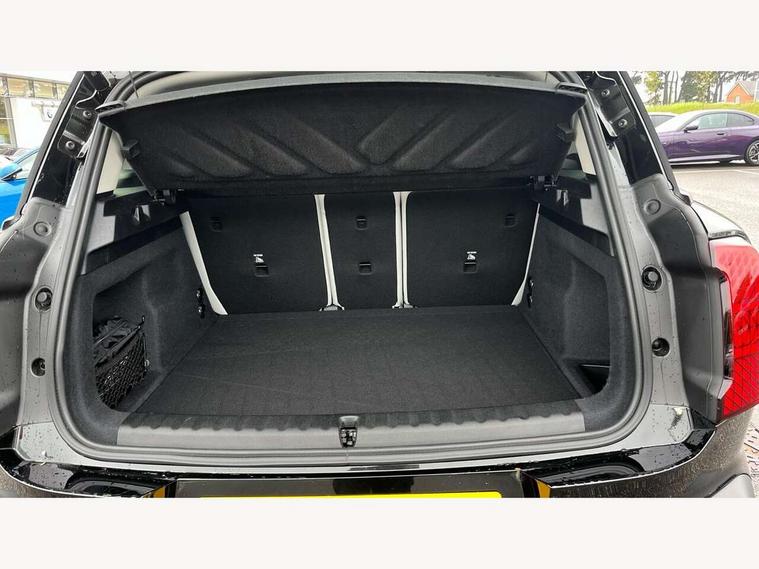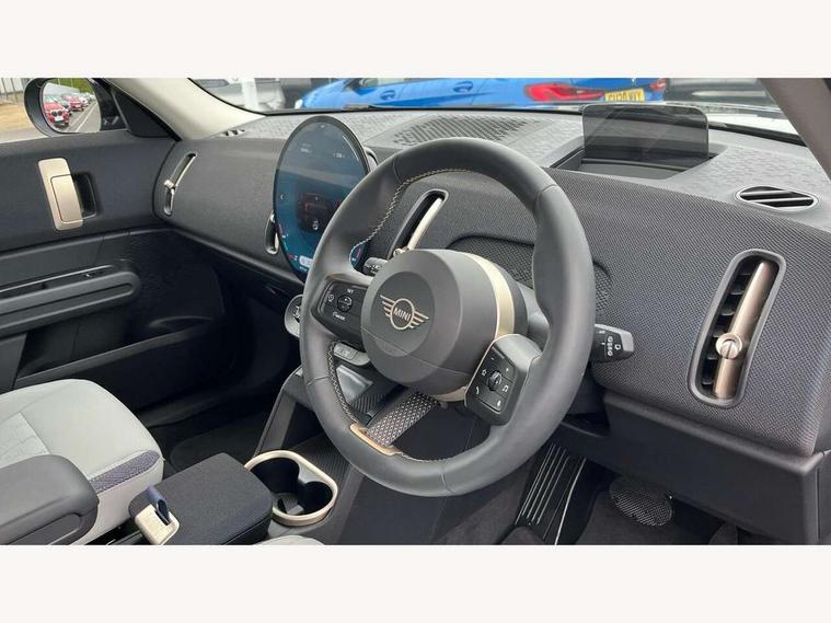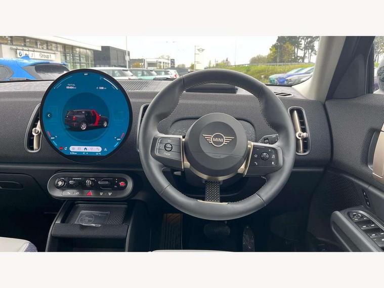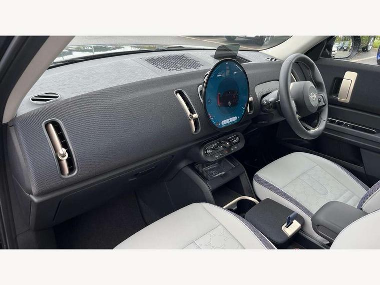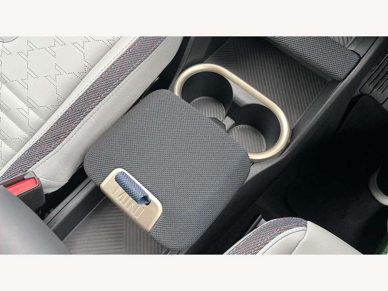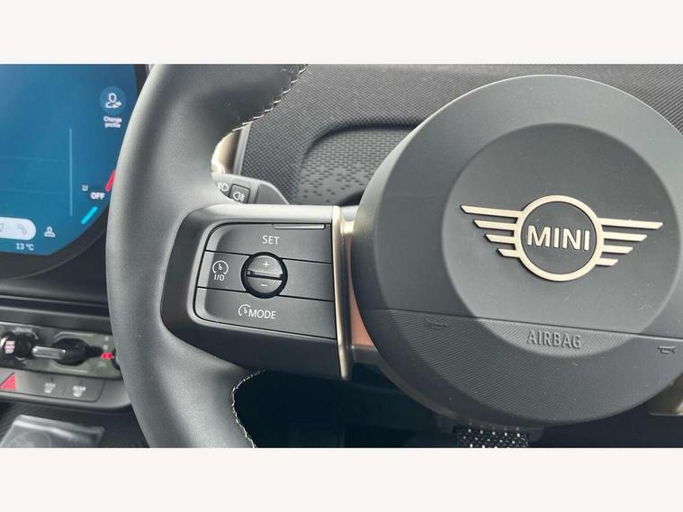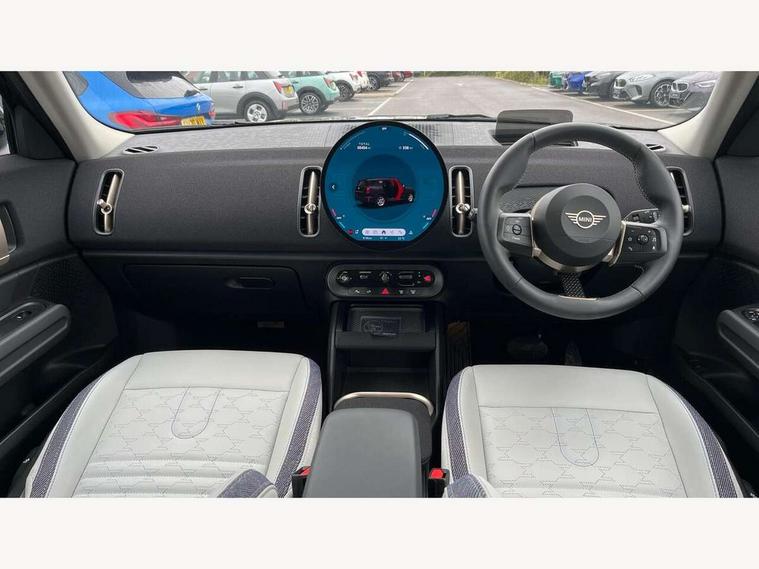 Bluetooth connection, Circular OLED Screen, Compatible mobile phone bluetooth with audio streaming, Cruise Control (DCC), Digital dashboard display, Driving assistant, E-call, Electro-mechanical speed dependant steering assistance, MINI Experience Modes, Mini navigation system, MINI TeleServices, Parking assistant in camera and ultrasound based assistance system, rear view camera, parking aid and distance control, Auto transmission with Paddles, Larger capacity fuel tank, 6 speakers, DAB Digital radio, Personal eSim, Auto tailgate, Electric adjustable heated door mirrors, Front and rear electric windows, Heated rear window, LED daytime running lights, LED Headlights, LED rear lights, LED third brake light, Rain sensor with auto headlights, Rear side wing doors, Rear window wiper, Roof rails, 3 seat bench in 2nd row, 60/40 split rear bench seat, Auto air conditioning, Floor mats, Front armrest, Front headrests, Heated steering wheel, Height and length steering column adjustment, Light headliner, Rear headrests, Single front passenger seat, Sport Vescin Steering Wheel, Sunvisors with vanity mirrors, Vescin/Cloth upholstery, 3x3 point rear seat belts, 6 Airbags - front, side, head and seat belt tensioners, ABS, DSC - Dynamic Stability Control, Electronic handbrake, Electronic Stability Programme (ESP), Front ISOFIX (iSize), Hill hold assist, Hill start assist, Manual rear child locks, Traction control, Tyre pressure monitoring system, Warning triangle, Alarm system with tilt sensor, monitoring doors, bonnet interior and tailgate, Auto drive away locking, Deadlocking function, Electronic vehicle immobiliser, Locking wheel bolts, Remote control locking, Start/stop toggle with keyless go, Black/Blue dashboard knit, MINI Mobility Kit,