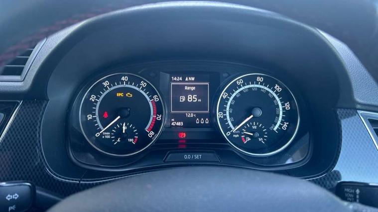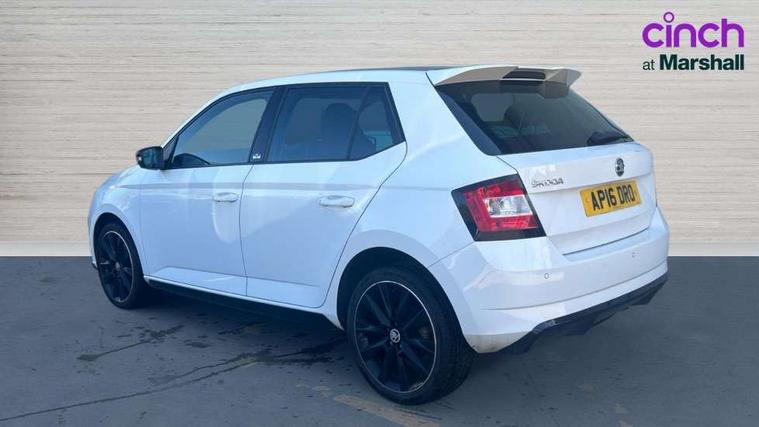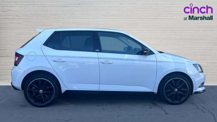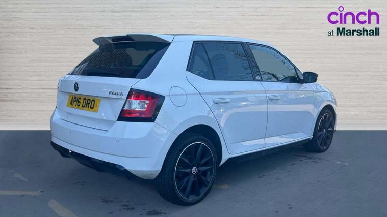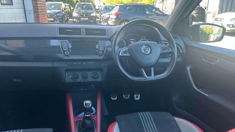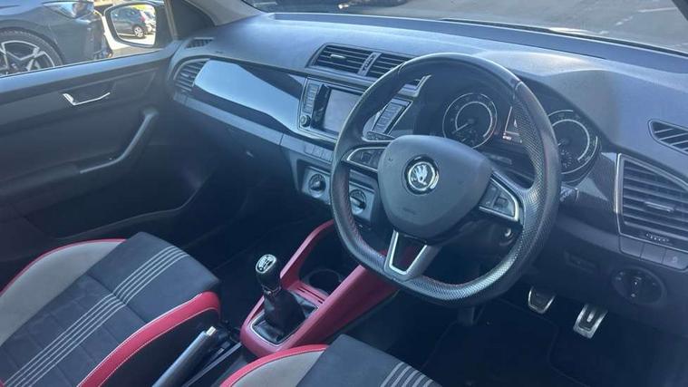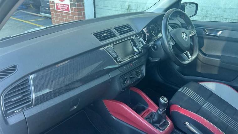 Bluetooth system, Exterior temperature gauge, Front assistant collision mitigation, Maxi dot trip computer, PAS, Service interval indicator, SmartLink, Auxiliary socket for external MP3 player, Bolero radio with telephone control, Mirror Link, USB and SD card, DAB Digital radio, Black door mirrors, Black radiator grille, Body colour bumpers, Body colour door handles, Body coloured rear spoiler, Electric front windows, Electrically adjustable and heated door mirrors, Heated rear window, Height adjustable headlamps, Intermittent rear wash/wipe, LED daytime running lights, Panoramic sunroof, Sunset glass from b-pillar back, Tinted rear windows, Tinted windscreen, 1.5L bottle holder in front door panels, 2 height adjustable rear headrests, 3 spoke leather multifunction sports steering wheel with red stitching, 60/40 split folding rear seat, Boot stowage box, Cargo area storage tray, Cherry red centre console, Cloth upholstery, Driver + passenger vanity mirrors, Floor mats with red stitching, Folding grab handles, Front reading lights, Front sports seats, Height adjustable driver's seat, Height adjustable front headrests, Height adjustable passenger seat, Height/reach adjust steering wheel, Interior light with delay, Leather gearshift, Leather handbrake, Lower glovebox cover, Luggage load hooks, Parcel shelf, Pearl grey carpets, Pearl grey headlining, Pollen filter, Rear courtesy light, Rear storage trays, Storage compartment under front seats, Ticket holder, Two rear outer seat isofix location points, Arkamys surround sound pack - Fabia, Chrome Pack - Fabia, 3x3 point rear seatbelts, ABS, Curtain airbags, Driver and passenger airbags, Driver and passenger side airbags, EDS, ESC with ASR, Front seatbelt pretensioners, Hydraulic Brake Assist (HBA), Passenger airbag deactivate switch, Seatbelt warning, Tyre pressure monitor, Alarm with interior monitoring, Immobiliser, Locking wheel bolts, Remote central locking, Black decorative inserts,