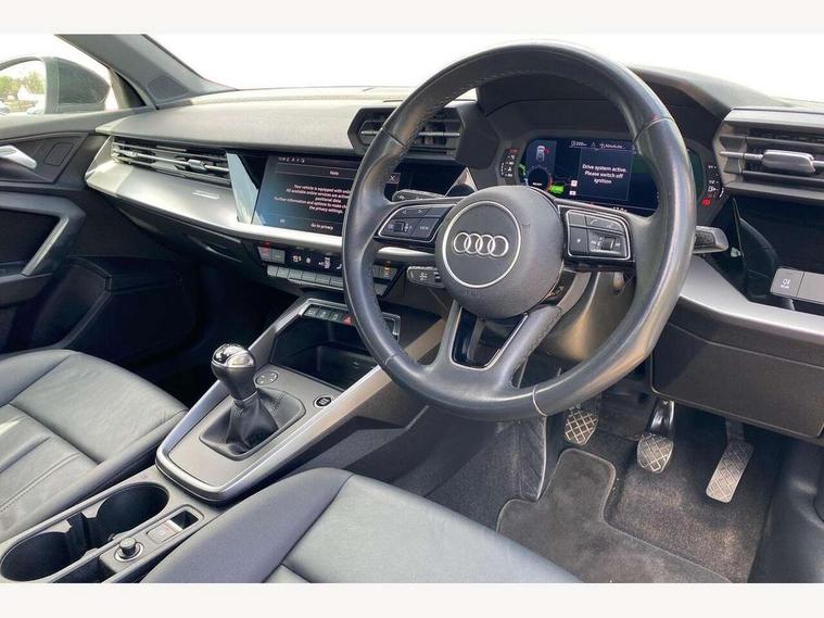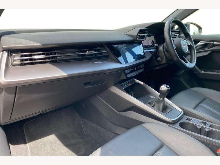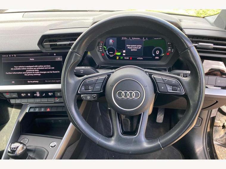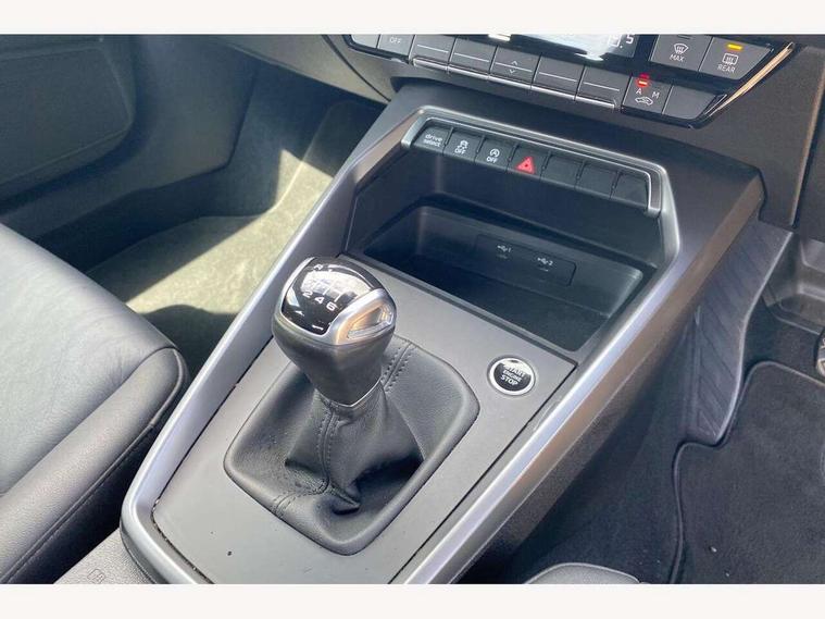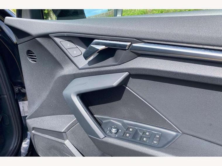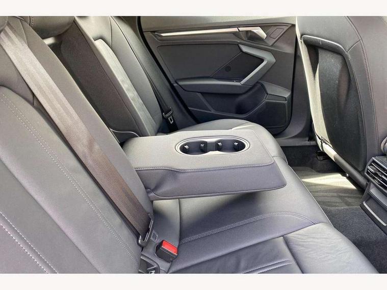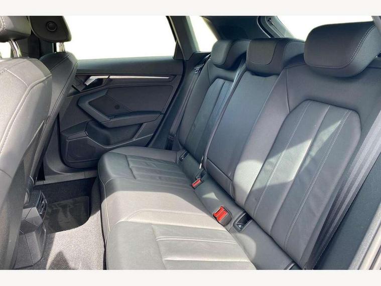 Audi drive select (Auto, Comfort, Dynamic and Individual), Audi smartphone interface, Audi Virtual Cockpit - 10.25" digital and colour instrument cluster, Automatic start/stop system with recuperation, Bluetooth interface, Camera based traffic sign recognition, Collision avoidance assistant, Cruise control, e-Call (emergency call), Electromechanical power speed sensitive steering, Lane departure warning system, MMI Navigation Plus with high resolution 10.1" colour touch screen display, Rear parking sensors, Service indicator, Trip computer, Voice control system with natural language interaction, Standard suspension, 2xUSB-C connection with data and charging functions, 6 passive loudspeakers, DAB Digital radio, 3rd brake light, Acoustic glass windscreen, Aluminium window trim, Auto dimming frameless rear view mirror, Body colour exterior mirrors, Body colour roof spoiler, Electrically adjustable/heated/folding/auto dimming door mirrors with integrated LED indications + kerb view function for passenger side, Front electric windows, LED daytime running lights, LED headlights and halogen rear lights, Light and rain sensors, Rear electric windows, Rear side wing doors, Rear window, rear door windows and rear side windows in clear glass, Rear wiper, 12V socket and storage compartment in front centre console, 3 seat bench in 2nd row, 3 spoke leather multifunction steering wheel, 4 way electrically adjustable lumbar support for driver and front passenger, 60/40 split folding rear seat bench, Dual zone electronic climate control, Front and rear headrests, Front centre armrest, Front door sill trims with aluminium inlay, Front/rear floor mats, Height and reach adjustable steering wheel, Interior lighting - Front and rear roof module including reading lights, glove compartment light and right hand side, Interior lighting - glove compartment light and right hand side, Luggage compartment floor covering, Manual boot compartment lid, Manually adjustable front seats, Routine cloth upholstery with front sports seats, Seat side bolsters, Single front passenger seat, Steel grey cloth headlining, Aluminium interior elements pack - A3 Sportback, LED interior lighting pack - A3 Sportback, Sport styling pack - A3 Sportback, 3x3 point rear seat belts, Driver and front passenger airbag with passenger airbag deactivation, Electronic Stabilisation Control (ESC) including ABS, ASR and EDL, First aid kit with warning triangle and 2 safety vests, Front side airbags with head airbags and interaction airbag, Pre-sense front with pedestrian and cyclist detection, Seatbelt monitoring, Tyre pressure loss indicator, Anti theft alarm, Anti-theft wheel bolts, Electronically operated child lock, Immobiliser, Remote control central locking, Inlays with silk effect paint in platinum grey,