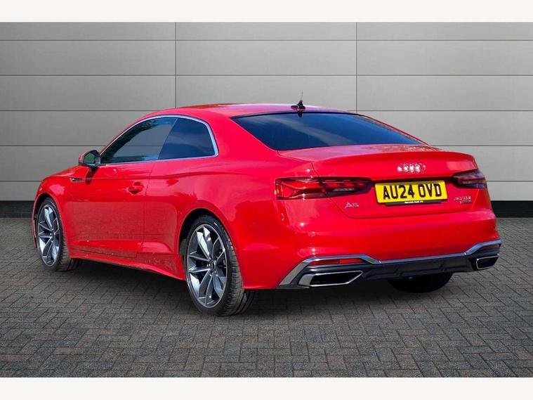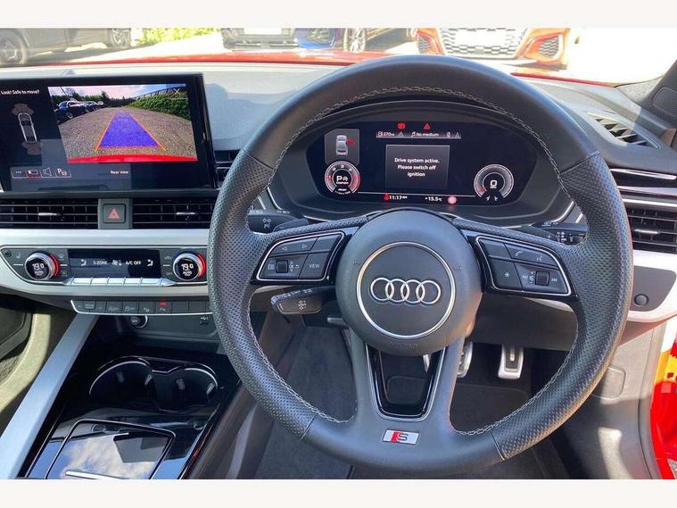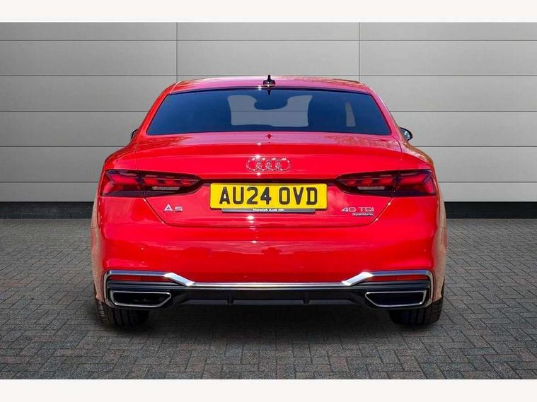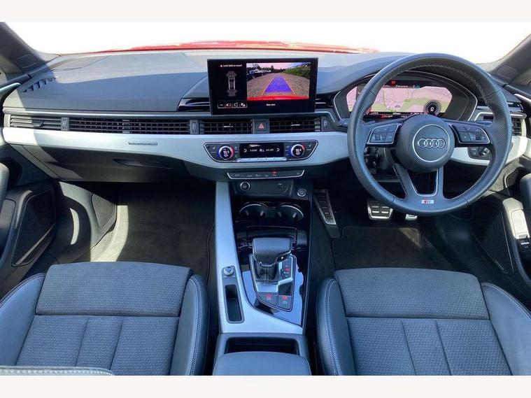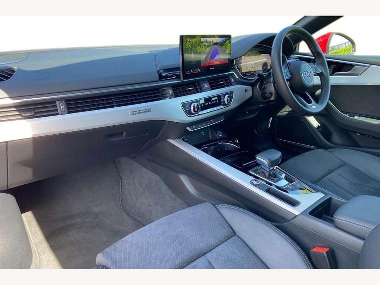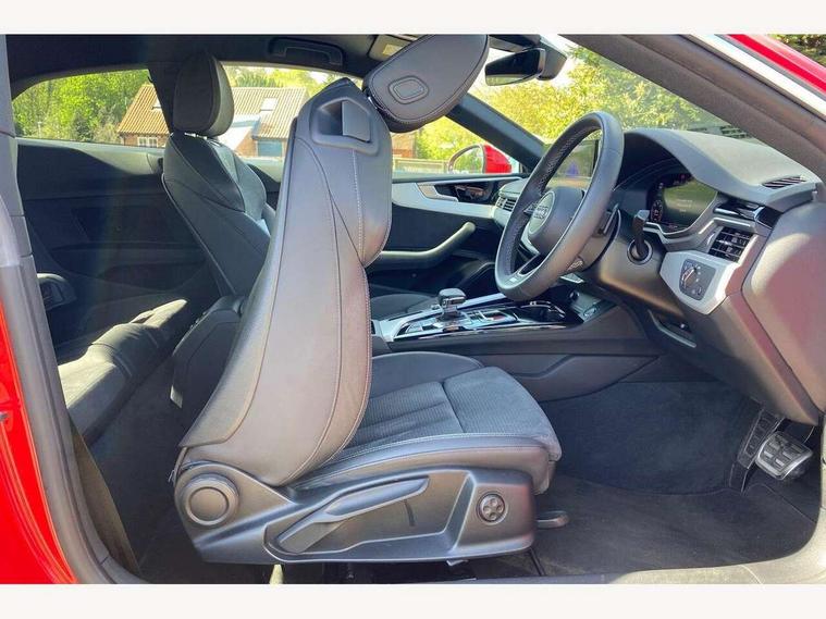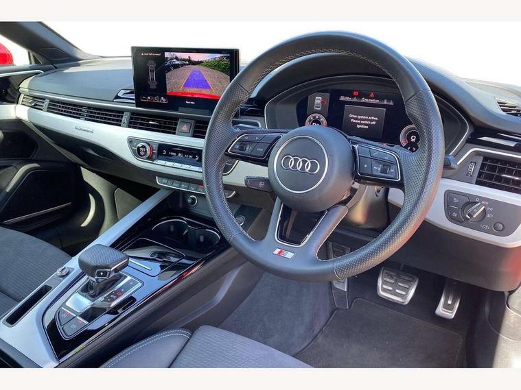 Audi connect safety and service (e-call), Audi drive select (Auto, Comfort, Dynamic, Efficiency and Individual), Audi smartphone interface, Audi virtual cockpit - 12.3" full colour digital instrument cluster, vehicle/engine speed, Radio/media information+Driver assistance systems, Automatic start-stop system with coasting functionality and efficiency programme, Bluetooth interface, Camera based traffic sign recognition, Electric boot lid release, Electro-mechanical power steering, Email, calendar and text messages displayed via MMI, Front and rear parking sensors, Lane departure warning, MMI nav+ with MMI touch - 10.1" high resolution MMI display, touch sensitive, 3D map, route/country info, dynamic route guide, personal route assist, Rear view camera, Service interval indicator, Voice control system, 58 Litre fuel tank, Diesel particulate filter, Sports suspension lowered by 23mm, 8 passive loudspeakers, CD player, DAB digital radio reception, Two additional USB ports for rear passenger in rear centre console, Two SDXC card slots, Auto dimming door mirrors, Auto dimming rear view mirror, Body colour bumpers, Body colour door handles, Body colour front spoiler lip, Body colour side sill trim, Body coloured door mirrors, Electric adjustable heated door mirrors, Electric folding door mirrors, Electric front windows, Front fog lights, Honeycomb structure radiator grille in grained matt black, Kerb-view function for passenger side, LED headlights and rear lights with LED daytime running lights, LED side indicator lights integrated into door mirrors, LED third brake light, Matt aluminium silver tailpipe trim, Privacy glass, Rain and light sensors, Rear boot, Rear side wing doors, S line badges on front wings, S line front and rear bumpers with side skirts, S Line rear diffuser in matt anthracite black with trim strip in matt aluminium silver, Side air inlets in grained matt black with matt aluminium silver inlay, Variable front intermittent wipers, Windscreen with acoustic glazing, 2 seat bench in 2nd row, 3 spoke high multifunction leather sport steering wheel with paddle shfit and S badging perforated leather grips, 4 way electric lumbar support for driver and front passenger, 40/20/40 split folding 2 seater rear seat bench with rear centre armrest, Adjustable steering column, Black carpets, Black cloth headlining, Black perforated leather gearknob, Contrast stitching on seats, steering wheel and gear lever gaiter, Deluxe 3 zone electronic climate control, Front centre armrest, Front head restraints, Front/rear floor mats, Heated front seats, Illuminated front door sill trim with S logo, ISOFIX child seat mounting and top tether, Luggage compartment mat, Manual seat adjustment, Rear headrests, Single front passenger seat, Stainless steel pedals and footrest, Sunvisors with vanity mirrors, Tool kit, LED interior light pack - A5/RS5, 2 x 3-point rear seatbelts, 6 airbags - Driver, front passenger, curtain and side airbags, Attention and drowsiness assist, Electromechanical parking brake, Electronic Stabilisation Control (ESC) including ABS, ASR and EDL, Front passenger airbag deactivation, Height adjustable front seatbelts, Hill hold assist, Multi collision brake assist, Pop-up bonnet for pedestrian protection, Pre sense city, Seatbelt monitoring, Tyre pressure warning, Variable restraint system, Warning triangle and first aid kit, Anti theft alarm system, Anti theft wheel bolts, Immobiliser, Keyless Go, Remote central locking, Matt brushed aluminium inlays, Tyre repair kit,