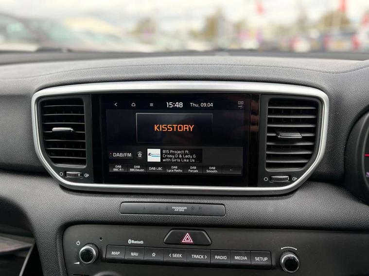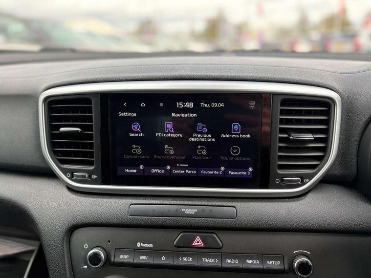 3.5" supervision cluster display, 8" touchscreen satellite navigation with European mapping and traffic messaging channel, Android auto with voice control, Apple car play with voice control, Cruise control + speed limiter, Driver attention warning, Emergency stop signalling system, Kia connected services featuring TomTom live, Lane keep assist, Rear parking sensor, Reversing camera, Speed limit information, Speed sensitive power steering, Telematics system with UVO connect services, Trip computer, Windscreen washer level indicator, Intelligent Stop and Go, 6 speaker audio system, Bluetooth audio streaming, DAB Radio with MP3, Rear USB port, Steering wheel mounted audio controls, USB/iPod/auxiliary input connections, All round electric windows with drivers auto up/down function, Auto dimming rear view mirror, Automatic lighting control, Automatic window defogger, Bi-Function halogen headlights, Black side sill and wheel arch body mouldings, Body colour door handles with chrome inserts, Body colour door mirrors, Chrome front bumper insert, Chrome grille surround, Chrome window surround, Electrically adjustable/heated/folding door mirrors with LED indicators, High beam assist, High gloss black diamond mesh radiator grille, LED daytime running lights, Privacy glass - Rear windows and tailgate, Projection front fog lights with matt black surround, Rain sensing front wipers, Rear spoiler, Rear wiper, Roof rails, Shark fin antenna, Tinted glass, Trailer stability assist, Welcome and follow-me home light functionality, Wide view drivers door mirror, 12V power in front and rear centre console, 3 x passenger assist grips, 60/40 split folding rear seat, Air filter, All-round height adjustable headrests, Centre cabin light, Centre console storage box, Driver and front passenger side sunvisors with illuminated vanity mirrors, Driver's seat manual height adjust, Drivers seat power lumbar support, Dual zone automatic air conditioning, Front and rear door storage, Front cabin LED map light with sunglasses case, Front door courtesy reflectors, Front seat and rear pockets, Front/rear centre armrests, Gear shift indicator, Glovebox illumination, Heated front and outer rear seats, Ignition key lock illumination, Interior door lock/unlock function, ISOFIX Child seat top tethers and anchor fixings, Leather steering wheel, Leather trimmed door armrests, Leather trimmed gearshift, Light grey headlining, Luggage area light, Luggage area load cover, Luggage net hooks, Premium cloth upholstery, Rear centre armrest with cupholder, Rear coat hooks, Satin chrome interior door handles, Tilt/telescopic adjustable steering wheel, Ventilation ducts to rear compartment, Active front headrests, All round 3-point seatbelts, Anti-lock braking system with electronic brakeforce distribution, Dual front side airbags, Electronic stability control with downhill brake control, Front passenger airbag cut-off switch, Front seatbelt pretensioners + load limiters, Height adjustable front seatbelts, Hill start assist control (HAC), Impact sensing auto door unlocking, Rear door child safety locks, Traction control, Twin curtain airbags with roll over sensor, Twin front airbags, Tyre pressure monitoring system, Advanced anti-theft system including immobiliser and alarm, Door deadlocks, Locking wheel nuts, Remote central door locking with fold away key, Speed sensitive auto door locking, Visible vehicle identification number, Metallic finish centre fascia, 17" Alloy wheels, Tyre mobility kit,