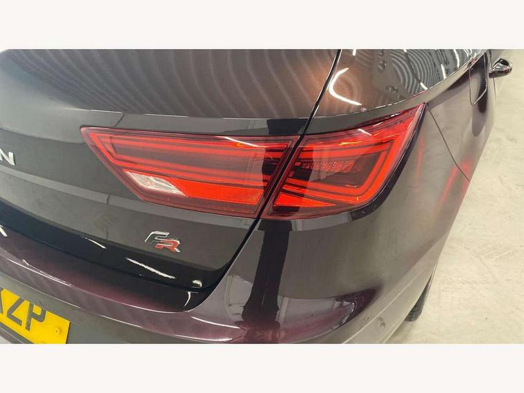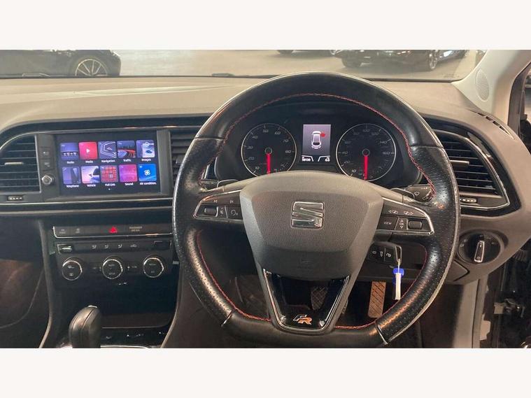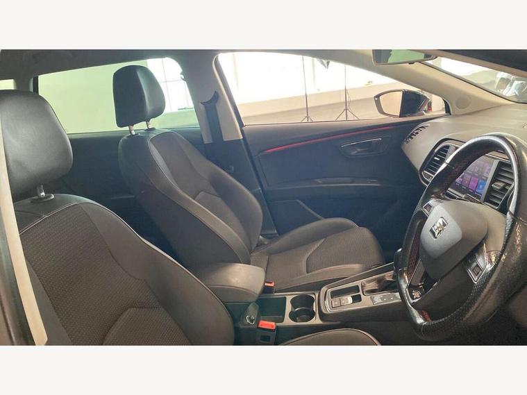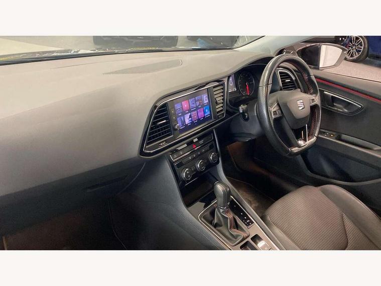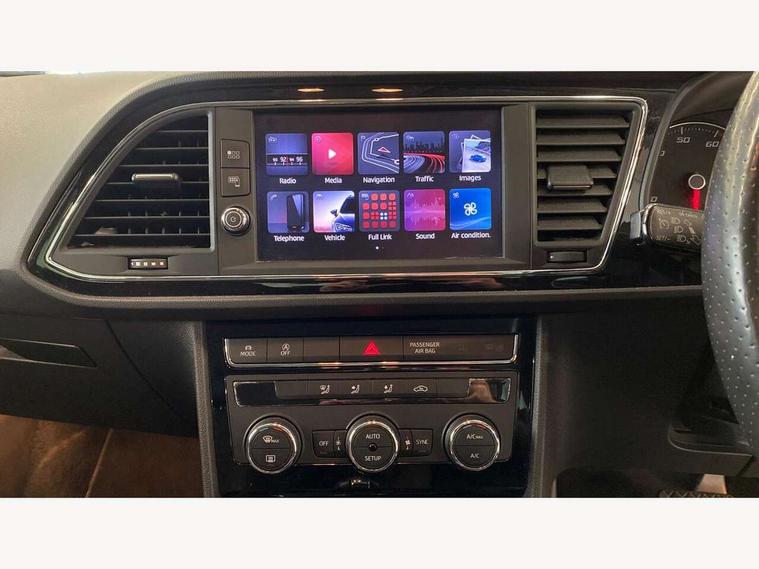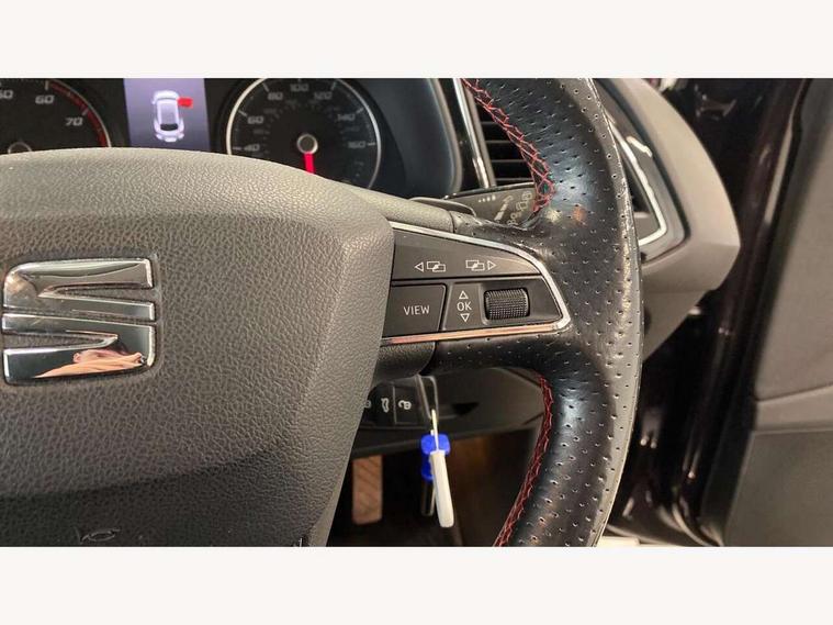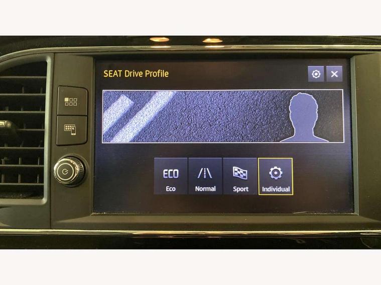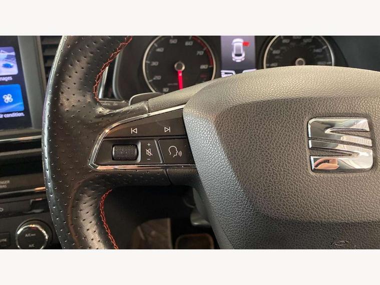 'Lights On' Reminder warning buzzer, 8" touch screen, Bluetooth Handsfree Phone Connection, Low fuel warning light, Outside temperature gauge, Rear parking sensors, Remote fuel flap release, SEAT Drive profile, SEAT logo boot release, Service interval indicator, Trip computer, Voice control system, XDS electronic differential lock, 2 USB ports, 2 USB sockets in rear, 2x SD card slot, Auxiliary input socket, Bluetooth audio streaming, DAB Digital radio, Radio/CD + MP3, Steering wheel mounted audio/phone controls, Aluminium front door sills, Black grille with chrome surround, Body colour door handles, Body coloured bumpers, Body coloured door mirrors, Dark tinted rear windows, Electric adjustable/heated/folding door mirrors, Electric front/rear windows with one touch/auto up/down, Electric headlamp adjustment, High gloss black finish B and C pillars, LED daytime running lights, LED front fog lights, LED Headlights, LED indicators in door mirrors, LED number plate light, LED tail lights, Rear wash/wipe, Reverse activated kerb-view adjustment on passenger's door mirror, Twin exhaust pipes, 12v power point in centre console, 3 height adjustable rear headrests, 60/40 split folding rear seat, Active head restraints, Additional heating and ventilation outlet in rear of centre console, Boot net, Chrome loading sill, Double boot floor, Driver seat height adjust, Driver seat lumbar adjustment, Driver/passenger sunvisors with illuminated vanity mirrors, Dual zone climate control, Dust/pollen filter, Front adjustable head restraints, Front armrest with storage box, Front cupholders x 2, Front map reading lights, Front seat and rear pockets, Front sports seats, Front/rear floor mats, Height/reach adjust steering wheel, Illuminated door sills, Illuminated glovebox, Instrument lighting with brightness control, Leather handbrake, Luggage compartment cover, Luggage tie-down hooks, Passenger seat height adjuster, Passenger seat lumbar adjust, Perforated leather steering wheel with red stitching + gear knob, Rear reading lights, Rear top tether child seat ISOFIX attachment, Rear window curtains, Steering wheel gearshift paddles, Storage boxes under front seats, 3 point seatbelts on all rear seats, ABS + traction control, Active pedestrian safety system, Child proof door locks, Collision mitigation braking system, Curtain airbags, Driver/Front Passenger airbags, Drivers knee airbag, Electronic parking brake with auto hold, ESP+EBA, Front assist including city emergency braking, Front seatbelt pretensioners, Front Seatbelt warning, Front side airbags, Hill hold control, Passenger airbag deactivation system, Tyre pressure monitoring system, 2 folding remote keys with window open/close function, Engine immobiliser, Locking wheel bolts, Remote central locking + deadlocks, Volumetric alarm with back up horn, Chrome interior trim,
