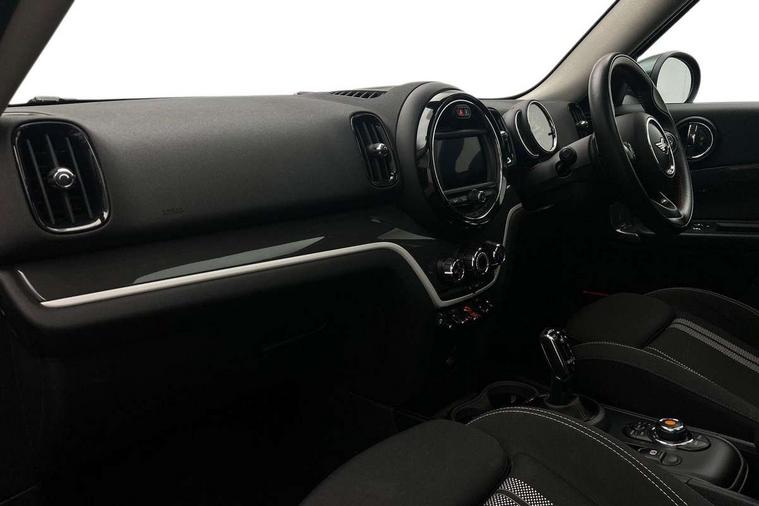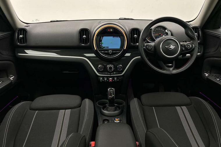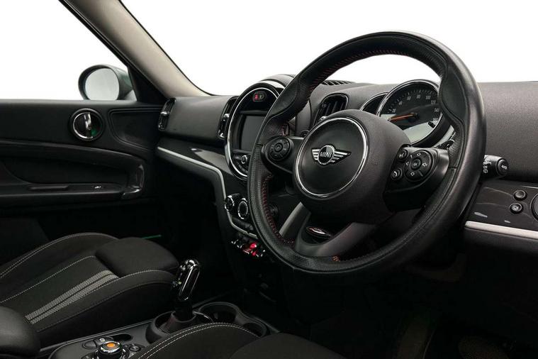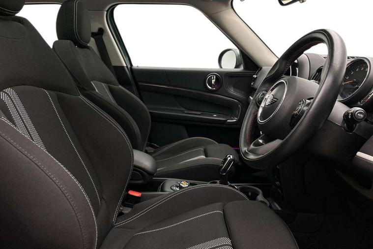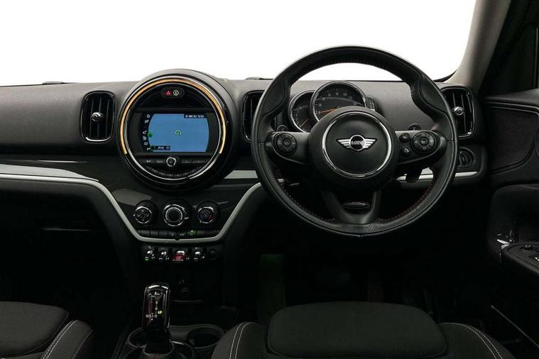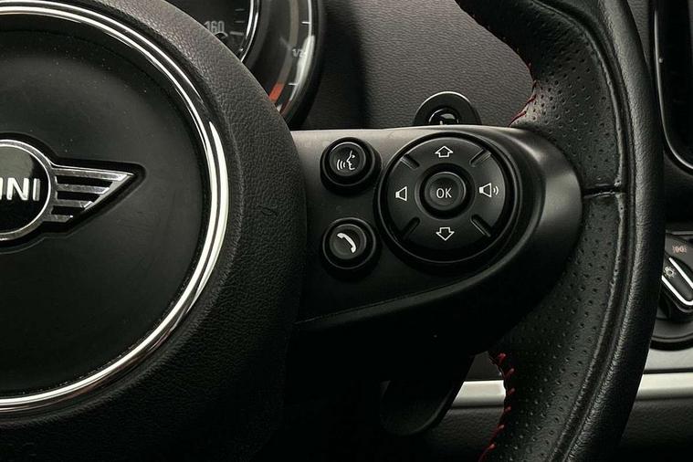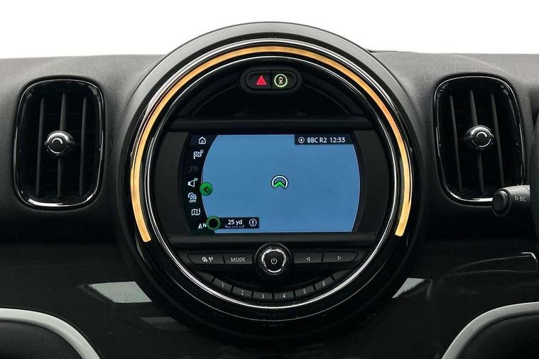 Apple CarPlay preparation, Brake pad wear indicator warning light, Central display with LED ring and 6.5" colour touch screen, Connected driver, DTC - Dynamic traction control, Exterior temperature gauge, Intelligent emergency call, MINI remote services, MINI TeleServices, Navigation system, On board computer, Personal Profile, Real time traffic information, Service interval indicator, Servotronic speed sensitive power steering, Electronic differential lock, Performance Control, Auxiliary input socket, DAB digital radio module, MP3 compatible radio/single CD player, Radio visual boost, Anti dazzle rear view mirror, Body colour scoop integrated into engine- compartment lid, Chrome door handles, Chrome headlight surround, Chrome plated radiator grille, Chrome side scuttle, Chrome window surround, Electric front windows + one touch + anti-pinch, Electrically adjustable door mirrors, Follow me home headlights, Green tinted glass, Heated door mirrors/heated windscreen washers, Heated rear window with automatic switch off, Metal look door sill finishers, Rain sensor including auto headlights activation, Rear wiper, Roof spoiler, Twin chrome exhaust tailpipes, White indicator lights, 12V power point front, 2 cupholders in front centre console, 4 lashing points to secure luggage, 40:20:40 split folding rear seats, Centre console storage box, Chrome interior door handles, Driver/passenger sunvisors, Front and rear headrests, Front interior light, Front passenger grab handle, Front seat backrest storage nets, Gearshift paddles, Heater with recirculation function, Height/reach adjust steering wheel, Isofix rear child seat preparation, Luggage compartment lighting, Multifunction steering wheel, Rear grab handles, Sensatec gearshift and handbrake, Sport front seats, Storage compartments in doors, Toolkit in luggage compartment, Interior lights pack - Countryman, MINI Excitement Pack - Countryman, 3 point automatic seatbelts, 3 point seatbelts on all rear seats, ABS, Cornering brake control (CBC), Crash Sensor - activates hazard/interior lighting + unlocks doors, Driver and passenger airbags, Driver and passenger side airbags, DSC - Dynamic Stability Control, Electronic brake force distribution, Electronic parking brake, Front curtain airbags, Front passenger airbag deactivation, Fuel cut off safety device, Hill start assist, Pyrotechnically pre-tensioned front seatbelts, Tyre pressure warning, Automatic door locking, Keyless start, Locking wheel bolts, RF remote control central locking, Second remote key, Thatcham category 1 alarm + immobiliser,