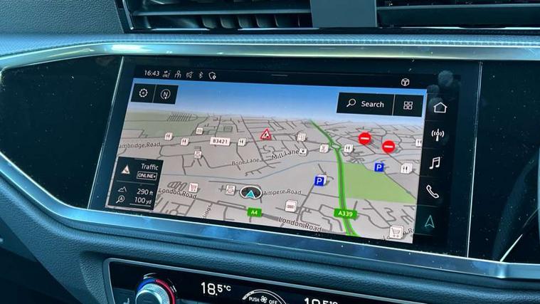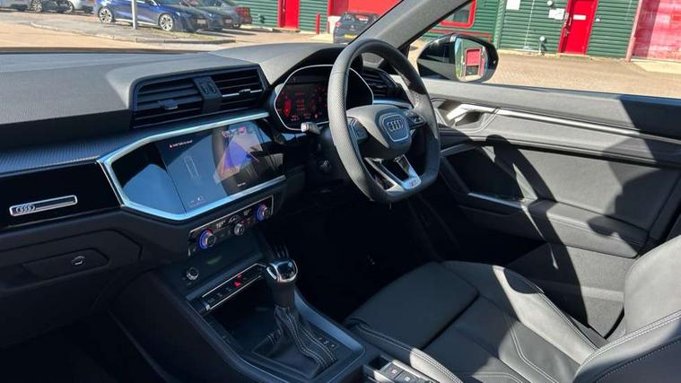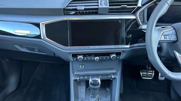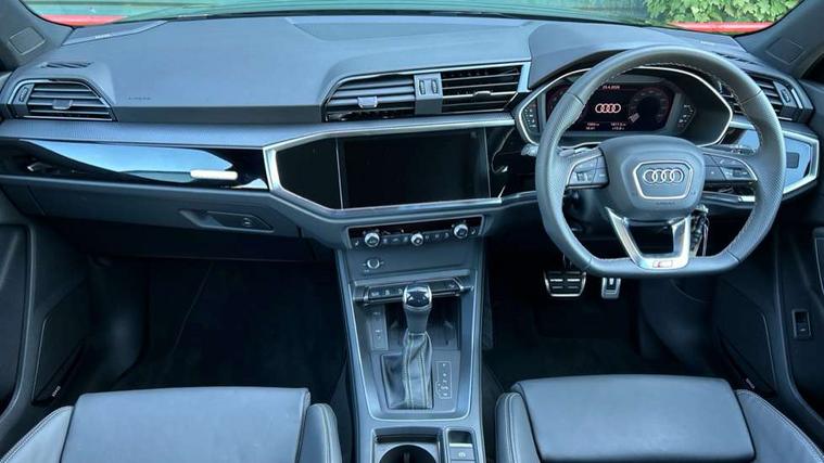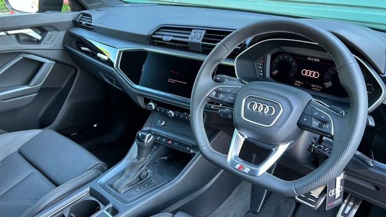 Amazon alexa Integration, Audi connect safety and service, Audi drive select, Audi lane departure warning, Audi Virtual Cockpit - 10.25" display, Bluetooth interface, Camera based traffic sign recognition, Distraction and Fatigue warning, Legal emergency call, MMI Navigation Plus with high resolution 10.1 inch touchscreen colour display, Power operated tailgate, Progressive steering, Service interval indicator, Smartphone interface includes wireless Apple carplay/Android Auto, Start stop system with recuperation, Voice control system with natural language interaction, Sports suspension, 2 USB-C ports with charge and data functions, 6 passive loudspeakers, DAB digital radio module, Acoustic windscreen, Anthracite black radiator grille, Audi Beam uses LEDs to project the Audi logo onto the ground as you exit your Q3, Auto dimming door mirrors, Auto dimming frameless rear view mirror, Black roof rails, Electrically folding, adjustable and heated door mirrors with integrated LED side indicators and kerb view function for passenger side, Front and rear electric windows, Front fog lights, Grille vertical bars in aluminium silver/Matt, High gloss black finish B and C pillars, LED Dynamic rear indicators, LED headlights with LED daytime running lights, LED rear lights, LED third brake light, Privacy glass dark tinted rear and rear-side windows (from B-pillar backwards), Rain and light sensors, Rear diffuser grille in grained matt black, Rear diffuser strip in matt anthracite black, Rear side wing doors, Rear wiper, S line bumpers in contrasting Manhattan grey, Variable front intermittent wipers, 12V socket in rear centre console, 3 seat bench in 2nd row, 40:20:40 folding with manual adjustment for 60:40 forwards/backwards position and backrest angle, Adjustable rear seat bench/backrest with centre armrest and cupholder, Black carpet mats, Black cloth headlining, Dual zone electronic climate control, Electric lumbar support, Front and rear black floor mats with contrast stitching in rock grey, Front and rear headrests, Front centre armrest, Height and reach adjustable steering wheel, Illuminated door sill trims with S logo, ISOFIX child seat mounting for front passenger with airbag deactivation and outer rear seat including top tether attachment point for outer rear seats, Luggage compartment sill protection in stainless steel, Manual front seats with height adjustment, Perforated leather gearknob, Single front passenger seat, Stainless steel pedals, Twin leather upholstery with front sport seats + S embossing, Black styling pack - Q3, Non smoking pack - Q3, 3x3 point rear seatbelts, 6 airbags - Driver, front passenger, curtain and side windows, Audi pre-sense front with pedestrain and cyclist recognition, Electrically operated child locks on rear doors, Electromechanical parking brake, Electronic stabilisation control including ABS, ASR and EDL, Front seatbelt reminder, Hill descent control, Hill hold assist, Pre sense basic, Seatbelt monitoring, Tyre pressure warning, Warning triangle and first aid kit, Anti theft wheel bolts, Immobiliser, Remote central locking, Thatcham approved category 1 anti theft alarm, Aluminium look interior elements, Detail dashboard around MMI touch colour display in glass look, black with surround in aluminium look, Leatherette door armrest, Piano black inlay,