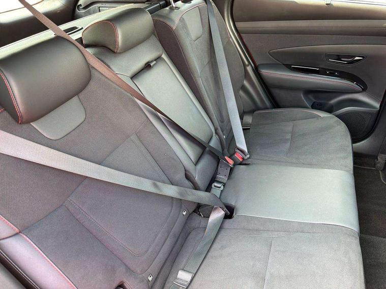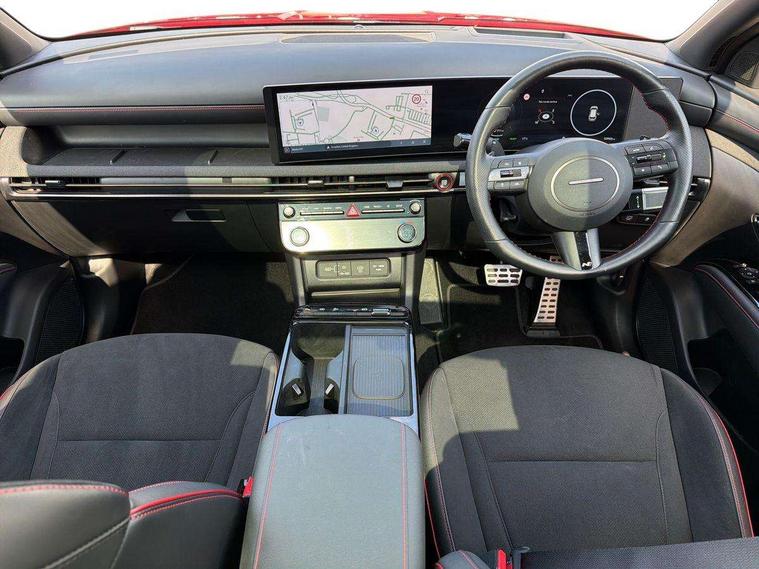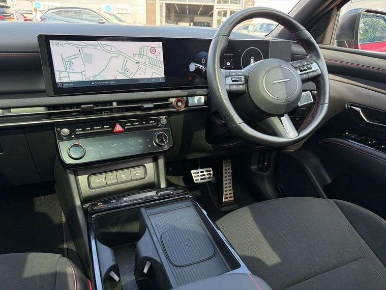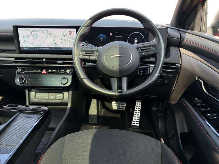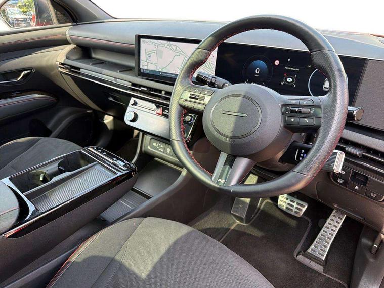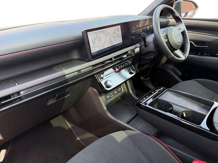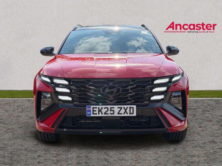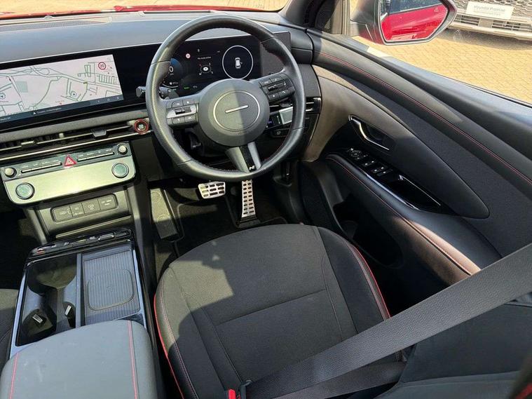12.3" LCD display with driver's supervision instrument cluster, 12.3" widescreen navigation with bluelink and mapcare, Blind spot view monitor, Bluetooth system, Cruise control - smart adaptive speed control with stop and go function, Digital clock, Drive mode selector, Driver attention warning, E-call, Emergency stop signalling system, Forward Collision Avoidance Assist (FCA) - Car, Pedestrian and Cycle, Forward Collision Avoidance Assist Junction Turning (FCAJX), Front and rear parking sensors, Front, rear and side parking distance warning, Head up Display, Highway Driving Assist (HDA), Hyundai road side assistance, Intelligent speed limit assist, Lane follow assist, Lane keep assist, Over the air updates(OTA), Parking collision avoidance assist (PCA), PAS, Rear camera and guidance parking system, Rev counter, Smart power tailgate, Surround view monitor, Tailgate open warning light, Trip computer, Trip odometer, Voice recognition, Water temperature gauge, Windscreen washer fluid sensor and warning indicator, Wireless Apple CarPlay/Android Auto, Wireless phone charging pad, 2 front and 2 rear USB-C ports, DAB Digital radio, Krell premium audio system with 8 speakers and subwoofer, Steering wheel mounted audio/phone controls, Adjustable intermittent front windscreen wipers with aero wiper blade, Auto dimming rear view mirror, Automatic defog system, Automatic headlights with dusk sensor, Automatic windscreen wipers with rain sensor, Body colour bumpers, Body colour door mirrors with integrated indicators, Body colour exterior door handles, Body coloured wheel arches, Electric tilt/slide panoramic sunroof, Electrically adjustable, heated and power folding door mirrors, Follow me home headlights, Front and rear electric windows with anti-trap mechanism and one touch control, Front fog lights, Glossy black bumper mouldings, LED 3rd brake light, LED daytime running lights, LED rear lights, Matrix LED headlights, Positioning Lights - LED, Privacy glass - Rear windows and tailgate, Rear side wing doors, Rear wash/wipe with intermittent wipe setting, Roof rails, Soft touch rear door paneling, Tinted glass with windscreen shade band, Trailer stability assist, 12V power outlets in front console and luggage compartment, 3 seat bench in 2nd row, 40/20/40 split folding rear seat, 64 colours interior ambient lighting, Adjustable head restraints (Up and down), Cupholders in rear armrest, Door courtesy lights, Driver and passenger sunvisors with illuminated LED vanity mirrors, Driver's seat electric adjustments, Front and rear door pockets, Front armrest with storage box, Front centre console and door bottle holders, Front passenger's seat electric adjustments, Heated front seats, Heated rear seats, Heated steering wheel, Height/reach adjustable steering column, Illuminated/air conditioned glove compartment, ISOFIX child seat anchorage points attached on outer rear seats, Leather wrapped steering wheel and gear knob, Leather/faux textile suede upholstery, LED interior lighting, Luggage compartment lighting, Luggage cover, Luggage hooks, Luggage net, Map and reading lights, Metal pedals, Rear seat remote folding function, Rear side window sunblind, Reclining rear seats, Retractable load cover, Single front passenger seat, Sunglasses holder, Three zone climate control, Touch sensitive climate controls with temperature dials, TUCSON branded metal door scuff plate, Underfloor boot compartment, Ventilated front seats, N Line design package - Tucson, N Line interior design package - Tucson, Trailer wiring package - Tucson, 3x3 point rear seatbelts, Active bonnet, Airbag - Front, front side, curtain and centre front airbags, Anti-lock brake system (ABS), Brake assist function, Childproof rear door locks, Curtain airbag roll over sensor, Downhill brake control, Electric parking brake, Electronic stability control, Front and rear seatbelt reminder, Front passenger airbag deactivation switch, Front seatbelt pretensioners, Hill start assist control (HAC), Multi-Collision braking, Outer rear seatbelt height adjustment, Seatbelt height adjustment for front seats, Traction control, Tyre pressure monitoring system with individual tyre pressure display - TPMS, Vehicle stability management, Deadlocks, Immobiliser, Locking wheel nuts, Remote control central locking, Smart key with keyless entry and engine start/stop button, Speed sensitive auto door locking, Thatcham category 1 alarm, 19" Alloy wheels, Tyre repair kit,
