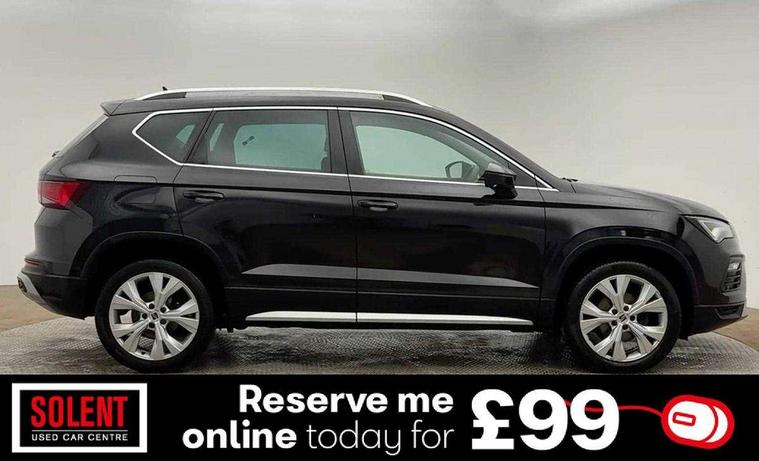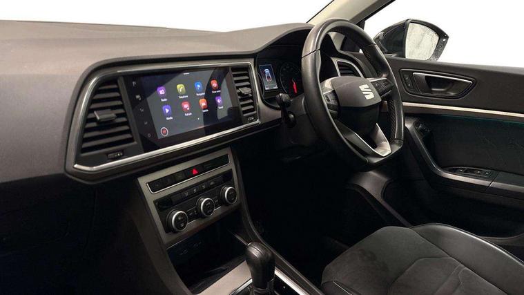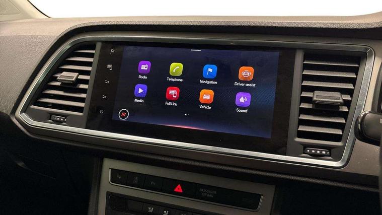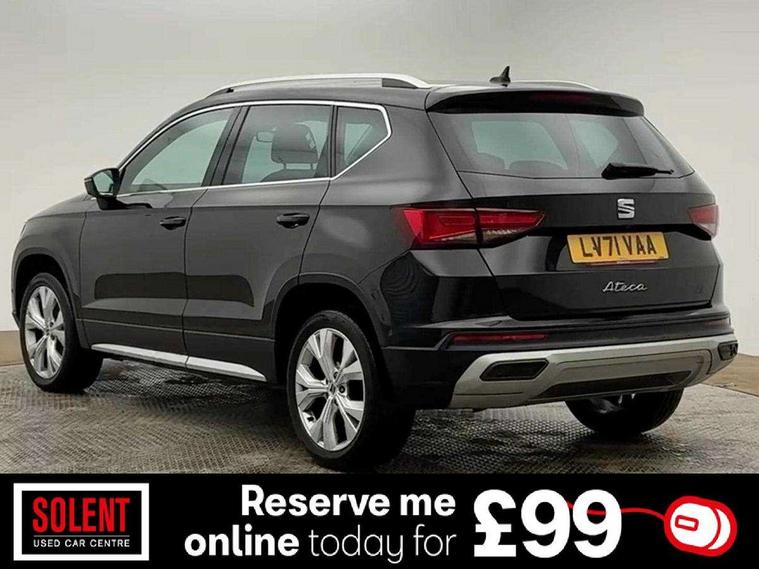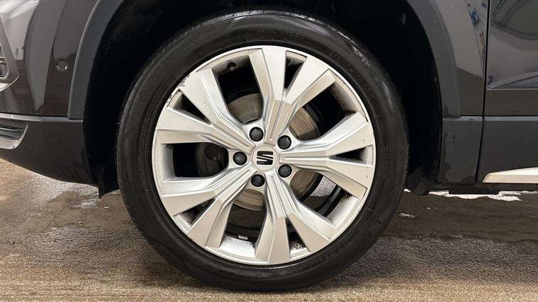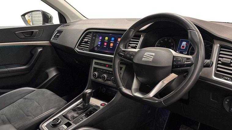 E-call, Outside temperature gauge, Progressive power assisted steering, Rear view camera, SEAT drive profile with driving experience button - Normal, Sport, Eco and Individual mode, gearshift, steering and throttle response, Self parking functionality (includes front and rear parking sensors), Trip computer, Wireless full link smartphone integration, Wireless phone charger, Steering wheel mounted audio/phone controls, Black simulated exhaust pipes, Body colour bumpers, Body coloured wheel arch surrounds, Chrome front grille frame, Chrome roof rails, Chrome side window trim, Dark tinted rear windows, Daytime running lights, Door mirrors with welcome light silhouette, Dynamic headlight range control with self adjusting whilst driving, Electric adjustable/heated/folding door mirrors, Front and rear electric windows, Front grille hot stamping, Full LED headlamps with lens and LED front fog lamps with cornering function, Illuminated aluminium front door sill, LED rear tail lights with dynamic indicators, Rear fog lights, Rear side wing doors, Rear wash/wipe, Reflex silver side mouldings, 12V socket in front, 3 seat bench in 2nd row, 60/40 split folding rear seat, Dual zone climate control, Front and rear head restraints, Front centre armrest, Front seat back storage pockets, Height adjustable driver and passenger seat with lumbar adjustment, ISOFIX points in outer rear seats with top tether anchorage points, Leather steering wheel and gear knob, Microsuede upholstery with front comfort seats, Rear armrest and easy back seat release mechanism from boot, Single front passenger seat, Steering wheel mounted gearshift paddles, Storage compartment under driver's seat, Convenience pack - Ateca, Interior lighting pack - Ateca, Navigation system pack with DAB - Ateca, Safe and driving pack - Ateca, 3x3 point rear seatbelts, ABS, Traction control system (TCS), Electronic stability control (ESC) and Electronic differential lock system (XDS), Airbags - Driver and front passenger airbag with deactivation, front side, two curtain and driver's knee airbags, Electric parking brake with auto hold function, Front and rear seatbelt reminder, Hill hold control, Manual rear child locks, Tiredness recognition system, Traction control, Tyre pressure monitoring system, Alarm, Keyless entry, Locking wheel bolts, Chrome interior detailing, 18" Brillaint silver alloy wheels,