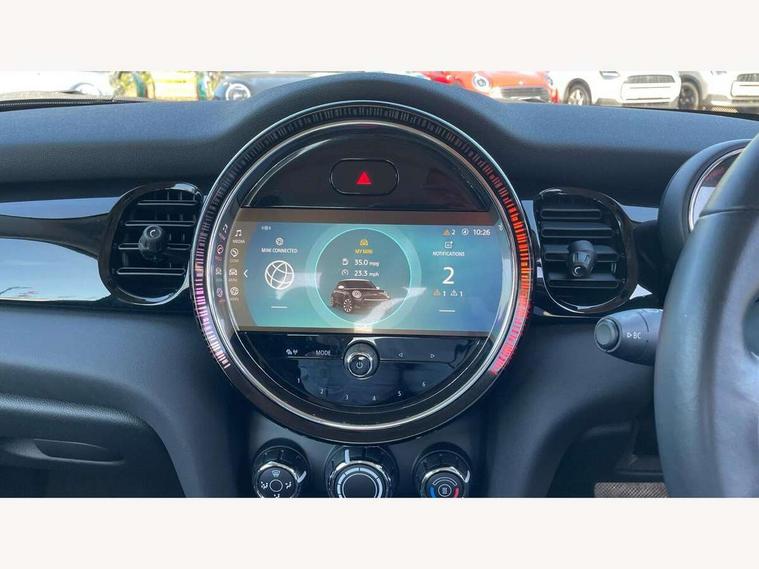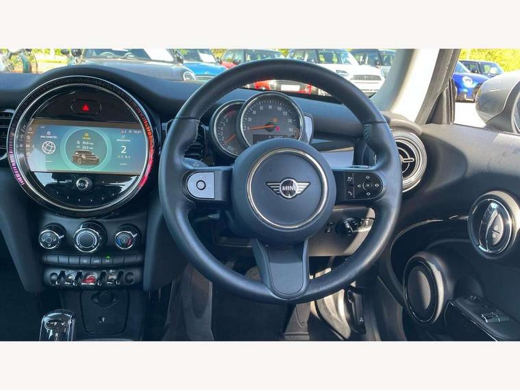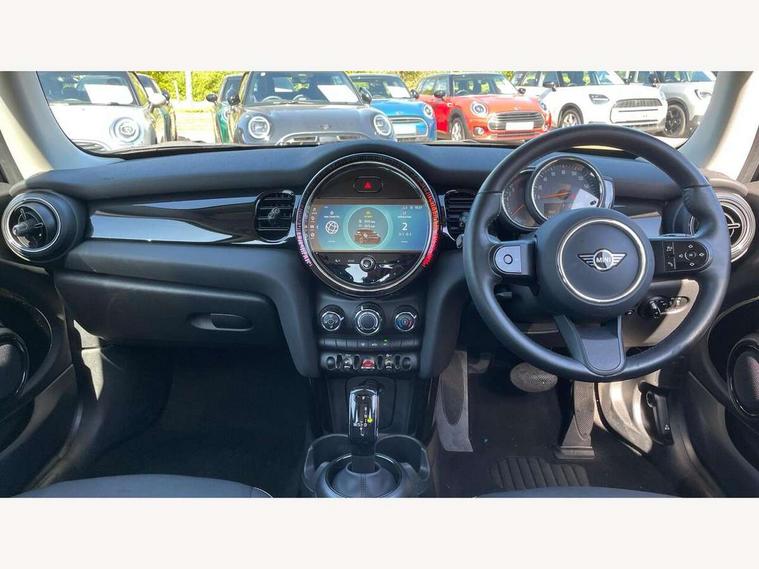 Apple CarPlay, Automatic start/stop function with brake energy recuperation, Compatible mobile phone bluetooth with audio streaming, Cruise control with brake assist, Electro-mechanical speed dependant steering assistance, Flexible car sharing preparation, Instrument cluster, Mini E-call, MINI TeleServices, On board computer, Service interval indicator, Double Vanos system, Fully variable valve control, High precision injection, Performance Control, Steptronic transmission with double clutch, 8.8" touchscreen with LED ring, FM tuner and DAB digital radio, 3rd brake light, Automatic headlight activation switch, Body colour fuel filler cap, Body colour roof and mirror caps, Chrome border high gloss black slats radiator grille, Dynamic brake lights, Electric front windows, Exhaust tailpipe, Heated rear window, Heated windscreen washer jets, LED headlight with closed ring and daytime driving lights, Metal door sill strips with MINI imprint, Rain sensor window wipers, Rear fog lights, Rear LED lights with union jack design, Rear window wiper, Side scuttle panel with integrated indicator, Sun/heat protection glass, White indicator lenses, 12V Accessory socket in centre console, 2 seat bench in 2nd row, 4 lashing eyes in luggage compartment, 60/40 split folding rear seat, Ambient lighting, Carbon black colour line - Knee roll and door armrest, Chrome interior highlights, Cupholders, Front and rear head restraints, Front and rear isofix with front passenger airbag deactivation, Front floor mats in velour, Glove compartment, Height and length steering column adjustment, Interior lighting with 12 different colours across the dashboard, underneath door bezel with illuminated laser-engraved design on central display, Leatherette gearshift lever and handbrake gaiters, LED reading lights, vanity mirror lights, front foot well light and spotlight on front seats, Manual air conditioning, Mechanical seat adjustment - forward/back & backrest for front seats and driver seat height adjust, Multifunction steering wheel, Passenger seat height adjuster, Satellite grey headlining including grab handles and clothes hooks, Single front passenger seat, Sport leather steering wheel with speed limiter and audio/communication controls, Storage compartments in doors, Sunvisors with vanity mirrors, 3 point seatbelts on all four seats, 6 Airbags - front, side, head and seat belt tensioners, Anti-lock braking system (ABS), DSC - Dynamic Stability Control, Front and rear disc brakes, Single tone fanfare horn, Tyre pressure monitoring system, Alarm system with tilt sensor, monitoring doors, bonnet interior and tailgate, Electronic vehicle immobiliser, Start/stop toggle with keyless go, Piano black interior trim, Tool kit, Tyre repair kit,