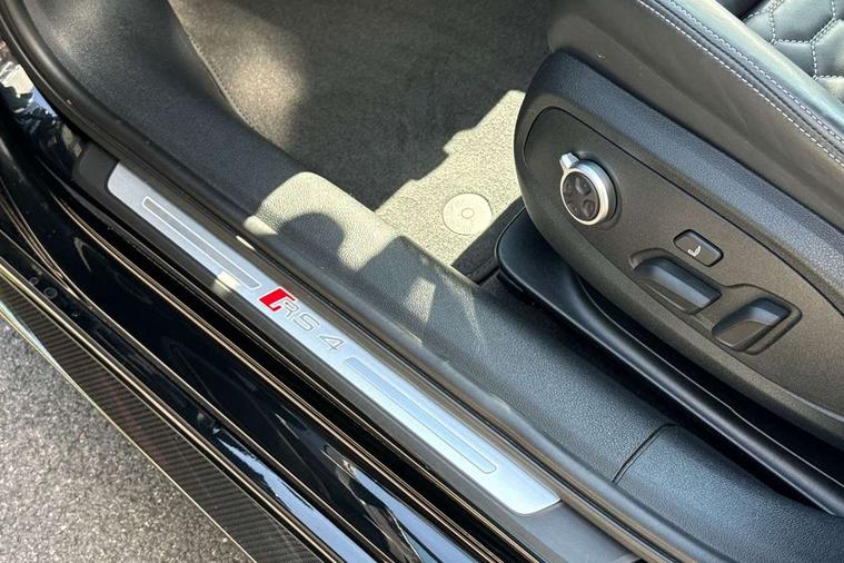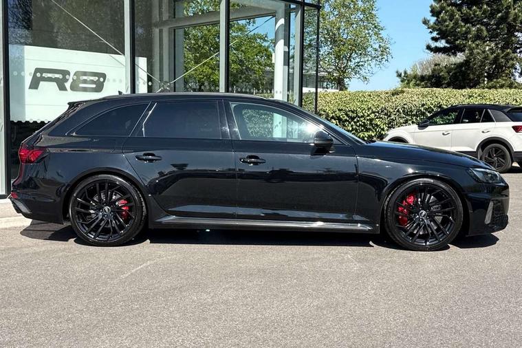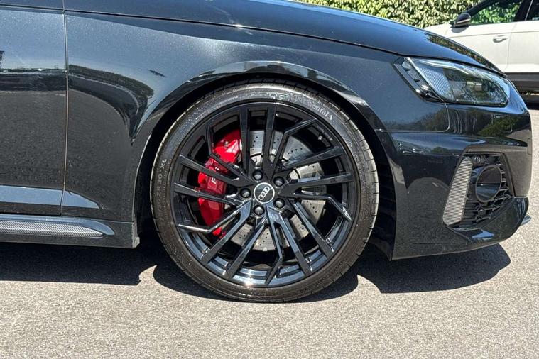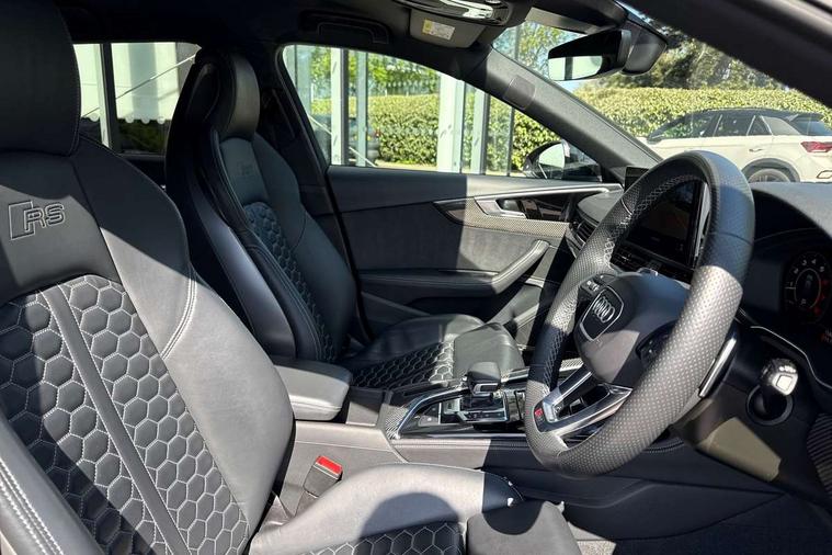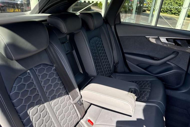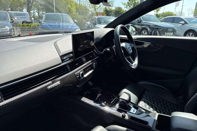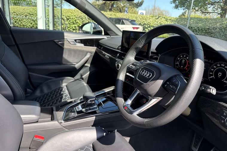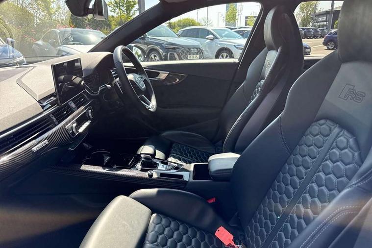 7" Colour driver information system, Amazon alexa Integration, Audi connect safety and service (e-call), Audi drive select, Audi side assist, Audi smartphone interface, Audi virtual cockpit with RS specific display, Automatic start-stop system with coasting functionality and efficiency programme, Bluetooth interface, Electromechanical power steering, Email, calendar and text messages displayed via MMI, MMI Navigation plus with MMI touch includes 10.1" high resolution colour MMI display, 3D map, Power opening/closing tailgate, Service interval indicator, Voice control system, 58 Litre fuel tank, Quattro sports differential, 2 USB charging ports, Audi sound system, DAB digital radio module, 3rd brake light, Acoustic windscreen, Audi Beam uses LEDs to project the RS logo onto ground as you exit your RS4, Audi matrix LED headlights with LED rear lights + dynamic front and rear indicators, Audi rings and lettering glossy black, Auto dimming rear view mirror, Automatic headlights + automatic windscreen wipers, Black roof rails, Blue tinted glass, Body colour door handles, Electric front windows, Electric rear windows, Electrically folding auto dimming/adjustable/heated door mirrors with memory function, LED side indicators and kerb view function for passenger side, Flared front and rear wheel arches, Front bumper with enlarged air inlets, Headlight range control, High beam assistant, High gloss black door mirror housing, High gloss black triangular aperture at rear door, Honeycomb design grille with quattro logo, Lateral air inlets next to front headlights, LED daytime running lights, LED indicators in door mirrors, Privacy glass with rear acoustic glazing, Rain and light sensors, Rear side wing doors, Rear wiper, Roof spoiler, RS 4 badges on grille and rear, RS4 dual branch chrome tailpipes with left and right oval pipes, 3 seat bench in 2nd row, 3 spoke multifunction plus leather steering wheel with heating and RS badging, 40/20/40 split folding rear seats with rear centre armrest, Black cloth headlining, Deluxe 3 zone electronic climate control, Electric load area cover, Electrically adjustable front seats, Fine nappa leather with contrast honey comb stitching + super sports seats with pneumatic massage function, Front centre armrest, Front headrests, Front/rear floor mats, Heated front seats, Height and reach adjustable steering wheel with full size airbag, Illuminated door sill trims with RS4 logo, ISOFIX child seat mounting and top tether, Leather door armrests and knee pad, Luggage compartment carpet, Perforated leather gear lever knob with contrast stitching, Rear headrests, Retractable load area cover, Single front passenger seat, Stainless steel pedals, Sunvisors with vanity mirrors, Carbon black styling pack - RS4, LED Interior light pack - RS4, Non Smokers pack, 3 point seatbelts on all rear seats, Adaptive driver and front passenger airbags, Electromechanical parking brake, Electronic stabilisation control including ABS, ASR and EDL, Enhanced braking system, Front head airbags, Front seatbelt pretensioners + load limiters, Front side airbags, Hill hold assist, Manual child lock in rear doors, Multi-Collision braking, Pop-up bonnet for pedestrian protection, Pre sense city, Rear side airbags, Seatbelt monitoring, Traction control, Tyre pressure warning, Variable restraint system, Warning triangle and first aid kit, Anti theft alarm, Anti-theft wheel bolts, Immobiliser, Keyless Go, Remote central locking, Remote control key with RS emblem, Carbon twill inlays, 20" 5 segment spoke evo design glossy black sport alloy wheels, Tool kit, Tyre repair kit,