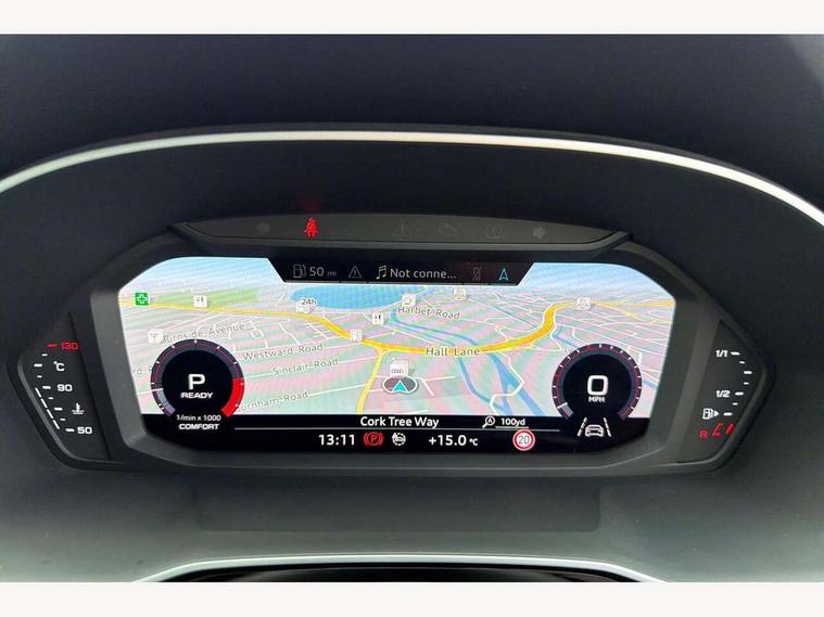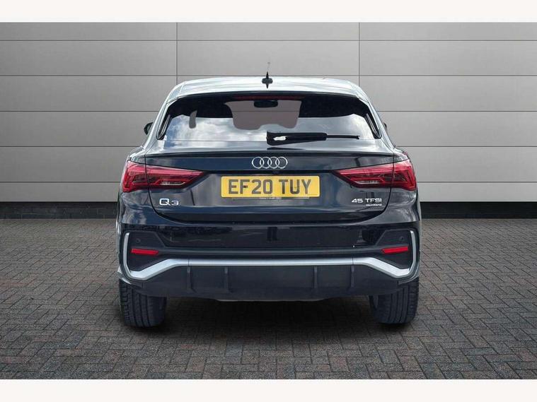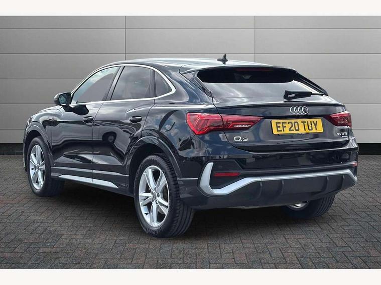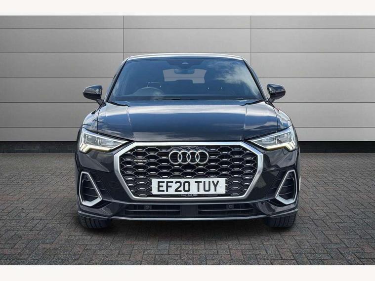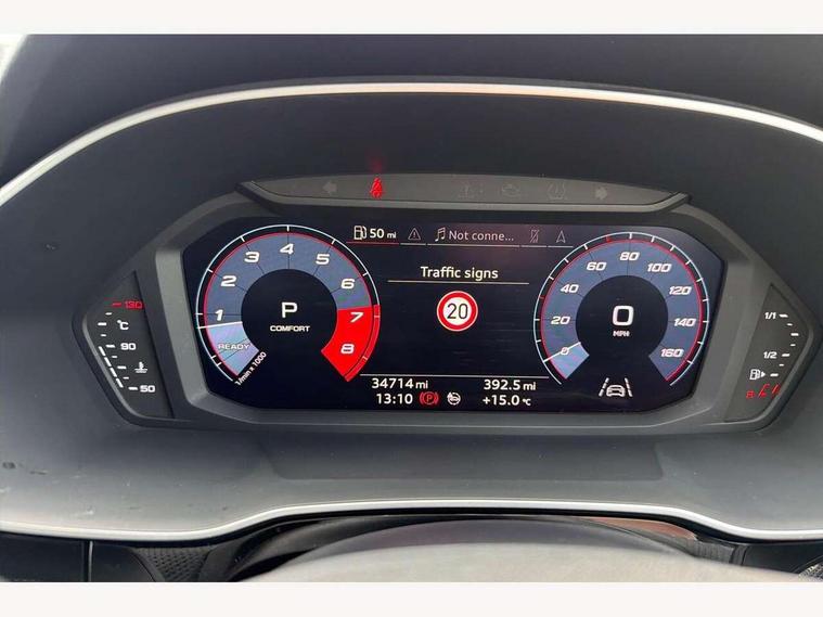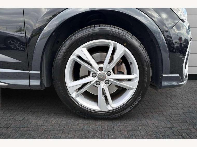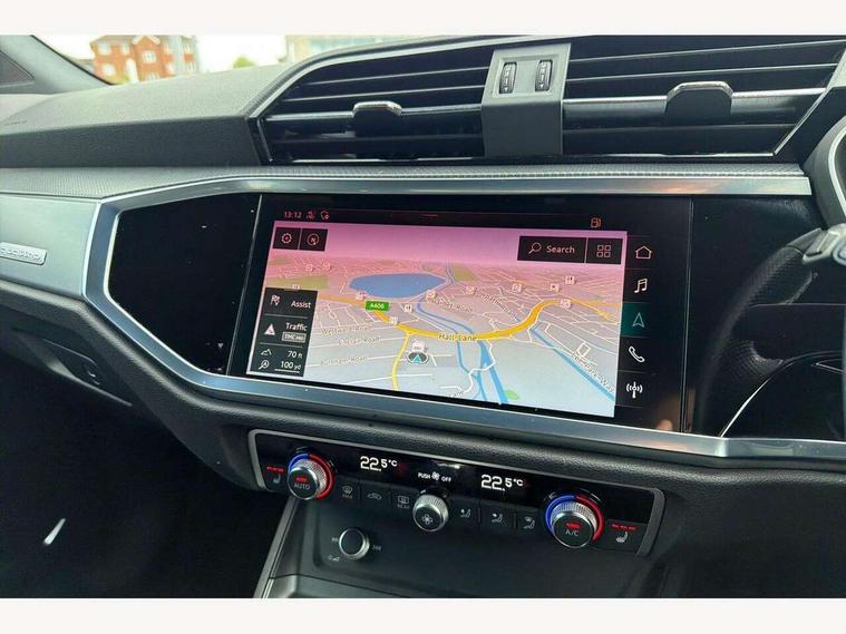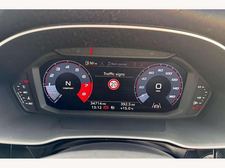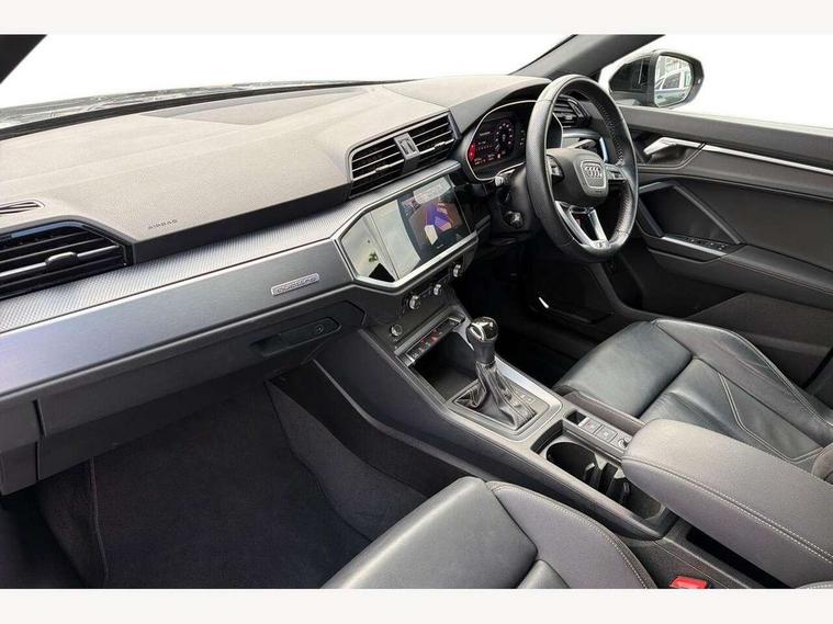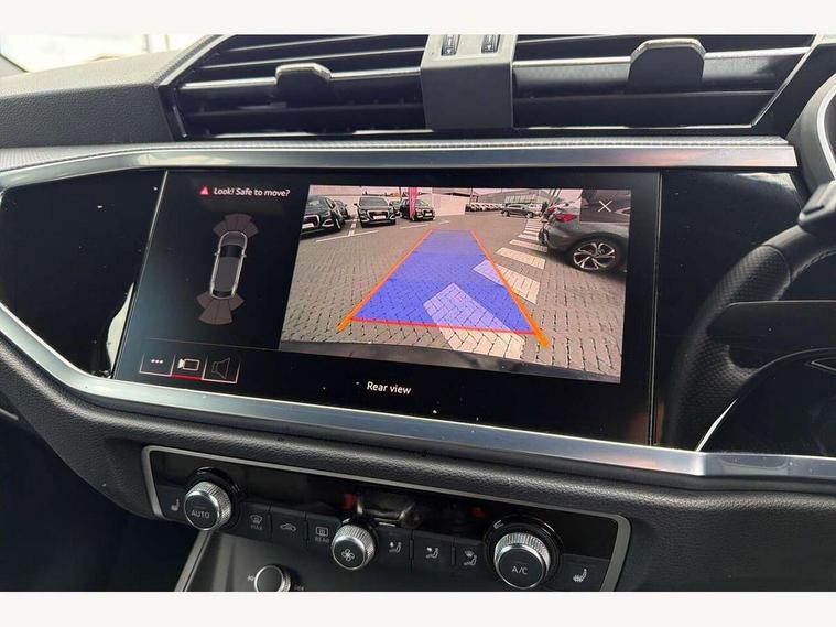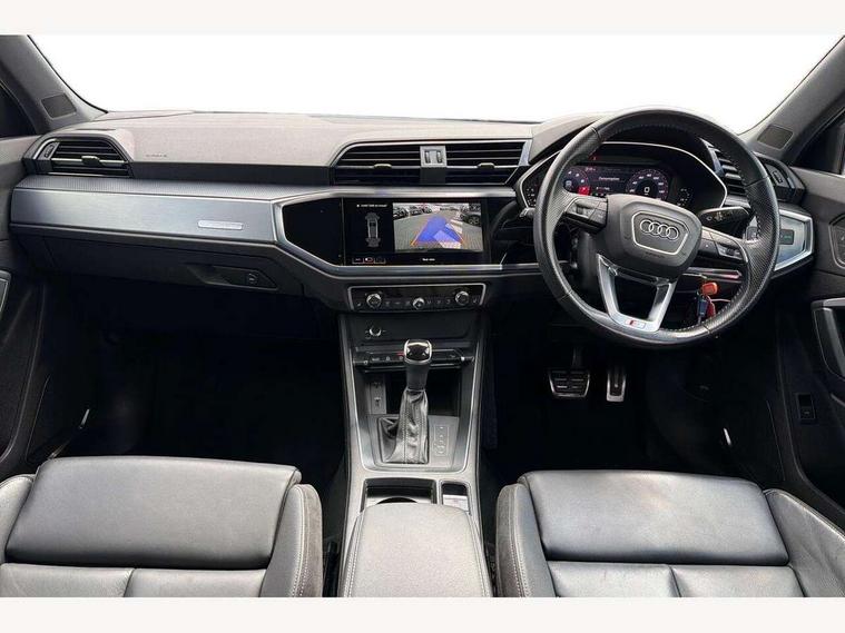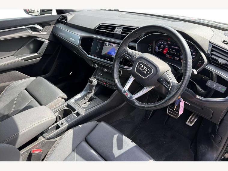Audi connect safety and service (e-call), Audi drive select, Audi lane departure warning, Audi side assist, Audi Virtual Cockpit - 10.25" display, Bluetooth interface, Camera based traffic sign recognition, MMI Navigation Plus with high resolution 10.1 inch touchscreen colour display, Power operated tailgate, Progressive steering, Service interval indicator, Smartphone interface includes wireless Apple carplay/Android Auto, Start stop system with recuperation, Voice control system with natural language interaction, Sports suspension, 1 x USB type C and 1 USB type A charging points, 6 passive loudspeakers, DAB digital radio module, Acoustic windscreen, Aluminium window trim, Auto dimming frameless rear view mirror, Diffuser grille in grained matt black, Diffuser trim in selenite silver, Electrically folding, adjustable and heated door mirrors with integrated LED side indicators and kerb view function for passenger side, Front and rear electric windows, Front fog lights, Front side air inlets in selenite silver, Front underbody protection in manhattan grey paint finish, Grille surround in aluminium silver matt, High gloss black finish B and C pillars, LED headlights with LED daytime running lights and dynamic rear indicator, LED rear lights, Privacy glass dark tinted rear and rear-side windows (from B-pillar backwards), Radiator grille in titanium black with inlay in matt aluminium silver, Rain and light sensors, Rear underbody protection in matt black, S line badges on front wings, Side skirt insert in matt Platinium grey, 12V socket in rear centre console, 40:20:40 folding with manual adjustment for 60:40 forwards/backwards position and backrest angle, Adjustable rear seat bench/backrest with centre armrest and cupholder, Black cloth headlining, Dual zone electronic climate control, Front and rear black floor mats with contrast stitching, Front and rear headrests, Front and rear roof module including reading lights, Front centre armrest, Glove compartment lighting, Height and reach adjustable steering wheel, Illuminated door sill trims with S logo, ISOFIX child seat mounting for front passenger with airbag deactivation and outer rear seat including top tether attachment point for outer rear seats, Luggage compartment light, Manual front seats with height adjustment, Perforated leather gearknob, Stainless steel luggage compartment sill finisher, Stainless steel pedals, Non smoking pack - Q3, 3x3 point rear seatbelts, 6 airbags - Driver, front passenger, curtain and side windows, Audi pre-sense front with pedestrain and cyclist recognition, Electrically operated child locks on rear doors, Electromechanical parking brake, Electronic stabilisation control including ABS, ASR and EDL, Hill descent control, Hill hold assist, Pre sense basic, Seatbelt monitoring, Tyre pressure warning, Warning triangle and first aid kit, Anti theft alarm, Anti theft wheel bolts, Remote central locking, Dark matt brushed aluminium inlay, Detail dashboard around MMI touch colour display in glass look, black with surround in aluminium look, Leatherette door armrest,