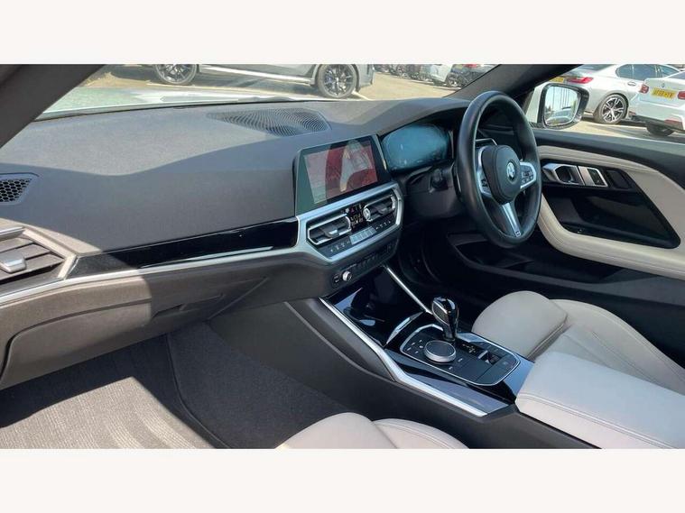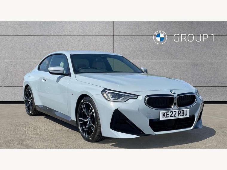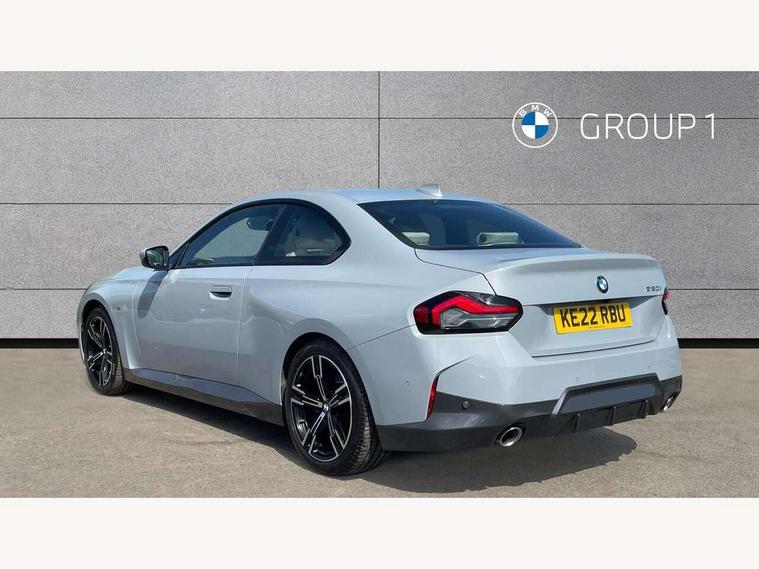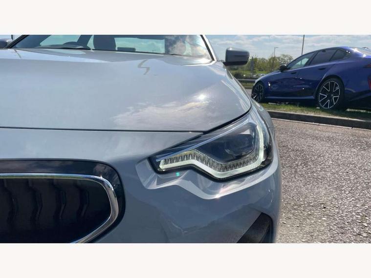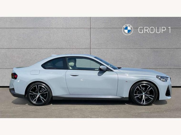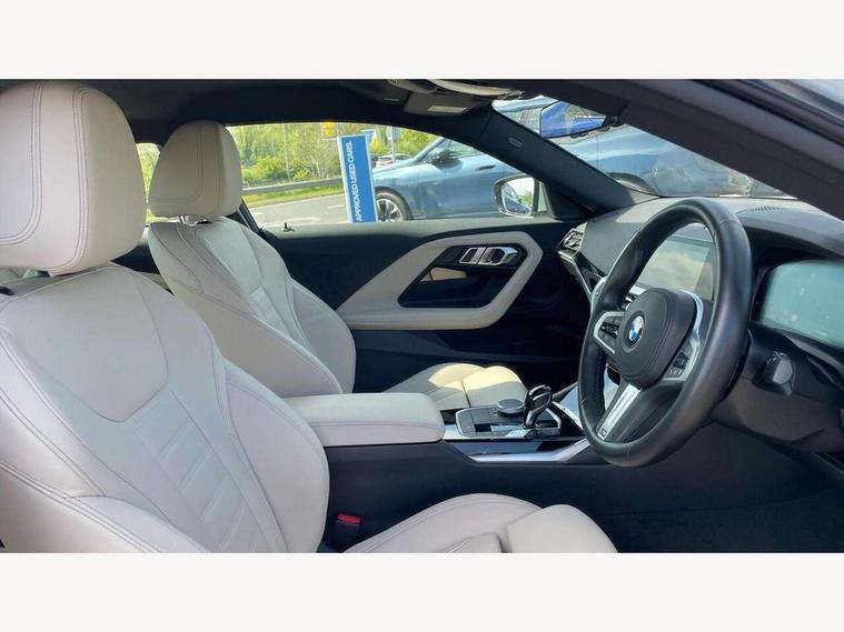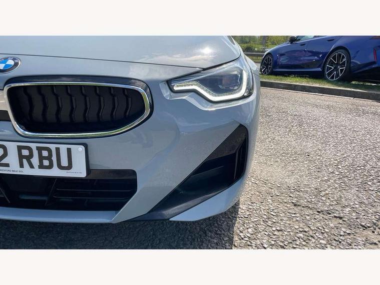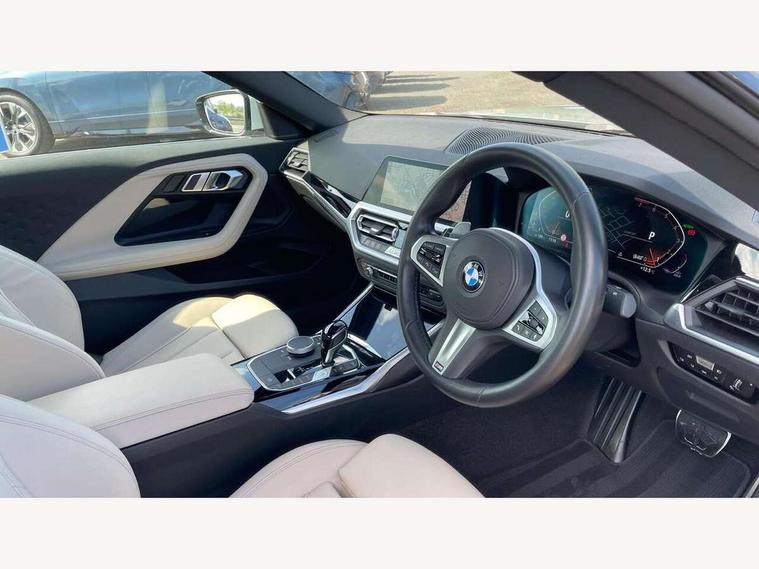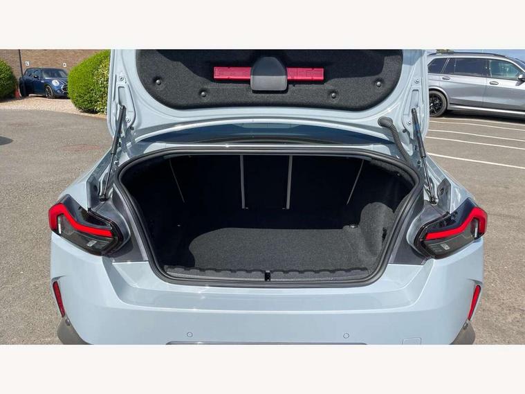 Attentiveness assist, Auto start-stop, Bluetooth, BMW ConnectedDrive online services, BMW Teleservices, Check Control warning system for monitoring of lights and door/luggage compartment open warning, Direct selection buttons, Drive off assistant, Eco pro mode, Electric power steering, Front/rear Parking distance control, iDrive controller with turn and press function, Integrated owners handbook, Intelligent functions, Live cockpit plus with nav function 12.3" instrument cluster and 14.9" centre display, Oil sensor for level and grade, Optimum shift indicator, Personal Profile, Touch operation on control display, Variable sport steering, Widescreen multi-media display, Aluminium lightweight construction, Balancer shaft, BMW TwinPower Turbo four-cylinder petrol engine, Double VANOS, Drive performance control with ECO PRO comfort + sport mode, Electronic differential lock, High precision injection, M sport suspension, Petrol Particulate Filter, Sport automatic steptronic transmission with gearshift paddles, manual gearshift time display, launch control, coasting idle ECO PRO/COMFORT modes, Twin scroll turbocharger with Valvetronic, DAB tuner, Acoustic windscreen wipers for reduced driving noise, Adaptive LED Headlights, Automatic windscreen wipers and automatic headlight, Automatically dimming rear view mirror, Body colour door handles flush with door surface, Body colour door mirrors, Body colour front and rear bumpers, Daytime running lights, Electric windows - front and rear, with open/close fingertip control and trap release, Exhaust tailpipes x2 - 90mm in left and right, Fading support, Front and rear bumper system with replaceable deformation elements, Front door sill finishers in black plastic with BMW designation, Front windscreen wipers with integrated washer jets, Green tinted heat protection glazing, High beam assistant, High gloss shadowline exterior trim in mirror triangle cover, mirror cover panel, mirror bezel and window border, High level third brake light, Indicators integrated int mirror housing, LED registration plate light, LED technology rear tail lights, brake lights and turn indicators, Lightweight engineering, Model designation on right side of tailgate, One piece kidney grille with hight gloss chrome surround, Rear boot, Rear fog lights, Reversing light in rear light cluster, Shark fin antenna, Single part LED rear lights with smoked glass components, Trailer stabilisation logic, Visible VIN plate, 12V power socket in front centre console with blanking plug, 2 cupholders in front centre console, 3 zone automatic air conditioning, Ambient lighting, Compartment in front of cupholder, Conditioned based service, Driver seat backrest width adjustment, Front and rear side armrests integrated into door trim, Front armrest, Front door pockets, Front head restraints, Front sport seats, Heated front seats, Illuminated glove compartment with separate small compartment, M headliner Anthracite, M sport leather steering wheel, Manually adjustment steering wheel column, Rear seat backrest with manual 40:20:40 split folding, Rear seat centre foldable armrest with integrated cup holder, Single front passenger seat, Storage compartment between rear seats, Storage tray and compartment with cover in centre console, Sun visors with vanity mirrors and insert tab, Through loading system with 40/20/40 split folding 2 rear seat in 2nd row, Two folding rear seat headrests, Velour floor mats, Additional storage compartment pack without USB - 2 Series Coupe, Connected pack professional - 2 Series Coupe, Interior and exterior mirror pack - 2 Series Coupe, M Sport exterior styling aerodynamics pack - 2 Series Coupe, 2 tone horn, Anti lock braking system (ABS) with cornering brake control, Automatic Stability Control (ASC), BMW emergency call, Brake drying, Child seat ISOFIX attachment for the two outer rear seats, Crash sensor activating of airbags, Unlocking doors, hazard warning lights, interior light, safety battery terminal, Deactivation of fuel pump in the event of a crash, Driver and front passenger airbags, Driver and front passenger side airbags, integrated in the door side seat backrest bolsters for all seat variants, Dynamic brake control, Dynamic stability control + (DSC+), Dynamic Traction Control - DTC, Electrically operated hand brake including automatic hold function and automatic release when driving off, Front and rear disc brakes, Front passenger airbag deactivation, Head airbags for all 4 outer seats, Manual deactivation of front passenger airbag, Seat belt security check for driver and front passenger, Seatbelt warning, Side impact protection, Three point seat belts on 4 seats including front belt stopper, pyrotechnic belt tensioners and belt force limiters, Tyre pressure sensor, Warning triangle and first aid kit, Alarm system (Thatcham 1) with remote control and electronic engine immobiliser, Central locking switch for all doors, fuel filler cap and luggage compartment, Deadlocking function system to all doors, Drive away locking system on all doors and luggage compartment, Locking wheel bolts, Start/Stop button (illuminated) in centre console with keyless engine start and Auto Start-Stop deactivation button, Two remote control key with integrated key - one button for open and close doors/fuel flap/tailgate and separate button for unlock luggage compartment, BMW mobility tyre sealing system, Electrically powered 12V compressor, Reduced rolling resistance tyres,