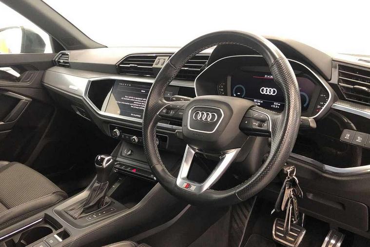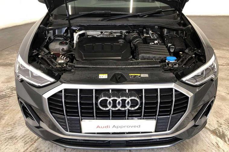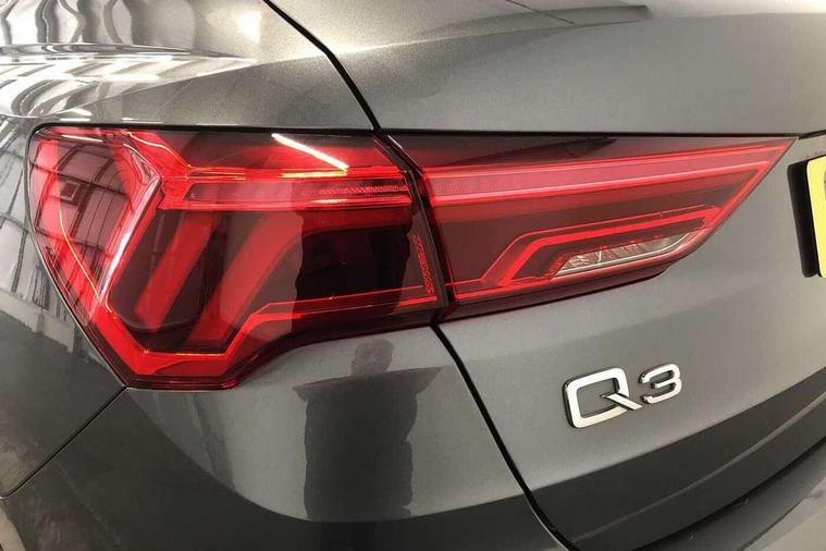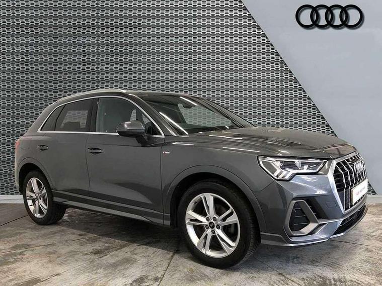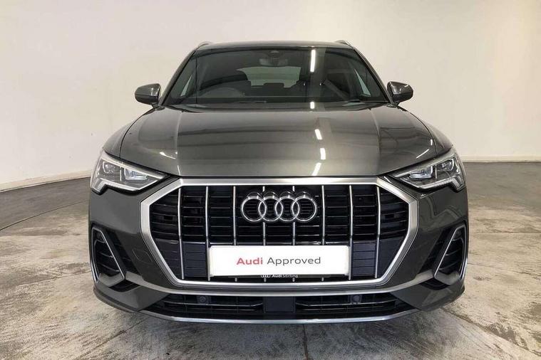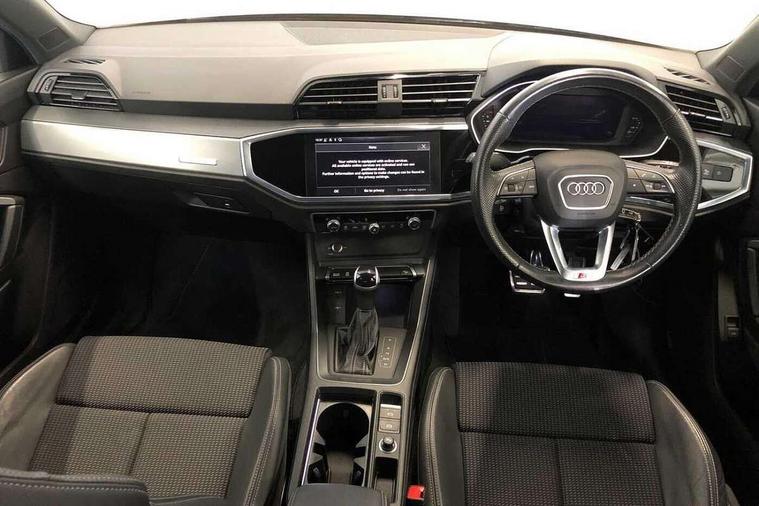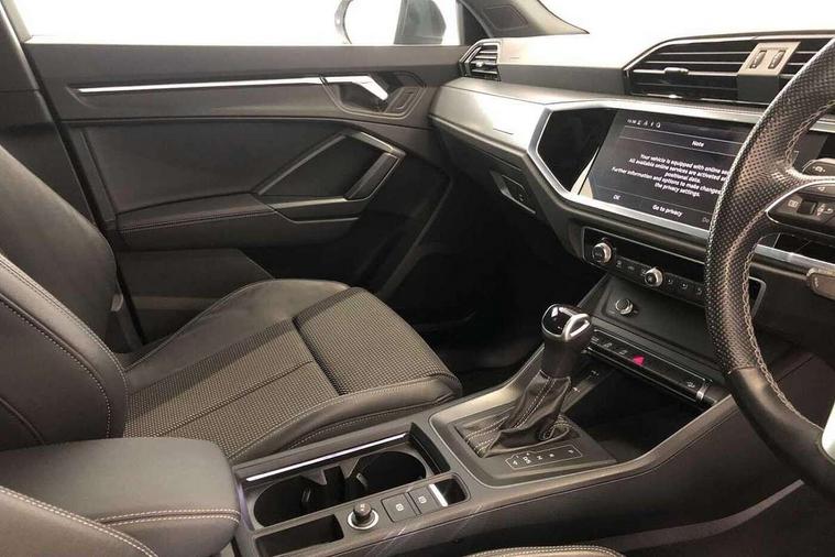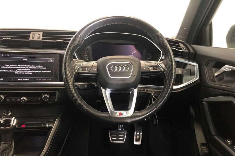 Amazon alexa Integration, Audi drive select, Audi lane departure warning, Audi smartphone interface includes wireless Apple carplay/Android Auto, Audi Virtual Cockpit - 10.25" display, Bluetooth interface, Camera based traffic sign recognition, Legal emergency call, MMI Navigation Plus with high resolution 10.1 inch touchscreen colour display, Power operated tailgate, Progressive steering, Service interval indicator, Start stop system with recuperation, Voice control system with natural language interaction, Diesel particulate filter, Sports suspension, 2 USB-C ports with charge and data functions, 6 passive loudspeakers, DAB digital radio module, Acoustic windscreen, Aluminium roof rails, Aluminium window trim, Anthracite black radiator grille, Auto dimming frameless rear view mirror, Body colour front spoiler blade, Body coloured bumpers, Electrically folding, adjustable and heated door mirrors with integrated LED side indicators and kerb view function for passenger side, Front and rear electric windows, Front fog lights, Front side air inlets in matt platinum grey, Grille vertical bars in aluminium silver/Matt, High gloss black finish B and C pillars, LED Dynamic rear indicators, LED headlights with LED daytime running lights, LED rear lights, LED third brake light, Privacy glass dark tinted rear and rear-side windows (from B-pillar backwards), Rain and light sensors, Rear diffuser grille in grained matt black, Rear diffuser strip in matt anthracite black, Rear side wing doors, Rear wiper, S line badges on front wings, S Line front and rear bumpers, Side skirt insert in matt Platinium grey, Variable front intermittent wipers, 12V socket in rear centre console, 3 seat bench in 2nd row, 3 spoke leather multifunction steering wheel features S badging and grips in perforated leather with contrast stitching, 40:20:40 folding with manual adjustment for 60:40 forwards/backwards position and backrest angle, Adjustable rear seat bench/backrest with centre armrest and cupholder, Black cloth headlining, Dual zone electronic climate control, Front and rear black floor mats with contrast stitching in rock grey, Front and rear headrests, Front and rear roof module including reading lights, Front centre armrest, Glove compartment lighting, Height and reach adjustable steering wheel, Illuminated door sill trims with S logo, ISOFIX child seat mounting for front passenger with airbag deactivation and outer rear seat including top tether attachment point for outer rear seats, Luggage compartment light, Manual front seats with height adjustment, Perforated leather gearknob, Single front passenger seat, Stainless steel luggage compartment sill finisher, Stainless steel pedals, Ambient lighting pack - Q3, Non smoking pack - Q3, 3x3 point rear seatbelts, 6 airbags - Driver, front passenger, curtain and side windows, Audi pre-sense front with pedestrain and cyclist recognition, Electrically operated child locks on rear doors, Electromechanical parking brake, Electronic stabilisation control including ABS, ASR and EDL, Front seatbelt reminder, Hill descent control, Hill hold assist, Pre sense basic, Seatbelt monitoring, Tyre pressure warning, Warning triangle and first aid kit, Anti theft alarm, Anti theft wheel bolts, Immobiliser, Remote central locking, Aluminium look interior elements, Dark matt brushed aluminium inlay, Detail dashboard around MMI touch colour display in glass look, black with surround in aluminium look, Leatherette door armrest,