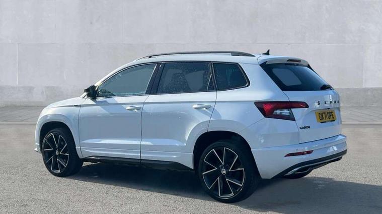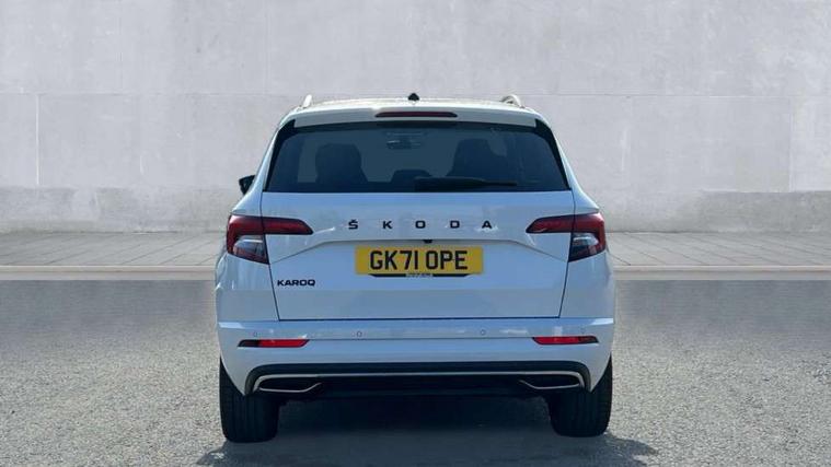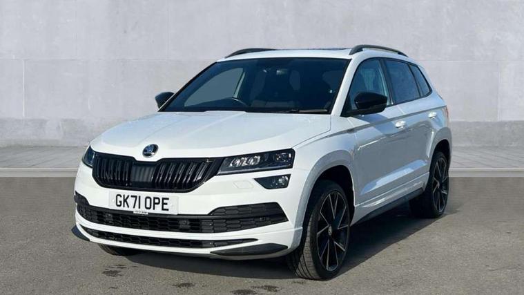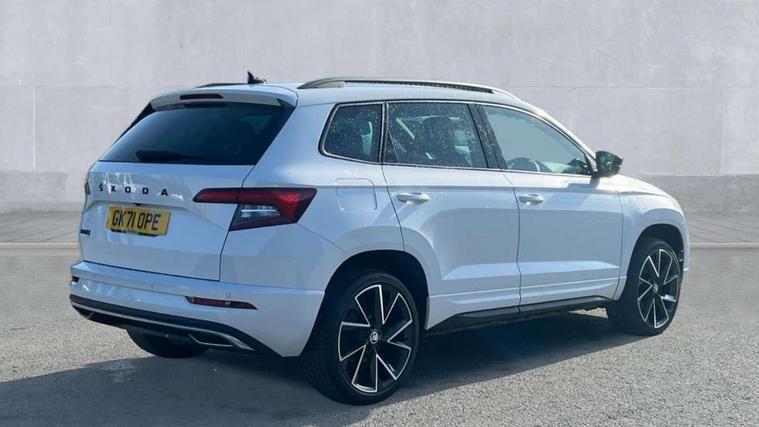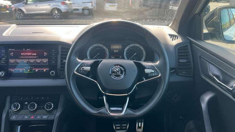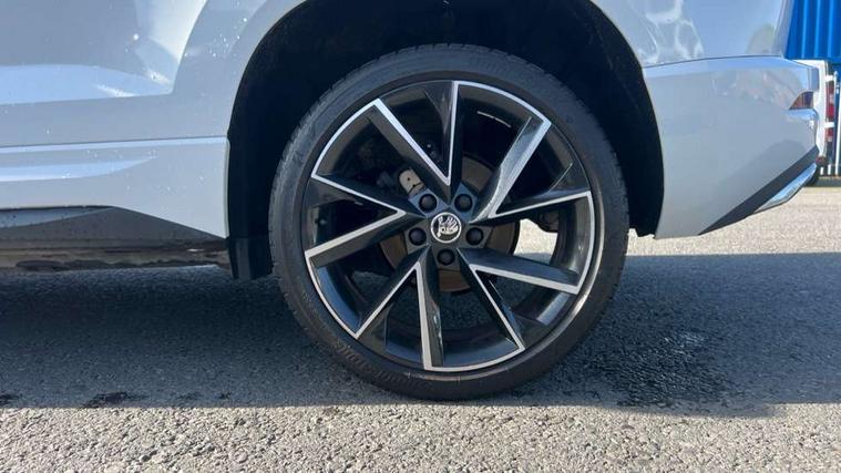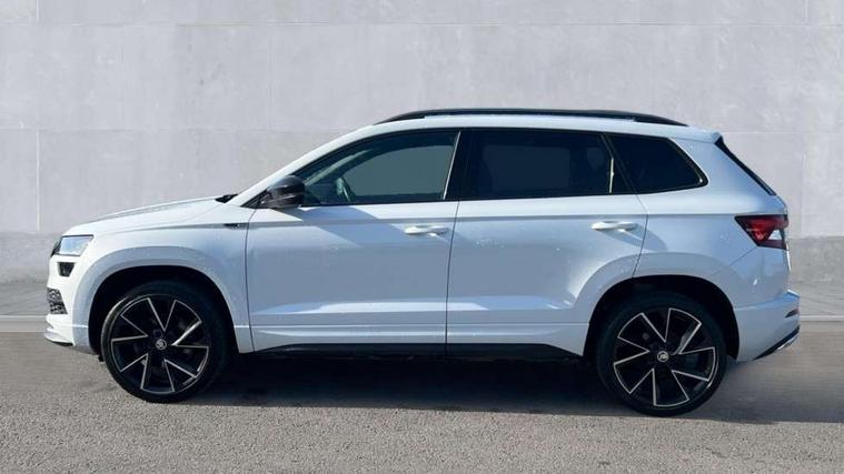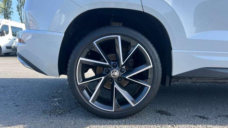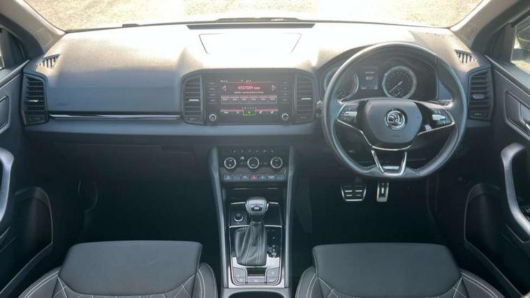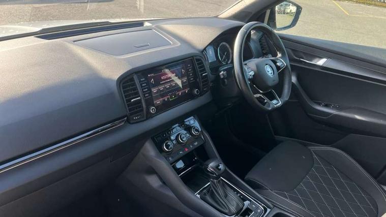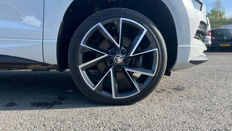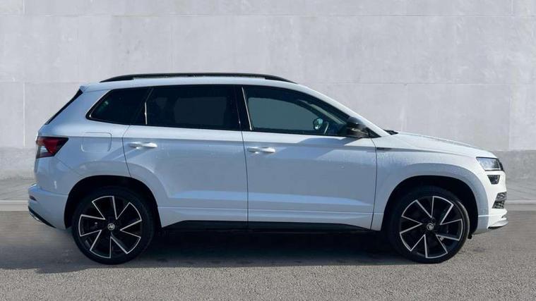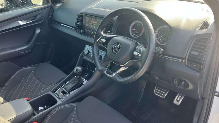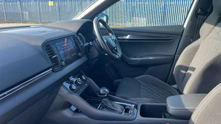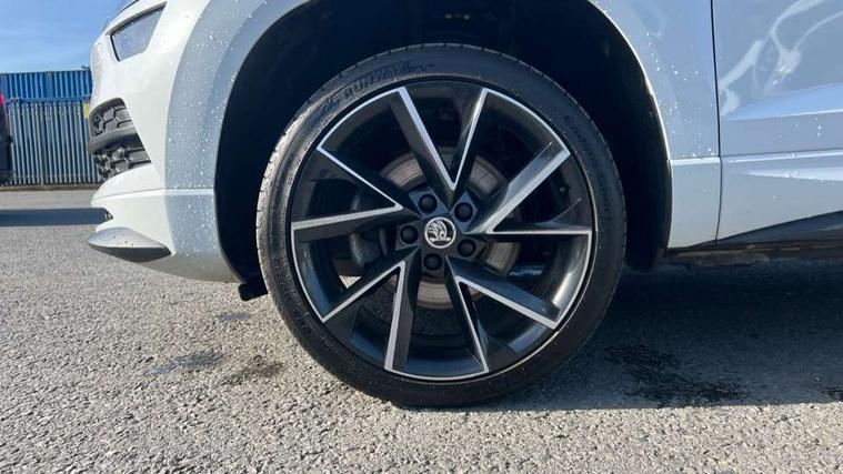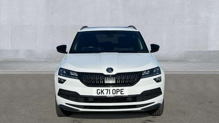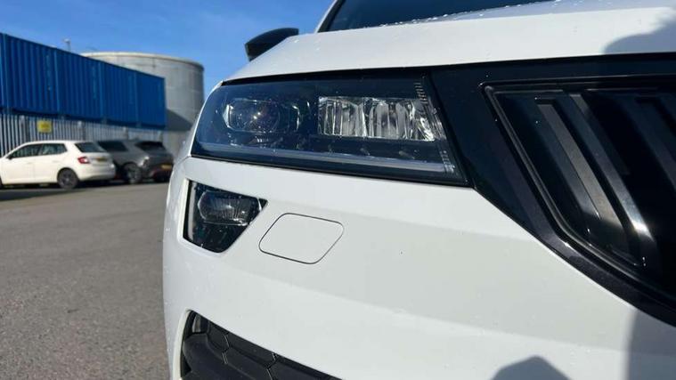 Care connect, Drive mode selector, Driver fatigue sensor, Multifunction colour trip computer, Outside temperature gauge, Service interval indicator, SmartLink wireless for Apple and wired for Android, Start/stop system with regenerative braking, USB C Port x 2 in front centre console, DAB radio with Bluetooth, USB connection, Wireless charging without wireless aerial connection, Acoustic glass, Aero front windscreen wipers with intermittent function, Automatic headlight control system, Black door mirrors, Black electric window control buttons, Black radiator grille, Black roof rails, Body colour door handles, Body coloured bumpers, Electric front and rear windows with child proof lock, Front door steps with SportLine logo, Full LED headlights + adaptive front light system + LED daytime running lights and front cornering fog lights, Headlight washers, Heated rear windscreen, LED rear lights with high functionality, Light assistant (coming/leaving home/tunnel light), Panoramic sliding sunroof, Privacy glass, Protective door side sills in body colour, Rear diffuser, Safety reflectors on front doors, Skoda lettering on tailgate in black, Sportline badge on front fender, Sportline decorative inserts with badging, Sports front and rear bumpers, Third brake light, 1.5 litre bottle holders in driver and front passenger door panels, 12V socket in boot, 12v socket in front centre armrest with storage compartment and rear air vents, 2 Folding hooks and nets in boot, 2 Front readings lights for driver and passenger, 3 rear height adjustable headrests, 4 foldable roof handles with rear coat hooks, Aluminium pedals, Black roof headlining, Cargo elements in boot, Chrome inner door handles, Door sill scuff plates, Driver and passenger seats height adjust, Front head restraints, Height adjustable front three point seats belts with tensioners, Height/reach adjust steering wheel, Ice scraper, Illuminated and cooled glovebox, Illuminated luggage compartment, Isofix child seat preparation outer rear, Manual lumbar support for front seats, Net programme in boot, Pen holder, Pollen filter, Rear reading lights, Rear seats fixed folding and divided 60:40, Retractable parcel shelf attachable to tailgate, Safety vest holder, Seatbelt reminder signalisation and pretensioner for all seats, Solid rear boot cover, Storage box in upper central dashboard closed, Storage compartment below the passenger seat, Sunvisors with illuminated vanity mirrors, Textile floor mats, Umbrella under passenger seat, Welcome animation with sportline logo, LED Interior lighting pack with Skoda welcome logo - Karoq, Airbags - Front side, head, knee and curtain, Automatic door unlocking in case of crash, Automatic fuel cut off in case of crash, Driver airbag, Electronic parking brake with auto hold function, Emergency rear braking signal, ESC including ABS, MSR, ASR, EDS, HBA, DSR, RBS, MKB and traction control, Front assist radar scanning of the space in front of the car with automatic braking, Hill hold control, Passenger airbag with switch-off function, Pedestrian monitor, Three point seatbelts rear, Two tone horn, Tyre pressure display, Tyre pressure monitor, Alarm with interior monitoring, back up horn and tilt sensor with safe function, Electronic engine immobiliser, Keyless entry and keyless start with safe system, Remote central locking with 2 remote folding keys, Black air vent surround, 19" Vega anthracite alloy wheels, Anti-theft wheel bolts protection, Storage on wheel cover,