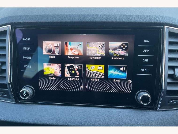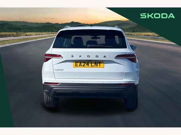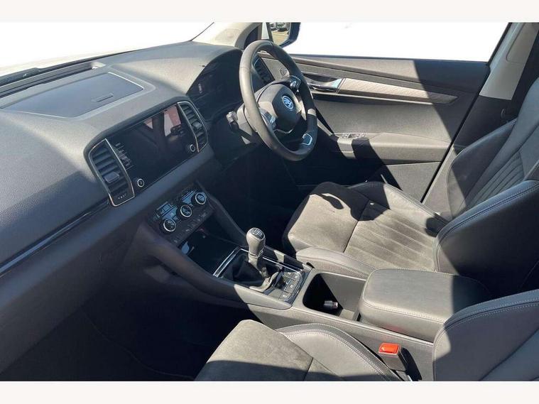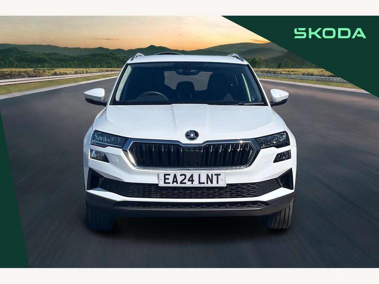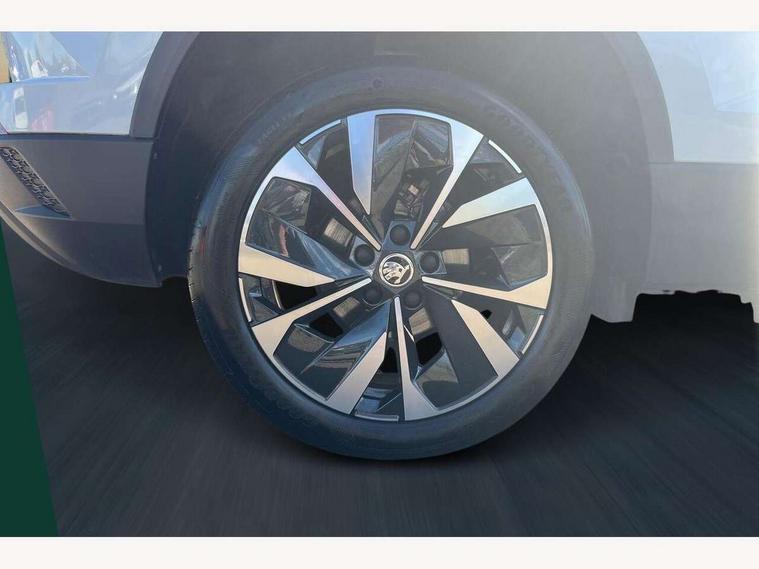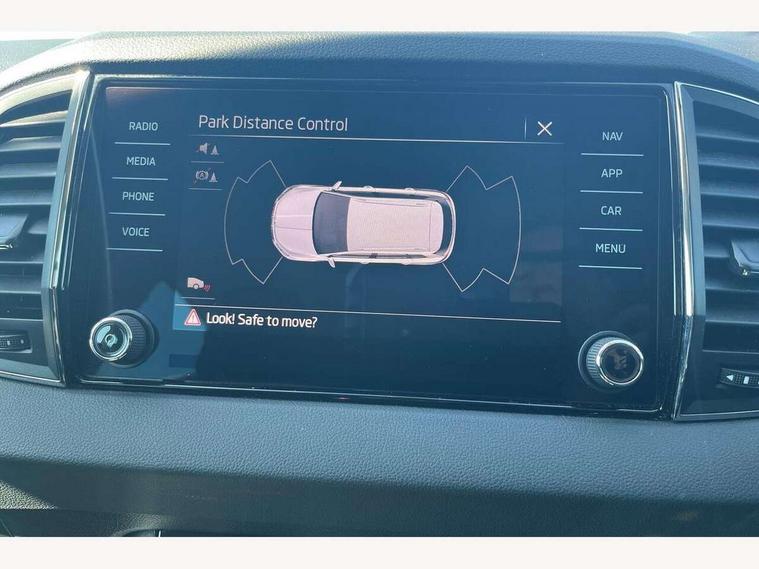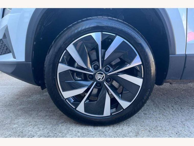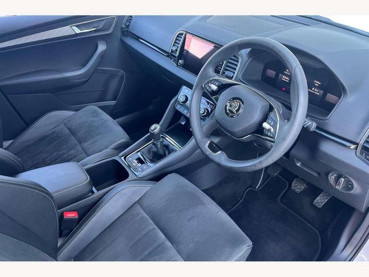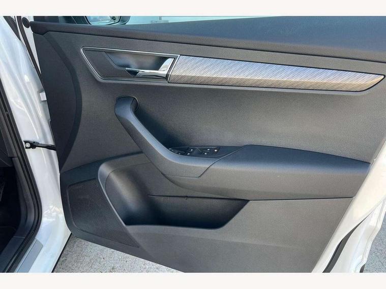 8" Digital display, Advanced driver attention and drowsiness monitor, Emergency services call system, Outside temperature gauge, Sensor for driver assistance systems, Service interval indicator, SmartLink wireless for Apple and wired for Android, Start/stop system with regenerative braking, USB C Port x 2 in front centre console, Virtual Cockpit - 10.25" digital display, Wireless smartphone charging, DAB radio with Bluetooth, USB connection, Acoustic glass, Aero front windscreen wipers with intermittent function, Auto dimming rear view mirror with light and rain sensors, Black electric window control buttons, Body colour door mirrors and handles, Electric front and rear windows with child proof lock, Heated rear windscreen, LED 3rd brake light, LED daytime running lights, LED rear lights with high functionality welcome effect and dynamic indicators, Light assistant (coming/leaving home/tunnel light), Plastic scuff plates in door apertures, Privacy glass, Rear side wing doors, Rear spoiler, Rear window wiper with washer system and intermittent control, Safety reflectors on front doors, 1.5 litre bottle holders in driver and front passenger door panels, 12V socket in boot, 12v socket in front centre armrest with storage compartment and rear air vents, 2 spoke leather heated multifunction steering wheel, 2 x Tablet holder, 3 rear height adjustable headrests, 3 seat bench in 2nd row, 4 foldable roof handles with rear coat hooks, Black floor carpet, Chrome inner door handles, Double sided boot floor, Foldable hooks in the boot, Front head restraints, Height adjustable front three point seats belts with tensioners, Height/reach adjust steering wheel, Ice scraper, Illuminated glovebox, Illuminated luggage compartment, Interior noise suppression, Isofix child seat preparation for front passenger seat, Isofix child seat preparation outer rear, Manual lumbar support for front seats, Pearl grey interior ceiling, Pen holder, Pollen filter, Rear boot cover, Rear reading lights, Rubbish bin door, Safety vest holder, Single front passenger seat, Storage box in upper central dashboard closed, Sunvisors with illuminated vanity mirrors, Textile floor mats, Ticket holder, Design Pack - Karoq, Non Smokers pack, Parking pack - Karoq, Automatic door unlocking in case of crash, Automatic fuel cut off in case of crash, Driver airbag, Electronic parking brake with auto hold function, Emergency rear braking signal, ESC including ABS, MSR, ASR, EDS, HBA, DSR, RBS, MKB and traction control, Front side airbags, Head airbags, Hill hold control, Knee airbags, Passenger airbag with switch-off function, Pedestrian monitor, Seatbelt reminder signalisation and pretensioner for all seats, Three point seatbelts rear, Two tone horn, Tyre pressure monitor, Alarm with interior monitoring, back up horn and tilt sensor with safe function, Electronic engine immobiliser, Keyless entry and start/stop, Remote central locking with 2 remote folding keys, Black centre console, Chrome framed air vents, Satin black dashboard, 18" Procyon silver alloy wheels with anthracite aero inserts, Anti-theft wheel bolts protection, Breakdown and tool kit,
