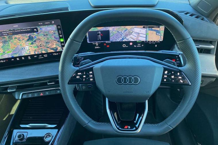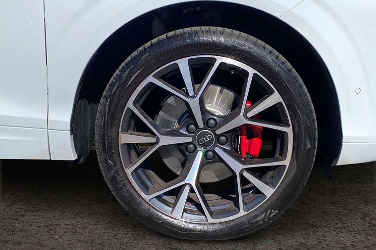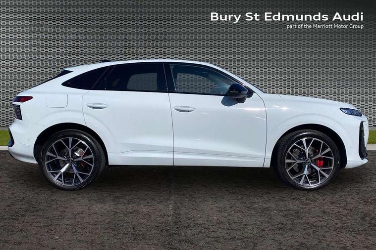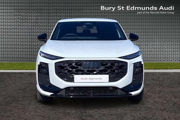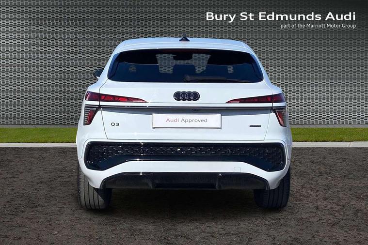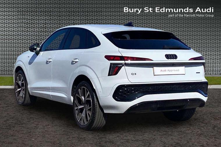 Adaptive cruise assist plus, Audi connect emergency call and service, Audi connect remote and controls, Audi drive select (Balanced/individual, efficiency, comfort, dynamic and Offroad+), Audi drive select for suspension with damper control, Audi side assist with exit warning and rear cross traffic assist, Audi virtual cockpit plus - 11.9" display, Bluetooth interface, Camera based traffic sign recognition, Driver attention and fatigue monitor with driver monitoring, Emergency assist, Front cross traffic assist, Head up Display, In-car-office assist, Panoramic curved display with 12.8" MMI navigation plus and MMI touch, Phonebox light with wireless charging, Progressive steering, Projection of a black ice warning, Smartphone interface includes wireless Apple carplay/Android Auto, Start/stop system, Surround view cameras, Swerve assist and turn assist, Traffic sign based speed limiter, Trained parking, Voice control system with natural language interaction, Petrol Particulate Filter, Sound actuator for interior drive sound, Suspension with damping control, 2 USB-C ports with charge and data functions, DAB digital radio module, SONOS premium sound system, USB interfaces with higher charging capacity, Acoustic glass for front door windows, Acoustic windscreen, Advanced dynamic light scenario of the coming home/leaving home function, All weather light, Aluminium window trim, Audi Q3 sportback lettering on the B-pillars, Auto dimming rear view mirror, Automatic dynamic headlight range control, Automatically dimming exterior mirrors with memory function, Contrasting finish in volcano grey, Cornering light, Digital daytime running lights with a choice of 4 digital light signatures, Digital matrix LED headlights, Digital OLED rear lights, Dipped beam, Dynamic indicators, Electrically folding, adjustable and heated door mirrors with integrated LED side indicators and kerb view function for passenger side, Full paint finish, Headlight cleaning system, High resolution main beam, Illuminated door sills with aluminium inserts at the front with S logo, Intersection light, Lane light with side assist and direction indicator, LED third brake light, Loading sill protector in stainless steel, Main beam assist, Manoeuvring light, Motorway light, Orientation light with lane departure warning, Position light, Privacy glass - dark tinted rear window, rear door and side windows, Projection light in the exterior mirrors - Projects a graphic element onto the ground, Q3 badging on the rear, Rain and light sensors, Rear side wing doors, Rear window, rear door windows and rear side windows in clear glass, Rear wiper, Sports bumpers, Turning light, 3 seat bench in 2nd row, 3 spoke heated flat top and bottomed leather multi function sport steering wheel with gear shift paddles and "S" badging, 3-zone deluxe automatic air conditioning, 4 way lumbar support for the front seats - electric with horizontal and vertical adjustment in four directions, Black carpet mats, Black cloth headlining, Electrically adjustable front seats with memory function for driver's side, Front and rear floor mats, Front and rear headrests, Front centre armrest, Heated front seats, Height and reach adjustable steering wheel, Interior storage compartment, Luggage compartment lid, electrically opening and closing, Microfibre upholstery with rhombus pattern and S emblem + front sports seats, Rear seat bench plus with split folded 40:20:40, Single front passenger seat, Stainless steel pedals, Steering wheel operating unit, gloss black, Storage compartment in front centre console, Ambient lighting package pro - Q3, Black styling package - Q3 Sportback, Function pack - Q3, 3 point seat belts in front, with pretensioner and electric height adjustment, 3x3 point rear seatbelts, Convenience key with safelock, Downhill assist, Driver and front passenger airbag with passenger airbag deactivation, Electromechanical parking brake, Electronic stabilisation control including ABS, ASR and EDL, First aid kit with warning triangle and high visibility vests, Front emergency brake assist, Front side airbags with head airbags and interaction airbag, Hill hold assist, i - Size child seat mounting on the front passenger side and i - Size and top tether on the outer rear seats, Power operated child locks, Proactive occupant protection, front, side and rear, Red brake callipers, front and rear, Seatbelt monitoring, Tyre pressure loss indicator, Anti theft wheel bolts, Remote central locking, Thatcham approved category 1 anti theft alarm, Anthracite american whitewood natural inlay, Interior elements in dinamica microfibre, Interior trims in aluminium look, 20" 5-spoke tripod design alloy wheels with gloss turned finish in metallic black, Tool kit and Jack, Tyre repair kit,