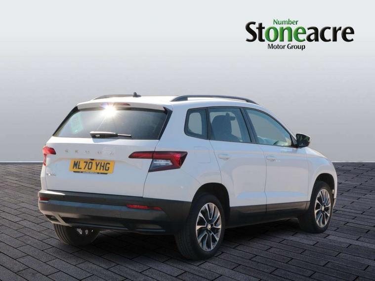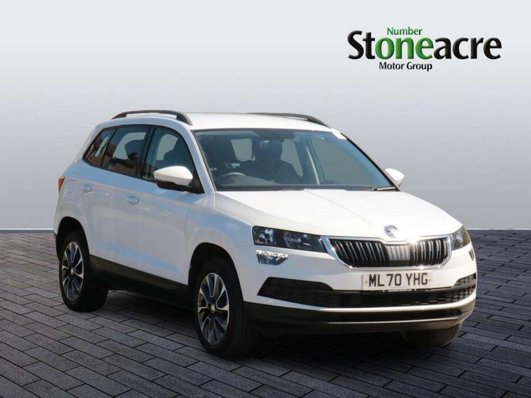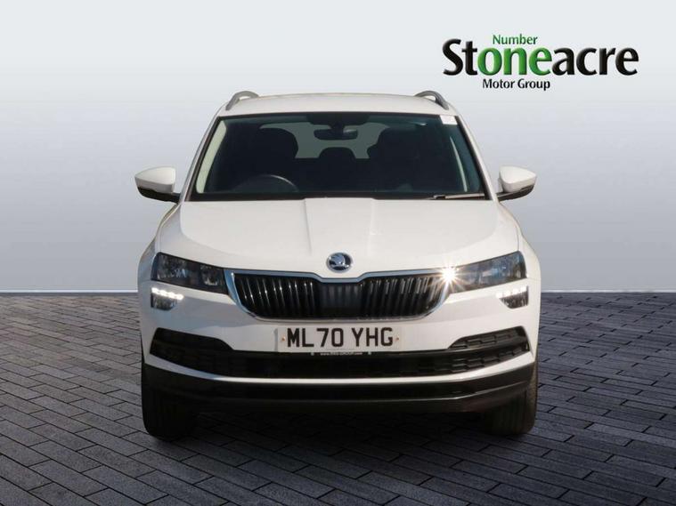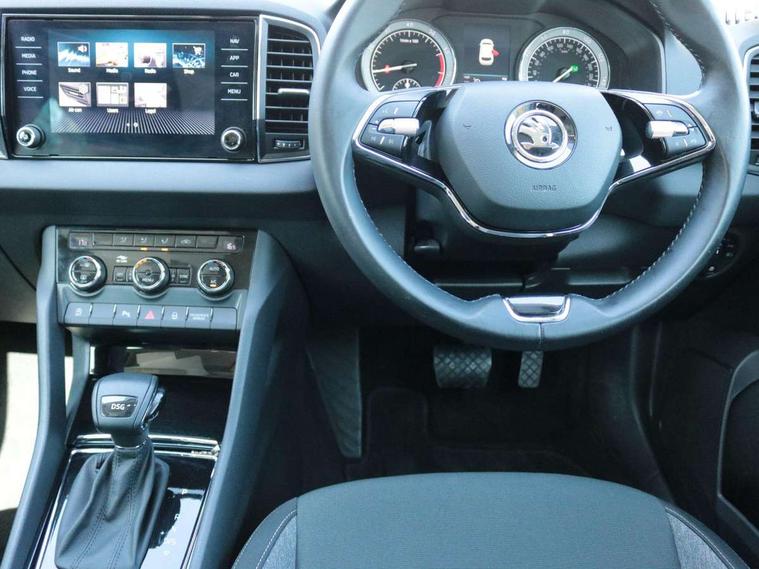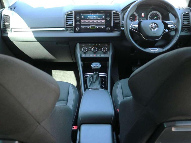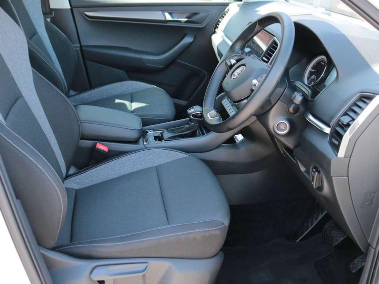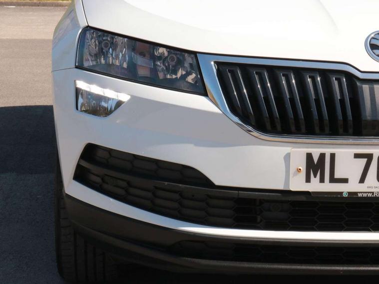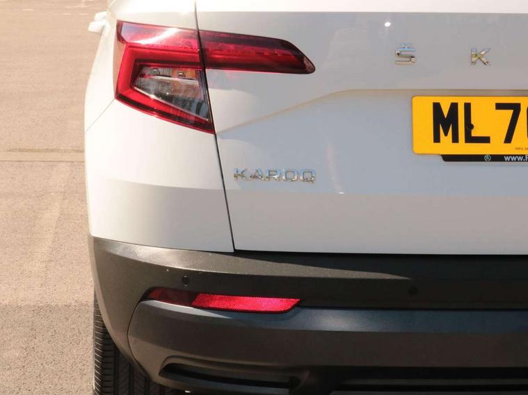 Amundsen satellite navigation with 8" touchscreen display with maps Europe, WLAN and web radio, Care connect, Driver alert system, Driver fatigue sensor, Driver profile selection, Electro-mechanical PAS, Multifunction colour trip computer, Outside temperature gauge, Rear view camera, Service interval indicator, SmartLink + wireless for Apple and wired for Android, Start/stop system with regenerative braking, USB C Port x 2 in front centre console, DAB radio with Bluetooth, SD card slot, USB connection, Acoustic glass, Aero front windscreen wipers with intermittent function, Automatic headlight control system, Black electric window control buttons, Body colour door mirrors and handles, Body coloured bumpers, Doors steps in front with Karoq badging, Electric front and rear windows with child proof lock, Electrically adjustable heated folding and auto dimming door mirrors, Heated rear windscreen, LED rear lights with high functionality, Light assistant (coming/leaving home/tunnel light), Privacy glass, Safety reflectors on front doors, Third brake light, 1.5 litre bottle holders in driver and front passenger door panels, 12V socket in boot, 12v socket in front centre armrest with storage compartment and rear air vents, 2 Folding hooks and nets in boot, 2 Front readings lights for driver and passenger, 3 rear height adjustable headrests, 4 foldable roof handles with rear coat hooks, 4 lashing points on luggage floor, Backrest release, Cargo elements in boot, Chrome inner door handles, Door sill scuff plates, Driver and passenger seats height adjust, Fabric upholstery, Folding tables on the front seat backrests, Front head restraints, Front seat and rear pockets, Height adjustable front three point seats belts with tensioners, Height/reach adjust steering wheel, Ice scraper, Illuminated and cooled glovebox, Illuminated luggage compartment, Isofix child seat preparation outer rear, Manual lumbar support for front seats, Net programme in boot, Pen holder, Pollen filter, Rear boot cover, Rear reading lights, Rear seats fixed folding and divided 60:40, Safety vest holder, Storage box in upper central dashboard closed, Sunvisors with illuminated vanity mirrors, Textile floor mats, Umbrella under passenger seat, LED Interior lighting pack with Skoda welcome logo - Karoq, Airbags - Front side, head, knee and curtain, Automatic door unlocking in case of crash, Automatic fuel cut off in case of crash, Driver airbag, Electronic parking brake with auto hold function, Emergency rear braking signal, ESC including ABS, MSR, ASR, EDS, HBA, DSR, RBS, MKB and traction control, Front assist radar scanning of the space in front of the car with automatic braking, Hill hold control, Passenger airbag with switch-off function, Pedestrian monitor, Seatbelt reminder signalisation and pretensioner for all seats, Three point seatbelts rear, Two tone horn, Tyre pressure display, Tyre pressure monitor, Alarm with interior monitoring, back up horn and tilt sensor with safe function, Electronic engine immobiliser, Remote central locking with 2 remote folding keys, Chrome framed air vents, 17" Aero alloy wheels with anti theft wheel bolts, Storage on wheel cover,