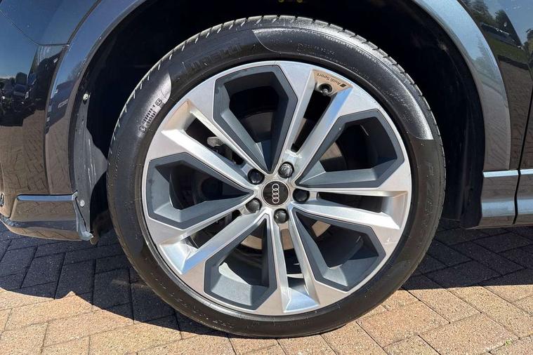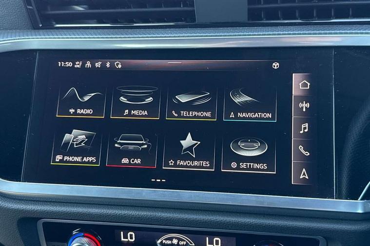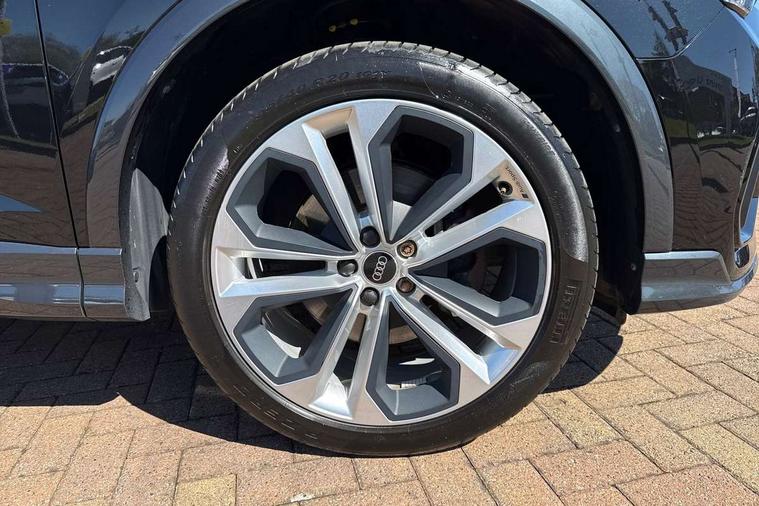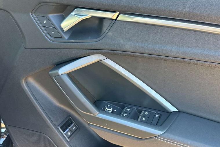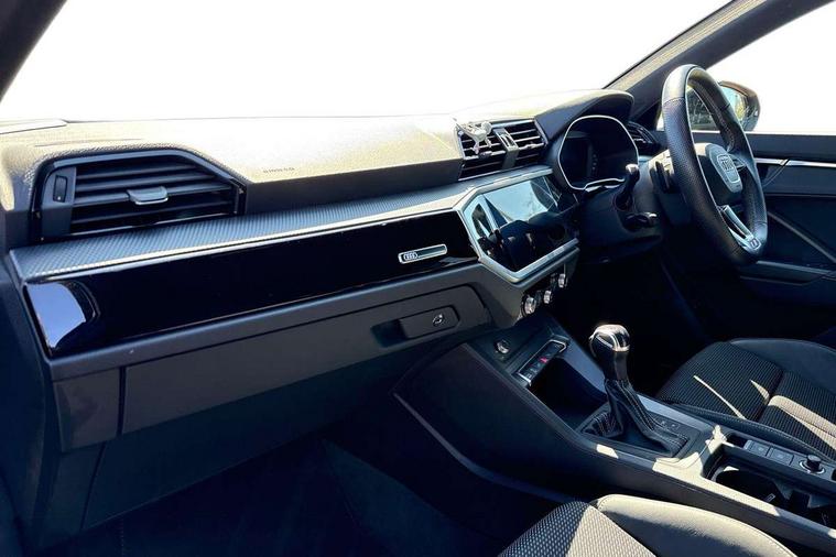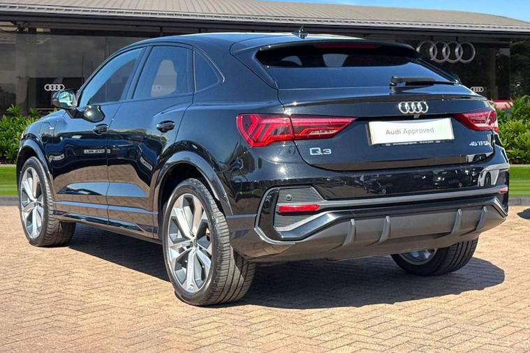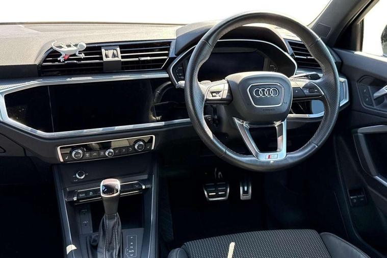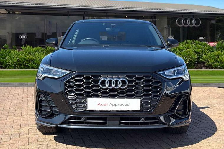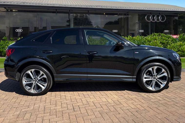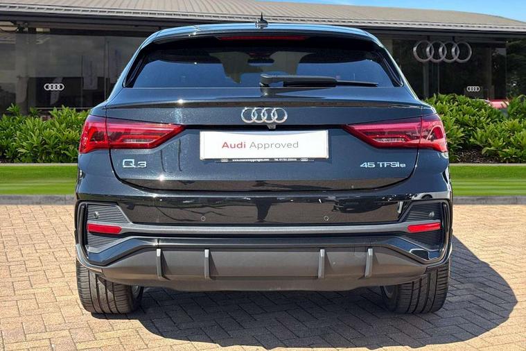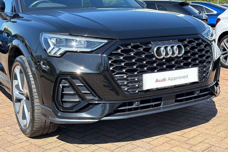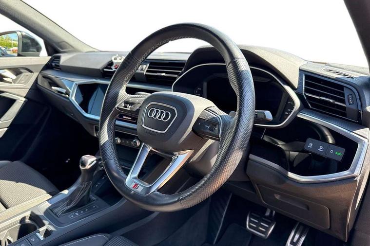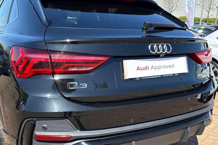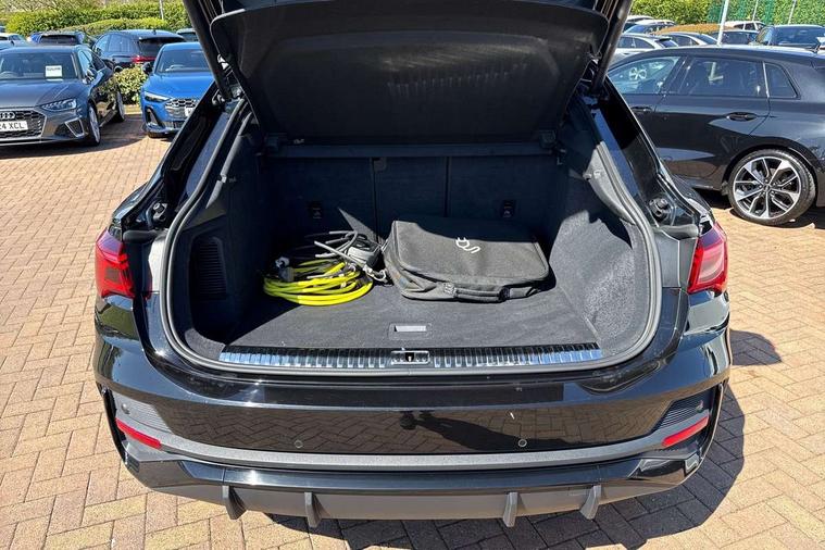 360 degree parking camera, Audi connect safety and service (e-call), Audi drive select, Audi lane departure warning, Audi phone box with wireless charging, Audi smartphone interface includes wireless Apple carplay/Android Auto, Audi virtual cockpit plus, Bluetooth interface, Camera based traffic sign recognition, MMI Navigation Plus with high resolution 10.1 inch touchscreen colour display, Power operated tailgate, Progressive steering, Rear cross traffic assist, Service interval indicator, Start stop system with recuperation, Voice control system with natural language interaction, 3 pin 10 amp domestic charging cable, Adaptive suspension with damping control, Type 2 mode 3 32 amp charging cable, Type 2 socket for AC charging, 2 USB-C ports with charge and data functions, DAB digital radio module, SONOS premium sound system, Acoustic windscreen, Audi Beam uses LEDs to project Vorsprung logo, Auto dimming door mirrors, Auto dimming frameless rear view mirror, Bumpers and underbody protection in contrasting manhattan grey paint finish, Diffuser grille in grained matt black, Diffuser trim in selenite silver, Electrically folding, adjustable and heated door mirrors with integrated LED side indicators and kerb view function for passenger side, Front and rear electric windows, Front fog lights, Front side air inlets in selenite silver, Headlight washers, High gloss black finish B and C pillars, LED daytime running lights, Matrix LED headlights with LED rear lights and dynamic front and rear indicator, Panoramic opening glass sunroof, Privacy glass dark tinted rear and rear-side windows (from B-pillar backwards), Rain and light sensors, Rear side wing doors, Rear underbody protection in matt black, Rear wiper, Third brake light, 12V socket in rear centre console, 3 seat bench in 2nd row, 4 way electric lumbar support for driver and front passenger, 40:20:40 folding with manual adjustment for 60:40 forwards/backwards position and backrest angle, Adjustable rear seat bench/backrest with centre armrest and cupholder, Black cloth headlining, Dual zone electronic climate control, Electrically adjustable front seats, Front and rear black floor mats with contrast stitching, Front and rear headrests, Front and rear roof module including reading lights, Front centre armrest, Glove compartment lighting, Heated front seats, Height and reach adjustable steering wheel, Illuminated door sill trims with S logo, ISOFIX child seat mounting for front passenger with airbag deactivation and outer rear seat including top tether attachment point for outer rear seats, Leather steering wheel in 3-spoke design with multifunction plus and shift paddles, Luggage compartment light, Perforated leather gearknob, Single front passenger seat, Stainless steel luggage compartment sill finisher, Stainless steel pedals, Tool kit, Black styling pack - Q3 Sportback Vorsprung, Driver Assistance Pack - Q3, Multi coloured extended ambient interior lighting pack - Q3, Non smoking pack - Q3, 3x3 point rear seatbelts, 6 airbags - Driver, front passenger, curtain and side windows, Electrically operated child locks on rear doors, Electromechanical parking brake, Electronic stabilisation control including ABS, ASR and EDL, Hill descent control, Hill hold assist, Pre sense basic, Seatbelt monitoring, Tyre pressure warning, Warning triangle and first aid kit, Advanced key, Anti theft alarm, Anti theft wheel bolts, Audi pre-sense front with pedestrain and cyclist recognition, Remote central locking, Black dashboard, Leatherette door armrest, MMI touch colour display in glass look, black with surround in aluminium look, Tyre repair kit,