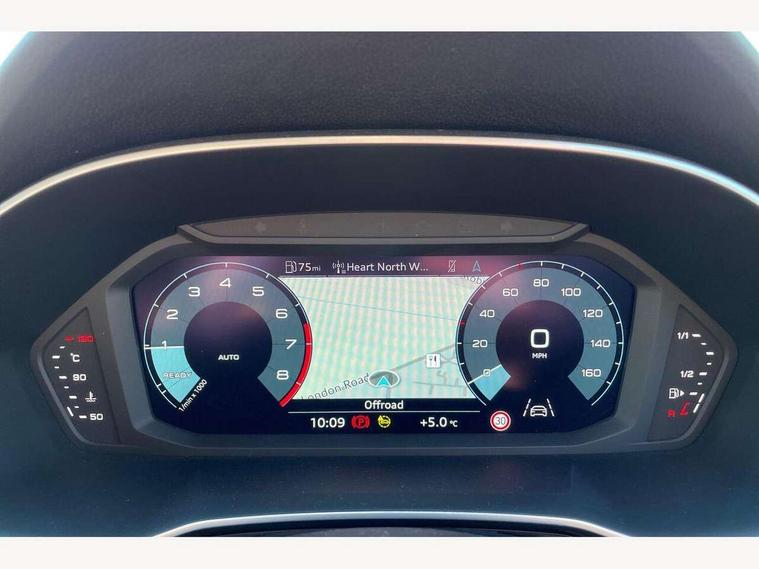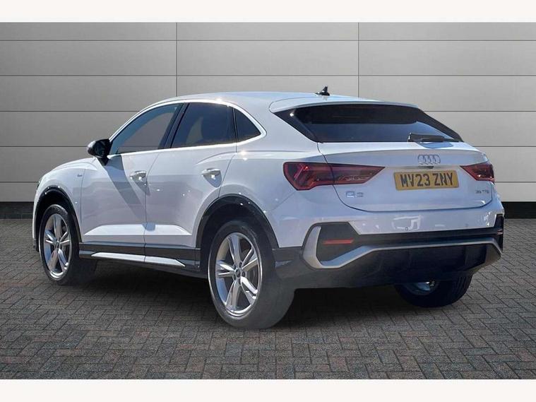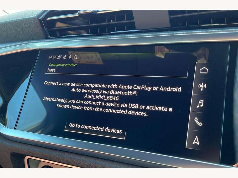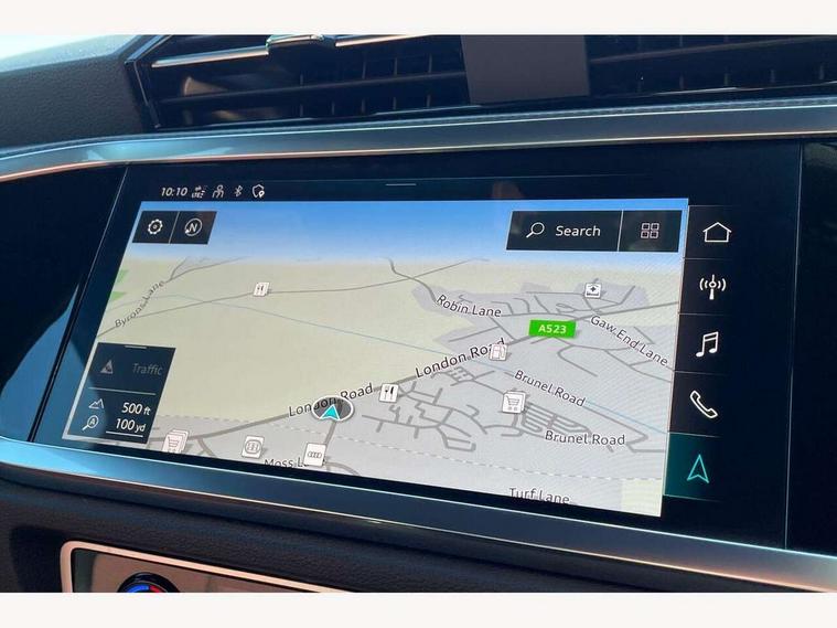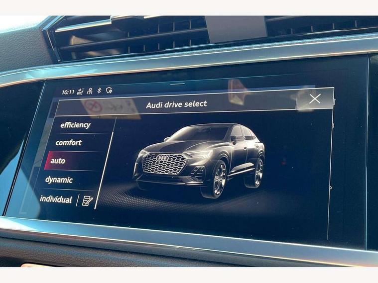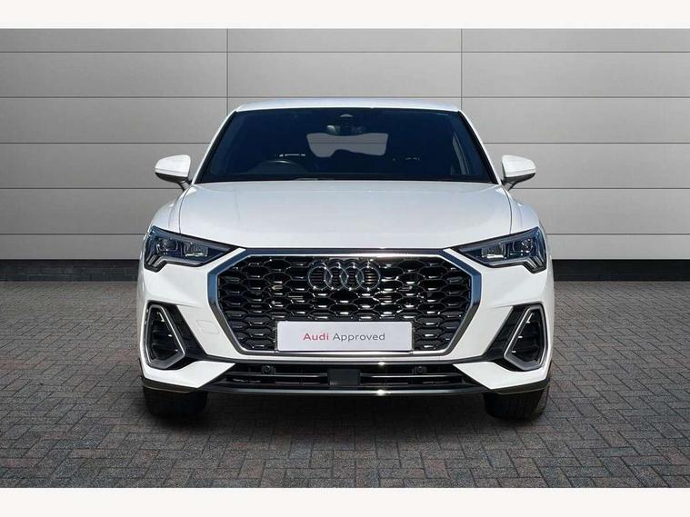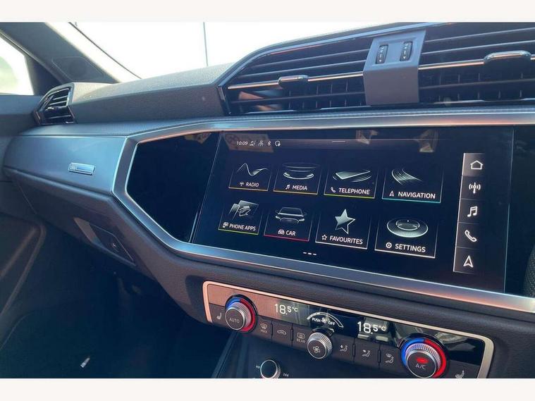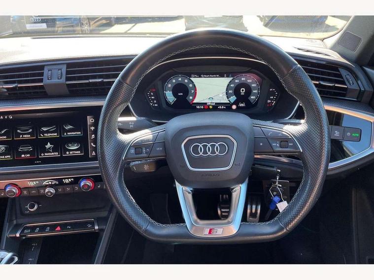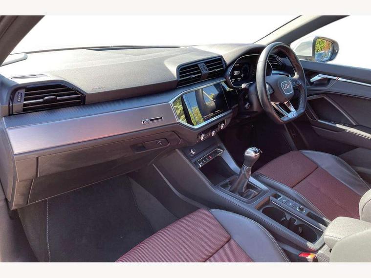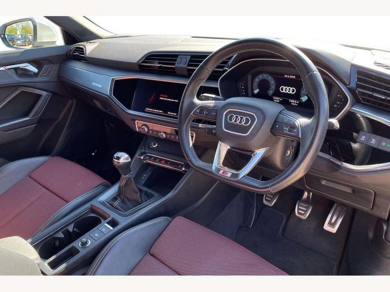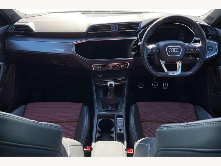 Audi drive select, Audi lane departure warning, Audi Virtual Cockpit - 10.25" display, Bluetooth interface, Camera based traffic sign recognition, Cruise control + speed limiter, Legal emergency call, MMI Navigation Plus with high resolution 10.1 inch touchscreen colour display, Power operated tailgate, Progressive steering, Rear parking sensors, Service interval indicator, Smartphone interface includes wireless Apple carplay/Android Auto, Start stop system with recuperation, Voice control system with natural language interaction, Sports suspension, 2 USB-C ports with charge and data functions, 6 passive loudspeakers, DAB digital radio module, Acoustic windscreen, Aluminium window trim, Auto dimming frameless rear view mirror, Diffuser grille in grained matt black, Diffuser trim in selenite silver, Electrically folding, adjustable and heated door mirrors with integrated LED side indicators and kerb view function for passenger side, Front and rear electric windows, Front fog lights, Front side air inlets in selenite silver, Front underbody protection in manhattan grey paint finish, Grille surround in aluminium silver matt, High gloss black finish B and C pillars, LED Dynamic rear indicators, LED headlights with LED daytime running lights, LED rear lights, LED third brake light, Privacy glass dark tinted rear and rear-side windows (from B-pillar backwards), Radiator grille in anthracite black with inlay in matt aluminium silver, Rain and light sensors, Rear side wing doors, Rear underbody protection in matt black, Rear wiper, S line badges on front wings, S line front and rear bumpers and side skirts in contrasting Manhattan grey paint finish, Side skirt insert in matt Platinium grey, Variable front intermittent wipers, 12V socket in rear centre console, 3 seat bench in 2nd row, 3 spoke leather multifunction steering wheel features S badging and grips in perforated leather with contrast stitching, 40:20:40 folding with manual adjustment for 60:40 forwards/backwards position and backrest angle, Adjustable rear seat bench/backrest with centre armrest and cupholder, Black cloth headlining, Dual zone electronic climate control, Front and rear black floor mats with contrast stitching, Front and rear headrests, Front and rear roof module including reading lights, Front centre armrest, Glove compartment lighting, Height and reach adjustable steering wheel, Illuminated door sill trims with S logo, ISOFIX child seat mounting for front passenger with airbag deactivation and outer rear seat including top tether attachment point for outer rear seats, Luggage compartment light right in white, Luggage compartment sill protection in stainless steel, Manual front seats with height adjustment, Perforated leather gearknob, Single front passenger seat, Stainless steel pedals, Ambient lighting pack - Q3, Non smoking pack - Q3, 3x3 point rear seatbelts, 6 airbags - Driver, front passenger, curtain and side windows, Audi pre-sense front with pedestrain and cyclist recognition, Electrically operated child locks on rear doors, Electromechanical parking brake, Electronic stabilisation control including ABS, ASR and EDL, Front seatbelt reminder, Hill descent control, Hill hold assist, Pre sense basic, Seatbelt monitoring, Tyre pressure warning, Warning triangle and first aid kit, Anti theft alarm, Anti theft wheel bolts, Immobiliser, Remote central locking, Aluminium look interior elements, Black dashboard, Dark matt brushed aluminium inlay, Detail dashboard around MMI touch colour display in glass look, black with surround in aluminium look, Leatherette door armrest,