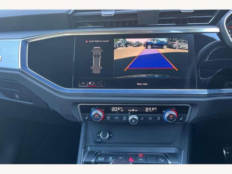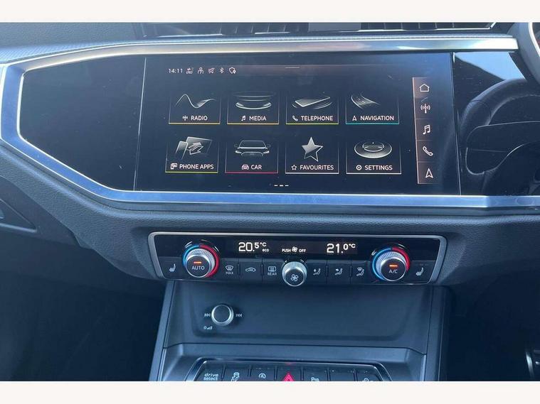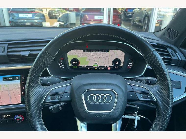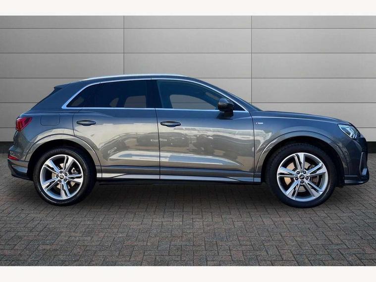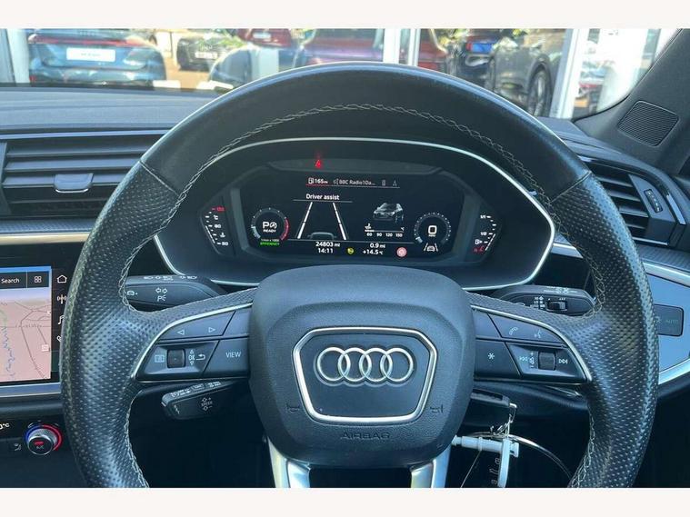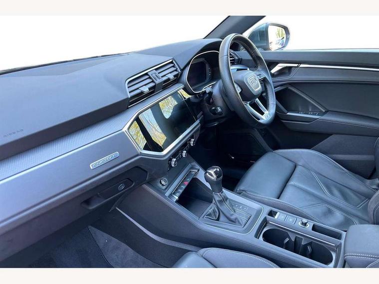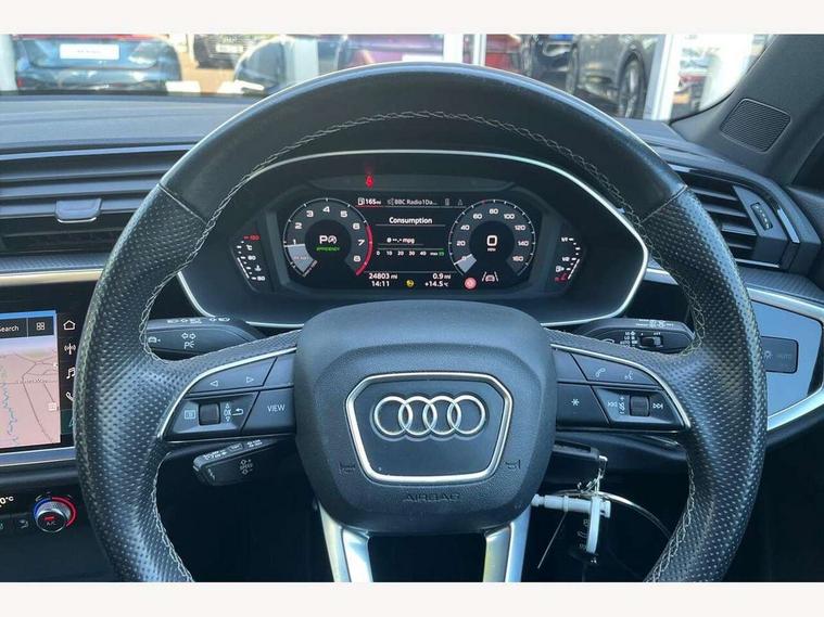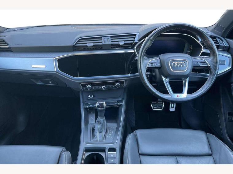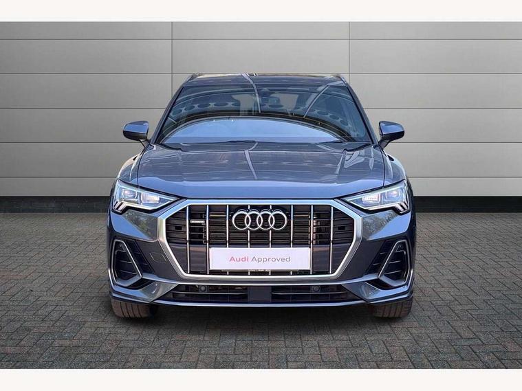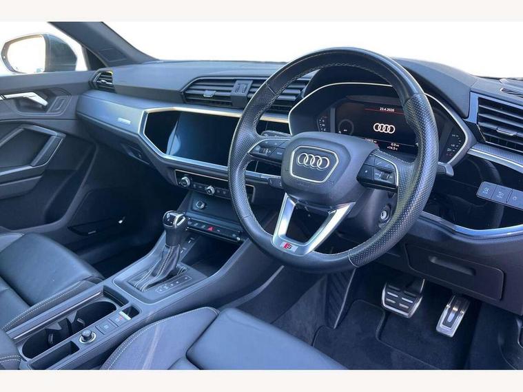Amazon alexa Integration, Audi connect safety and service (e-call), Audi drive select, Audi lane departure warning, Audi Virtual Cockpit - 10.25" display, Bluetooth interface, Camera based traffic sign recognition, MMI Navigation Plus with high resolution 10.1 inch touchscreen colour display, Power operated tailgate, Progressive steering, Service interval indicator, Smartphone interface includes wireless Apple carplay/Android Auto, Start stop system with recuperation, Voice control system with natural language interaction, Sports suspension, 2 USB-C ports with charge and data functions, 6 passive loudspeakers, DAB digital radio module, Acoustic windscreen, Aluminium roof rails, Aluminium window trim, Auto dimming frameless rear view mirror, Body coloured bumpers, Electrically folding, adjustable and heated door mirrors with integrated LED side indicators and kerb view function for passenger side, Front and rear electric windows, Front fog lights, Front side air inlets in matt platinum grey, Front spoiler blade in matt platinum grey, Grille vertical bars in aluminium silver/Matt, High gloss black finish B and C pillars, LED headlights with LED daytime running lights, LED rear lights, LED third brake light, Privacy glass dark tinted rear and rear-side windows (from B-pillar backwards), Rain and light sensors, Rear diffuser strip in matt titanium black, Rear side wing doors, Rear wiper, S line badges on front wings, S Line front and rear bumpers, Side skirt insert in matt Platinium grey, Silver chrome grille surround, Tinted rear windows, Titanium black radiator grille, Variable front intermittent wipers, 12V socket in rear centre console, 3 seat bench in 2nd row, 40:20:40 folding with manual adjustment for 60:40 forwards/backwards position and backrest angle, Adjustable rear seat bench/backrest with centre armrest and cupholder, Black cloth headlining, Dual zone electronic climate control, Front and rear black floor mats with contrast stitching in rock grey, Front and rear headrests, Front and rear roof module including reading lights, Front centre armrest, Glove compartment lighting, Height and reach adjustable steering wheel, Illuminated door sill trims with S logo, ISOFIX child seat mounting for front passenger with airbag deactivation and outer rear seat including top tether attachment point for outer rear seats, Luggage compartment light, Manual front seats with height adjustment, Perforated leather gearknob, Single front passenger seat, Stainless steel luggage compartment sill finisher, Stainless steel pedals, Non smoking pack - Q3, 3x3 point rear seatbelts, 6 airbags - Driver, front passenger, curtain and side windows, Audi pre-sense front with pedestrain and cyclist recognition, Electrically operated child locks on rear doors, Electromechanical parking brake, Electronic stabilisation control including ABS, ASR and EDL, Front seatbelt reminder, Hill descent control, Hill hold assist, Pre sense basic, Seatbelt monitoring, Tyre pressure warning, Warning triangle and first aid kit, Anti theft alarm, Anti theft wheel bolts, Immobiliser, Remote central locking, Dark matt brushed aluminium inlay, Detail dashboard around MMI touch colour display in glass look, black with surround in aluminium look, Leatherette door armrest,