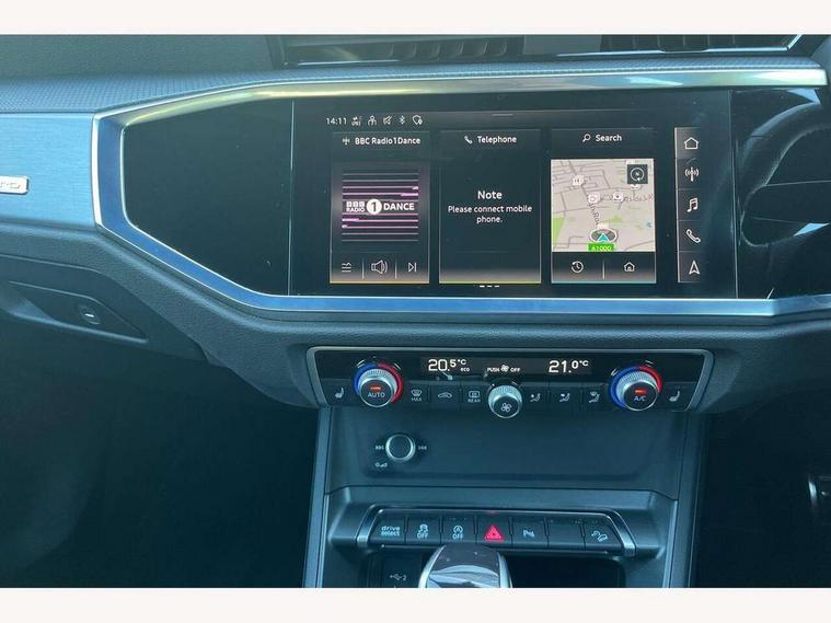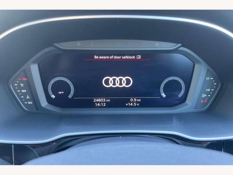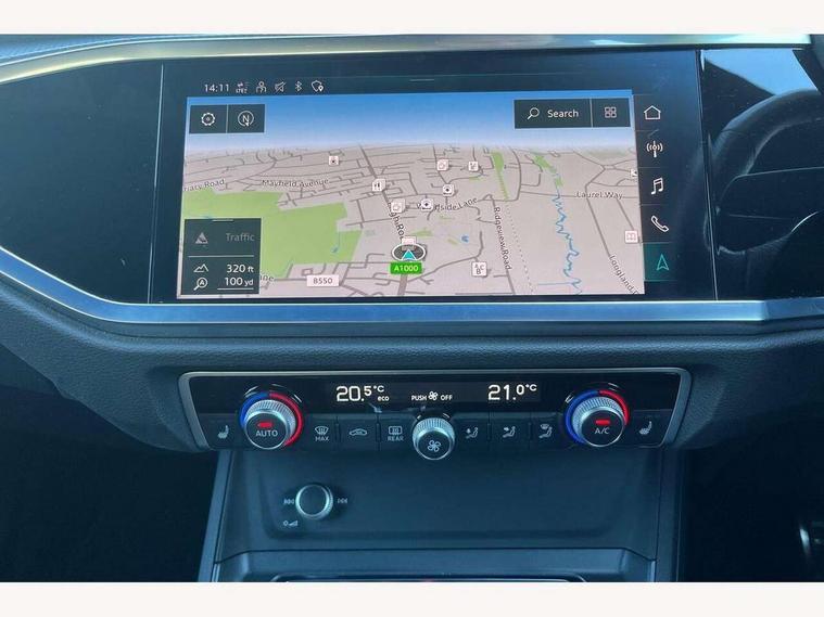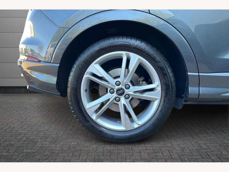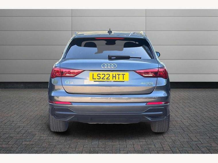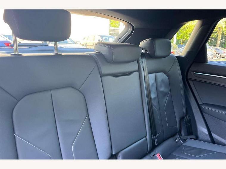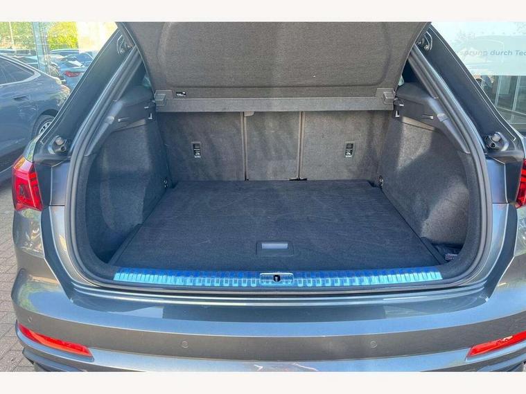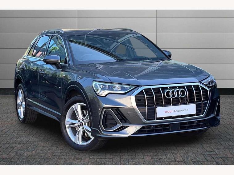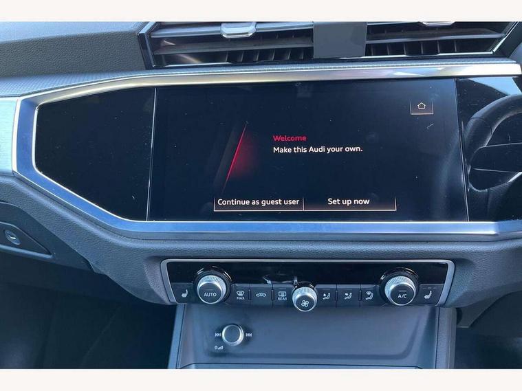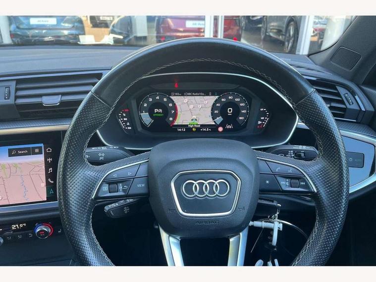 Amazon alexa Integration, Audi connect safety and service (e-call), Audi drive select, Audi lane departure warning, Audi Virtual Cockpit - 10.25" display, Bluetooth interface, Camera based traffic sign recognition, MMI Navigation Plus with high resolution 10.1 inch touchscreen colour display, Power operated tailgate, Progressive steering, Service interval indicator, Smartphone interface includes wireless Apple carplay/Android Auto, Start stop system with recuperation, Voice control system with natural language interaction, Sports suspension, 2 USB-C ports with charge and data functions, 6 passive loudspeakers, DAB digital radio module, Acoustic windscreen, Aluminium roof rails, Aluminium window trim, Auto dimming frameless rear view mirror, Body coloured bumpers, Electrically folding, adjustable and heated door mirrors with integrated LED side indicators and kerb view function for passenger side, Front and rear electric windows, Front fog lights, Front side air inlets in matt platinum grey, Front spoiler blade in matt platinum grey, Grille vertical bars in aluminium silver/Matt, High gloss black finish B and C pillars, LED headlights with LED daytime running lights, LED rear lights, LED third brake light, Privacy glass dark tinted rear and rear-side windows (from B-pillar backwards), Rain and light sensors, Rear diffuser strip in matt titanium black, Rear side wing doors, Rear wiper, S line badges on front wings, S Line front and rear bumpers, Side skirt insert in matt Platinium grey, Silver chrome grille surround, Tinted rear windows, Titanium black radiator grille, Variable front intermittent wipers, 12V socket in rear centre console, 3 seat bench in 2nd row, 40:20:40 folding with manual adjustment for 60:40 forwards/backwards position and backrest angle, Adjustable rear seat bench/backrest with centre armrest and cupholder, Black cloth headlining, Dual zone electronic climate control, Front and rear black floor mats with contrast stitching in rock grey, Front and rear headrests, Front and rear roof module including reading lights, Front centre armrest, Glove compartment lighting, Height and reach adjustable steering wheel, Illuminated door sill trims with S logo, ISOFIX child seat mounting for front passenger with airbag deactivation and outer rear seat including top tether attachment point for outer rear seats, Luggage compartment light, Manual front seats with height adjustment, Perforated leather gearknob, Single front passenger seat, Stainless steel luggage compartment sill finisher, Stainless steel pedals, Non smoking pack - Q3, 3x3 point rear seatbelts, 6 airbags - Driver, front passenger, curtain and side windows, Audi pre-sense front with pedestrain and cyclist recognition, Electrically operated child locks on rear doors, Electromechanical parking brake, Electronic stabilisation control including ABS, ASR and EDL, Front seatbelt reminder, Hill descent control, Hill hold assist, Pre sense basic, Seatbelt monitoring, Tyre pressure warning, Warning triangle and first aid kit, Anti theft alarm, Anti theft wheel bolts, Immobiliser, Remote central locking, Dark matt brushed aluminium inlay, Detail dashboard around MMI touch colour display in glass look, black with surround in aluminium look, Leatherette door armrest,