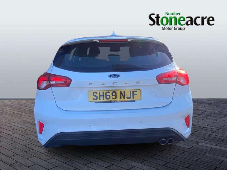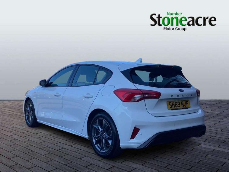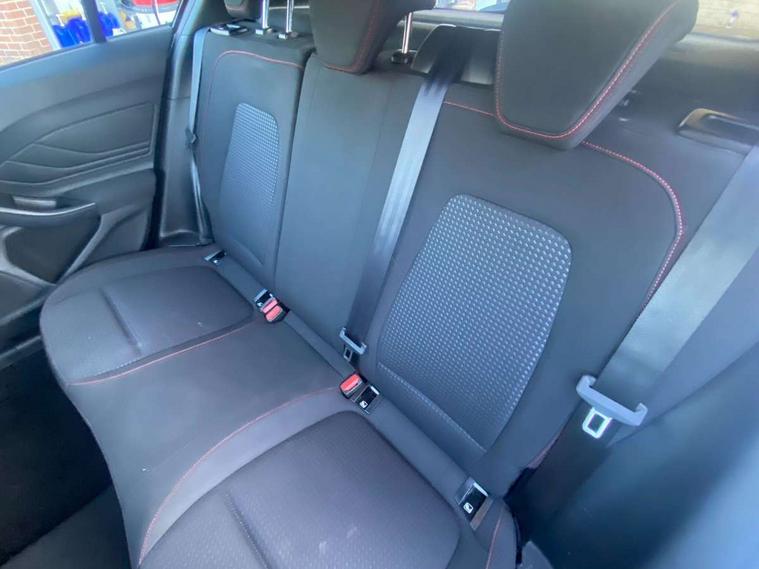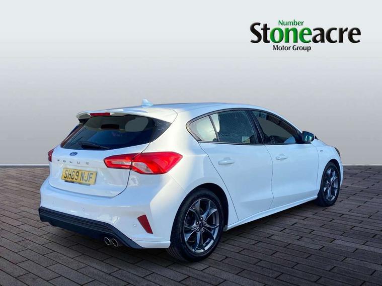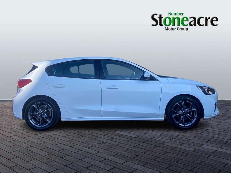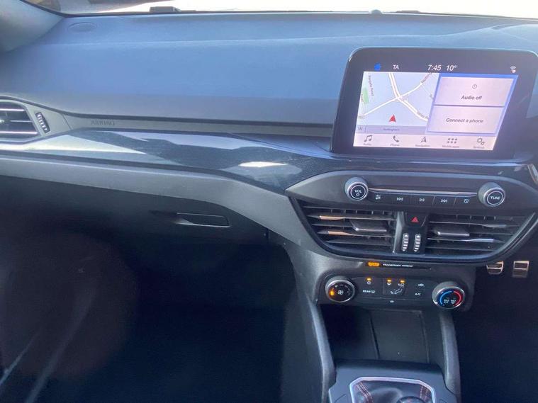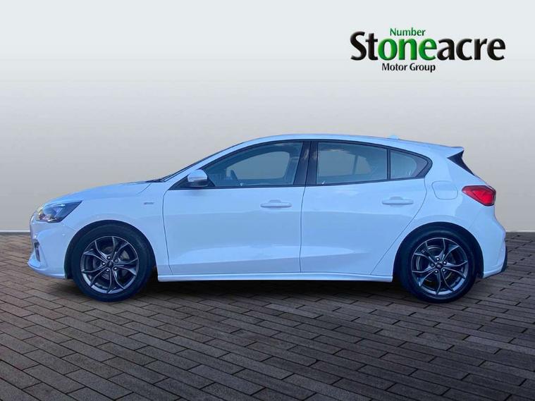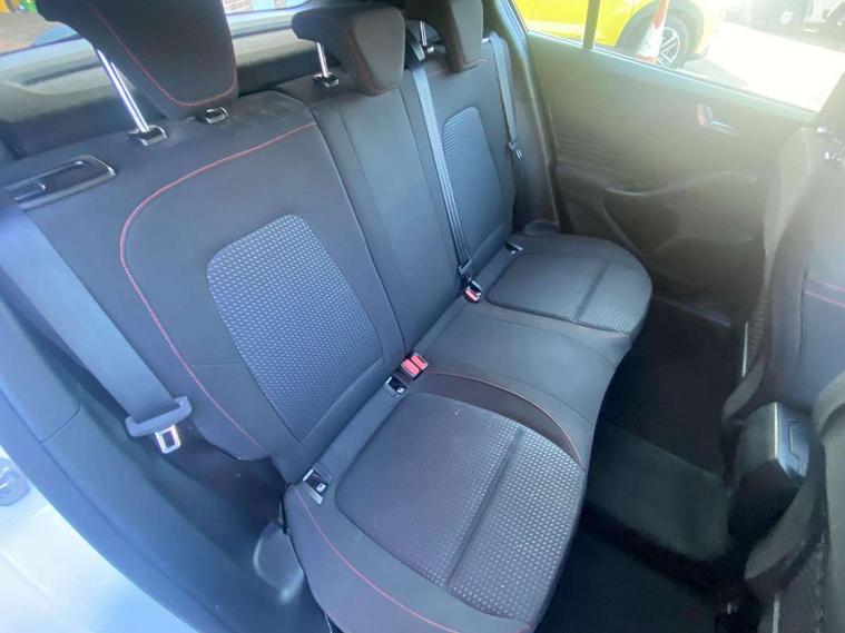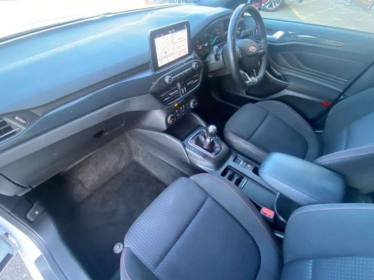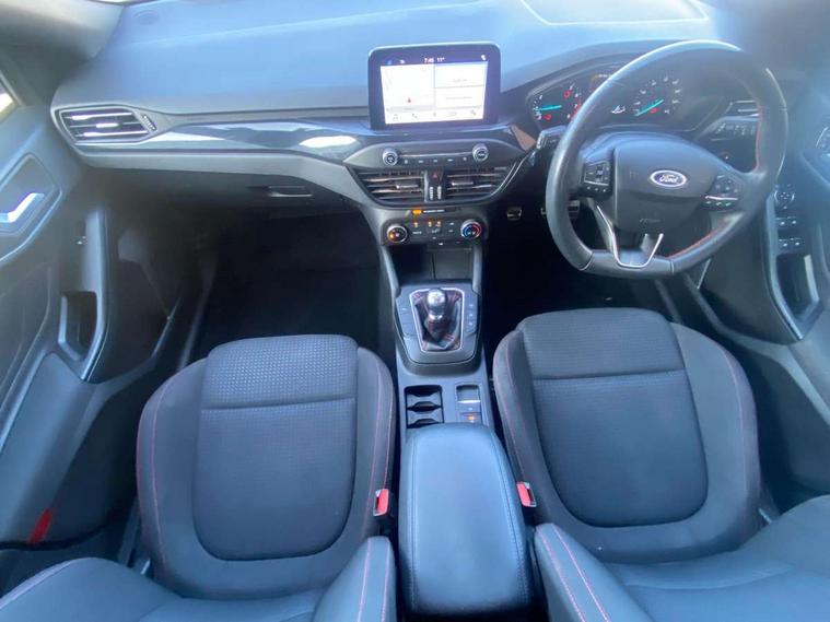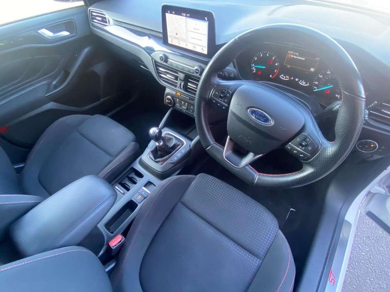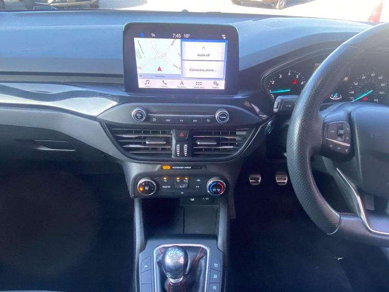 Bluetooth system, Digital clock, Easy fuel capless refuelling system, Eco mode, Ford pass connect, Ford SYNC 3 with 8" TFT touchscreen, and app link Android auto/Apple carplay, Intelligent speed assist, Lane keeping aid with lane departure warning, PAS, Selectable drive mode, Trip computer, Sports tuned suspension, 6 speakers, Aux input, 'Quickclear' heated windscreen/heated washer jets, Auto headlamps (on/off), Body colour large rear spoiler, Body colour side skirt, Body coloured bumpers, Body coloured door handles, Body coloured electrically operated and heated door mirrors with side indicators, Electrically operated front and rear windows with one touch opening and closing, Front variable intermittent wipers with electric wash, Halogen reflector headlamps, Heated rear window, LED daytime running lamp, LED front fog lamps with cornering function, Polished twin tailpipe, ST-Line upper and lower grille with full body styling kit and wing badges, Tailgate wash/wipe, 3 spoke flat bottomed leather steering wheel with red stitching, 60/40 split back and cushion rear seats with 2 height adjustable headrests, Alloy finish pedals, Aluminium gear knob, Centre console with armrest, Cloth upholstery with red stitching, Dark headliner, Driver's lumbar support, Front floor mats, Height adjustable front headrests, Isofix child seat preparation, Manual air conditioning, Reach + rake adjustable steering column, Rear centre headrest, ABS+Electronic Brake force Distribution, Auto hold function, Driver airbag, Electronic parking brake, Electronic stability control, Front and rear seatbelt reminder, Front inertia reel height adjustable seatbelts with pre-tensioners, Front passenger airbag, Front side airbags, Hill start assist, Passenger airbag deactivate switch, Post collision braking, Pre collision assist with autonomous emergency braking and pedestrian/cyclist detection, Side curtain airbags, Three rear inertia reel lap/diagonal seatbelts, Tyre pressure monitoring system, Keyless start with 'Ford Power' starter button, MyKey system, Remote central locking & engine immobiliser, Thatcham category 1 alarm, Contrast stitching - Red, 17" 5x2 spoke alloy wheels with rock metallic finish, Mini steel spare wheel,