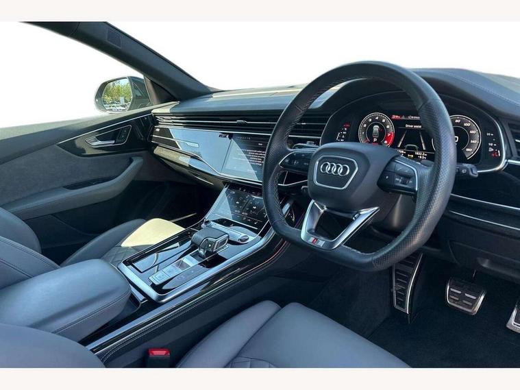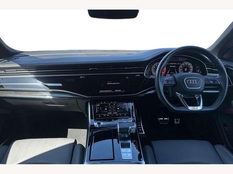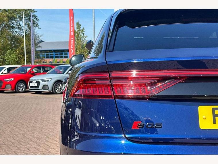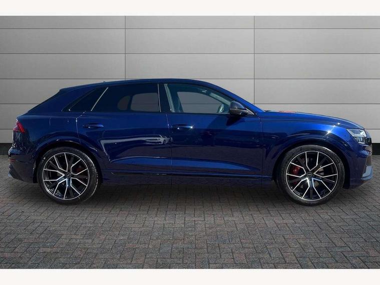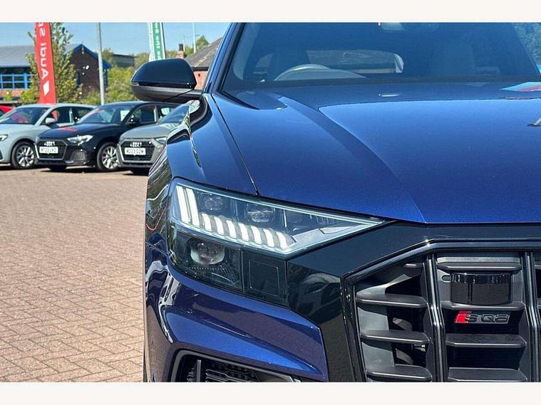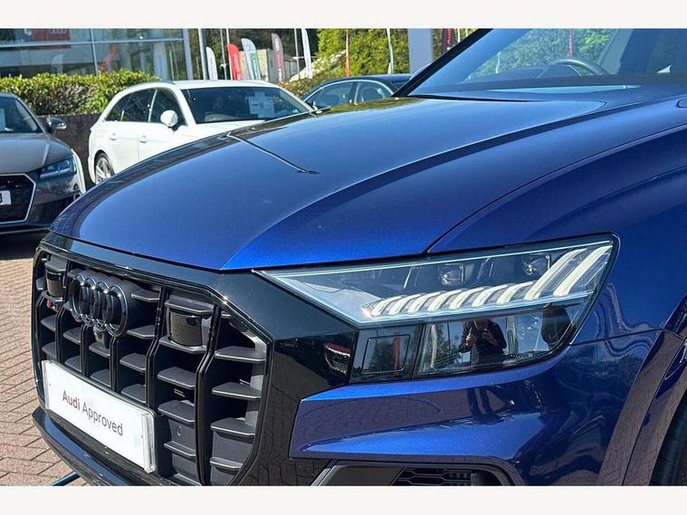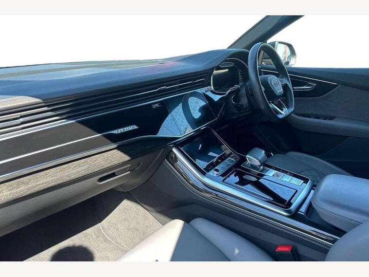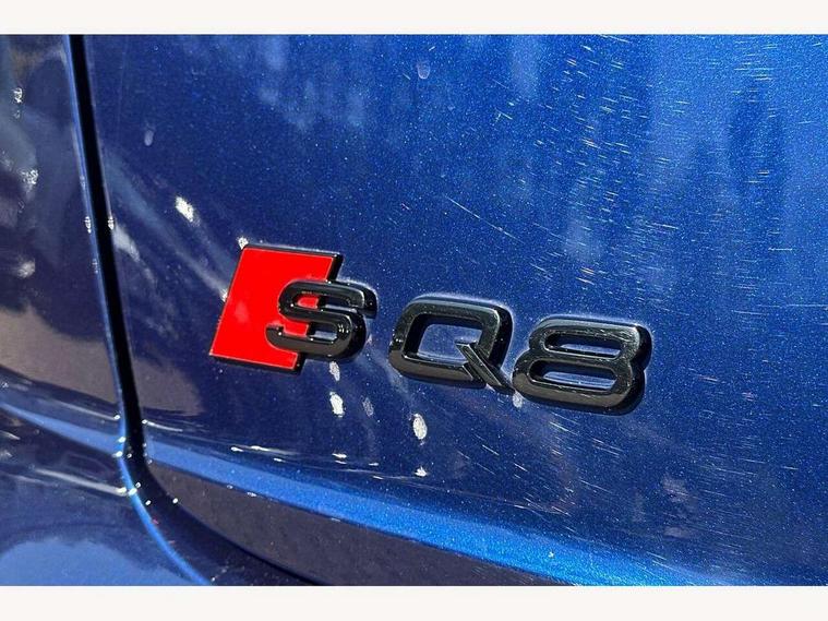 10.1" and 8.6" Dual colour touchscreens, All wheel steering, Audi connect safety and service (e-call), Audi connect with Amazon Alexa Integration, Audi drive select, Audi parking system plus includes 360 degree display with front and rear sensors, Audi virtual cockpit - 12.3" high resolution LCD display with fully customisable instrument cluster, Automatic start/stop system, Electro-mechanical PAS, Low washer fluid indicator, MMI - Multi Media Interface control system, MMI navigation plus with MMI touch, Natural voice recognition, On board computer, Operating buttons in black, glass look with haptic feedback, Power operated tailgate, Rear view camera, Service interval indicator, Smartphone interface includes wireless Apple carplay/Android Auto, 48V Mild hybrid technology, 85 litre fuel tank, Quattro all wheel drive with self locking centre differential, S specific Adaptive air suspension, Audi music interface with 2 USB ports with charge and data functions, Audi sound system with 6 channel amplifier, 180 watt amplifying capacity and 10 loudspeakers including subwoofer, Aux-in socket, DAB Digital radio, 3rd brake light, Acoustic windscreen, Audi Beam uses LEDs to project the Audi logo, Audi HD Matrix LED headlights with dynamic front and rear indicators, Auto dimming frameless rear view mirror, Body coloured bumpers, Coming/leaving home lighting function, Electric front+rear windows, Electrically folding auto dimming/adjustable/heated door mirrors with memory function, LED side indicators and kerb view function for passenger side, Gloss black finish for exterior Audi rings and SQ8 logo, Headlight washers, Heat insulating glass in windshield, LED signature daytime running lights, Platinum grey front spoiler lip and diffuser insert, Privacy glass - dark tinted rear and rear side windows from B-pillar backwards, Rain and light sensors, Rear side wing doors, Rear wiper, S specific dual brach chrome tailpipes on both the left and right, S specific front and rear bumpers, S specific side skirts in matt selenite silver, Side air inlet grilles in matt titanium black, Trim and underbody protection in matt selenite silver, 4 zone deluxe automatic climate control, 4-way lumbar support for front seats, 40:20:40 split folding rear bench seat, Black cloth headlining, Comfort front centre armrest, Driver seat memory function, Electrically adjustable front seats, Front head restraints, Front/rear floor mats, Heated front seats, Illuminated door sill trims, ISOFIX child seat mounting for front passenger seat and 2 outer rear seats with top tether child seat mounting for all 3 rear seats, LED interior ambient lighting, Luggage compartment sill protection in stainless steel, Rear centre armrest with 2 cupholders, Rear headrests, Rear seat bench plus, Single front passenger seat, Stainless steel pedals, Sunvisors with illuminated vanity mirrors, Upper and lower interior elements in leather, leather door armrests, Titanium Black Styling Pack - Q8, 3 point seatbelts on all seats, Audi pre sense front, Child locks on rear doors, Driver and front passenger, front side and curtain airbags, Electromechanical parking brake, Electronic Stability Control (ESC) including ABS, ASR and EDL, Front passenger airbag deactivation, Hill descent control, Hill hold assist, Predictive pedestrian protection, Seatbelt monitoring, Traction control, Tyre pressure loss indicator, Warning triangle and first aid kit, Anti theft alarm with tow away protection, Anti-theft wheel bolts and wheel loosening detection, Immobiliser, Keyless go with remote central locking, Polished oak trim with grey finish inlay, Tool kit, Tyre repair kit,