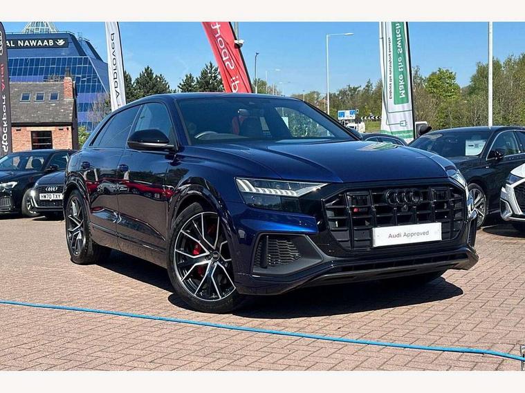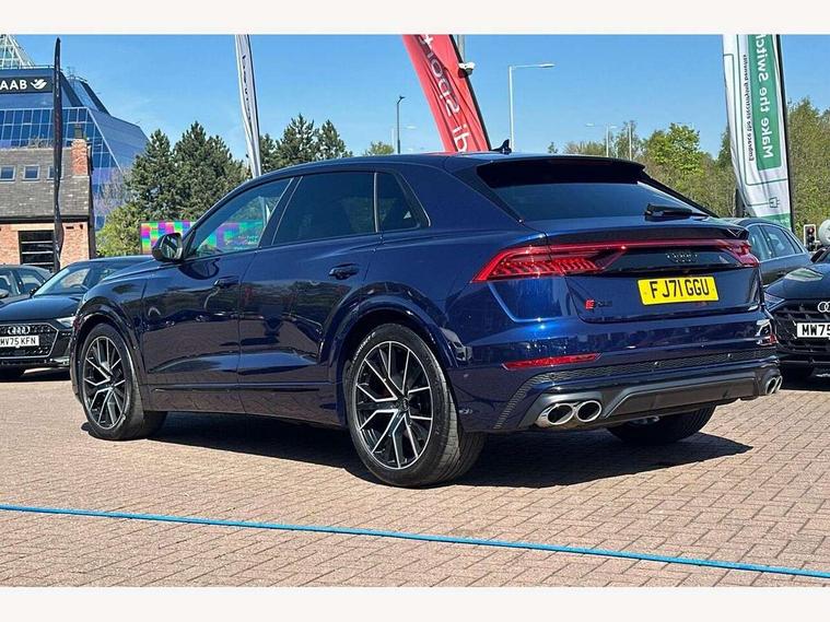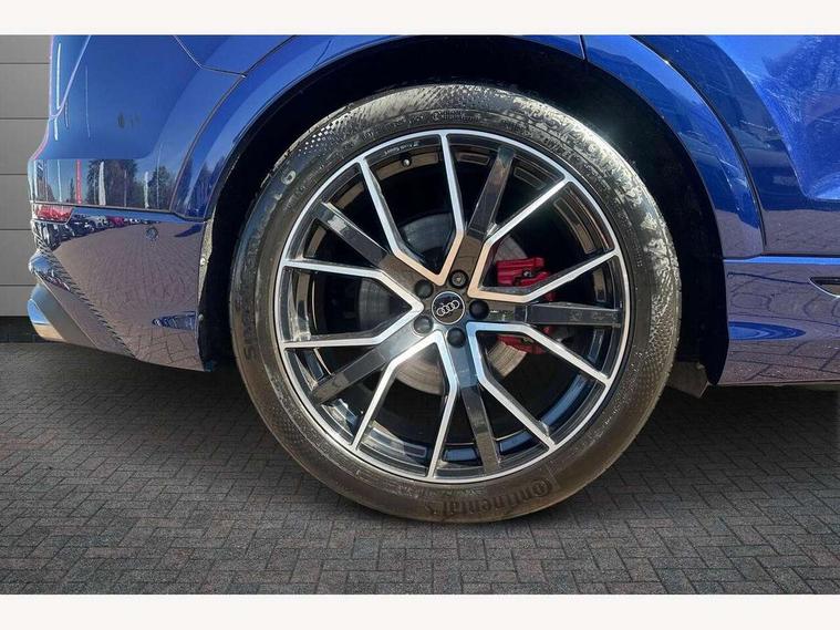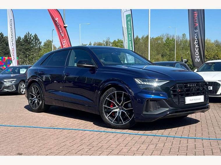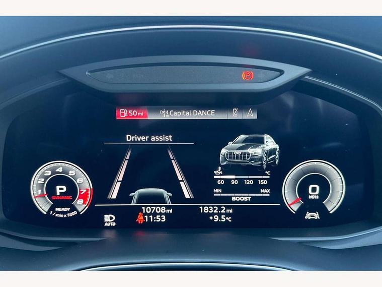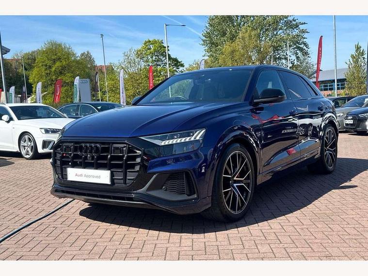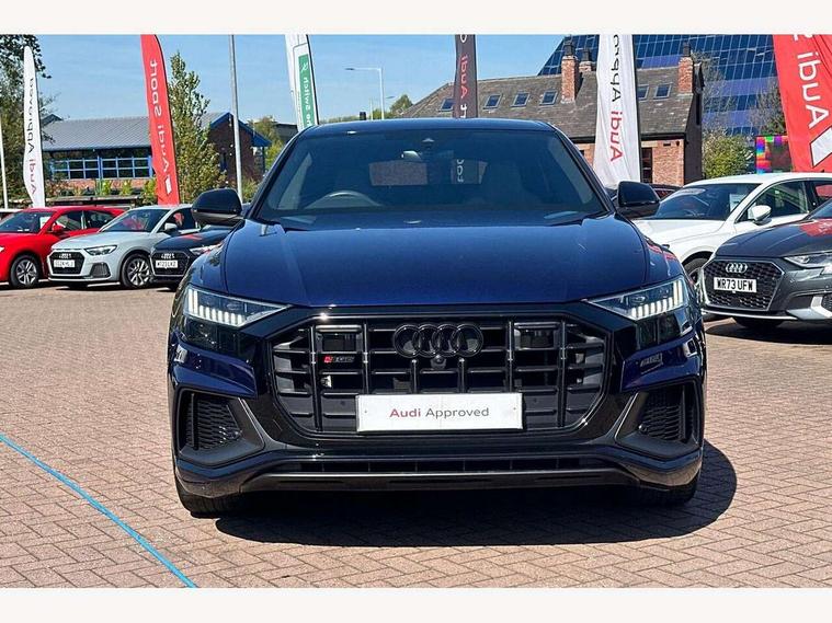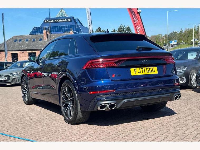 10.1" and 8.6" Dual colour touchscreens, All wheel steering, Audi connect safety and service (e-call), Audi connect with Amazon Alexa Integration, Audi drive select, Audi parking system plus includes 360 degree display with front and rear sensors, Audi virtual cockpit - 12.3" high resolution LCD display with fully customisable instrument cluster, Automatic start/stop system, Electro-mechanical PAS, Low washer fluid indicator, MMI - Multi Media Interface control system, MMI navigation plus with MMI touch, Natural voice recognition, On board computer, Operating buttons in black, glass look with haptic feedback, Power operated tailgate, Rear view camera, Service interval indicator, Smartphone interface includes wireless Apple carplay/Android Auto, 48V Mild hybrid technology, 85 litre fuel tank, Quattro all wheel drive with self locking centre differential, S specific Adaptive air suspension, Audi music interface with 2 USB ports with charge and data functions, Audi sound system with 6 channel amplifier, 180 watt amplifying capacity and 10 loudspeakers including subwoofer, Aux-in socket, DAB Digital radio, 3rd brake light, Acoustic windscreen, Audi Beam uses LEDs to project the Audi logo, Audi HD Matrix LED headlights with dynamic front and rear indicators, Auto dimming frameless rear view mirror, Body coloured bumpers, Coming/leaving home lighting function, Electric front+rear windows, Electrically folding auto dimming/adjustable/heated door mirrors with memory function, LED side indicators and kerb view function for passenger side, Gloss black finish for exterior Audi rings and SQ8 logo, Headlight washers, Heat insulating glass in windshield, LED signature daytime running lights, Platinum grey front spoiler lip and diffuser insert, Privacy glass - dark tinted rear and rear side windows from B-pillar backwards, Rain and light sensors, Rear side wing doors, Rear wiper, S specific dual brach chrome tailpipes on both the left and right, S specific front and rear bumpers, S specific side skirts in matt selenite silver, Side air inlet grilles in matt titanium black, Trim and underbody protection in matt selenite silver, 4 zone deluxe automatic climate control, 4-way lumbar support for front seats, 40:20:40 split folding rear bench seat, Black cloth headlining, Comfort front centre armrest, Driver seat memory function, Electrically adjustable front seats, Front head restraints, Front/rear floor mats, Heated front seats, Illuminated door sill trims, ISOFIX child seat mounting for front passenger seat and 2 outer rear seats with top tether child seat mounting for all 3 rear seats, LED interior ambient lighting, Luggage compartment sill protection in stainless steel, Rear centre armrest with 2 cupholders, Rear headrests, Rear seat bench plus, Single front passenger seat, Stainless steel pedals, Sunvisors with illuminated vanity mirrors, Upper and lower interior elements in leather, leather door armrests, Titanium Black Styling Pack - Q8, 3 point seatbelts on all seats, Audi pre sense front, Child locks on rear doors, Driver and front passenger, front side and curtain airbags, Electromechanical parking brake, Electronic Stability Control (ESC) including ABS, ASR and EDL, Front passenger airbag deactivation, Hill descent control, Hill hold assist, Predictive pedestrian protection, Seatbelt monitoring, Traction control, Tyre pressure loss indicator, Warning triangle and first aid kit, Anti theft alarm with tow away protection, Anti-theft wheel bolts and wheel loosening detection, Immobiliser, Keyless go with remote central locking, Polished oak trim with grey finish inlay, Tool kit, Tyre repair kit,