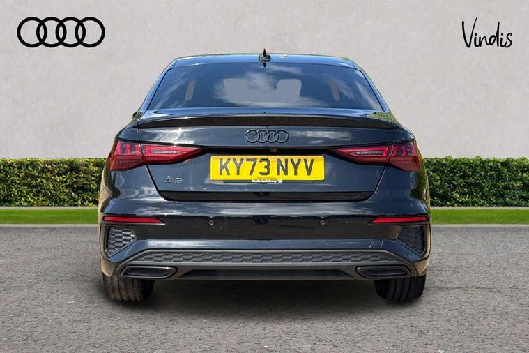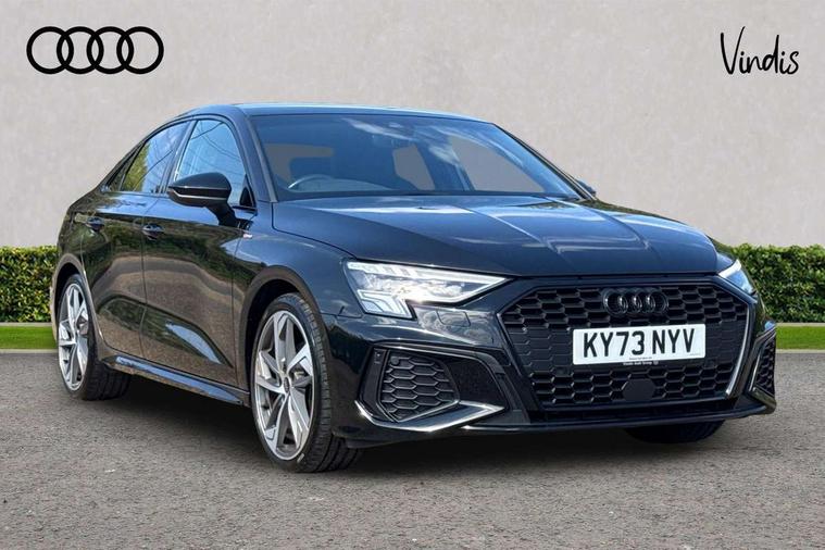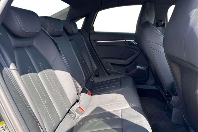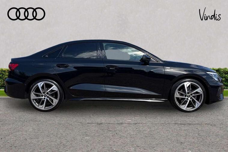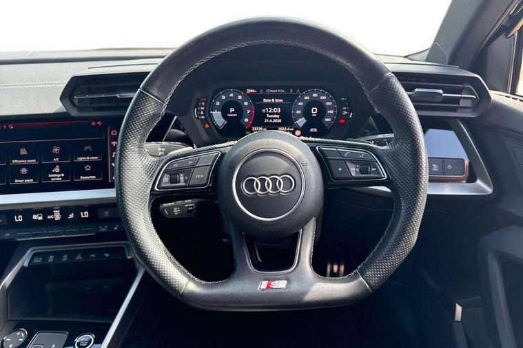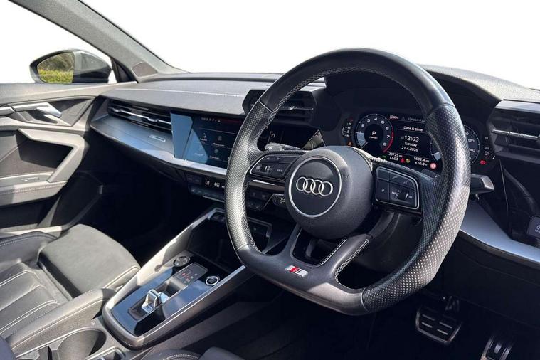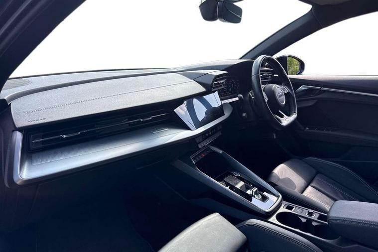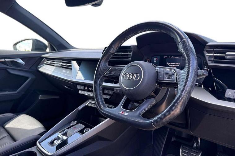 Audi drive select (Auto, Comfort, Dynamic, Efficiency and Individual), Audi smartphone interface, Audi Virtual Cockpit - 10.25" digital and colour instrument cluster, Automatic start/stop system with recuperation, Bluetooth interface, Camera based traffic sign recognition, Collision avoidance assistant, e-Call (emergency call), Electromechanical power speed sensitive steering, Lane departure warning system, MMI Navigation Plus with high resolution 10.1" colour touch screen display, Service indicator, Trip computer, Voice control system with natural language interaction, Sports suspension, 2xUSB-C connection with data and charging functions, 6 passive loudspeakers, CD player, DAB Digital radio, 3rd brake light, Acoustic glass windscreen, Audi beam uses LEDs to project the Audi logo onto the ground as you exit your A3, Auto dimming frameless rear view mirror, Electrically adjustable/heated/folding/auto dimming door mirrors with integrated LED indications + kerb view function for passenger side, Front electric windows, Illuminated door sills with aluminium inserts at the front with S logo, LED daytime running lights, LED headlights with LED rear lights and dynamic rear indicators, Light and rain sensors, Model and engine designation badges at rear, Privacy glass - dark tinted rear window, rear door and side windows, Rear boot, Rear electric windows, Rear side wing doors, S roof spoiler, 12V socket and storage compartment in front centre console, 3 seat bench in 2nd row, 3 spoke flat bottomed leather multifunction sport steering wheel with gear shift paddles, 4 way electrically adjustable lumbar support for driver and front passenger, 60/40 split folding rear seat bench, Black cloth headlining, Dual zone electronic climate control, Front and rear centre armrest in artificial leather, Front and rear headrests, Front/rear floor mats, Height and reach adjustable steering wheel, Interior lighting - glove compartment light and right hand side, Luggage compartment floor covering, Manual boot compartment lid, Single front passenger seat, Stainless steel pedals and front footrest in black, Twin leather upholstery with front sports seats S embossed logo, Aluminium interior elements pack - A3, Black styling pack - A3 Saloon/Black edition, LED interior lighting pack - A3 Saloon, 3x3 point rear seat belts, Driver and front passenger airbag with passenger airbag deactivation, Electronic Stabilisation Control (ESC) including ABS, ASR and EDL, First aid kit with warning triangle and 2 safety vests, Front side airbags with head airbags and interaction airbag, Pre-sense front with pedestrian and cyclist detection, Seatbelt monitoring, Tyre pressure loss indicator, Anti theft alarm, Anti-theft wheel bolts, Electronically operated child locks, Immobiliser, Remote control central locking, Aluminium air vent surrounds, Dark spectrum aluminium inlays, accent surfaces in the dashboard and centre console in platinum grey silk effect paint finish, 19" 5 arm trapezoid design alloy wheels in matt grey with diamond cut finish,