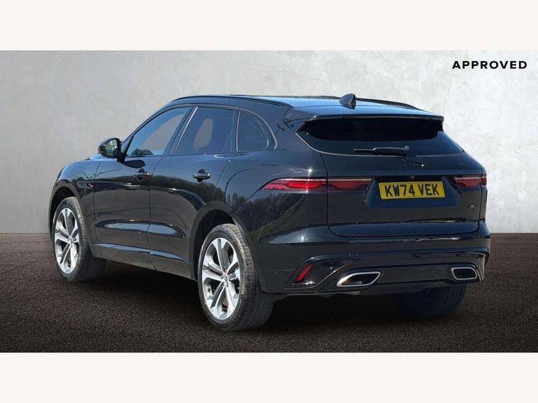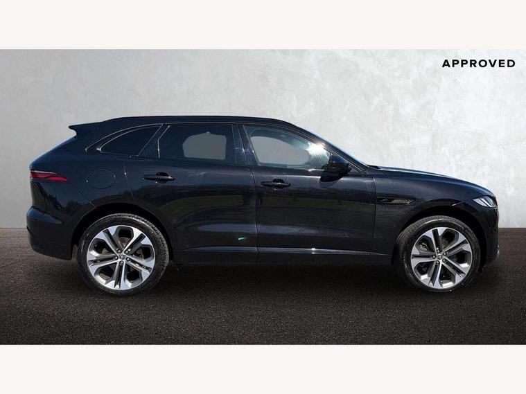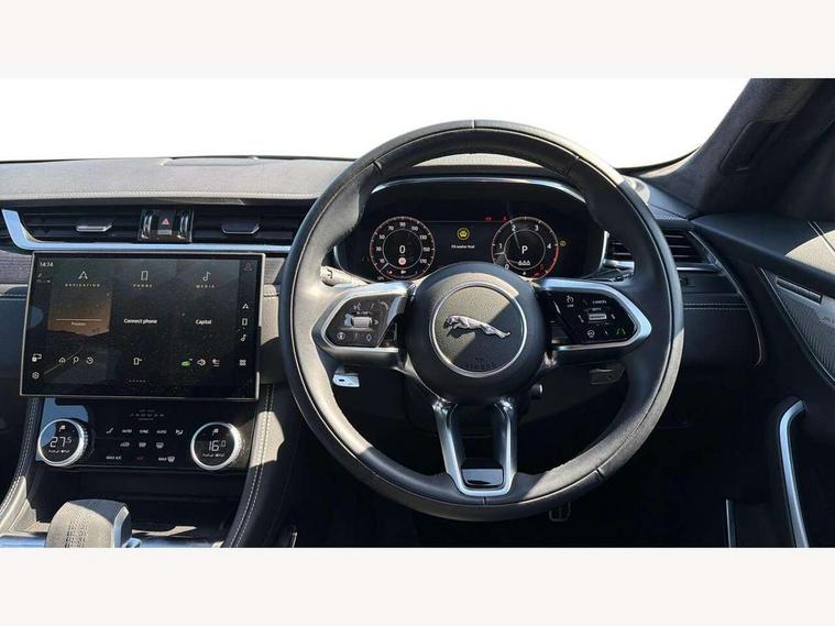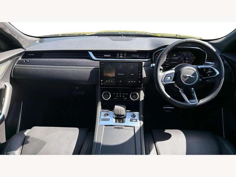 11.4" touchscreen, Adaptive cruise control with steering assist, Android Auto, Apple car play, Blind spot assist, Bluetooth connectivity, Clear exit monitor, Driver alert system, Driver condition monitor, eCall emergency call system, Eco driving style assistant, Electric power assisted steering, InControl remote, Interactive driver display digital with 12" TFT display, Jaguar Toggle shift selector, Lane departure warning system, Lane keep assist, Outside temperature gauge, Personalisation profile management, Pivi pro connected navigation system with app interface and media storage, Pro services and wifi hotspot, Push button starter, Rear collision monitor, Rear traffic monitor, Service interval indicator, Speed proportional steering, Start up sequence with movement in dials and lighting, Traffic sign recognition with adaptive speed limiter, Trip computer, Voice control system, Wireless device charging, 8 speed automatic transmission, Adaptive dynamics, All terrain progress control, All Wheel Drive (AWD), Configurable dynamics, Open differential with torque vectoring by braking, AM/FM radio, Bluetooth streaming, DAB Radio (Digital Audio Broadcasting), Dynamic volume control, InControl apps, InControl protect, iPod integration, 3 flash lane change indicators, 90th Anniversary Edition Badge, AHBA and animated directional indicators, Approach Illumination, Auto dimming rear view mirror, Automatic headlights, Electric heated/power fold memory door mirrors with approach lights and auto dimming driver side, Electric windows with one touch open/close and anti trap, F-Pace and R Dynamic badge, Green tinted glass, Heated front windscreen + heated washer jets, Heated rear window with timer, Illuminated metal tread plates with Jaguar script, Jaguar script and leaper, LED High level third brake light, LED tail lights, Metal load space scuff plates, Non acoustic front windscreen, Privacy glass (rear side windows and rear screen), R Dynamic badge on side door, Rain sensor windscreen wipers, Rear fog lights, Rear metal tread plates, Rear side wing doors, Rear wiper, Trailer stability assist, Variable front intermittent wipers, 12V power point front, 3 rear headrests, 3 seat bench in 2nd row, Additional power sockets - Two additional USB sockets in rear centre console and one 12V socket in trunk, Air distribution speed, Bright metal foot pedals, Centre armrest console, Centre console with side storage, Configurable cabin lighting, Deletion loadspace storage rails, Door sill tread plates, Ebony suede cloth headlining, Electrically adjustable steering column, Fold flat front seats, Front centre armrest with storage compartment, Front door storage space, Glovebox finisher with jaguar script, Heated steering wheel, Hooks in loadspace, Illuminated glovebox, Interior front door handles with separate locking switches, ISOFIX on outer rear seats, Jaguar sense, Leather steering wheel, Luggage tie downs in loadspace, Mist sensing, Multifunction steering wheel, Overhead lighting console, Overhead stowage for sunglasses, Passive front head restraints, Premium carpet mats, Rear air vents, Rear armrest with twin cupholders, Rear centre headrest, Rear door storage space, Reversible boot floor, Satin chrome gearshift paddles, Shopping bag hook, Single front passenger seat, Sunvisors with illuminated vanity mirrors, Twin front cupholders with cover, Online Pack with data plan - F-Pace, 380mm front brakes and 325mm rear brakes, 3x3 point rear seatbelts, ABS, All surface progress control (ASPC), Brake pad warning light, DSC - Dynamic Stability Control, Electric parking brake (EPB), Emergency brake assist, Front airbags with passenger seat occupant detector, Front and rear seatbelt reminder, Front side airbags, Full length side window curtain airbag, Hill launch assist, Power operated child locks, Traction control, Tyre pressure monitoring system, Immobiliser, Keyless entry, Keyless start, Locking wheel nuts, Perimeter alarm, Remote central locking, Valet mode,
