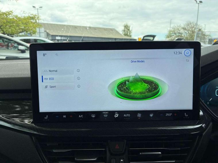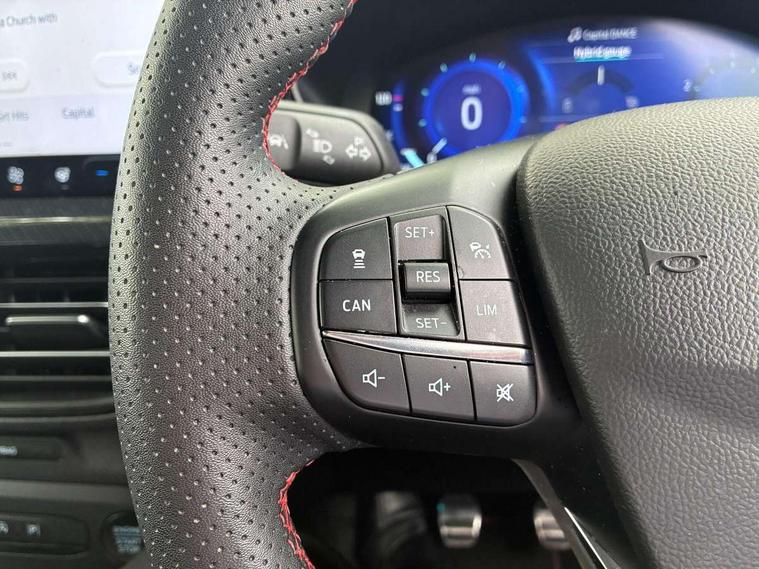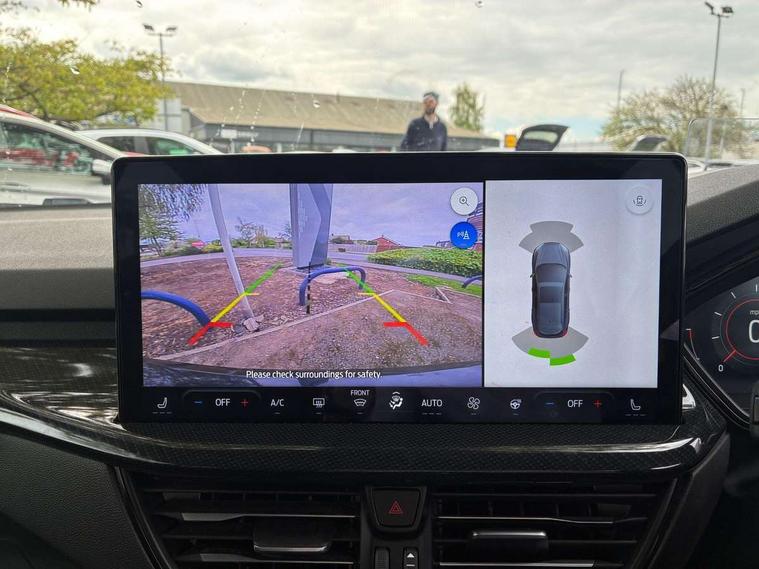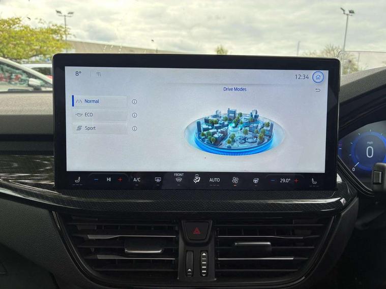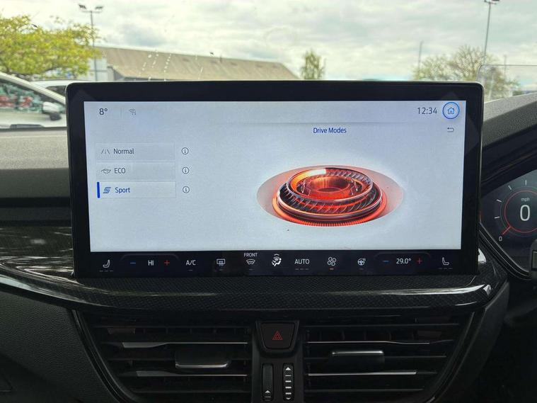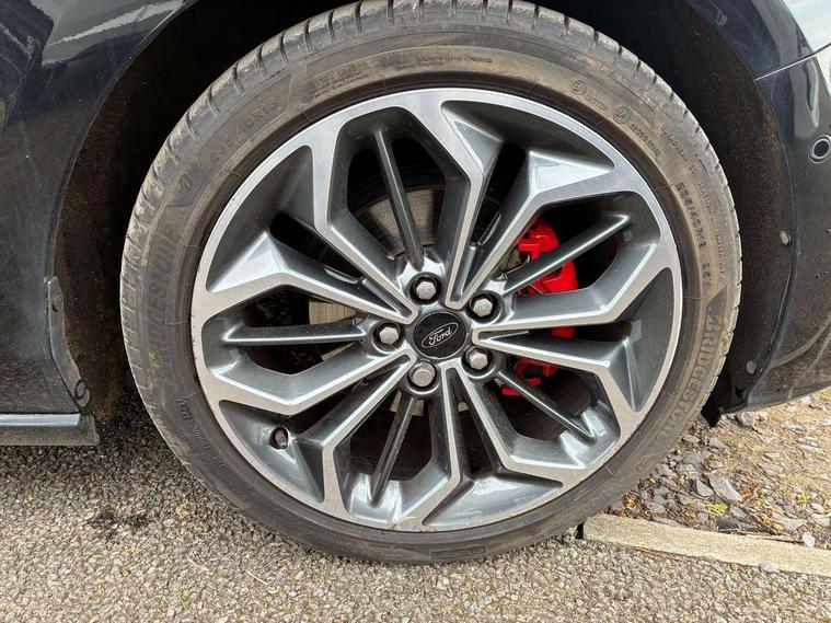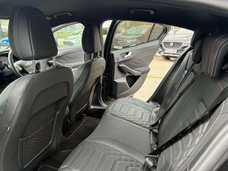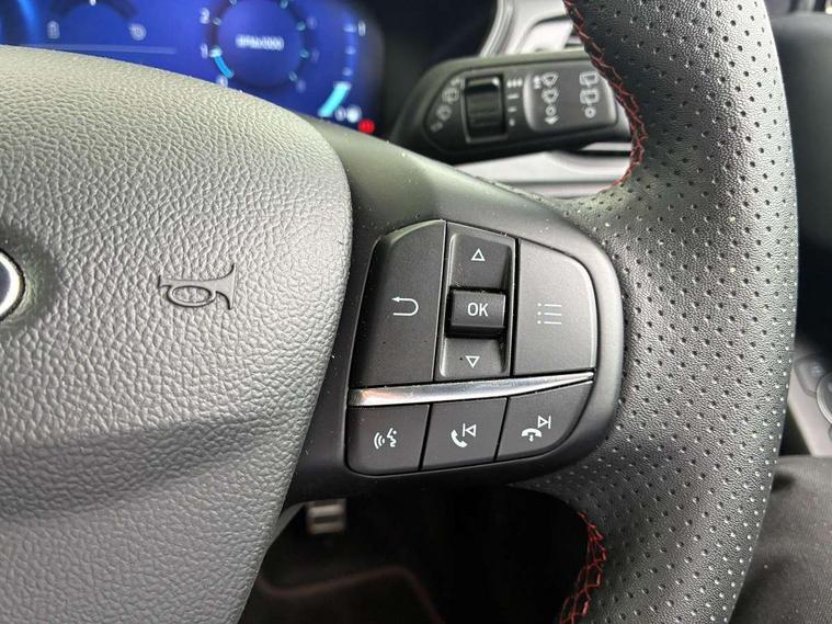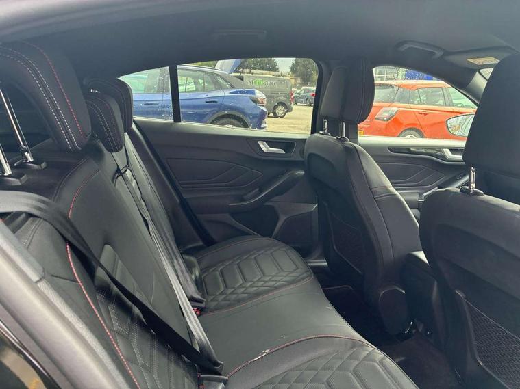 12.3" Digital instrument cluster, Bluetooth system, Digital clock, Easy fuel capless refuelling system, Eco mode, Ford SYNC4 Nav with 13.2'' touchscreen, DAB, Emergency Assistance, Apple Carplay & Android Auto, B&O Premium Audio with 10 speakers, FordPass Connect, Lane keeping system - lane keeping alert and lane keeping aid, PAS, Rev counter, Selectable drive mode, Service interval indicator, Trip computer, Wireless charging pad, Sports tuned suspension, 2 USB ports, Auto headlamps (on/off), Body coloured door handles, Electrically operated front and rear windows with one touch opening and closing, Electrically operated heated power fold door mirrors with puddle lamp with side indicators, Front variable intermittent wipers with electric wash, Heated rear window, LED daytime running lamp, LED rear lamps, LED third brake light, Polished twin tailpipe, Privacy glass, Quickclear heated windscreen, Rain sensor, Rear side wing doors, Tailgate wash/wipe, Unique ST-Line grille, full bodystyling kit, and large body coloured rear roof spoiler, 3 rear headrests, 3 seat bench in 2nd row, Dual zone electronic air temperature control, Full sensico premium upholstery, Height adjustable front headrests, Isofix child seat preparation, Load through ski hatch, Manual 2-way passenger seat adjust, Power 4-way driver seat adjust, with power lumbar adjust, Reach + rake adjustable steering column, Single front passenger seat, ST-Line Design pack - Focus, Winter pack - Focus, 3x3 point rear seatbelts, ABS+Electronic Brake force Distribution, Auto hold function, Driver airbag, EDL traction control, Electronic parking brake, Electronic stability control, Front and rear seatbelt reminder, Front inertia reel height adjustable seatbelts with pre-tensioners, Front passenger airbag, Front side airbags, Passenger airbag deactivate switch, Post collision braking, Pre collision assist with autonomous emergency braking and pedestrian/cyclist detection, Remote/power child rear door locks, Side curtain airbags, Three rear inertia reel lap/diagonal seatbelts, Tyre pressure monitoring system, Keyless entry and keyless start, MyKey system, Remote central locking & engine immobiliser, Thatcham alarm with power door dead locks, 18" 5x3 spoke pearl grey high gloss machined finish alloy wheels with mini spare wheel,