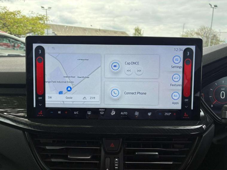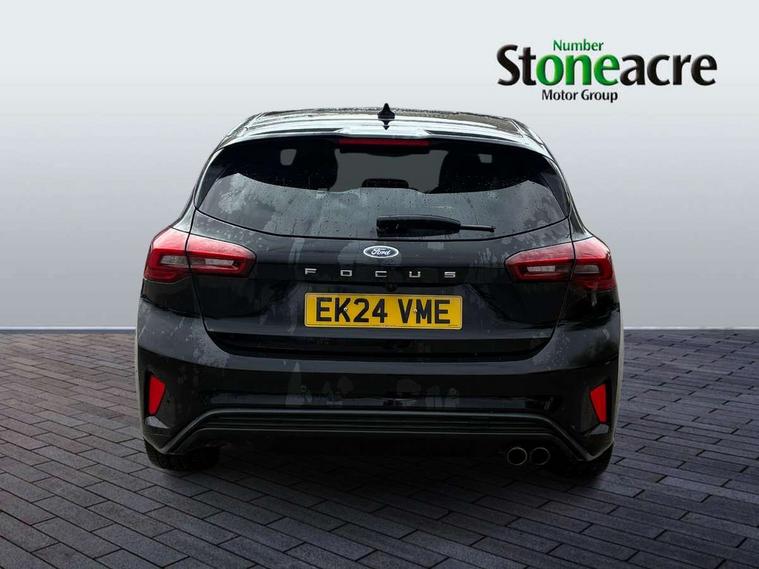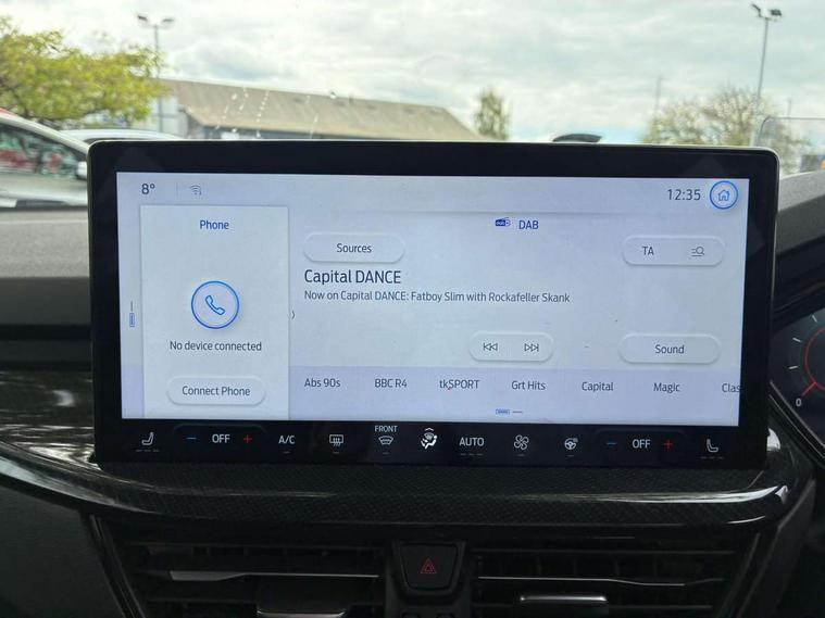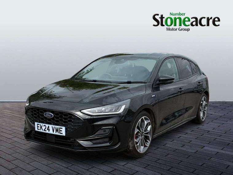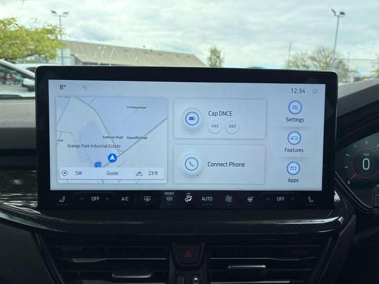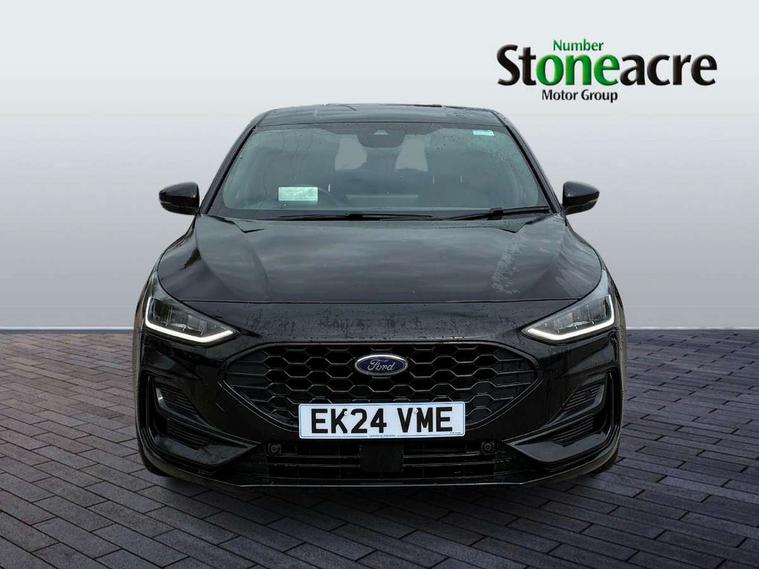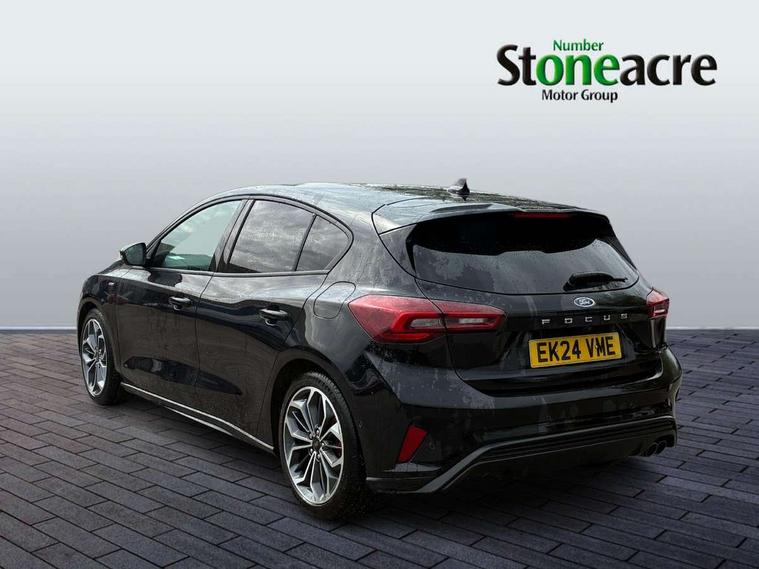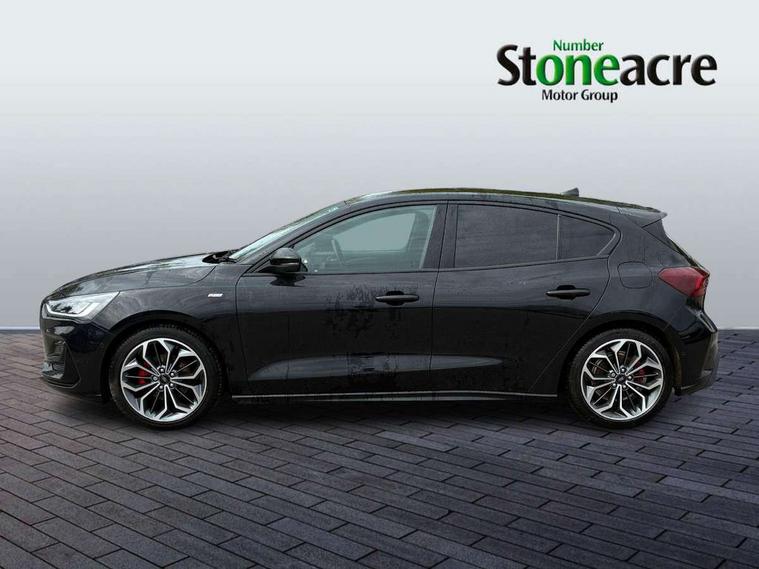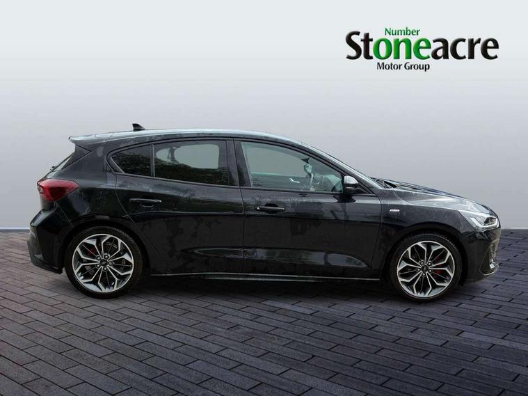 12.3" Digital instrument cluster, Bluetooth system, Digital clock, Easy fuel capless refuelling system, Eco mode, Ford SYNC4 Nav with 13.2'' touchscreen, DAB, Emergency Assistance, Apple Carplay & Android Auto, B&O Premium Audio with 10 speakers, FordPass Connect, Lane keeping system - lane keeping alert and lane keeping aid, PAS, Rev counter, Selectable drive mode, Service interval indicator, Trip computer, Wireless charging pad, Sports tuned suspension, 2 USB ports, Auto headlamps (on/off), Body coloured door handles, Electrically operated front and rear windows with one touch opening and closing, Electrically operated heated power fold door mirrors with puddle lamp with side indicators, Front variable intermittent wipers with electric wash, Heated rear window, LED daytime running lamp, LED rear lamps, LED third brake light, Polished twin tailpipe, Privacy glass, Quickclear heated windscreen, Rain sensor, Rear side wing doors, Tailgate wash/wipe, Unique ST-Line grille, full bodystyling kit, and large body coloured rear roof spoiler, 3 rear headrests, 3 seat bench in 2nd row, Dual zone electronic air temperature control, Full sensico premium upholstery, Height adjustable front headrests, Isofix child seat preparation, Load through ski hatch, Manual 2-way passenger seat adjust, Power 4-way driver seat adjust, with power lumbar adjust, Reach + rake adjustable steering column, Single front passenger seat, ST-Line Design pack - Focus, Winter pack - Focus, 3x3 point rear seatbelts, ABS+Electronic Brake force Distribution, Auto hold function, Driver airbag, EDL traction control, Electronic parking brake, Electronic stability control, Front and rear seatbelt reminder, Front inertia reel height adjustable seatbelts with pre-tensioners, Front passenger airbag, Front side airbags, Passenger airbag deactivate switch, Post collision braking, Pre collision assist with autonomous emergency braking and pedestrian/cyclist detection, Remote/power child rear door locks, Side curtain airbags, Three rear inertia reel lap/diagonal seatbelts, Tyre pressure monitoring system, Keyless entry and keyless start, MyKey system, Remote central locking & engine immobiliser, Thatcham alarm with power door dead locks, 18" 5x3 spoke pearl grey high gloss machined finish alloy wheels with mini spare wheel,