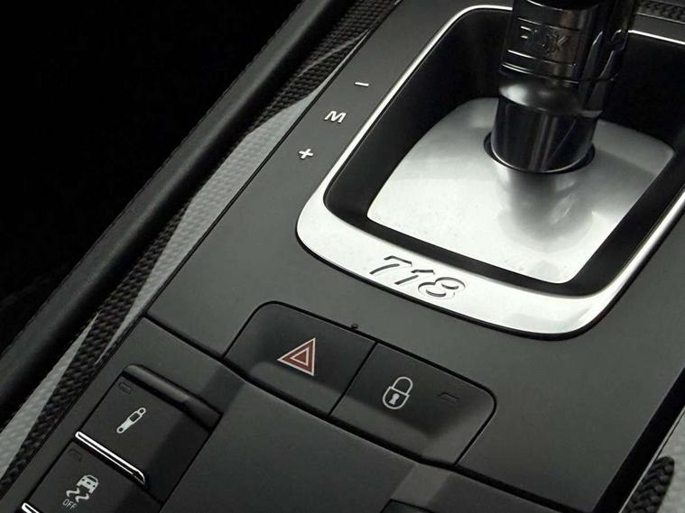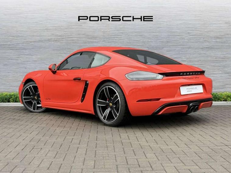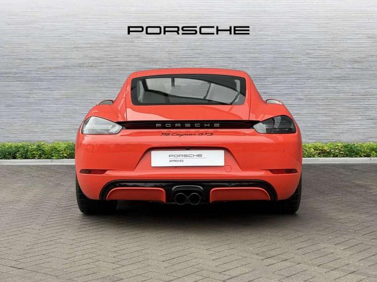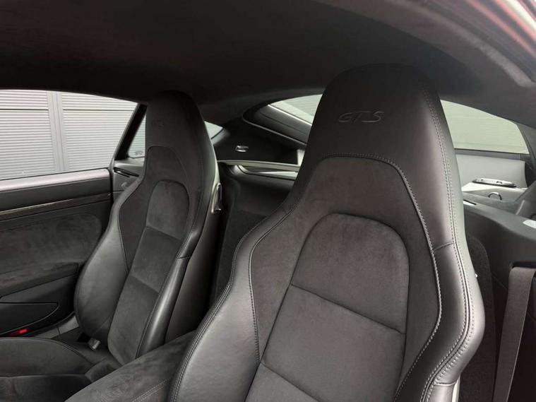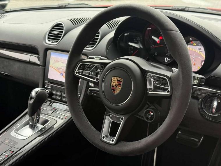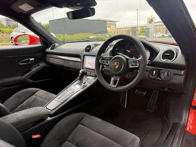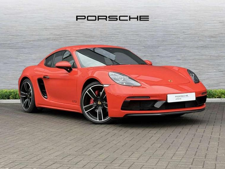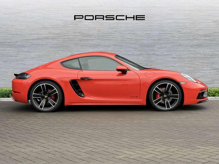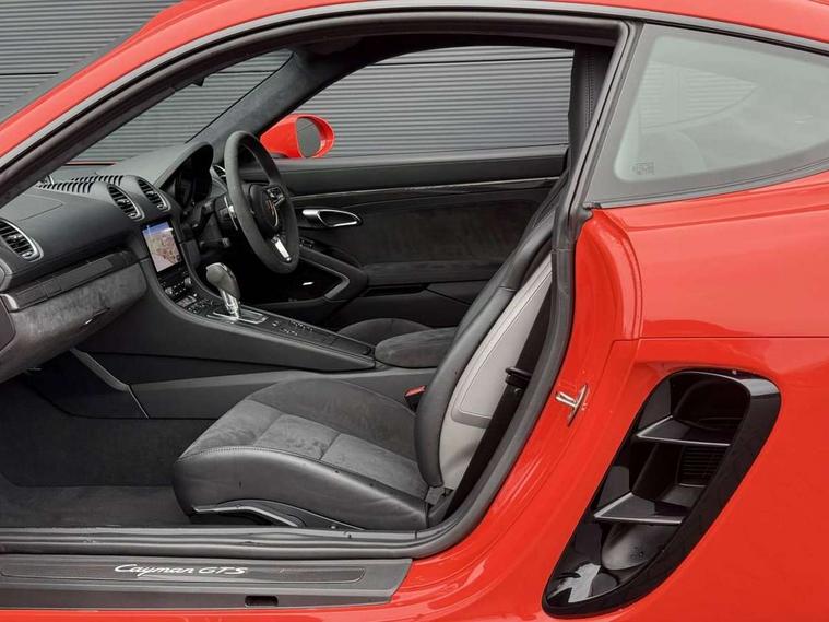 Connect Plus, Apple CarPlay, telephone module, wireless internet access, carfinder, remote vehicle status, remote service, vehicle track, Digital displays for vehicle speed, chosen gear, odometer, trip odometer and clock, Instrument cluster with central rev counter and high-resolution 4.6 inch colour display, Porsche Communication Management (PCM) including online navigation module, mobile phone preparation, audio interfaces and voice control system, 64 litre fuel tank, Gasoline particulate filter, Porsche Doppelkupplung (PDK), Porsche Stability Management (PSM), ABS with extended brake functions, Porsche TORQUE Vectoring (PTV) with mechanical rear differential lock, Turbocharger with variable turbine geometry (VTG) and intercooler, VarioCam Plus variable valve timing and switchable valve lift, DAB Digital radio, Integrated compatible SIM including Porsche Connect Services, Wifi and music streaming, Aerodynamic wipers, Automatic headlight activation including welcome home lighting, Automatically extending rear spoiler, Black model designation on doors, Body colour bumpers, Electrically adjustable heated exterior mirrors on door waist rails, aspherical on driver's side, Green tinted heat insulating glass, GTS front apron partially painted in black, GTS rear apron partially painted in black, Intelligent lightweight body in Aluminium/Steel composite construction, LED taillights and integral 4 point brake lights and reversing lights, Painted Porsche logo and model designation, Power windows with one touch operation and door seal protection, Separate auxiliary lights in the front end with LED indicators and position lights, Top tinted windscreen, Twin tract sports exhaust system with black central twin tailpipe in stainless steel, Wide opening rear hatch with heated screen, Windscreen washer system with two wiper speeds and washer jets, 12V sockets in passenger footwell and centre console storage compartment, Adjustable fan with air recirculation and defroster functions, Clothes hooks on front seat backrests, Door sill guards with model designation logo, Elevated centre console with uncovered storage compartment and closed storage compartment, Front and rear luggage compartments, Front centre console storage box, GT alcantara sports steering wheel and PDK gear selector, LED reading lights, orientation, ignition lock, additionally luggage compartment and glove compartment lighting, Lockable glovebox, Smooth finish leather on steering wheel rim, gear lever and door handles, Storage compartments in each doors, Three way catalytic converter and on board diagnostics for monitoring emission control system, Two individual cup holders (integral to dashboard trim strip), Sport chrono package including mode switch - Cayman, Electrically controlled parking brake, Front and rear 4 piston aluminium monobloc fixed calipers, discs internally vented and cross drilled, front/rear disc diameter, brake calipers in red, Front and rear lightweight spring strut axle, Full size driver and passenger airbags, Porsche side impact protection doors with thorax airbag in outer backrest side bolster and head airbag for driver/passenger in door panel, Tyre pressure monitoring system, Alarm system with interior surveillance, Anti-theft wheel bolts, Auto start/stop function including coasting (in connection with PDK), Engine immobiliser with in key transponder, central locking and remote control, Tyre sealing compound and electric air compressor kit,