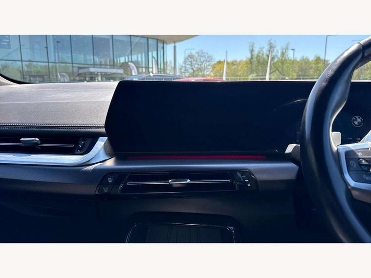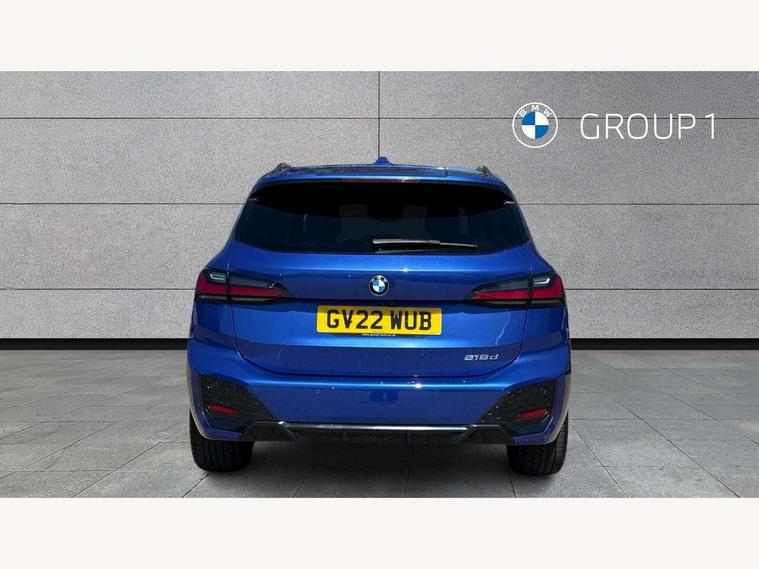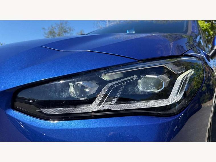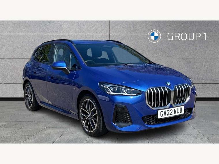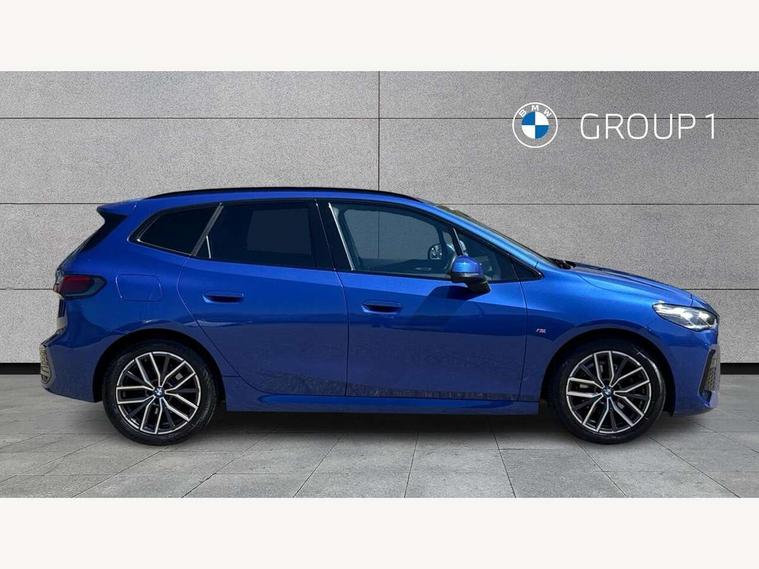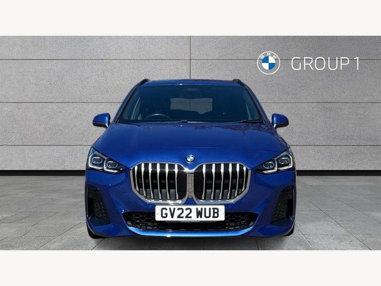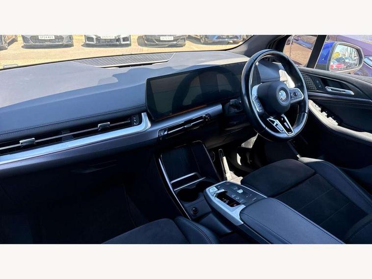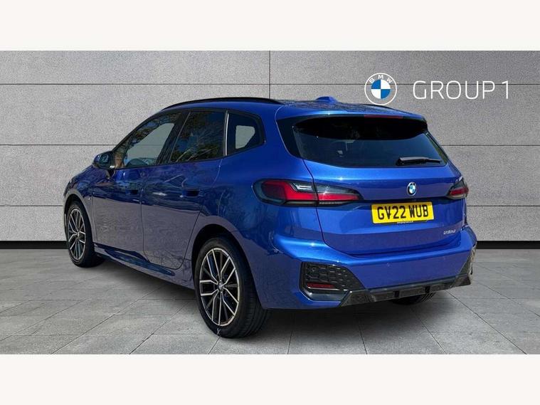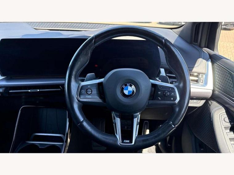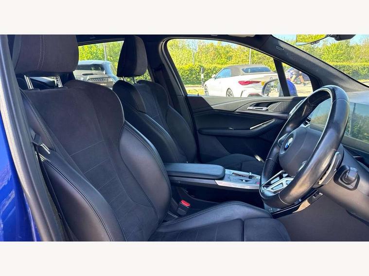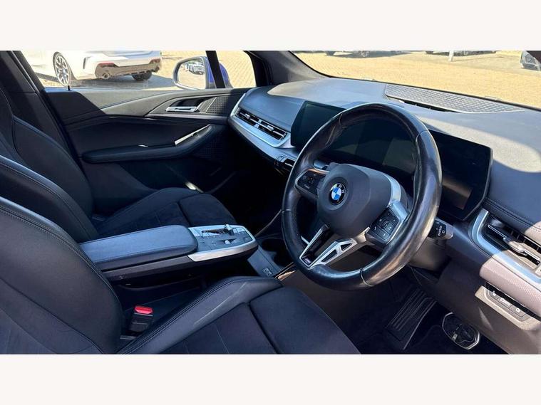 Active Guard incl speed limiting and lane departure functions with auto steering, and front collision warning with brake intervention, Automatic powered tailgate, Automatic start/stop function, BMW Online services, BMW Teleservices, Brake pad wear indicator in front and rear, Condition based service, Drive off assistant, Flat air vents on instrument panel in high gloss black, adjustable slats with elements in pearl chrome, iDrive controller, Language version English, On board computer - average speed+fuel consumption, service interval, clock/date, odometer/trip meter, outside temperature display and ice warning, Parking assistant with active park distance control, reversing assistant, lateral parking aid and rear view camera, Servotronic variable electric power steering (EPS), Smartphone integration, Widescreen display, Diesel particulate filter, Diesel with SCR emission control system, Drive performance control with ECO PRO comfort + sport mode, Gear selector switch with toggle operation, M Adaptive suspension, Steptronic sport transmission with double clutch and gear shift paddles, 2x USB Type C ports in front centre console for charging and data transfer, 2x USB Type C ports in rear centre console for charging, DAB Digital radio, Welcome sound upon opening of the front driver or passenger door, Air inlet middle part on front apron in lines specific design with trim strip in satinised aluminium, Automatic headlights, BMW emblem, engine compartment lid and tailgate, Body colour roof mouldings, Body coloured door mirror caps, Contoured rear roof spoiler in vehicle colour with side aeroblades in black high-gloss, Driver side exterior mirror lighting with BMW logo projection, Dynamic brake lights, Electric adjustable heated door mirrors, Electric windows - front and rear, with open/close fingertip control, anti-trap facility and comfort closing, Folding door handles integrated flush with surface, Front and rear windscreen wipers with heated front washer nozzles, Front bumper cover with independent design in body colour with inserts in black high gloss, Front bumper design elements in satinised aluminium, Front door exit lights, Front door sill finishers aluminium inserts with M inscription, Front entry sills with aluminium inserts + BMW inscription, Front oramental grille with radiator grille bars in satinised aluminium, Heated rear window, Hidden exhaust pipe, High gloss shadow line, High gloss shadowline roof rails, Key with M identification, LED Daytime running lights and parking lights with turn indicators, LED number plate light, LED third brake light in rear spoiler, M identification on sides, Manual headlight range control, Model inscription on right tailgate, Rain sensor, Rear bumper cover with independent design in body colour with inserts in black high gloss, Rear bumper trim strip in satinised aluminium, Rear side wing doors, Shark fin antenna, Side sill covers with independent design in Body colour, Trailer stabilisation logic, Trims on front and rear bumper covers colour-coordinated with side window graphic, Visible VIN plate, Welcome lighting, Window washer nozzle for rear view camera, 12V socket in right side trim panel, 2 bag hooks in luggage compartment, 2 front reading lights, 2 open cup holders in front centre console, 2x 12V power socket in luggage compartment and front centre console, 3 seat bench in 2nd row, 40:20:40 split folding rear seat backrests, Ambient lighting front and rear, Automatic two zone climate control air conditioning, Bottle trays in all doors, Child seat ISOFIX attachment for two outer rear seats and front passenger seat with anchorage points, Driver and front passenger sports seats, Four grab handles integrated in roof lining, Front and rear door pockets, Front and rear footwell lighting, Front and rear side armrest integrated into door trim, Front centre console storage compartment, Front head restraints, Glovebox with light, Heated front seats, Height adjustable 3 rear head restraints, Interior door handle recess light on all doors, Luggage compartment lighting, M Anthracite headlining, M specific floor mats, M sport leather steering wheel, Map pockets, Mechanical rear seats with fore/aft adjustment, Multi-function controls for steering wheel, One piece parcel shelf opens together with tailgate and removable, Rear cloth hooks, Single front passenger seat, Sliding rear seat bench, Stainless steel pedals, Steering wheel column manual adjustment, Storage compartment lighting in centre console and storage tray in centre stack, Storage compartment net in left side trim panel, Storage compartment with folding cover under centre console armrest cushion, Storage tray in right side trim panel, Sunvisors with illuminated vanity mirrors, Three spoke sport leather steering wheel, Connected pack professional - 2 Series Active Tourer, Technology pack - 2 Series Active Tourer - MY22, 3 point seatbelts on all seats, front pyrotechnic belt tensioners, stopper and belt force limiters, rear coded belt buckles, Airbag - Front driver and passenger, front and rear head, front side, curtain head protection, manual deactivation of front passenger airbag possible, Anti lock braking system (ABS) with brake assist, Automatic hold function, BMW emergency call, Brake drying, Braking readiness, Child proof locking system in rear door, Cornering brake control, Crash Sensor - activates hazard/interior lighting + unlocks doors, DSC - Dynamic Stability Control, Dynamic brake control, Dynamic Traction Control - DTC, Electromechanical parking brake, Energy recovery system, Front disc brakes, Integrated braking system, PC iBrake PostCrash approach control warning with light braking function, Rear disc brakes, Tyre pressure monitoring system, Warning triangle and first aid kit, Anti theft alarm system, Closing system with central locking, Engine immobiliser, Locking wheel bolts, Front centre console trim in high gloss black with my mode expressive, Reduced rolling resistance tyres,