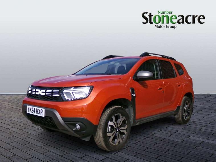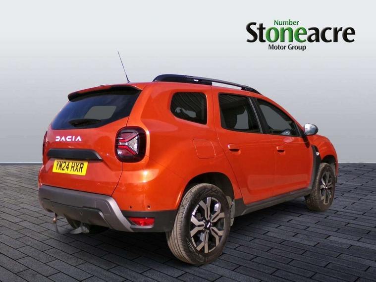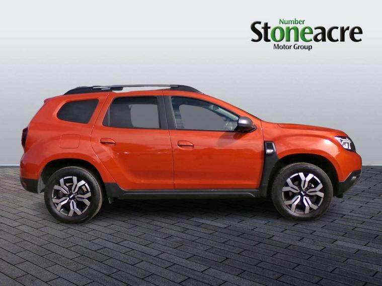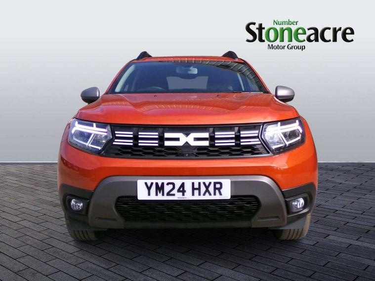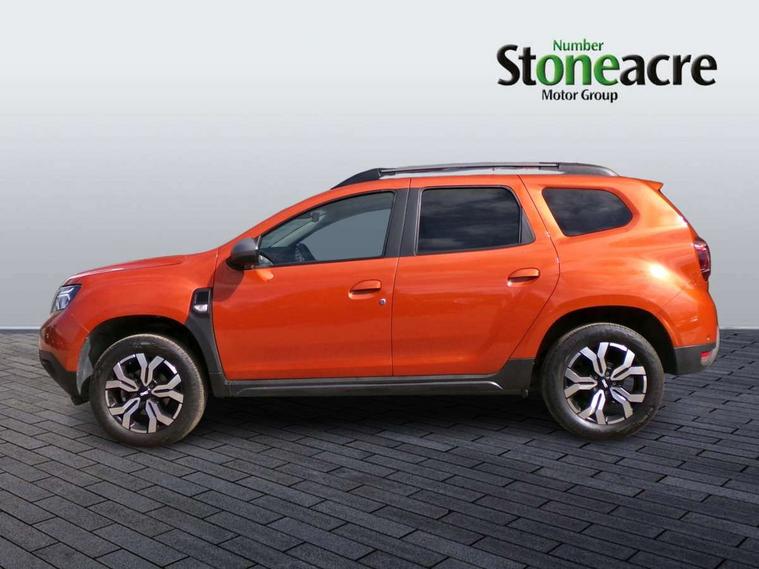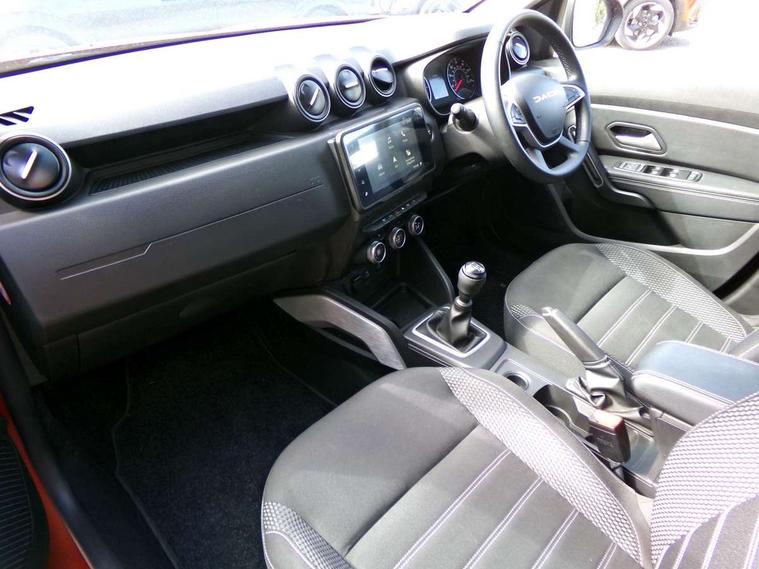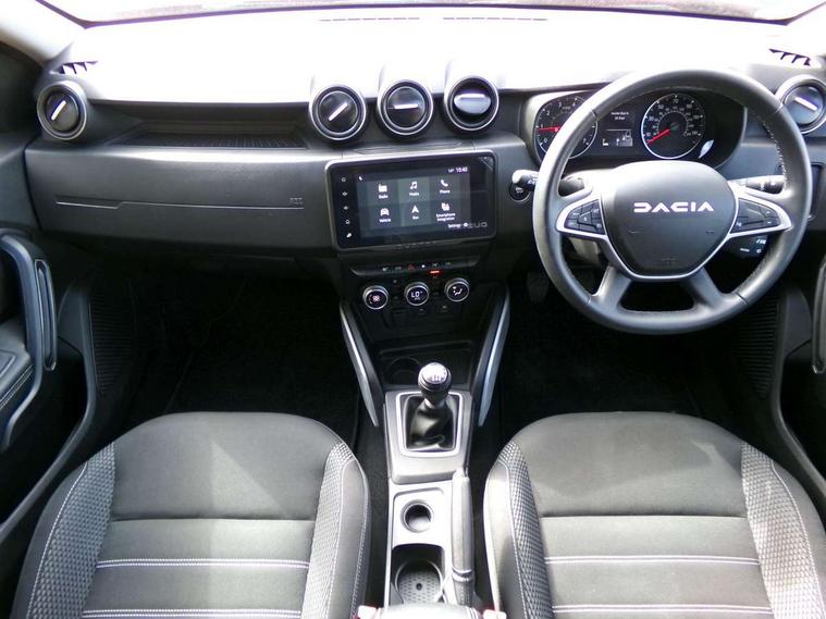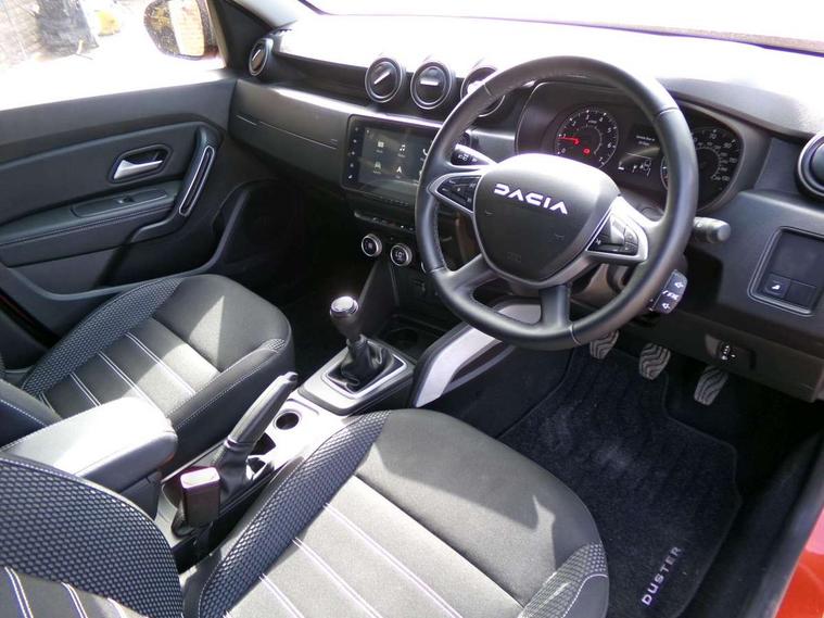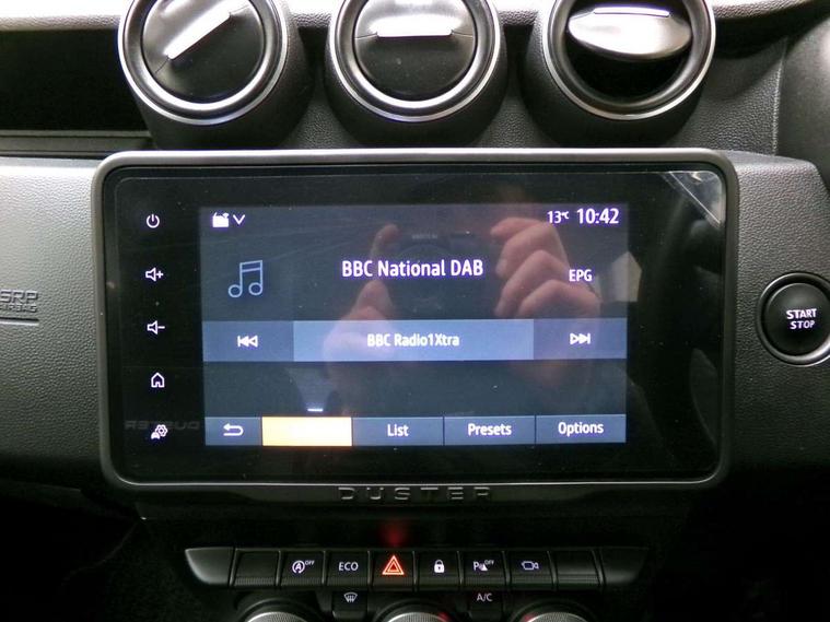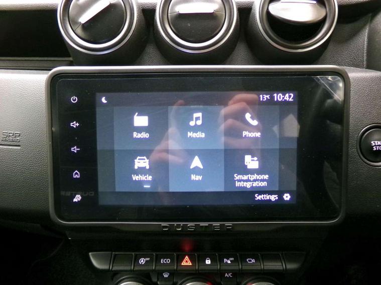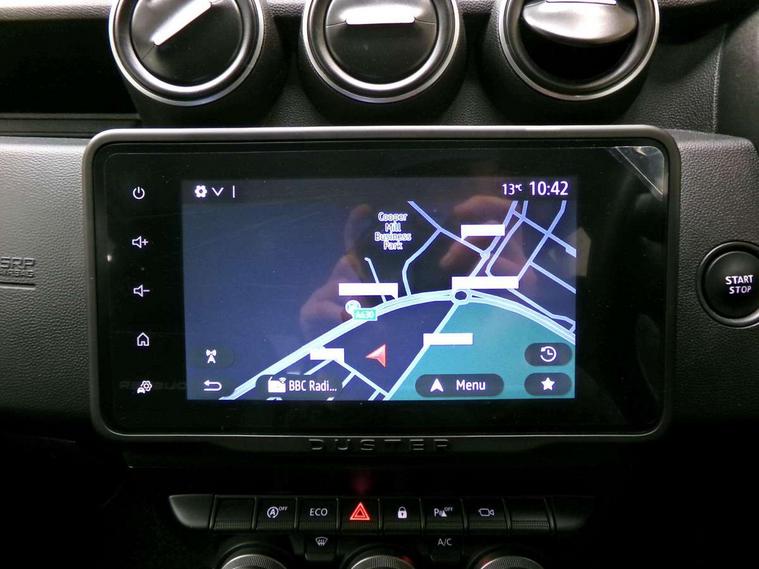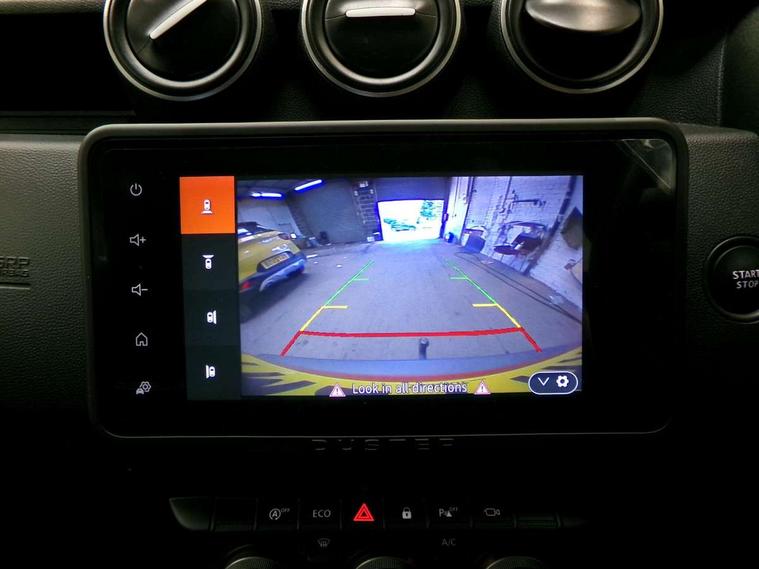 Blind spot warning, Cruise control and speed limiter, eCall emergency system, Eco mode, Electric power assisted steering, Multi view camera, On board computer, odometer, trip computer, average fuel consumption, average speed, service indicator, outside temperature gauge, Rear parking sensors, Rev counter, Reversing camera, Stop/start system, 8" Media Navigation with wireless smartphone replication, Dacia plug and radio/MP3/USB/bluetooth/DAB/steering wheel control, 3 speed windscreen wipers, Acoustic windshield, Automatic front wipers, Black side sills, Black/satin chrome tailgate trim with Duster inscription in black background and lettering, Body coloured door handles, Chrome front grille with hot stamping, Chrome logo surround on steering wheel, Dark glass on lateral rear windows, Daytime running lights, Drivers window one touch up/down, Dusk sensor, Electric adjustable/heated door mirrors, Electric folding door mirrors, Electric front windows, Electric rear windows, Front and rear body coloured bumpers, Front door sill protection strip, Front fog lights, Grey quartz longitudinal roof bars with Duster inscription, Heated rear window, High level third rear brake light, Modular roof bars, Rain sensor, Rear side wing doors, Rear spoiler, Rear wash/wipe, Satin chrome door mirrors, Underbody protection skid plates, Y shaped LED headlights with rear LED lights, 3 rear height adjustable headrests, 3 seat bench in 2nd row, 60/40 split folding rear seat, Automatic air conditioning, Backlighted steering wheel buttons, Boot light, Driver seat lumbar adjustment, Fabric decorative insert on door panels, Fabric upholstery, Front head restraints, Front passenger reading light, Gear shift indicator, Glovebox light, Heated seats, Height adjustable driver seat, Height adjustable front and rear headrests, Height and depth adjustable steering wheel, High centre console with driver armrest, Isofix points for child seats in both outer rear seats, Map pocket on front seat backs, Passenger sunvisor with vanity mirror, Rear passenger reading light, Satin chrome gear lever cap insert, Satin chrome interior door handles, Satin chrome lower steering wheel insert, Single front passenger seat, Soft feel leather steering wheel, 3x3 point rear seatbelts, ABS and Emergency brake assist, ASR traction control with Electronic stability control, Child locks on rear doors, Door open visual and audible warning, Driver airbag, Driver and passenger seatbelt not fastened - visual and audible warning, EBD - Electronic brakeforce distribution, Front passenger airbag, Front passenger airbag deactivation, Front seatbelt pretensioners, Front side airbags, Height adjustable front seatbelts, Hill start assist, Tyre pressure monitor, Keyless entry, Remote central locking, Thatcham approved engine immobiliser, Charcoal grey central console surround, Matt black central console fascia, Matt black decorative insert on rear door panels, Piano black decorative insert on front door panels, Satin chrome air vent surround, Satin chrome instrument dial surrounds, 17" Alloy wheels,
