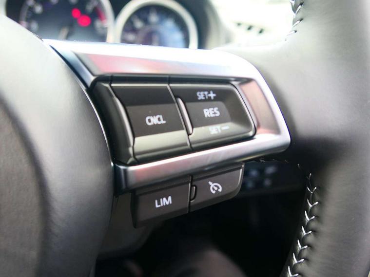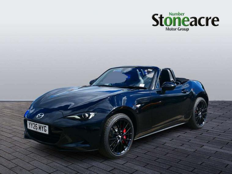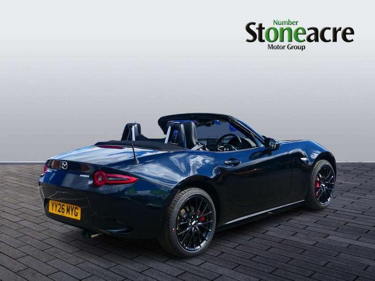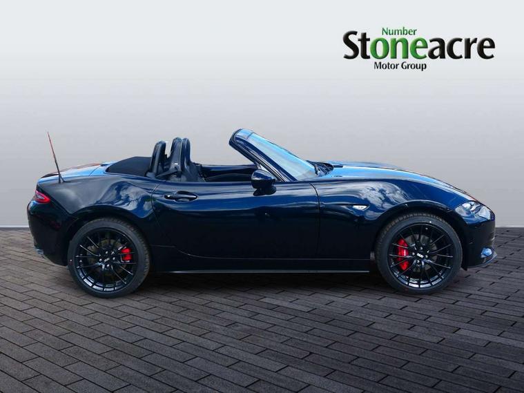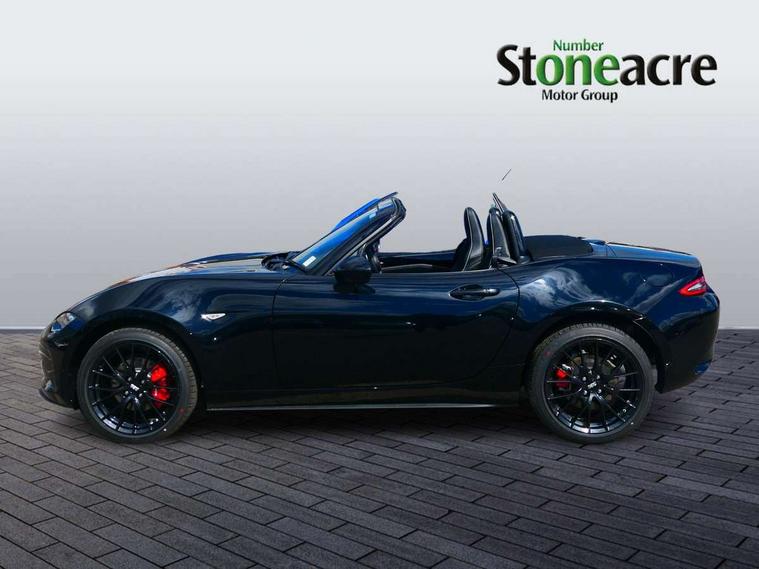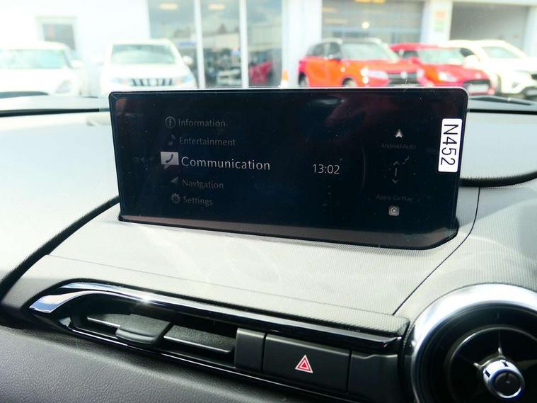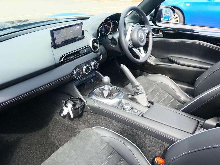 8.8" Colour centre touch screen display with Mazda Connect infotainment, Aha and stitcher app, Analogue speedometer, Apple car play/Android Auto, Blind spot monitoring with rear cross traffic alert, Cruise control with Intelligent speed assist, Driver alert system, eCall emergency call system, Emergency stop signalling system, Engine start/stop button, Hands free phone preparation, Integrated bluetooth with hands-free calling, bluetooth audio and easy access to phone contacts, Integrated navigation system, Kinematic posture control, Lane departure warning system, Lane keep assist, Multi dot display tachometer and electric odometer, PAS, Rear parking sensor, Reversing camera, Service indicator, Traffic sign recognition, Trip computer, Water temperature gauge, Asymmetric limited slip differential, I-ELOOP, i-stop, Sports suspension featuring Bilstein dampers, 2 x USB Type-C inputs, Multimedia Commander including separate volume dial, Premium Bose sound system with 9 speakers with 2 in each front headrest, AM/FM/DAB radio and MP3, Steering wheel mounted audio/bluetooth controls, Adaptive LED Headlights, Automatic headlamp levelling, Body colour bumpers, Body colour co ordinated interior upper door trim, Coming/leaving home lighting function, Dual exhaust pipes, Dusk sensitive headlamps, Electric front windows/one touch facility, Frameless auto dimming rear view mirror, Front intermittent wipers, LED 3rd brake light, LED daytime running lights, LED indicator lights, LED rear lights, Manually operated black premium cloth soft top with heated rear glass window, Piano black electric/heated door mirrors, Piano Black fashion bars, Rain sensing front wipers, Rear boot, Stainless steel scuff plates with MX-5 logo, 12V socket, Alcantara/leather upholstery, Centre console storage box, Chrome Air conditioning dials, Climate control air conditioning, Coin Box, Driver and front passenger sunvisors with covered vanity mirror and driver ticket holder, Driver seat manual slide, recline and tilt adjustment, Front centre armrest, Front head restraints, Gear shift indicator, Heated front seats, in 3 heat levels, Interior courtesy light, ISOFIX front passenger seat child seat compliance, Leather gear knob, Leather handbrake lever, Leather steering wheel, Lockable rear centre box with lid, Passenger seat + manual slide/recline adjust, Recaro sports seats, Single front passenger seat, Strut brace, Tilt/telescopic steering column, Two cupholders, Windblocker, 3 point ELR front seatbelts with pretensioners, ABS+Electronic Brake force Distribution, Deployable Hood System (DHS), Driver and passenger seatbelt reminder audible warning, Dynamic stability control with track mode, Exit warning, Front dual stage driver and single stage front passenger airbags, Front smart city brake support with autonomous emergency braking (SCBS), Hill hold assist, Passenger airbag deactivate switch, Red brembo brake callipers, Side airbags, Smart city brake support - Rear (SCBS-R), Traction control, Tyre pressure monitor, Remote central locking with deadlocking and remote boot release, Smart keyless entry, Superlocking, Thatcham category 1 alarm + immobiliser, Centre Console - Vinyl leather, Chrome air vent surrounds, Dashboard panel - Black Vinyl, Exterior body colour co-ordinated upper door panel trim with black vinyl, 17" BBS Gun Metallic alloy wheels, Tyre puncture repair kit,