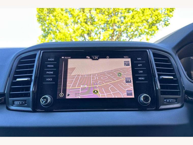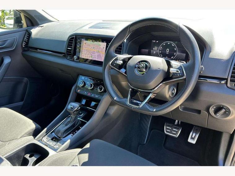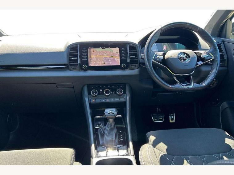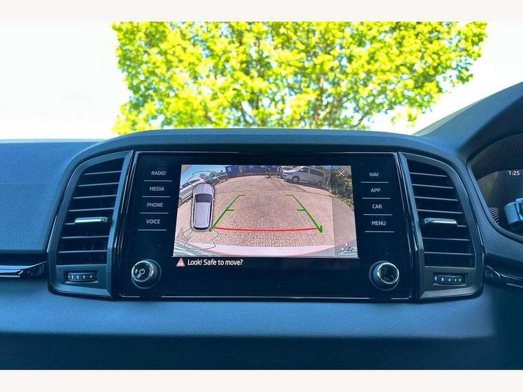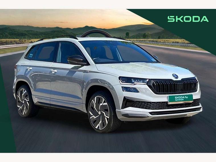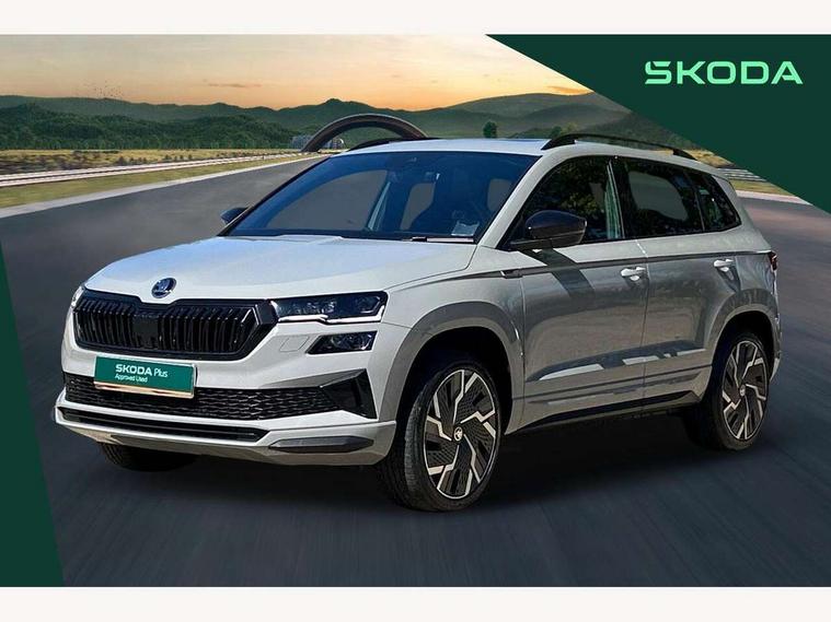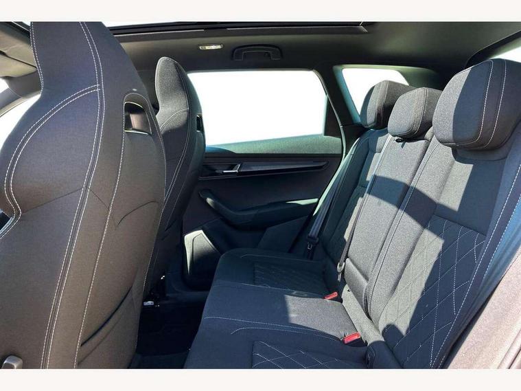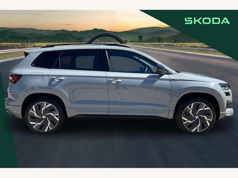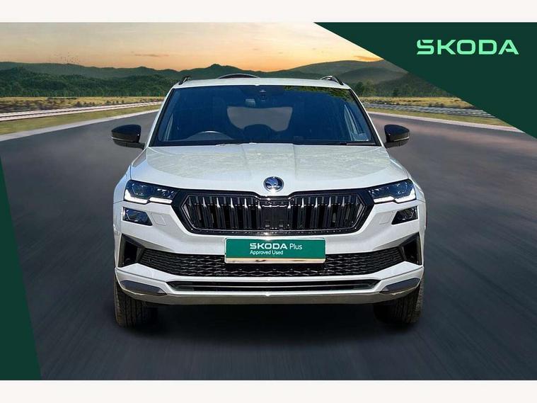 8" Digital display, Care connect, Driver fatigue sensor, Emergency services call system, Outside temperature gauge, Service interval indicator, SmartLink wireless for Apple and wired for Android, Start/stop system with regenerative braking, USB C Port x 2 in front centre console, Virtual cockpit, Virtual pedal with electrically operated boot door, 8 Speakers, DAB radio with Bluetooth, USB connection, Acoustic glass, Aero front windscreen wipers with intermittent function, Auto dimming rear view mirror with light and rain sensors, Black door mirrors, Black electric window control buttons, Black radiator grille, Black roof rails, Body colour door handles, Dynamic headlight range control with cornering light function, Electric front and rear windows with child proof lock, Front door steps with SportLine logo, Heated rear windscreen, LED daytime running lights, LED rear lights with high functionality welcome effect and dynamic indicators, Light assistant (coming/leaving home/tunnel light), Panoramic sliding sunroof, Plastic scuff plates, Privacy glass, Protective door side sills in body colour, Rear diffuser, Rear side wing doors, Rear spoiler, Rear window wiper with washer system and intermittent control, Safety reflectors on front doors, Skoda lettering on tailgate in black, Sportline badge on front fender, Sportline decorative inserts with badging, Sports front and rear bumpers, 1.5 litre bottle holders in driver and front passenger door panels, 12V socket in boot, 12v socket in front centre armrest with storage compartment and rear air vents, 2 Folding hooks and nets in boot, 3 rear height adjustable headrests, 3 seat bench in 2nd row, 3 spoke leather sports multifunction steering wheel and silver stitching with gear shift paddles, 4 foldable roof handles with rear coat hooks, Black floor carpet, Black roof headlining, Chrome inner door handles, Double sided boot floor, Foldable hooks in the boot, Front head restraints, Height adjustable front three point seats belts with tensioners, Height/reach adjust steering wheel, Ice scraper, Illuminated glovebox, Illuminated luggage compartment, Interior noise suppression, Isofix child seat preparation outer rear, Manual lumbar support for front seats, Pen holder, Pollen filter, Rear boot cover, Rear reading lights, Rear seats fixed folding and divided 60:40, Rubbish bin door, Safety vest holder, Single front passenger seat, Storage box in upper central dashboard closed, Sunvisors with illuminated vanity mirrors, Textile floor mats, Ticket holder, Titan black interior ceiling, Welcome animation with sportline logo, Light Pack - Karoq, Parking pack - Karoq, Automatic door unlocking in case of crash, Automatic fuel cut off in case of crash, Child locks on rear doors, Driver airbag, Electronic parking brake with auto hold function, Emergency rear braking signal, ESC including ABS, MSR, ASR, EDS, HBA, DSR, RBS, MKB and traction control, Front side airbags, Hill hold control, Knee airbags, Passenger airbag with switch-off function, Pedestrian monitor, Seatbelt reminder signalisation and pretensioner for all seats, Three point seatbelts rear, Two tone horn, Tyre pressure display, Tyre pressure monitor, Alarm with interior monitoring, back up horn and tilt sensor with safe function, Electronic engine immobiliser, Keyless entry and start/stop, Remote central locking with 2 remote folding keys, Black air vent surround, Black centre console, Satin black dashboard, Satin black door trim, 19" Vega black polished alloy wheels, Anti-theft wheel bolts protection, Matt black aero hub caps, Storage on wheel cover, Tool kit,