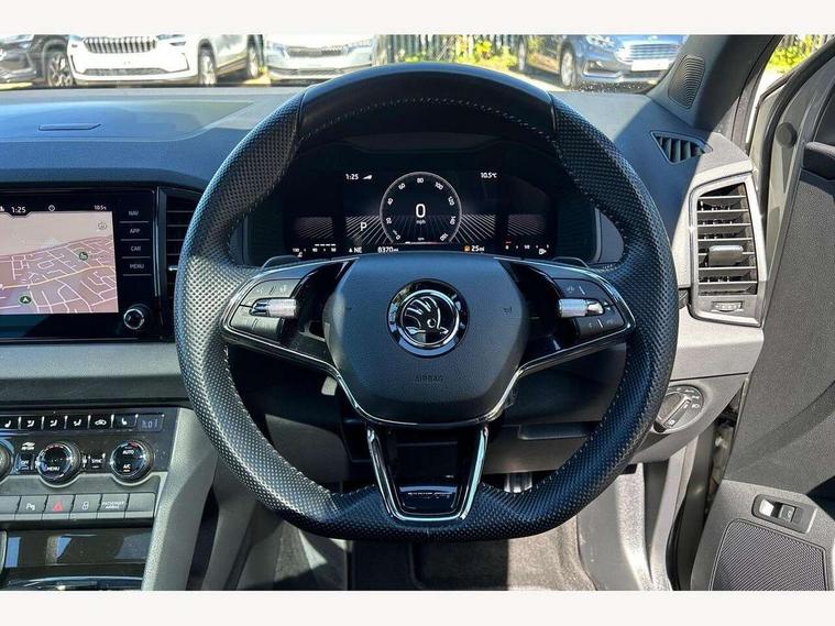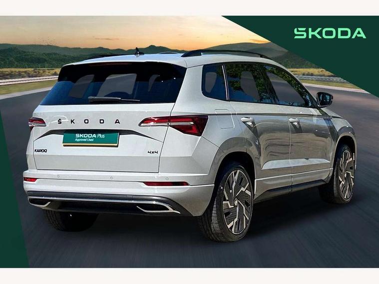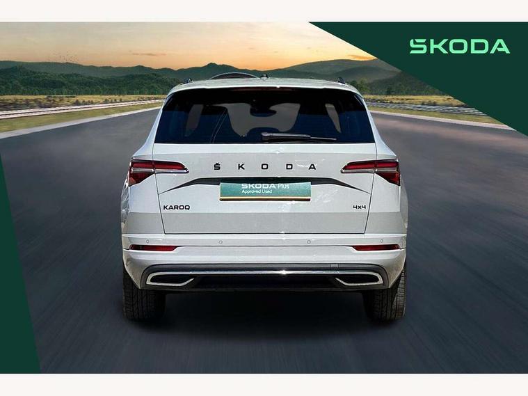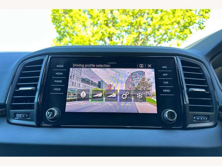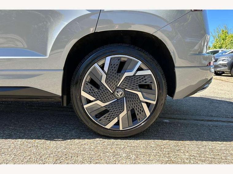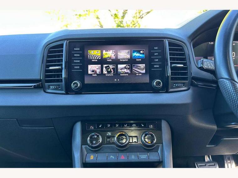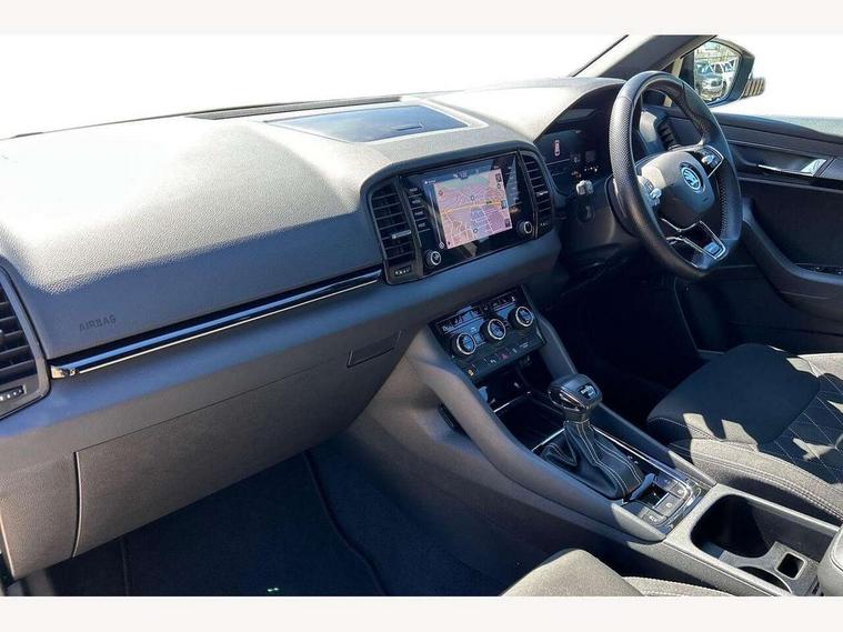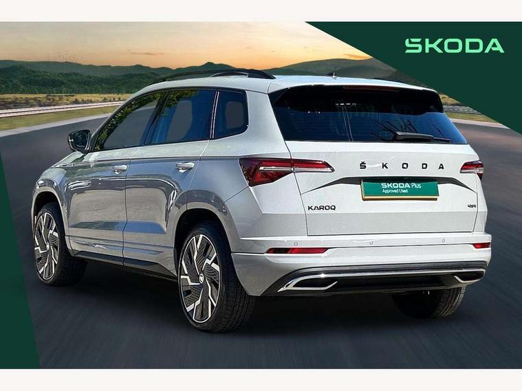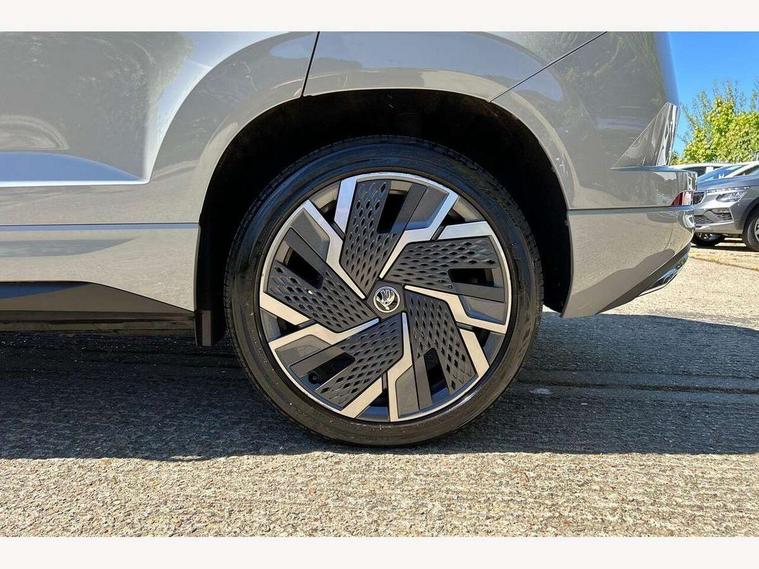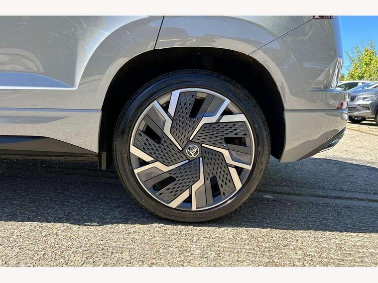 8" Digital display, Care connect, Driver fatigue sensor, Emergency services call system, Outside temperature gauge, Service interval indicator, SmartLink wireless for Apple and wired for Android, Start/stop system with regenerative braking, USB C Port x 2 in front centre console, Virtual cockpit, Virtual pedal with electrically operated boot door, 8 Speakers, DAB radio with Bluetooth, USB connection, Acoustic glass, Aero front windscreen wipers with intermittent function, Auto dimming rear view mirror with light and rain sensors, Black door mirrors, Black electric window control buttons, Black radiator grille, Black roof rails, Body colour door handles, Dynamic headlight range control with cornering light function, Electric front and rear windows with child proof lock, Front door steps with SportLine logo, Heated rear windscreen, LED daytime running lights, LED rear lights with high functionality welcome effect and dynamic indicators, Light assistant (coming/leaving home/tunnel light), Panoramic sliding sunroof, Plastic scuff plates, Privacy glass, Protective door side sills in body colour, Rear diffuser, Rear side wing doors, Rear spoiler, Rear window wiper with washer system and intermittent control, Safety reflectors on front doors, Skoda lettering on tailgate in black, Sportline badge on front fender, Sportline decorative inserts with badging, Sports front and rear bumpers, 1.5 litre bottle holders in driver and front passenger door panels, 12V socket in boot, 12v socket in front centre armrest with storage compartment and rear air vents, 2 Folding hooks and nets in boot, 3 rear height adjustable headrests, 3 seat bench in 2nd row, 3 spoke leather sports multifunction steering wheel and silver stitching with gear shift paddles, 4 foldable roof handles with rear coat hooks, Black floor carpet, Black roof headlining, Chrome inner door handles, Double sided boot floor, Foldable hooks in the boot, Front head restraints, Height adjustable front three point seats belts with tensioners, Height/reach adjust steering wheel, Ice scraper, Illuminated glovebox, Illuminated luggage compartment, Interior noise suppression, Isofix child seat preparation outer rear, Manual lumbar support for front seats, Pen holder, Pollen filter, Rear boot cover, Rear reading lights, Rear seats fixed folding and divided 60:40, Rubbish bin door, Safety vest holder, Single front passenger seat, Storage box in upper central dashboard closed, Sunvisors with illuminated vanity mirrors, Textile floor mats, Ticket holder, Titan black interior ceiling, Welcome animation with sportline logo, Light Pack - Karoq, Parking pack - Karoq, Automatic door unlocking in case of crash, Automatic fuel cut off in case of crash, Child locks on rear doors, Driver airbag, Electronic parking brake with auto hold function, Emergency rear braking signal, ESC including ABS, MSR, ASR, EDS, HBA, DSR, RBS, MKB and traction control, Front side airbags, Hill hold control, Knee airbags, Passenger airbag with switch-off function, Pedestrian monitor, Seatbelt reminder signalisation and pretensioner for all seats, Three point seatbelts rear, Two tone horn, Tyre pressure display, Tyre pressure monitor, Alarm with interior monitoring, back up horn and tilt sensor with safe function, Electronic engine immobiliser, Keyless entry and start/stop, Remote central locking with 2 remote folding keys, Black air vent surround, Black centre console, Satin black dashboard, Satin black door trim, 19" Vega black polished alloy wheels, Anti-theft wheel bolts protection, Matt black aero hub caps, Storage on wheel cover, Tool kit,