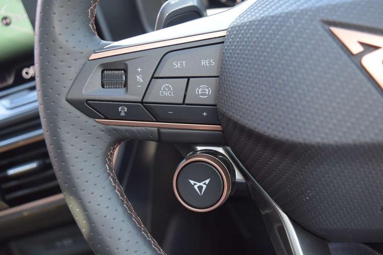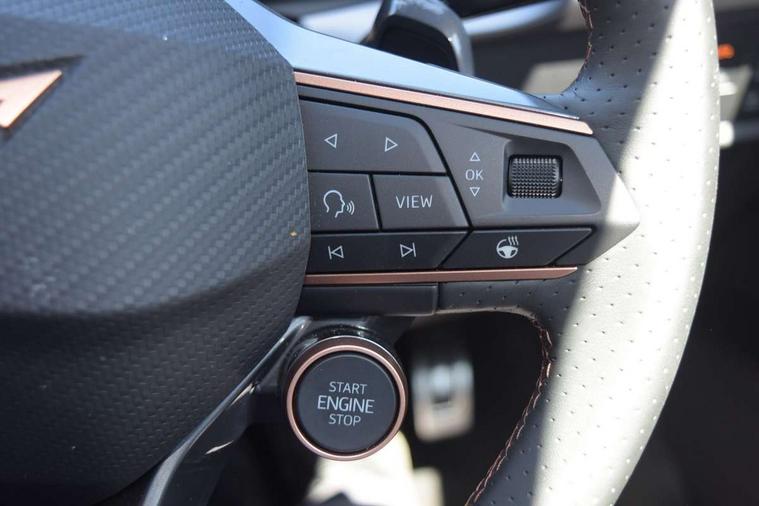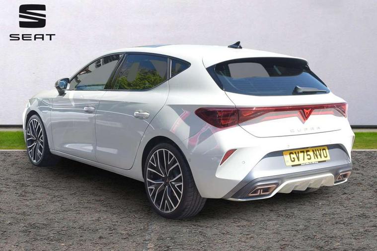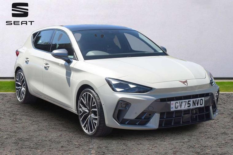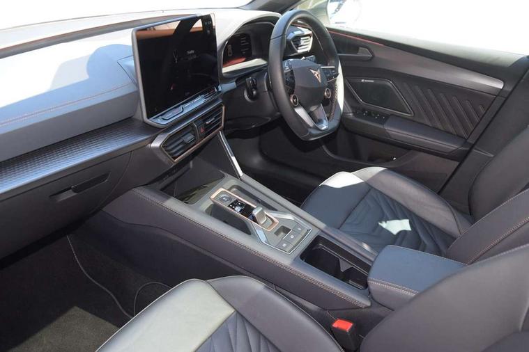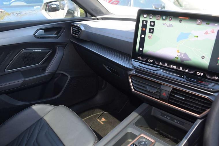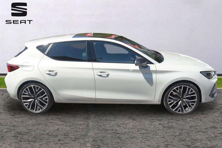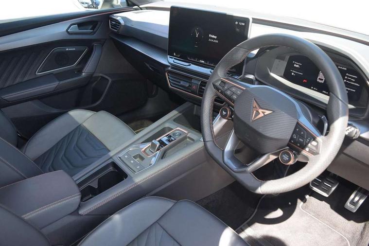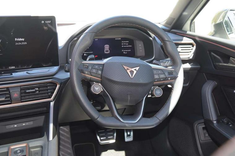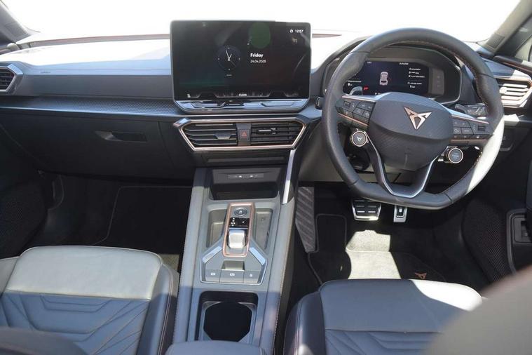Adaptive cruise control with follow-to-stop and speed limiter, CUPRA mode drive profile selection with throttle response and gearshift mode, Digital cockpit, Driver alert system, Dynamic road sign display, E-call, Front and rear parking sensors, Front assist with forward collision warning braking reaction to vehicles, pedestrians and cyclists, Front cross traffic assist, Full link smartphone integration with Mirror Link, wireless Apple CarPlay and wired Google Android Auto, Lane change assist with emergency assist, Lockable tailgate, Rear view camera, RPM, trip computer, outside temp gauge, instrument light brightness, low fuel warning light, lights on reminder, gearshift indicator, Service interval indicator, Start/stop system with regenerative braking, Wireless phone charger, 10 amp mode 2 charging cable, 32 amp mode 2 charging cable, Auxiliary input socket, Auto dimming rear view mirror, Body colour door handles, Body coloured bumpers, Cupra matrix LED ultra headlight with variable light distribution, high definition LED w/signature w/ceremony, Cupra sports bumpers, Dark tinted rear windows, Electric front/rear windows, Electrically adjustable, heated and folding door mirrors, High beam assist, High-resolution matrix beam plus digital projection, LED 3rd brake light, LED front fog lamps with cornering function, LED rear fog lamp, Rain sensing wipers, Rear diffuser with copper simulated exhaust pipes, Rear side wing doors, Rear wash/wipe, Separate daytime running light with automatic headlight control and coming home feature, Welcome light with logo projector in door mirrors, 12v power supply in centre console, 3 seat bench in 2nd row, 5 headrests, 60/40 split rear bench seat with armrest, Ambient lighting (glovebox, footwell, ambient lighting multicoloured), Black headlining, Cupra sports pedals, CUPRA Supersports, heated steering wheel with satellite buttons, Folding boot cover, Four x USB Type C ports (2 in front and 2 in rear), Front and rear reading lights X 4, Front centre armrest, Heated front seats, Height/reach adjust steering wheel, Illuminated interior front door sills, Interior wraparound lighting, ISOFIX points in outer rear seats with top tether anchorage points, Single front passenger seat, Storage pockets on rear of front seats, Sunvisors with illuminated mirror, Three zone climate control, Dynamic and comfort pack - Leon Cupra, Intelligent drive pack - Leon Cupra DSG transmission, Leather pack with memory function for front seats - Leon, Media system plus with 12.9" display + navigation pack - Leon Cupra, 3 point seatbelts on all rear seats, ABS, Brake control system - ESC and brake booster, Child proof door locks, Disc brakes in front, Driver and front passenger airbags with front passenger airbag de-activation, front side and curtain airbags, Electronic parking brake, Hill hold control, Rear disc brakes, Seat belt reminder for front and rear seats, Tiredness recognition system, Tyre pressure monitoring system, Anti theft alarm system with interior monitoring in cab, backup horn and towing protection, KESSY Advanced - Keyless start, keyless entry with SAFELOCK, Locking wheel bolts, Warranty - 5 years/90, 000 miles, Chrome and copper interior detailing, Breakdown kit, Tool kit,