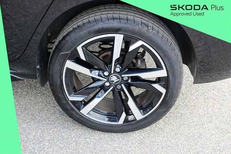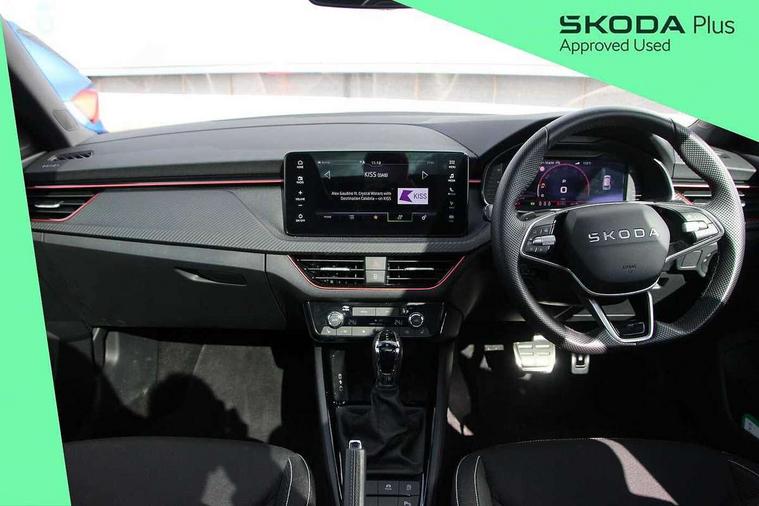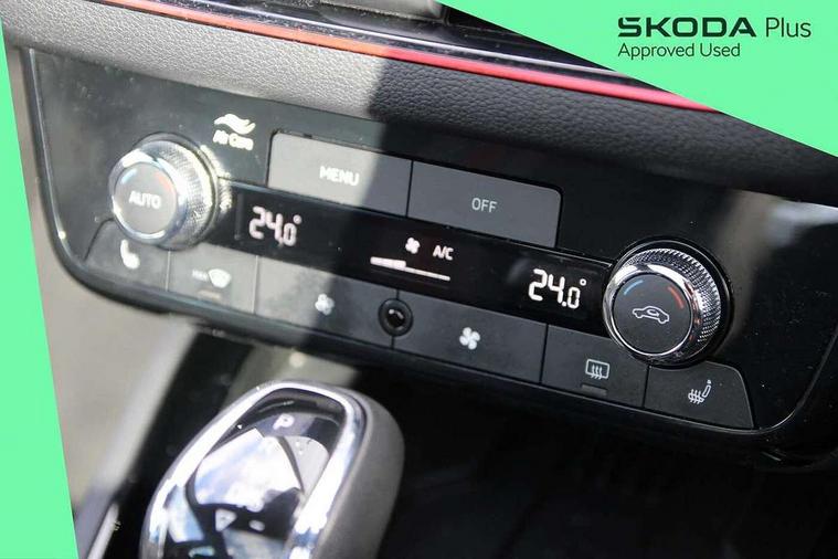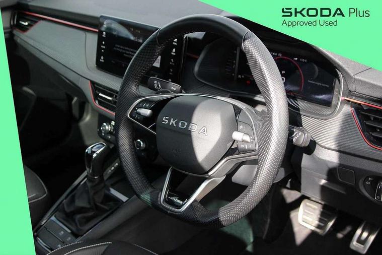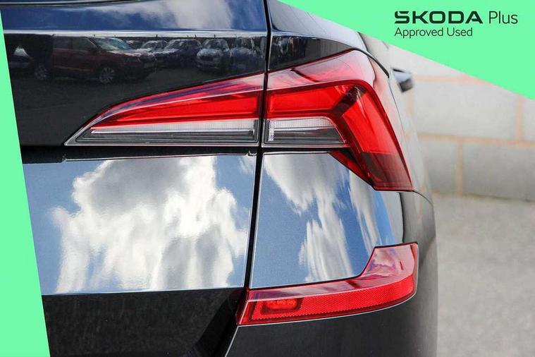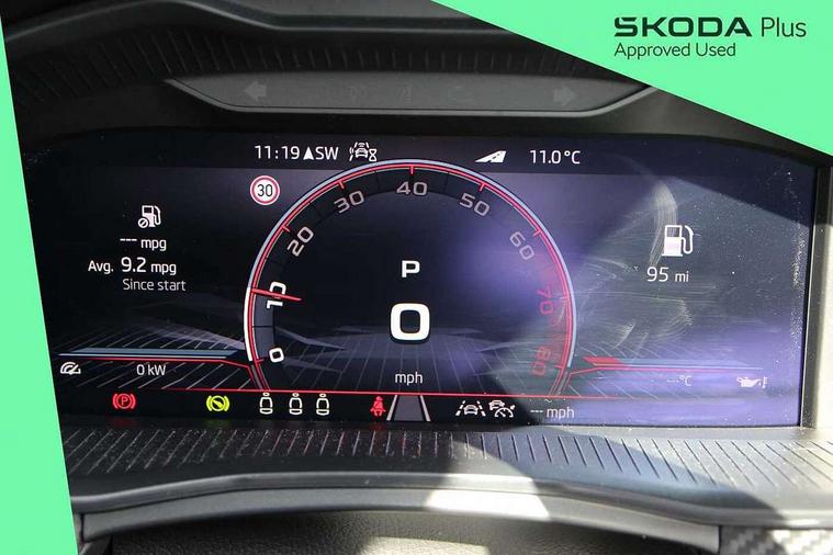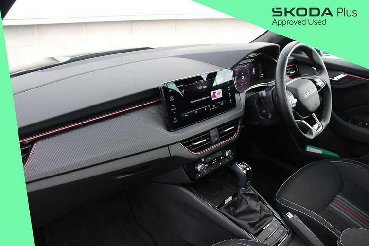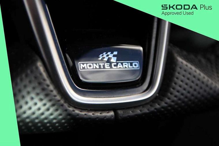 Advanced driver attention and drowsiness monitor, Bluetooth system, E-call, Front assist system, PAS, Rear parking sensors, Rear view camera, Service indicator, Speed limiter, Traffic sign recognition, Virtual cockpit with 10.25" display, Voice control system, Wireless smartlink, 4 USB C ports, 8 Speakers, 9.2" Skoda navigation display, DAB Digital radio, Auto dimming rear view mirror, Automatic headlight control with coming home and leaving home feature, Black door mirrors, Black radiator grille, Black rear diffuser, Black roof spoiler, Body colour bumpers, Body colour door handles, Boot lettering in black, Extended tailgate glass, Fixed panoramic sunroof with black roof rails, Front and rear electric windows, Heated rear window, LED daytime running lights, LED high beam, LED low beam, LED third brake light, Light sensors, Monte carlo plaque, Privacy glass, Rear side wing doors, Rear wiper, Ticket holder inside windscreen, 12V socket in luggage compartment, 3 seat bench in 2nd row, Aluminium pedals, Ambient lighting in white/red, Art leather carbon decor inserts, Art leather carbon door inserts, Black roof lining, Cargo elements, Chrome inner door handles, Driver and passenger sun visors with vanity mirror, Dual zone climate control, Front and rear roof lights, Front centre armrest, Front head restraints, Glove compartment with illumination, Height adjustable driver seat, Height adjustable front passenger seat, Ice scraper, Inner circulation control with pollen filter, ISOFIX on front passenger seat, Isofix preparation for back seats, Leather gearknob and handbrake lever, Manual lumbar support for front seats, Monte Carlo cloth upholstery, Net package and top tether hooks in boot space, Net under rear shelf, Pocket on the back of both front seats include mobile phone pockets, Rake/reach adjustable steering wheel, Reading lights, Rear centre armrests, Red hotstamping, Single front passenger seat, Sports seats, Textile floor mats, Third rear headrest, Top tether for front passenger seat, Umbrella in driver's door, Light and view plus package - Kamiq, 3x3 point rear seatbelts, Airbags - driver and front passenger, Disc brakes, ESP, Extended and predictive pedestrian/cyclist protection, Front passenger airbag deactivation switch, Front side airbags with curtain airbags, Hill hold control, Manual leather parking brake, Manual rear child locks, One tone horn, Seatbelt reminder for driver an co-driver, Traction control, Tyre pressure monitor, Anti-theft alarm system with interior monitoring, backup horn, towing protection and remote central locking with SAFE system, Anti-theft wheel bolts, Electronic engine immobilizer, 18" Ursa black diamond cut alloy wheels,