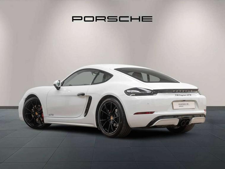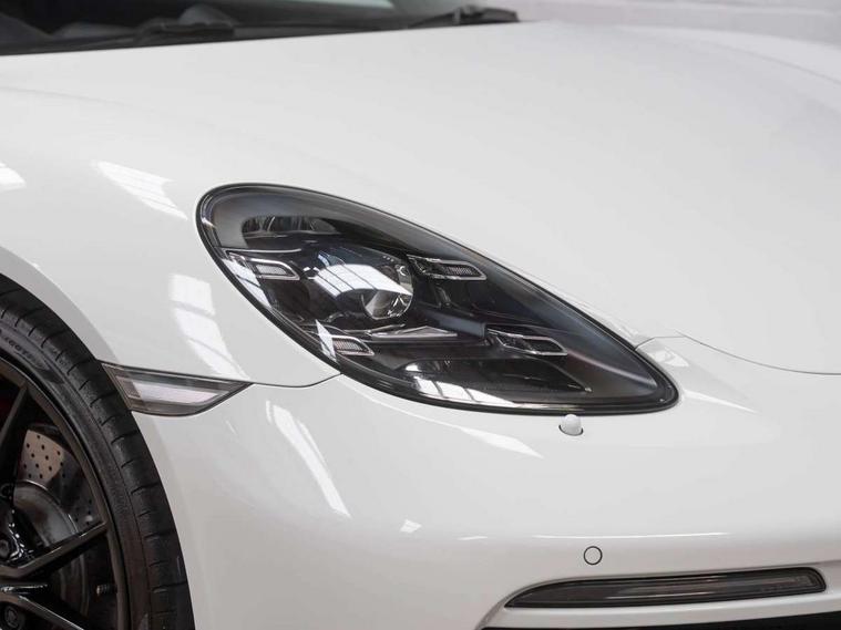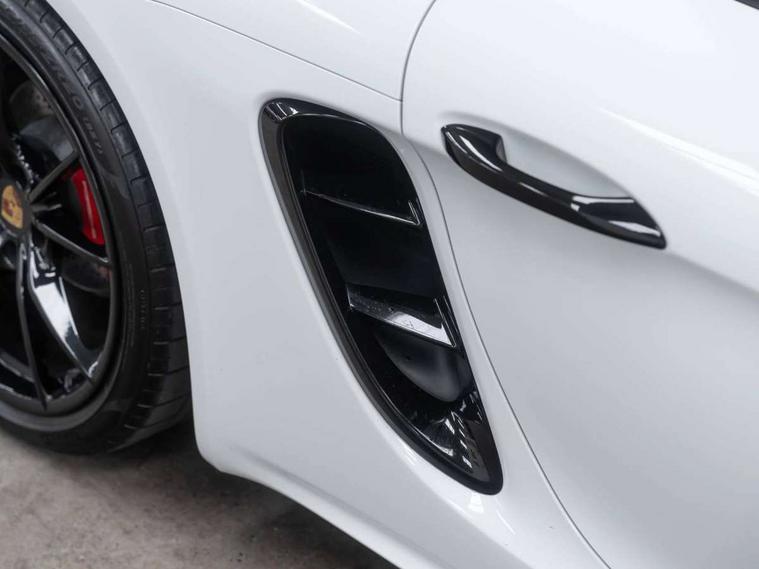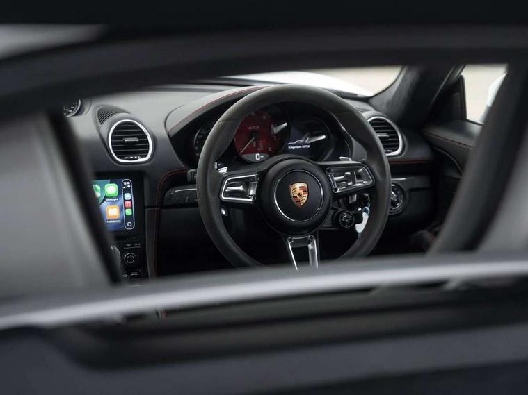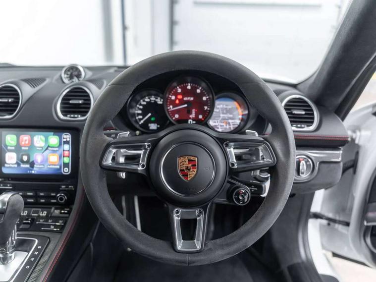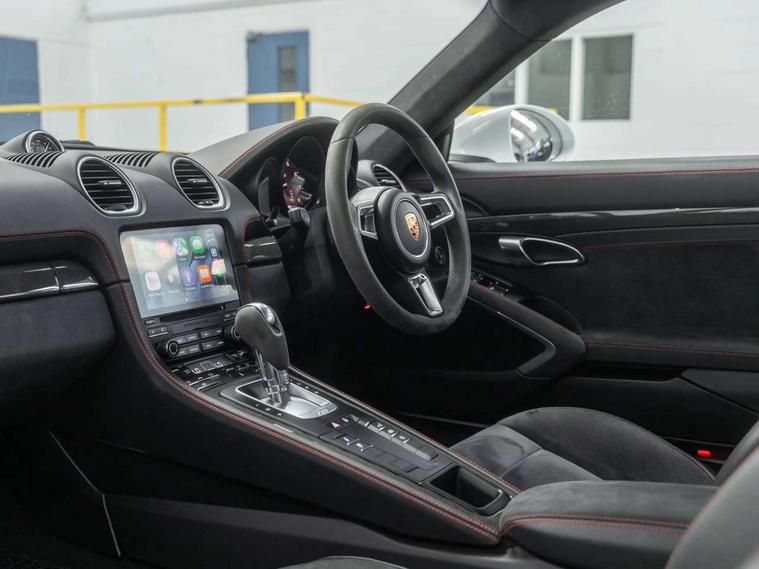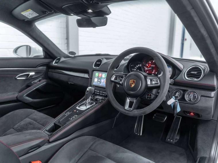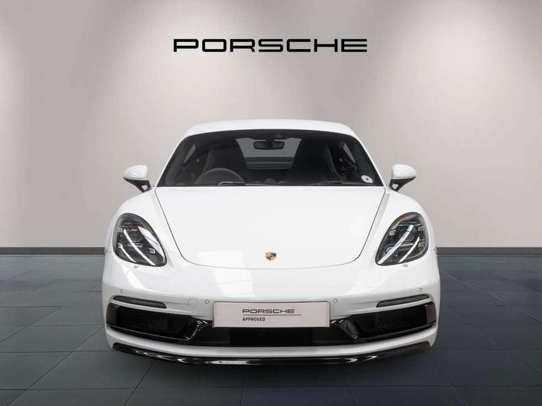 Black rev counter, Instrument cluster with high-resolution 4.6-inch TFT colour display, Mobile telephone preparation, PCM navigation module, Porsche communications management, Porsche Connect Plus, Sports button, Porsche Active Suspension Management (PASM), Porsche stability management (PSM), Porsche TORQUE Vectoring (PTV) with mechanical rear differential lock, Connect Plus with Apple CarPlay, wireless internet access, Carfinder, Remote Vehicle Status and Remote Services, DAB Digital radio, Aerodynamic wipers, Aspherical driver's exterior mirror, Automatic coming home lighting, Automatically extending rear boot spoiler, Black model designation on doors, Body colour bumpers, Door sill guards with logo, Electric windows one touch open/close, Electrically adjustable and heated door mirrors, Green tinted heat insulating glass, Heated rear windscreen, LED brake lights, LED daytime running lights, Painted Porsche logo and model designation, Painted rear apron, Sports exhaust system including sports tailpipes in black, Top tinted windscreen, Windscreen washer jets, 12V sockets in front centre console and passenger footwell, 2 cupholders, Air recirculation control, Clothes hooks on front seat backrests, Defrost switch, Door panel armrests and centre console main storage compartment lid in smooth finish leather, Driver/passenger electric backrest adjustment, Driver/passenger seats fore/aft adjustment, Front and rear luggage compartments, Front centre console storage box, Glovebox illumination, GT alcantara sports steering wheel and PDK gear selector, Ignition Lock illumination, Illumination of luggage compartment, Interior orientation lighting, LED reading lights, Lockable glovebox, Sports steering wheel with manual fore/aft/height adjust, Storage compartments in doors, Sport chrono pack PDK - Cayman (with dynamic transmission mounts), ABS, Electronic parking brake, Full size driver and passenger airbags, Head airbags, POSIP, Red painted brake calipers, Side (thorax) airbags, Tyre pressure monitoring system, Alarm system with interior protection, Anti-theft wheel bolts, Porsche vehicle tracking system (VTS), Remote central locking including luggage compartment, Transponder engine immobiliser, Sealing compound and compressor kit,