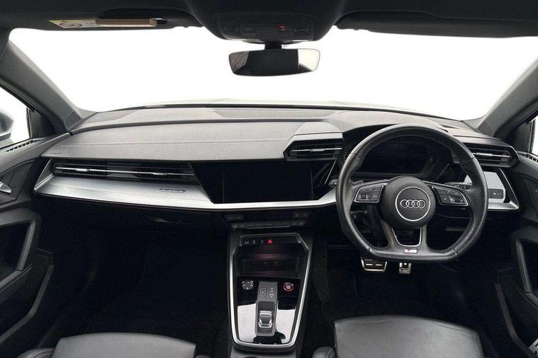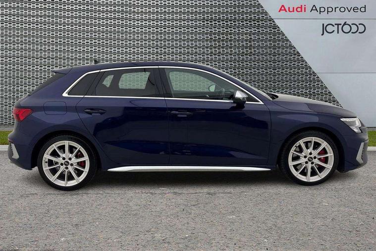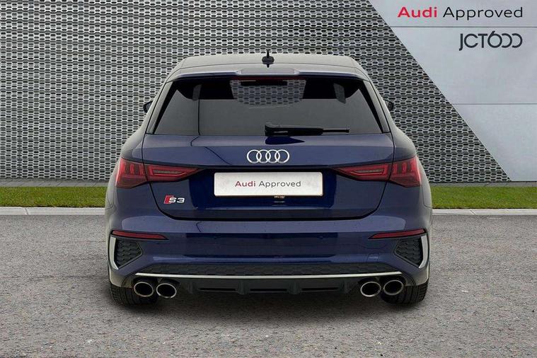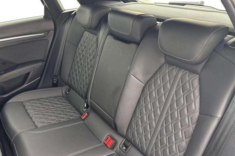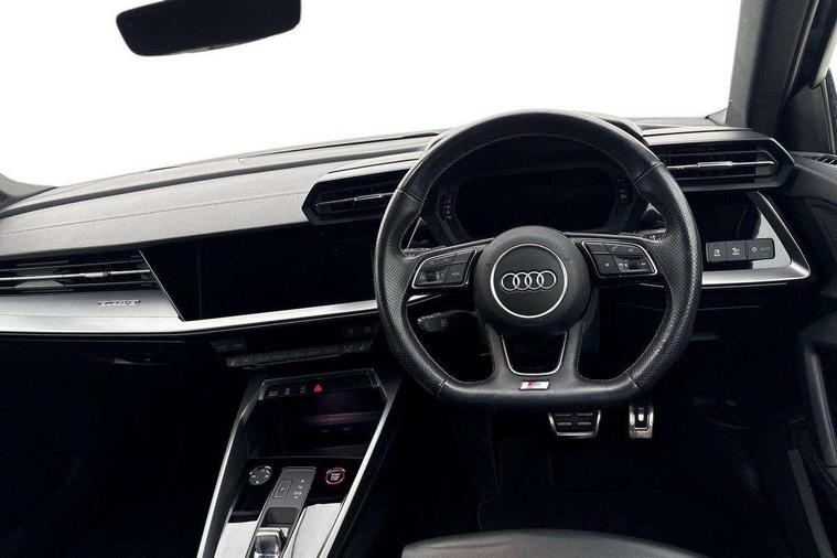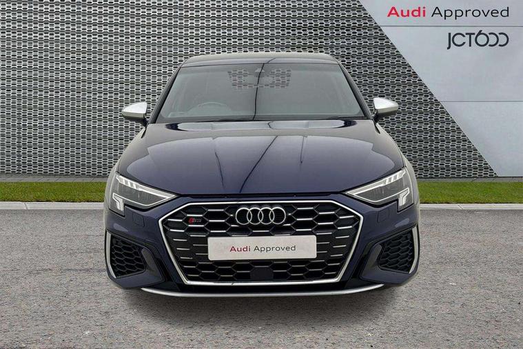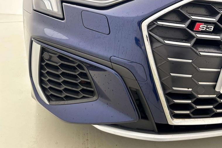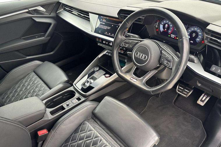 Accent surfaces in the dashboard and centre console in platinum grey silk effect paint finish, Dark spectrum aluminium inlays, Aluminium interior elements pack - A3 Sportback, Design body styling - A3 Sportback, Storage pack - A3 Sportback, 3x3 point rear seat belts, Driver and front passenger airbag with passenger airbag deactivation, Electronic Stabilisation Control (ESC) including ABS, ASR and EDL, First aid kit with warning triangle and 2 safety vests, Front side airbags with head airbags and interaction airbag, Hill hold assist, Pre-sense front with pedestrian and cyclist detection, Seatbelt monitoring, Tyre pressure loss indicator, Anti theft alarm, Anti-theft wheel bolts, Electronically operated child lock, Immobiliser, Remote control central locking, Quattro permanent all wheel drive, S sports suspension, 2xUSB-C connection with data and charging functions, 6 passive loudspeakers, DAB Digital radio, Acoustic glass windscreen, Aluminium window trim, Audi Beam uses LEDs to project the Audi S3 logo, Auto dimming frameless rear view mirror, Dual branch oval twin tailpipes in chrome plated finish, Exterior mirror with aluminium look housing, Front electric windows, Illuminated aluminium inserts front door sills with S logo, LED daytime running lights, Light and rain sensors, Privacy glass - dark tinted rear window, rear door and side windows, Rear electric windows, Rear side air outlets in grained matt black, Rear wiper, 12V socket and storage compartment in front centre console, 3 spoke flat bottomed multifunction plus sports contour leather wrapped steering wheel with shift paddles, 40/20/40 split folding rear seat bench with cupholder, Black cloth headlining, Dual zone electronic climate control, Front and rear centre armrest in leather, Front and rear headrests, Front/rear floor mats, Heated front seats, Height and reach adjustable steering wheel, Interior lighting - glove compartment light and right hand side, Luggage compartment floor covering, Seat side bolsters, Stainless steel pedals and front footrest, Audi connect emergency call and service, Audi drive select (Auto, Comfort, Dynamic, Efficiency and Individual), Audi smartphone interface, Audi Virtual Cockpit - 10.25" digital and colour instrument cluster, Automatic start/stop system with recuperation, Bluetooth interface, Collision avoidance assistant, Lane departure warning system, MMI Navigation Plus with high resolution 10.1" colour touch screen display, Progressive steering, Service indicator, Trip computer, Voice control system with natural language interaction,