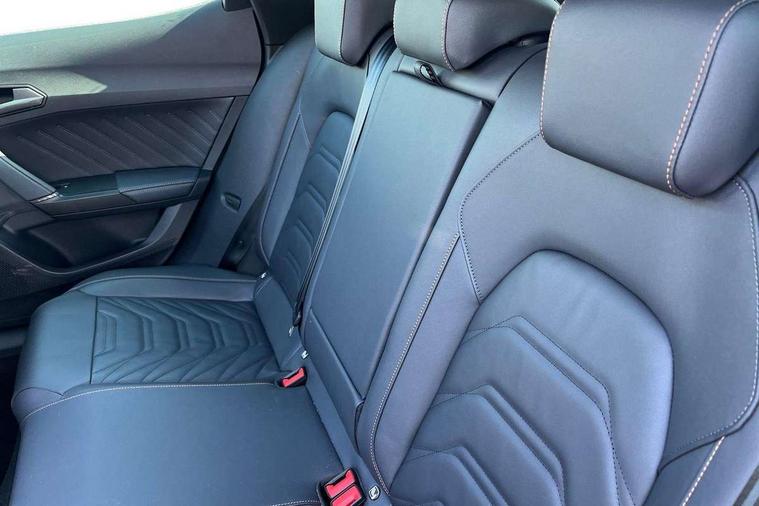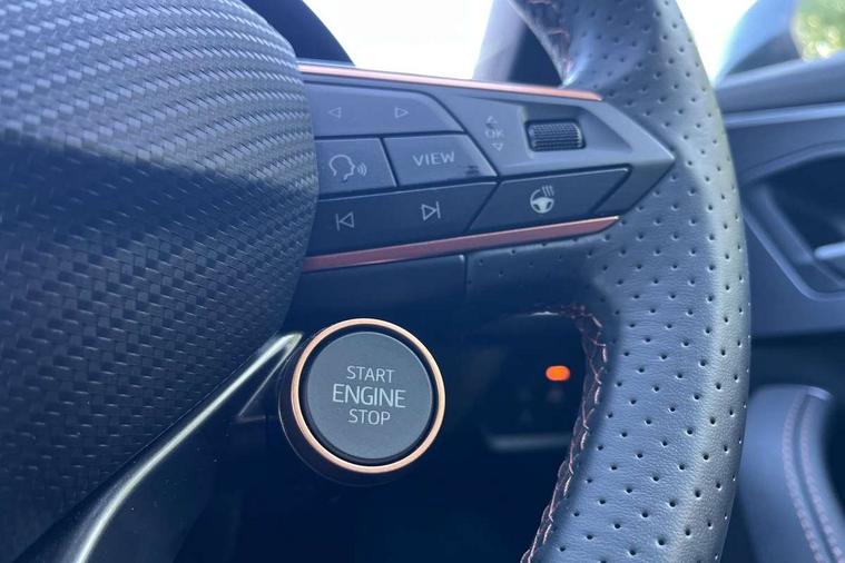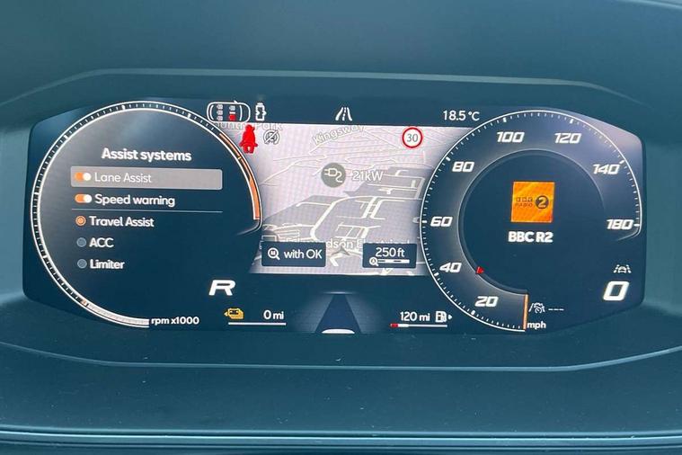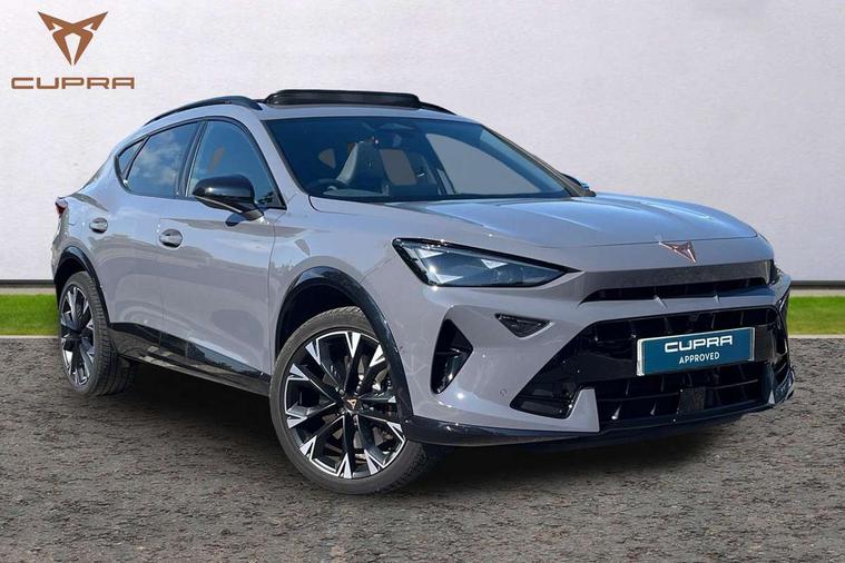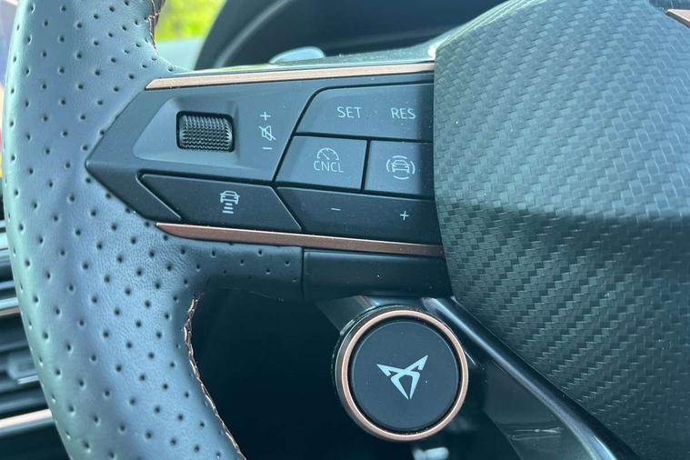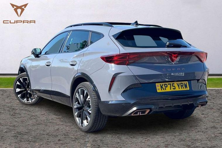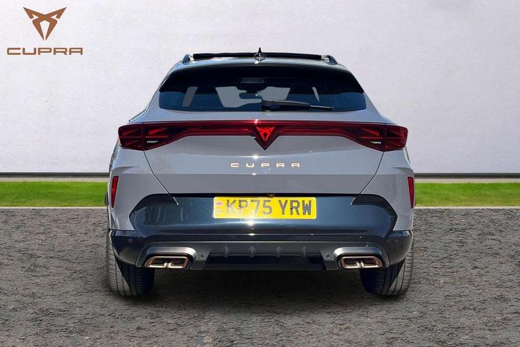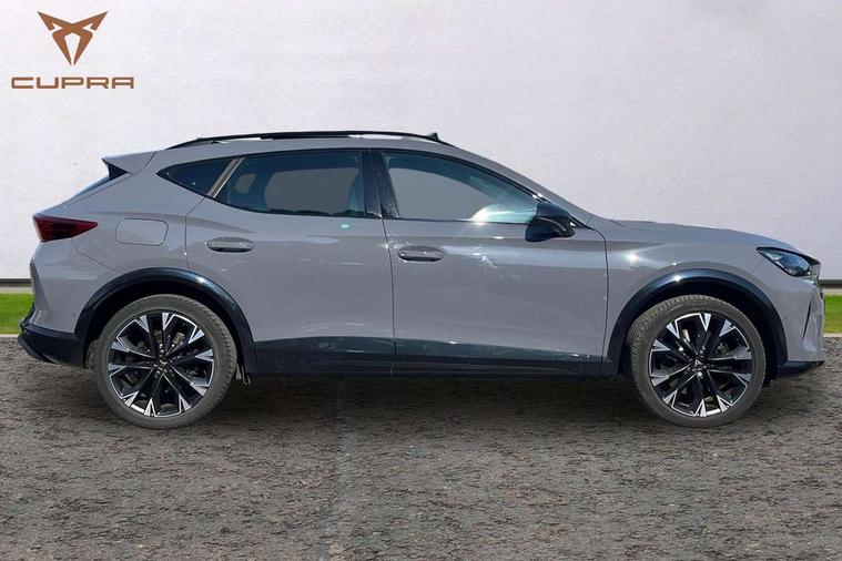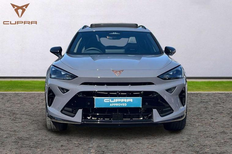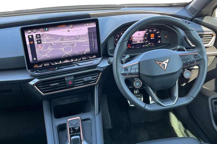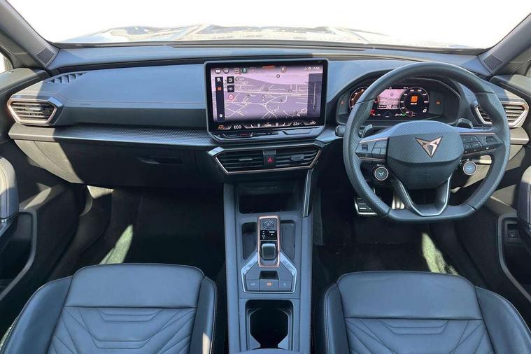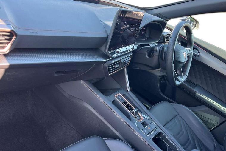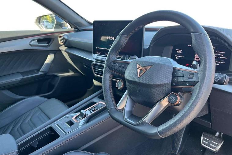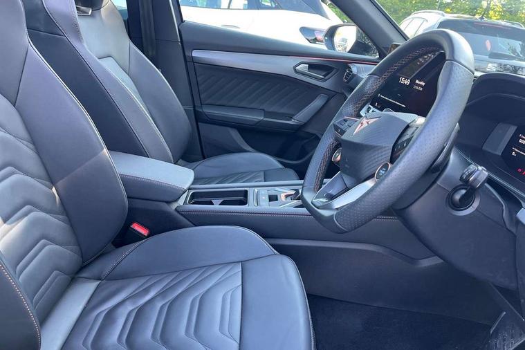 10.25" digital cockpit and configurable dashboard, Adaptive cruise control with follow-to-stop and speed limiter, Advanced driver alert system, Advanced lane assist with semi-automatic vehicle control in a medical emergency and traffic jam assist, Dynamic chassis control with driving profile selection (Comfort, Sport, CUPRA, Individual), Dynamic road sign display, Emergency steering support with turn assist, Forward collision warning with automatic braking, Front cross traffic assist, Full link phone integration, Intelligent park assist, RPM, trip computer, outside temp gauge, instrument light brightness, low fuel warning light, lights on reminder, gearshift indicator, Service interval indicator, Side and exit assist, Speed sensitive power steering, Start/stop system with regenerative braking, Top view camera, Virtual pedal and electric tailgate, Voice control system, Wired Android Auto, Wireless apple carplay, Wireless phone charger, 10 amp mode 2 charging cable, 32 amp mode 3 charging cable, Adaptive chassis control with continuous operation, CUPRA sport suspension, Electronic locking differential and dynamic traction support, 2 front and 2 rear USB type C sockets, Media system with navigation, 12.9" touchscreen display, voice control, DAB, steering wheel mounted controls, Auto dimming rear view mirror, Body colour door handles, Body coloured bumpers, Dark grey wing mirror, Daytime running light with automatic headlight control and coming home feature, Door panel ambient lighting, Dynamic headlight range control, Electric front/rear windows, Electrically adjustable heated and folding door mirrors with memory function, Gloss black roof rails and window surrounds, High beam assist, LED 3rd brake light, LED front fog lamps with cornering function, LED Taillights with dynamic indicator, Matrix Ultra HD headlights, Rain sensing wipers, Rear diffuser with copper simulated exhaust pipes, Rear fog lights, Rear side wing doors, Rear wash/wipe, Tinted rear windows, Welcome lights (within exterior mirror housing), 12V socket, 2 front and 2 rear reading lights, 3 seat bench in 2nd row, 60/40 split rear bench seat with armrest and mechanical seat release, Black headlining, Black interior roof lining, Cupra sports pedals, Dust/pollen filter, Electrically adjustable front seats with lumbar support and memory function, Front and rear head restraints, Front centre armrest, Heated front seats, Heated supersports multifunction leather steering wheel with satellite buttons and gear shift paddles, Height/reach adjust steering wheel, Illuminated aluminium doorsteps, Illuminated interior front door sills, Illuminated sunvisor with mirror, Isofix, Leather dashboard, door insert and side trim panel, LED smart wraparound lighting, PVC/Leather upholstery, Satellite steering wheel, Single front passenger seat, Storage pockets on rear of front seats, Three zone climate control with control panel in rear, 3 point seatbelts on all rear seats, ABS, Brake control system - ESC and brake booster, Child proof door locks, Driver and front passenger airbags with front passenger airbag de-activation, Electronic parking brake, Front and rear disc brakes, Front side curtain airbags, Hill hold control, Pre-crash front and rear seat belt tensioner, window closure and hazard lights, Public e-call, Seat belt reminder for front and rear seats, Tyre pressure monitoring system, Anti theft alarm system, KESSY Advanced - Keyless start, keyless entry with SAFELOCK, Locking wheel bolts, Warranty - 5 years/90, 000 miles, Copper and aluminium interior detailing, Breakdown and tool kit,